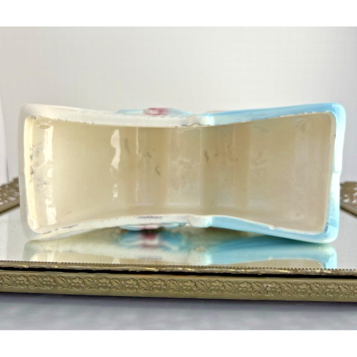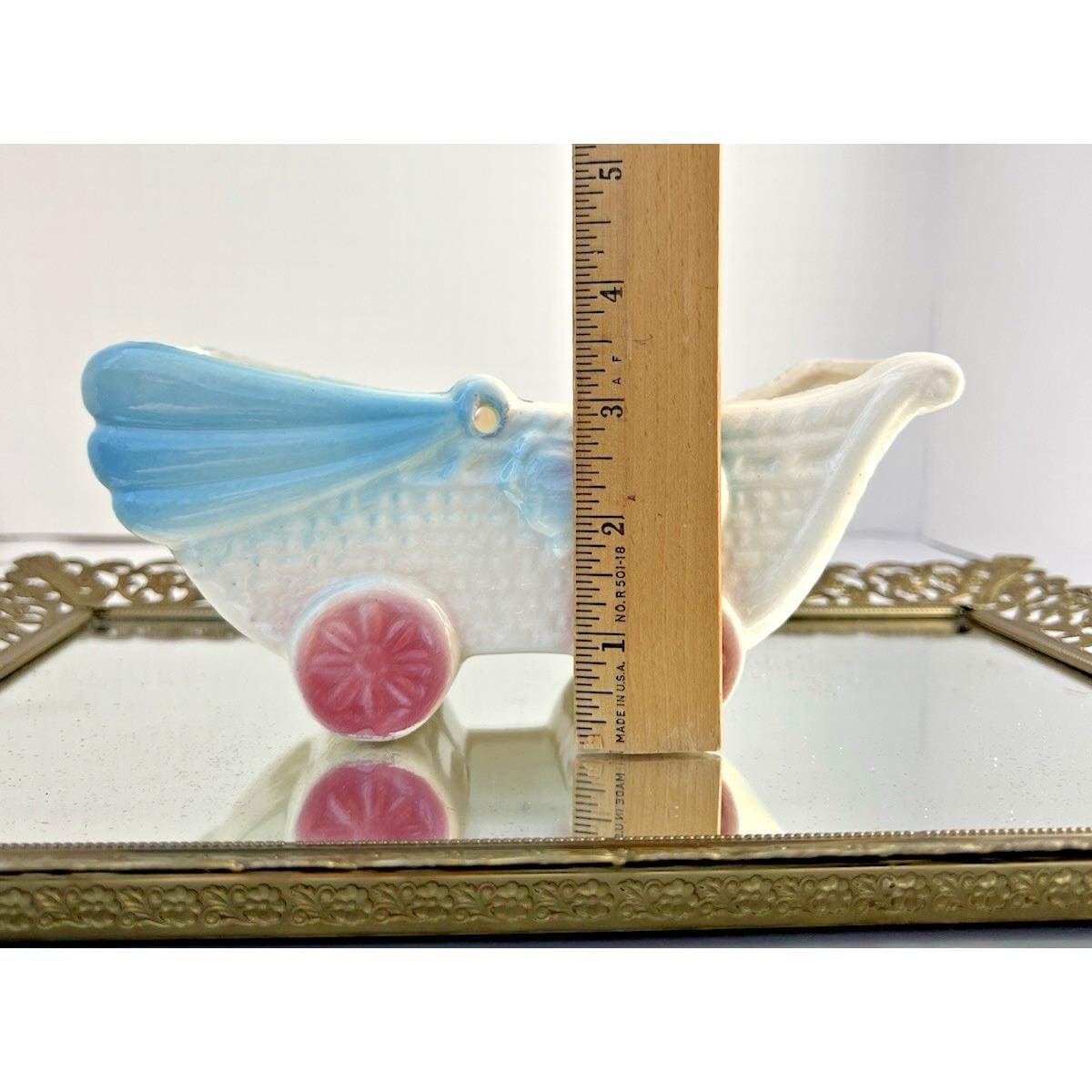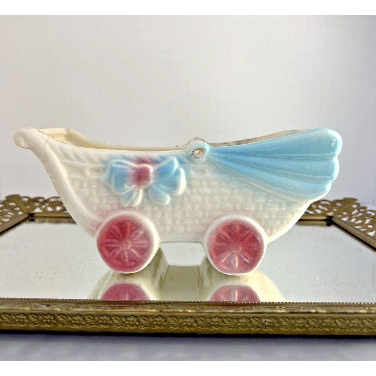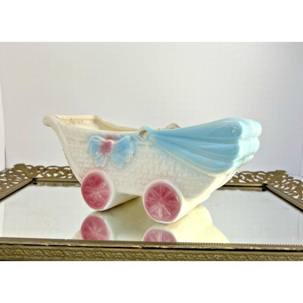 Sweet vintage ceramic planter in the shape of a baby buggy, featuring soft blue and pink tones with charming, raised details.