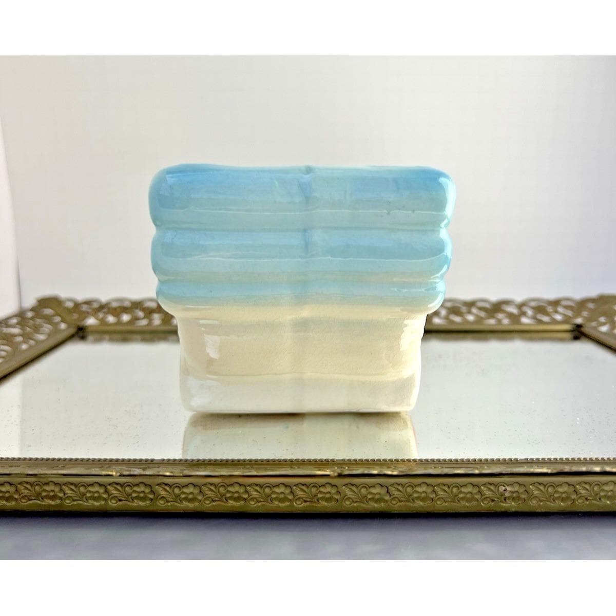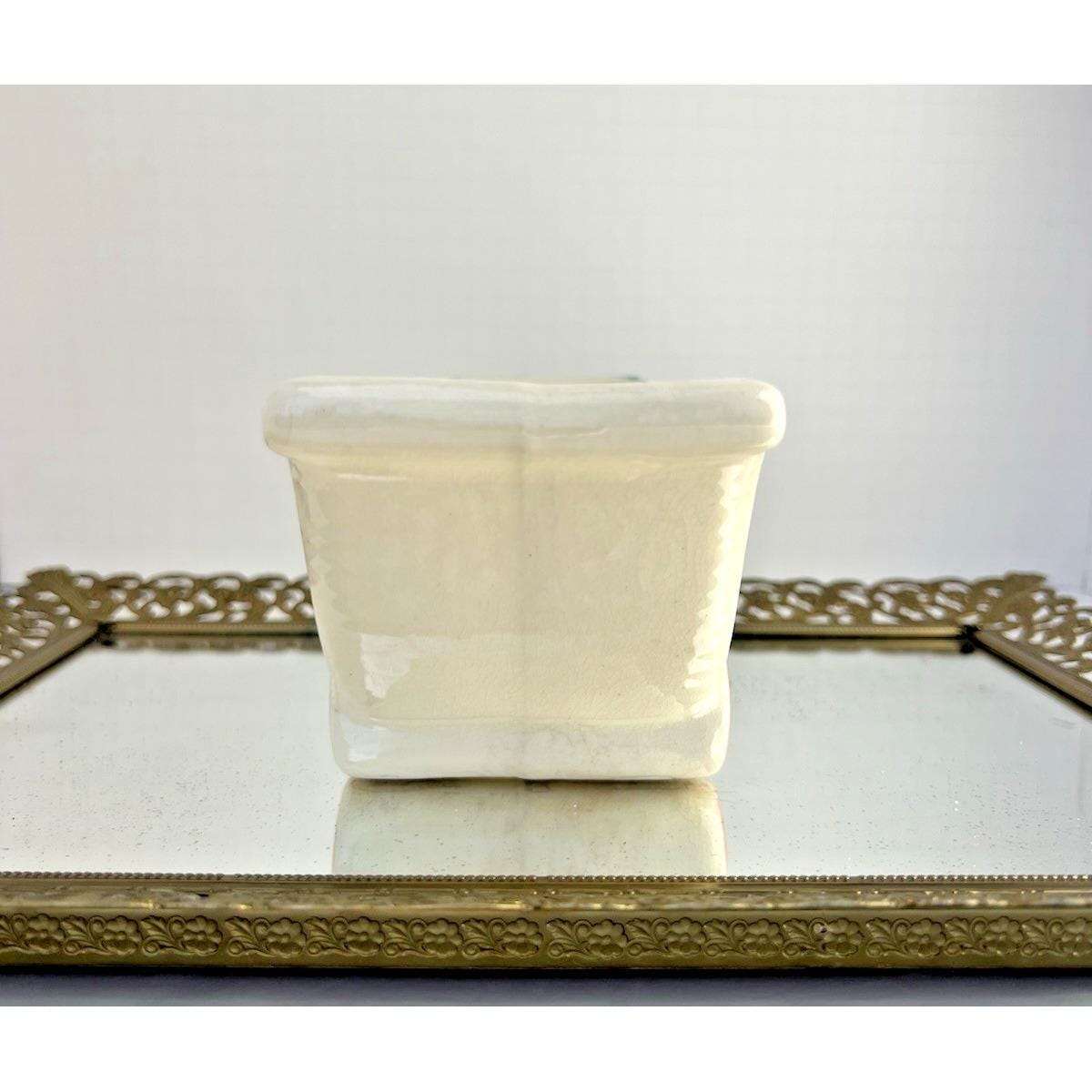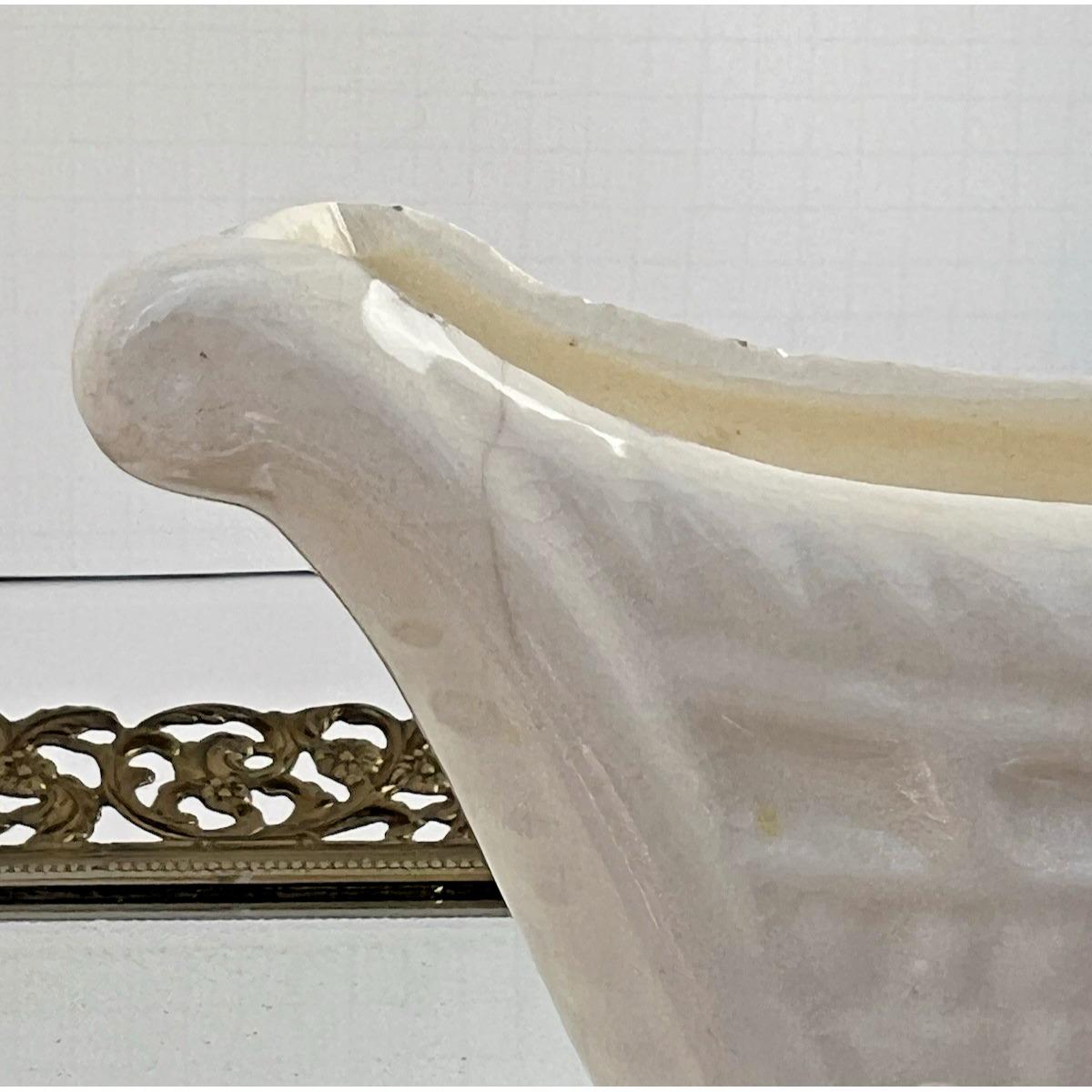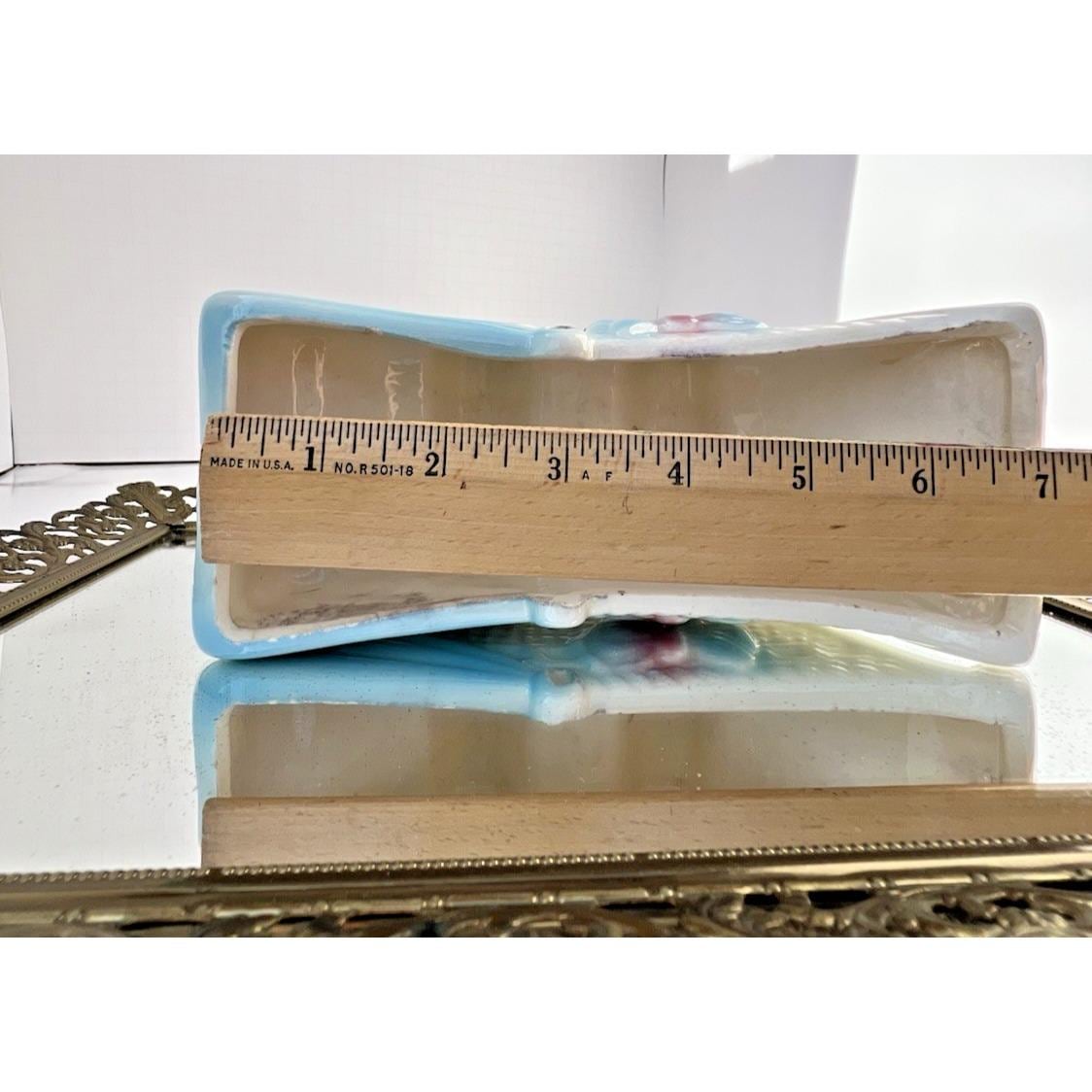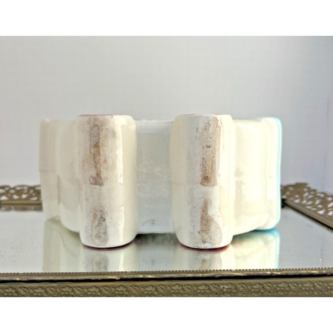 Sweet vintage ceramic planter in the shape of a baby buggy, featuring soft blue and pink tones with charming, raised details.
