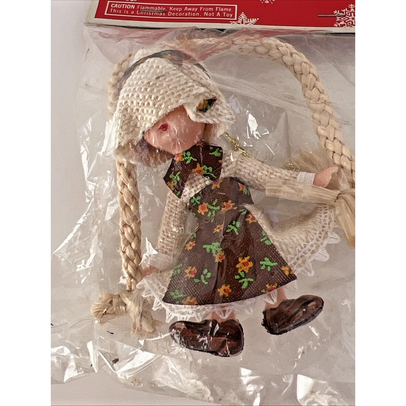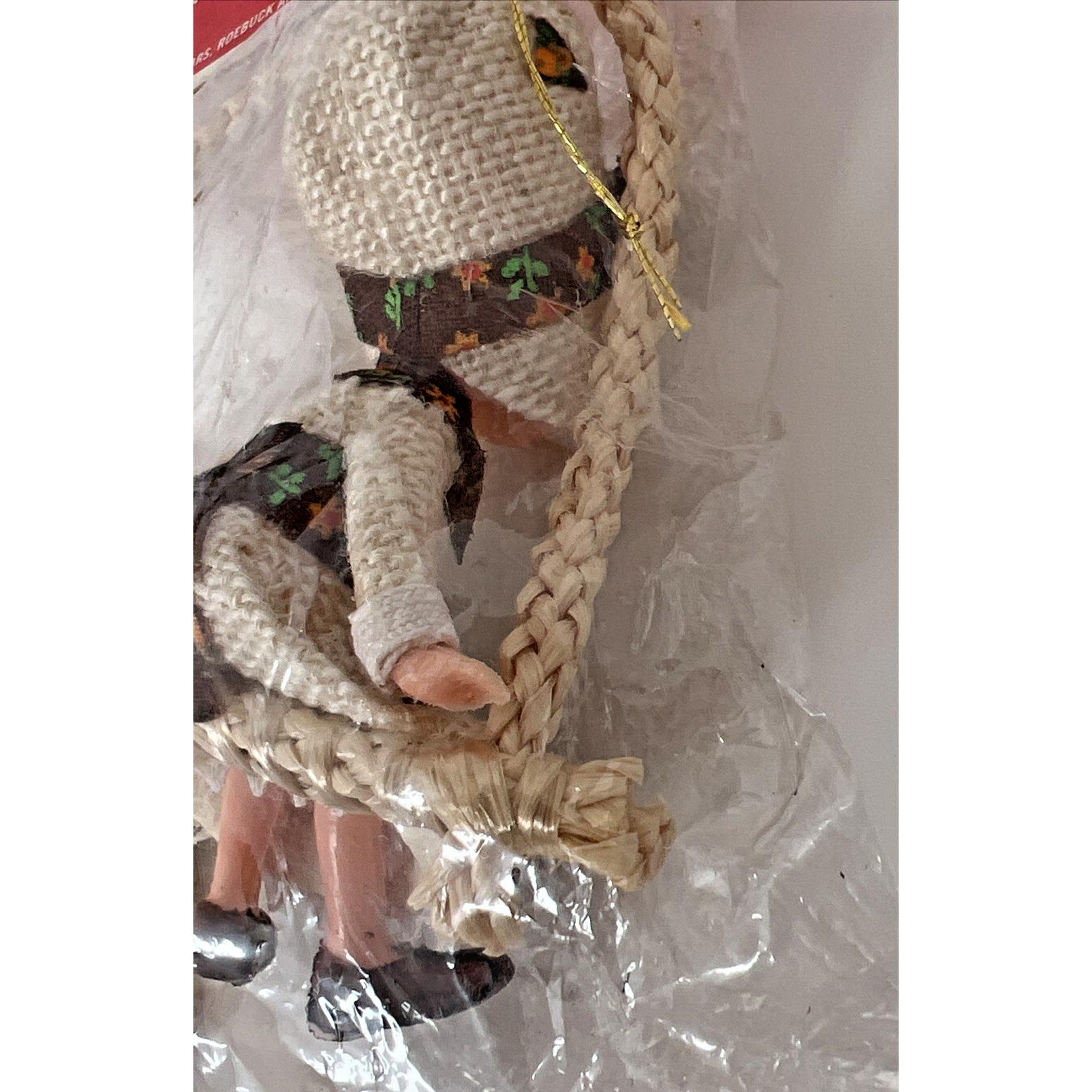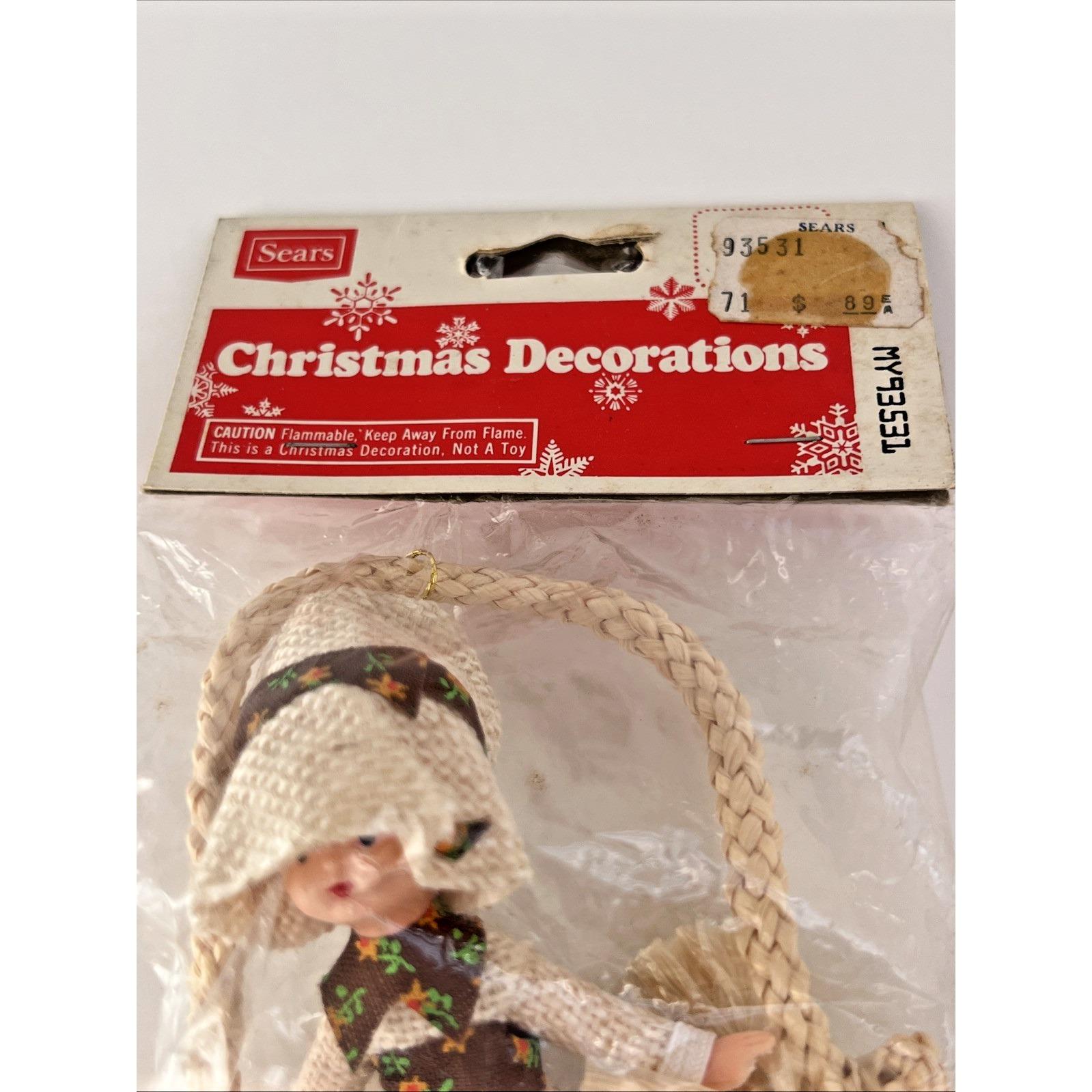 Vintage Sears Christmas decoration still in the original packaging. Sweet little folk-style doll with braided hanger, knit bonnet, and floral dress. Classic 70s–80s Sears holiday décor. Great for a vintage tree or package topper.