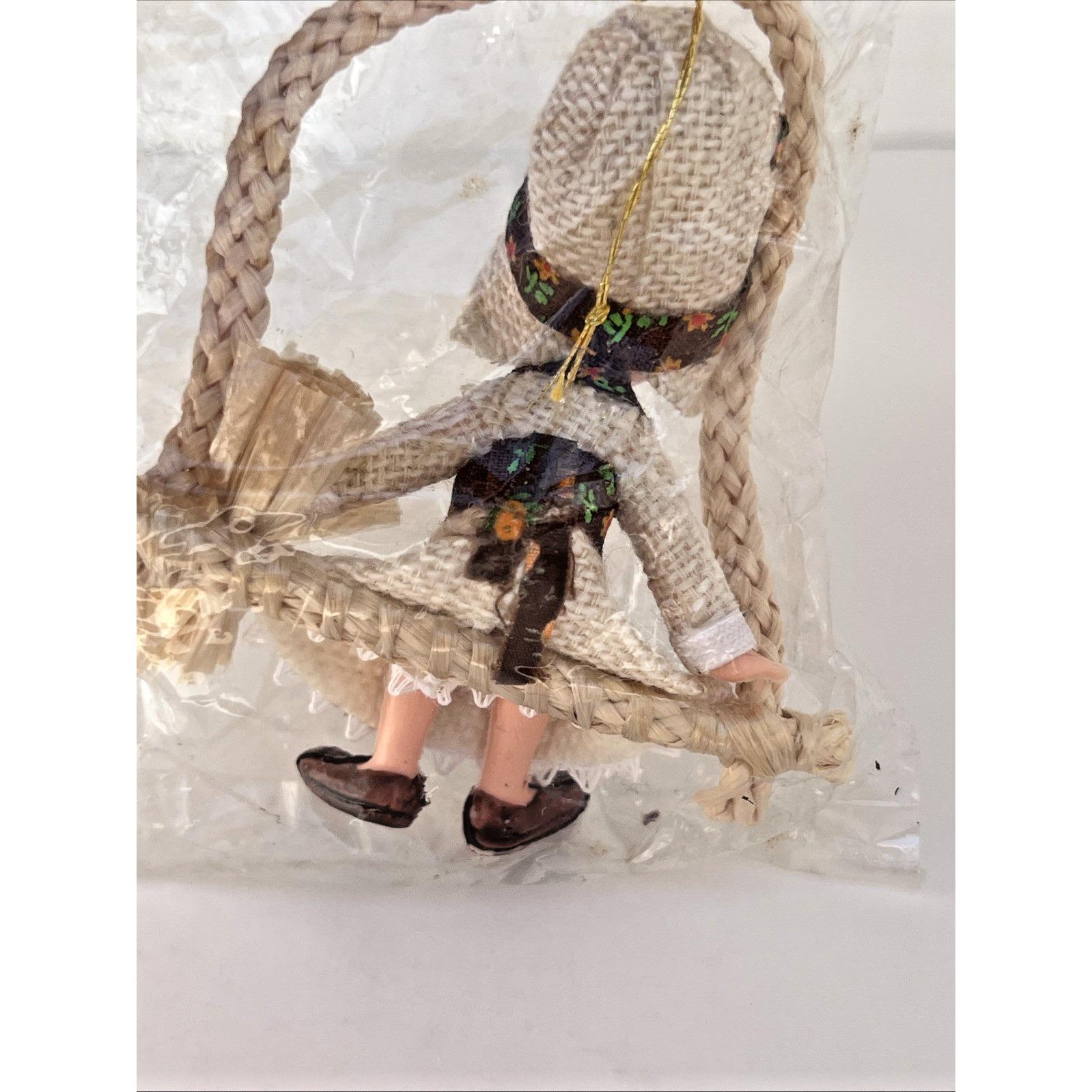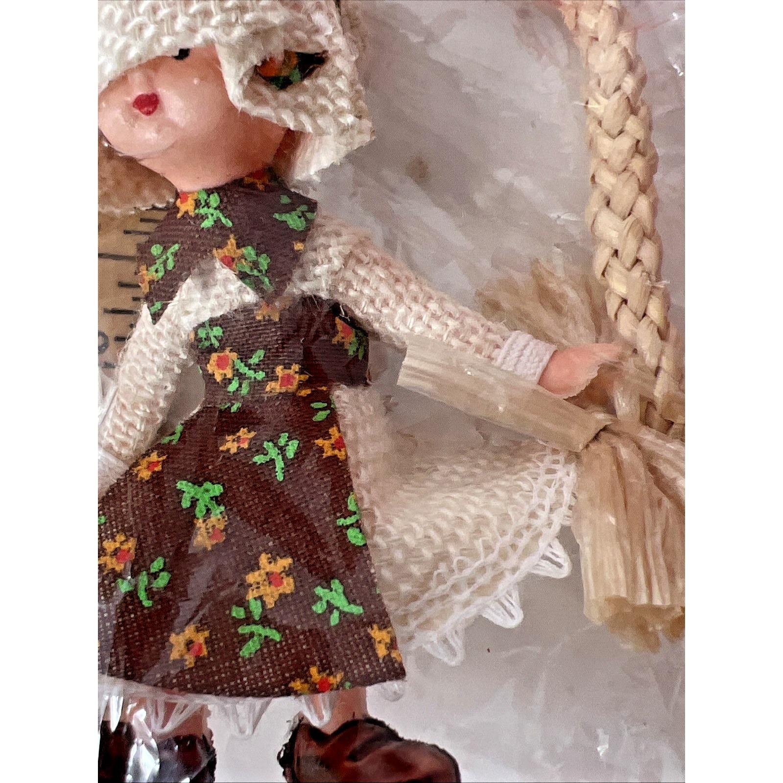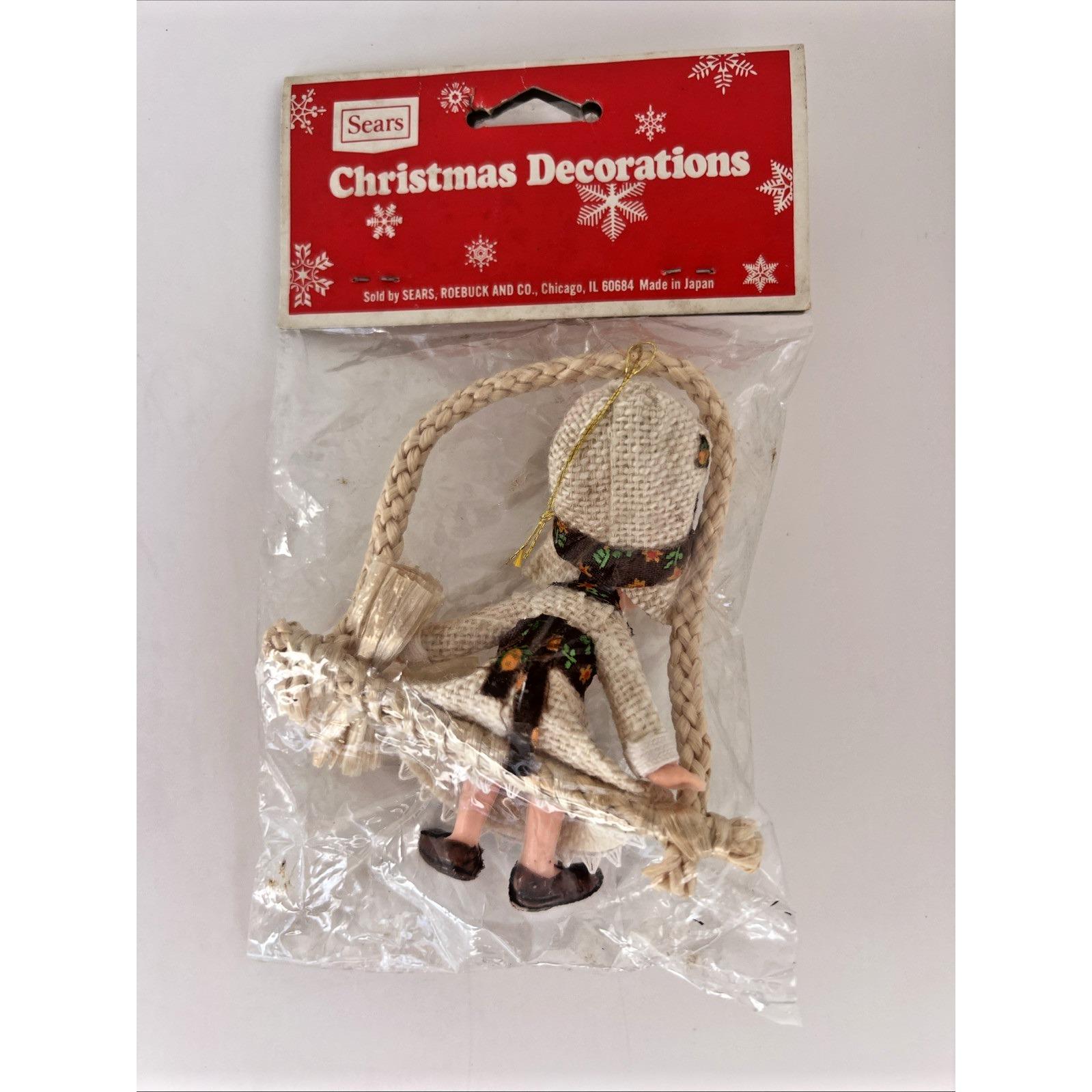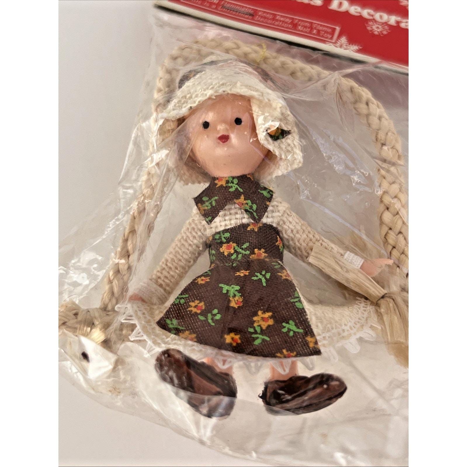 Vintage Sears Christmas decoration still in the original packaging. Sweet little folk-style doll with braided hanger, knit bonnet, and floral dress. Classic 70s–80s Sears holiday décor. Great for a vintage tree or package topper.
