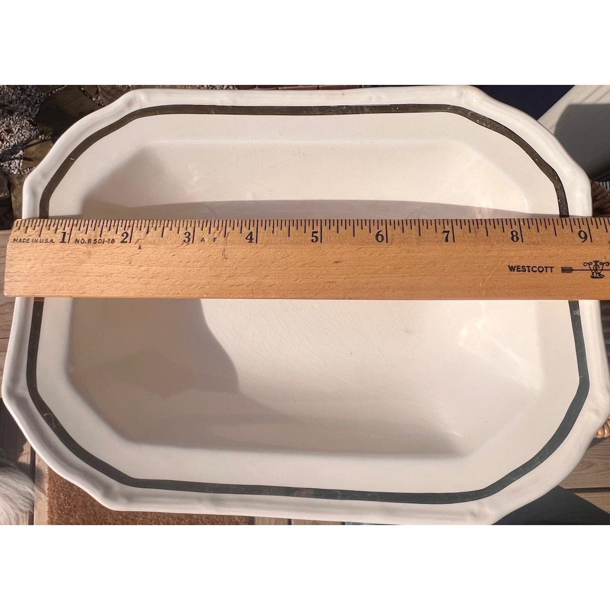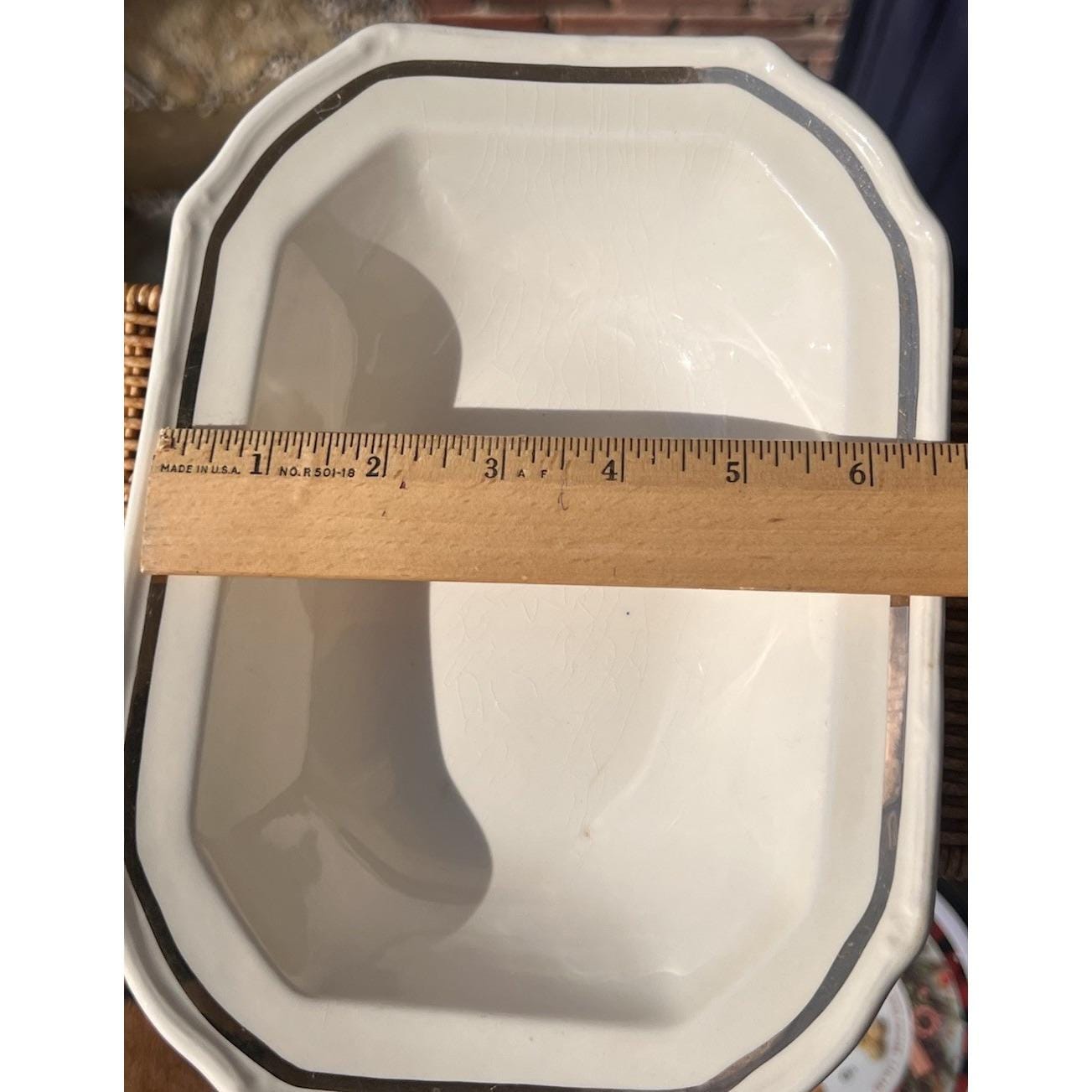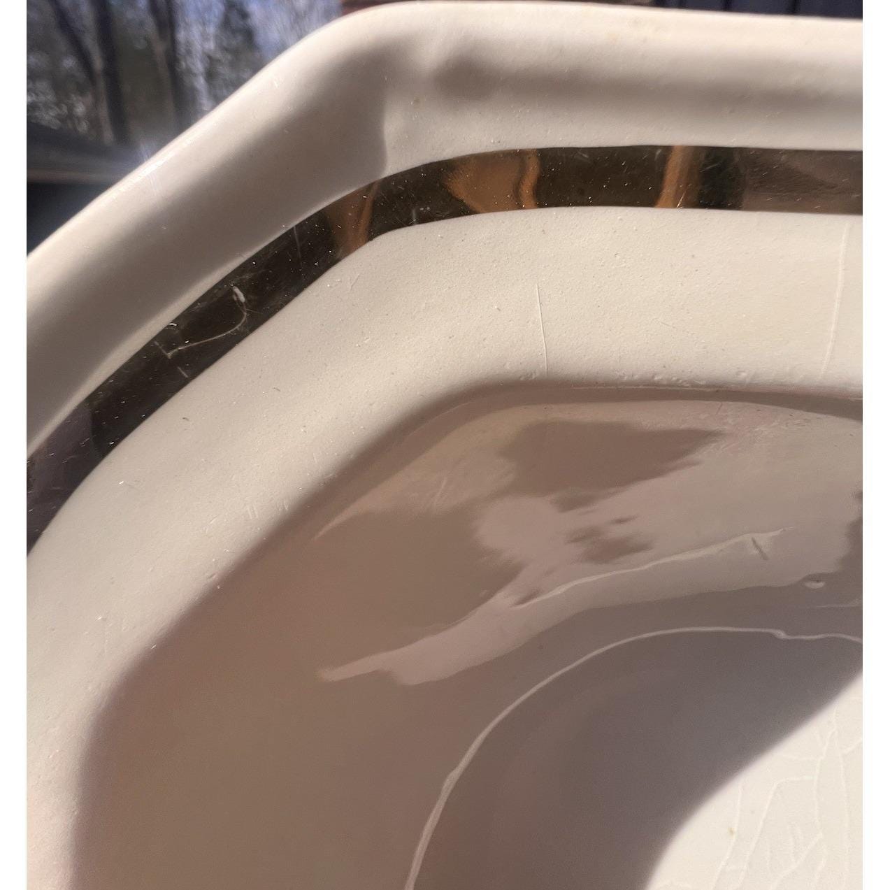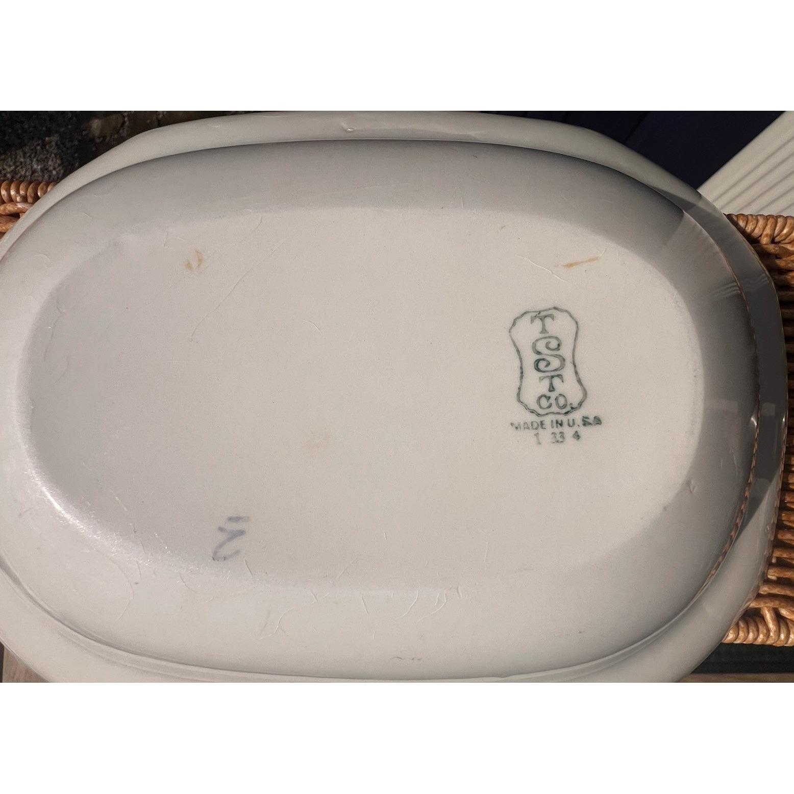 The Vintage TST Taylor Smith Taylor Ivory Bowl is a beautifully crafted piece of mid-century modern pottery, featuring a glossy beige finish with gold trim. This octagonal bowl, measuring 10" in length and 6" in width, is adorned with a vintage pattern, making it a perfect decorative item for any occasion. Made in America in the mid-20th century, this original Taylor Smith & Taylor bowl is a unique addition to any collection, showcasing the production style and craftsmanship of the era. Upgrade your home decor with this stylish and elegant piece of vintage dinnerware.