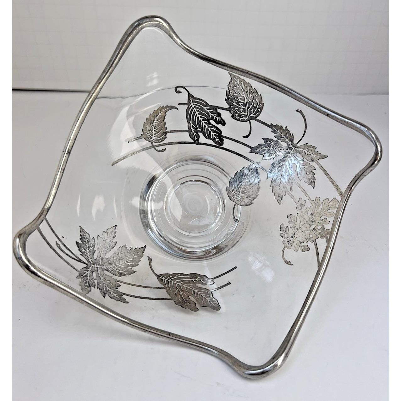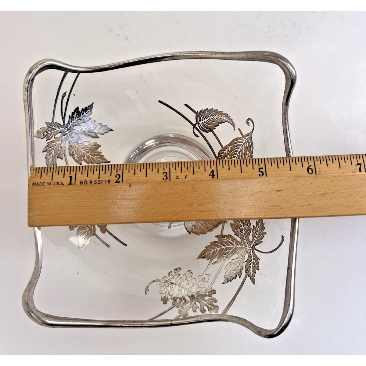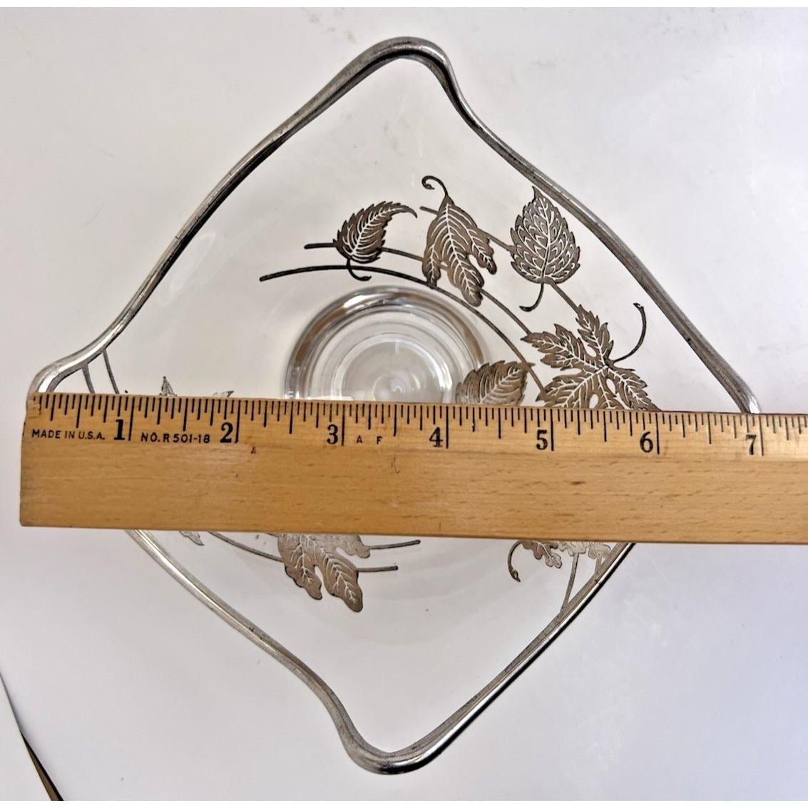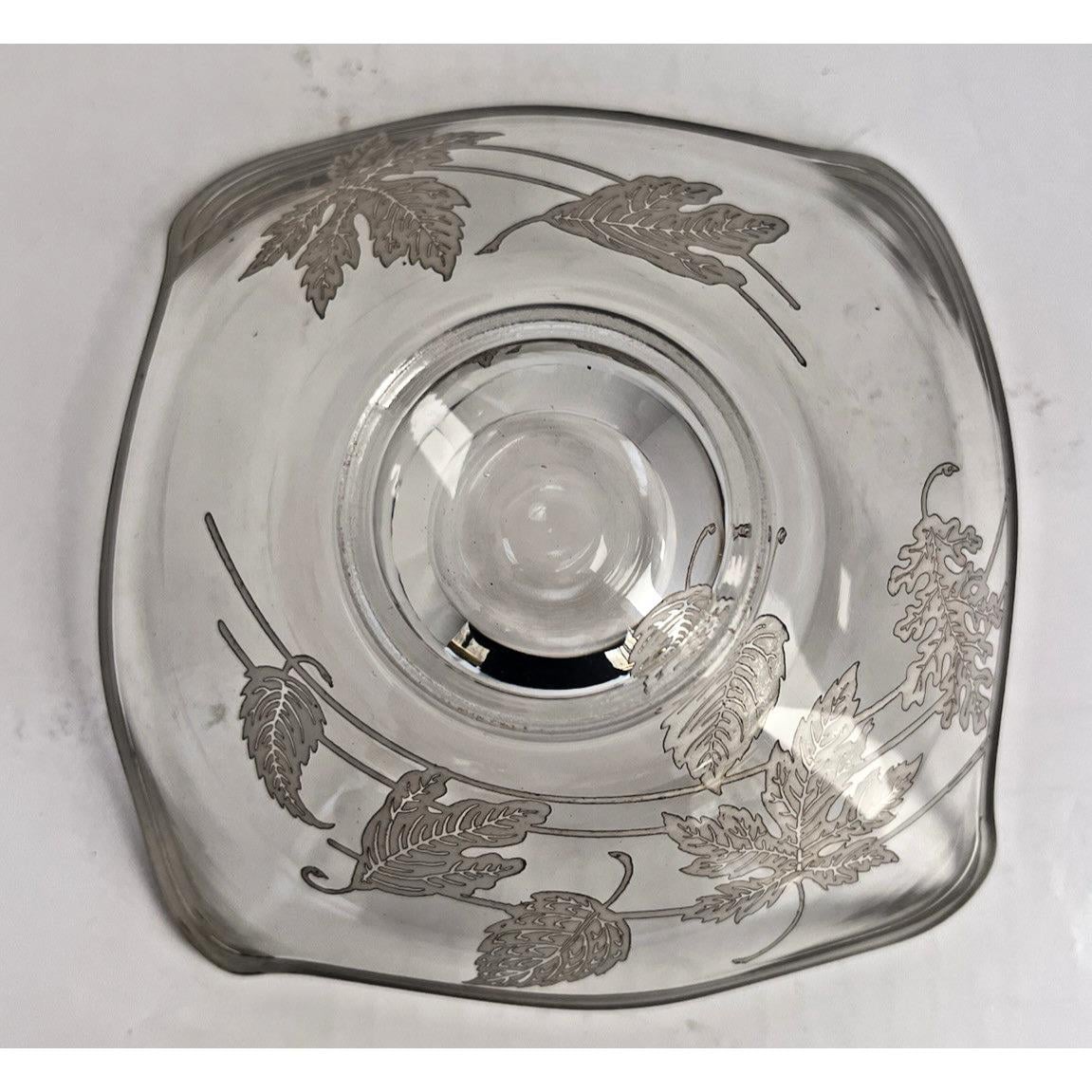 A beautifully understated vintage glass candy dish featuring a delicate silver leaf etched design and softly curved square shape. The detailing feels light and organic, giving it that effortless mid-century charm.