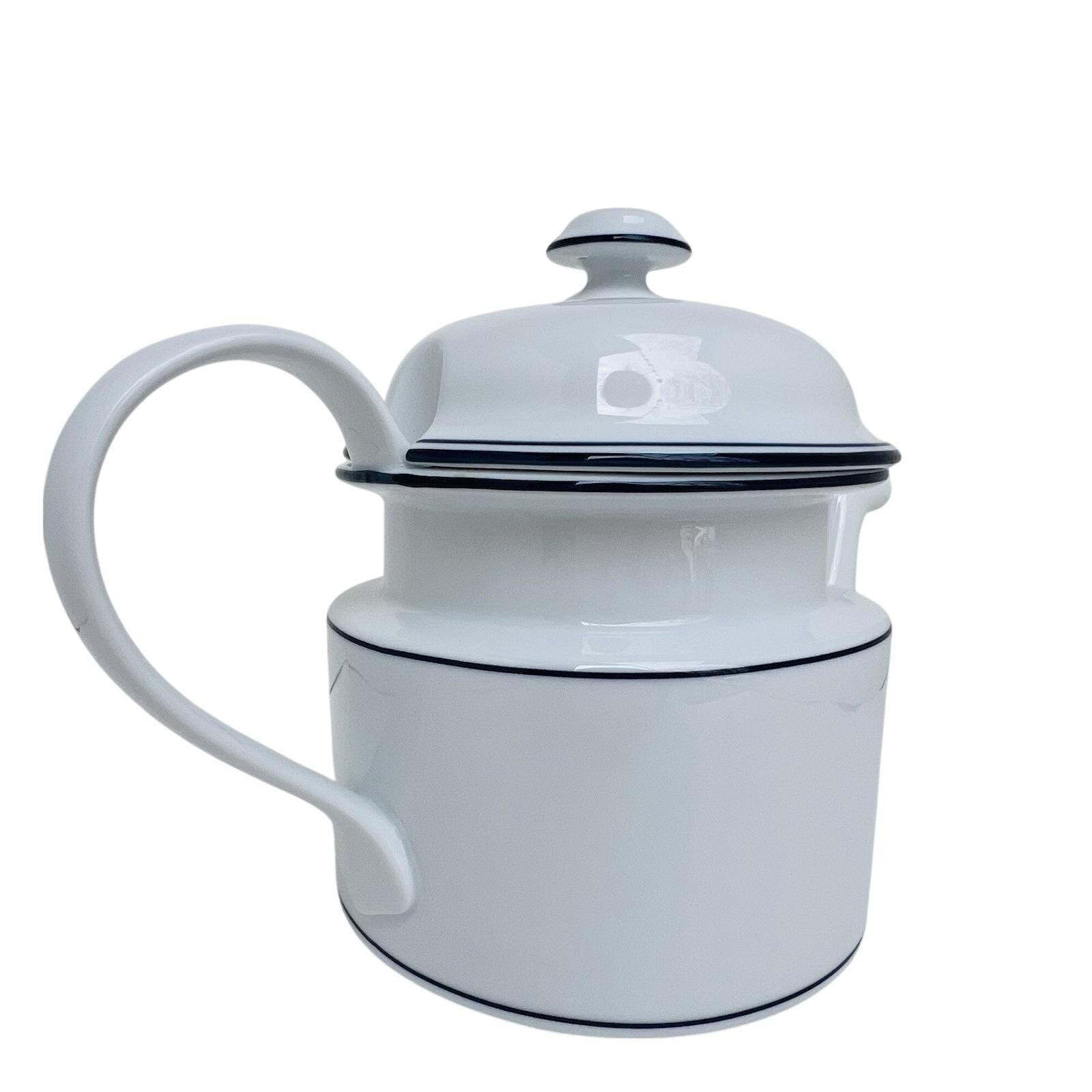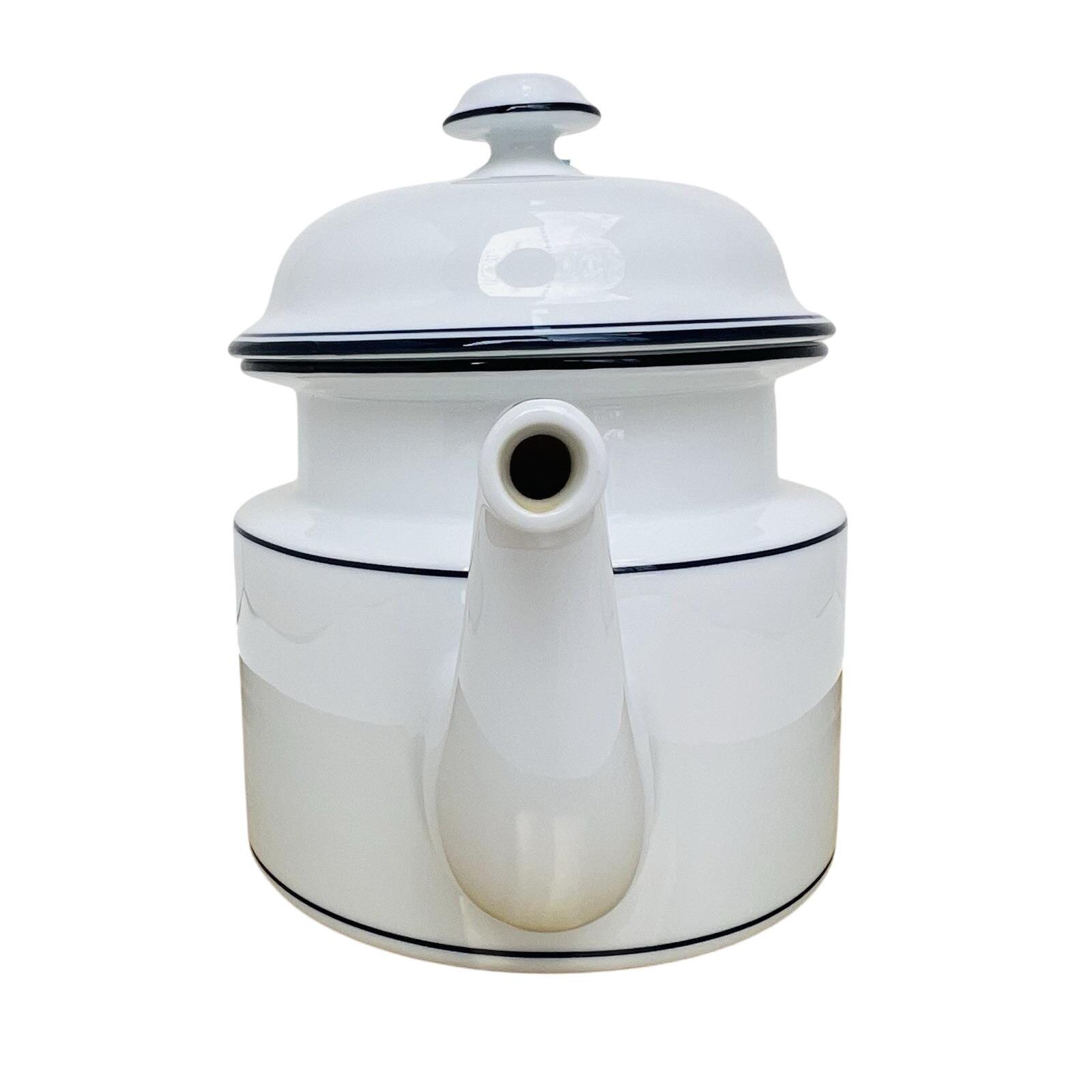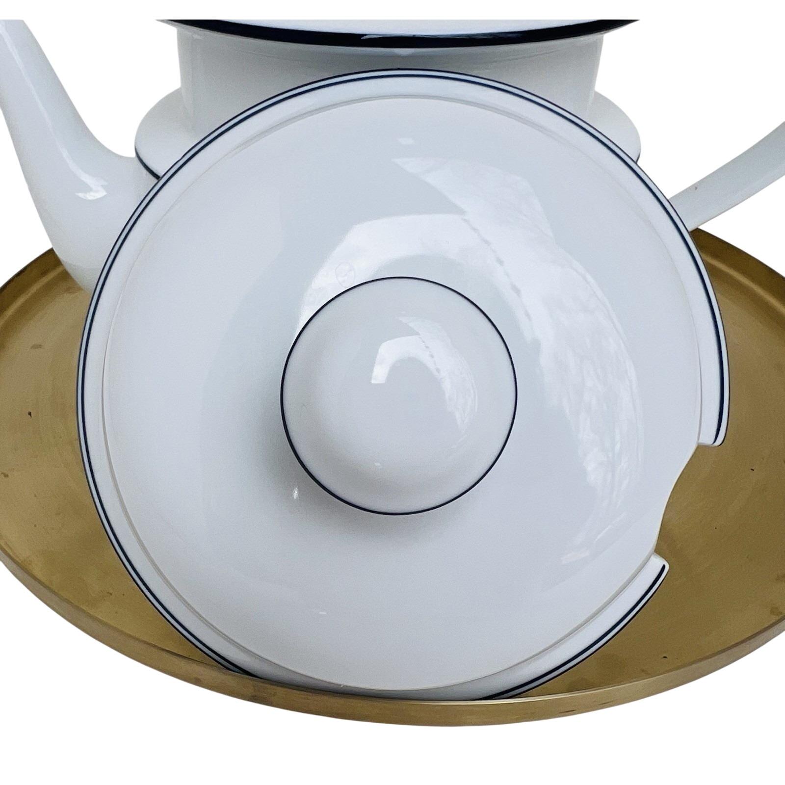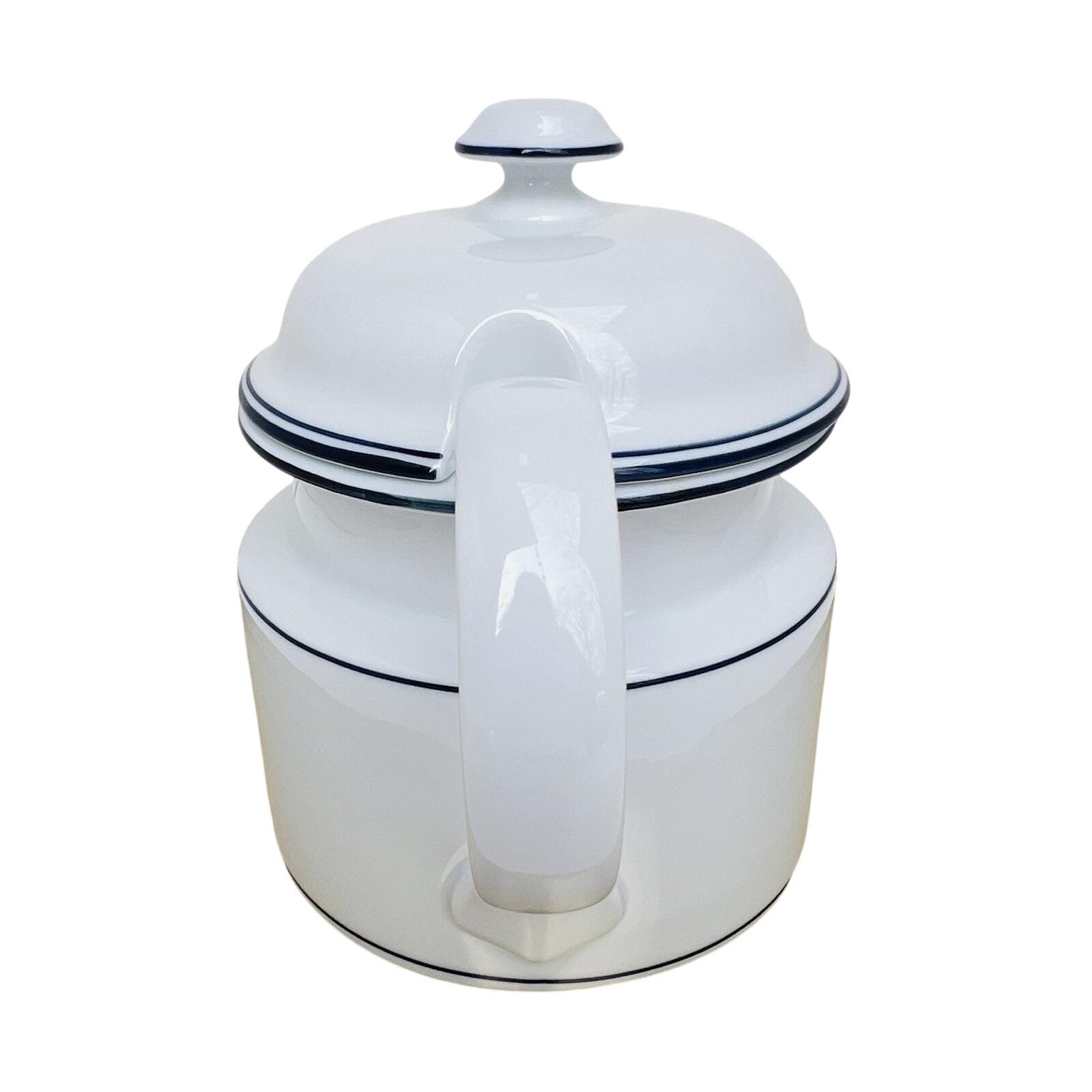 Vintage Dansk Bistro coffee pot in classic white with blue trim, made in Portugal.
