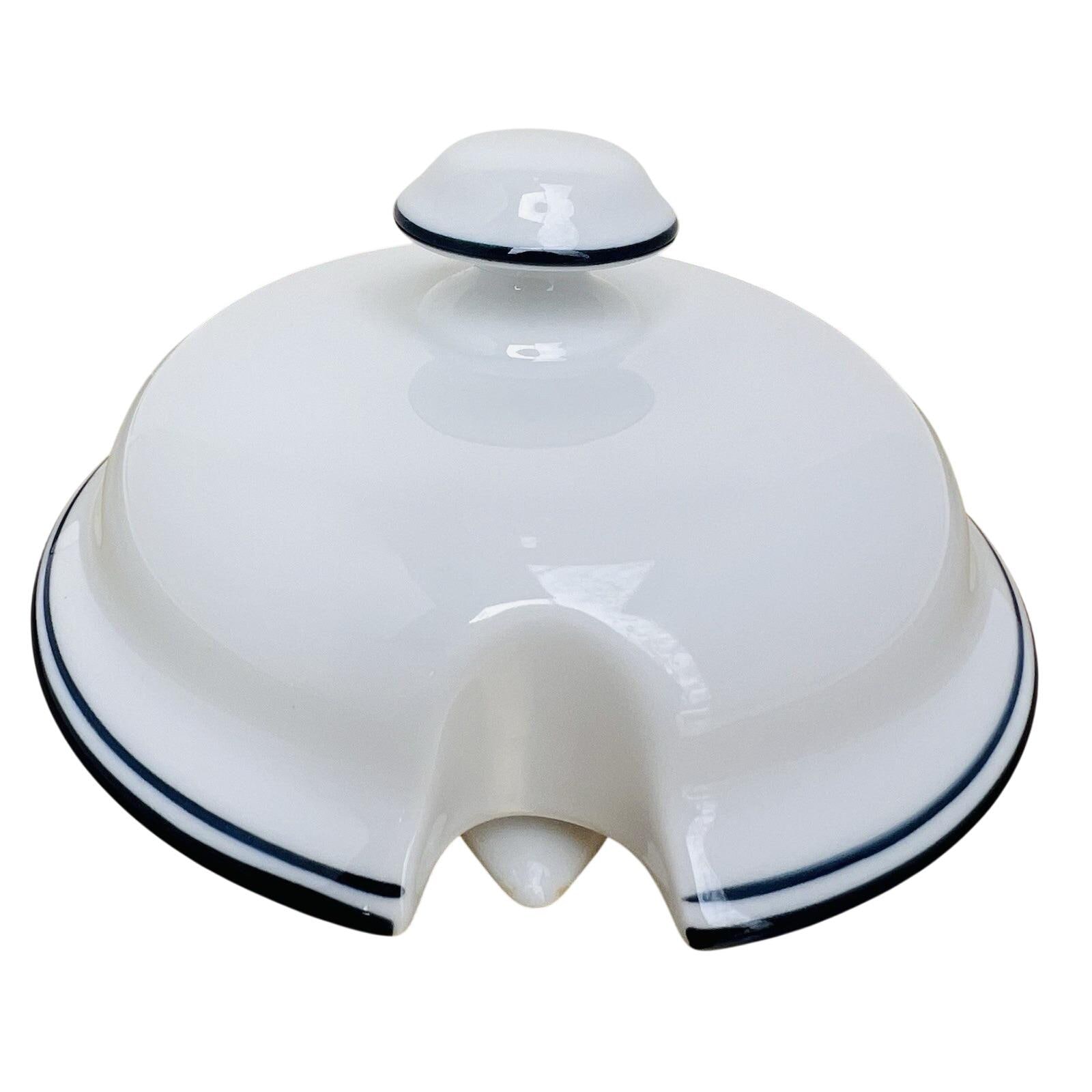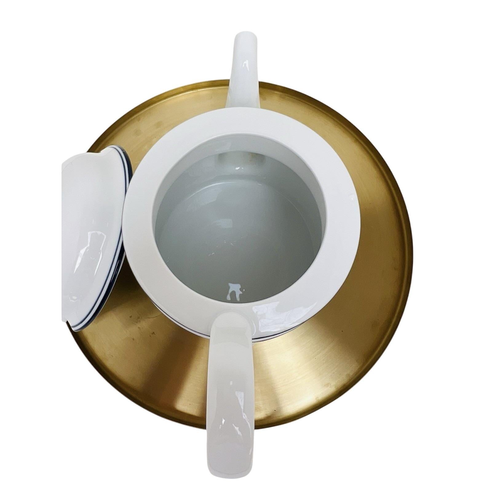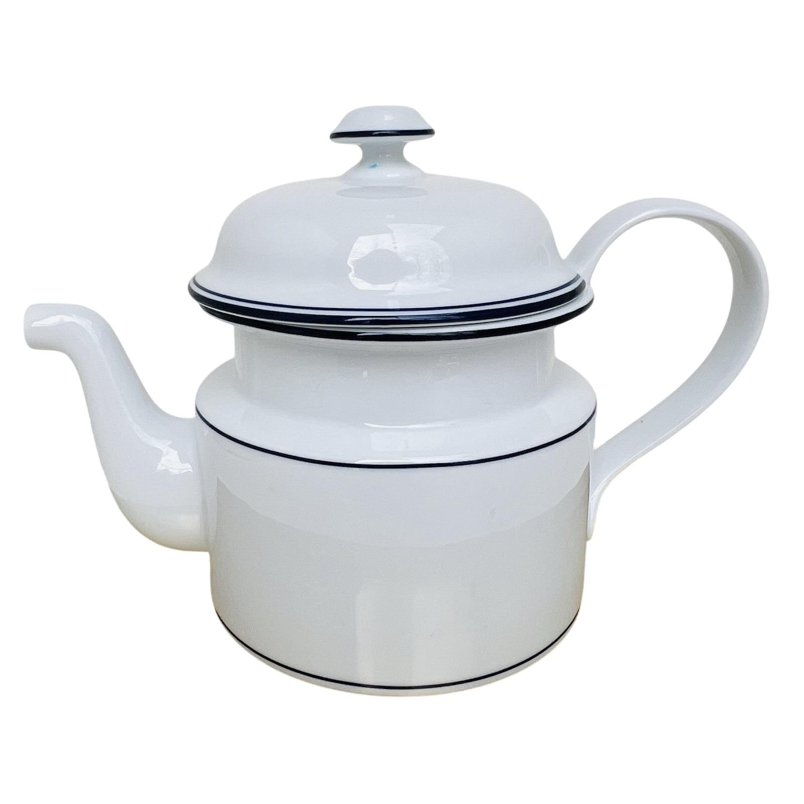 Vintage Dansk Bistro coffee pot in classic white with blue trim, made in Portugal.
