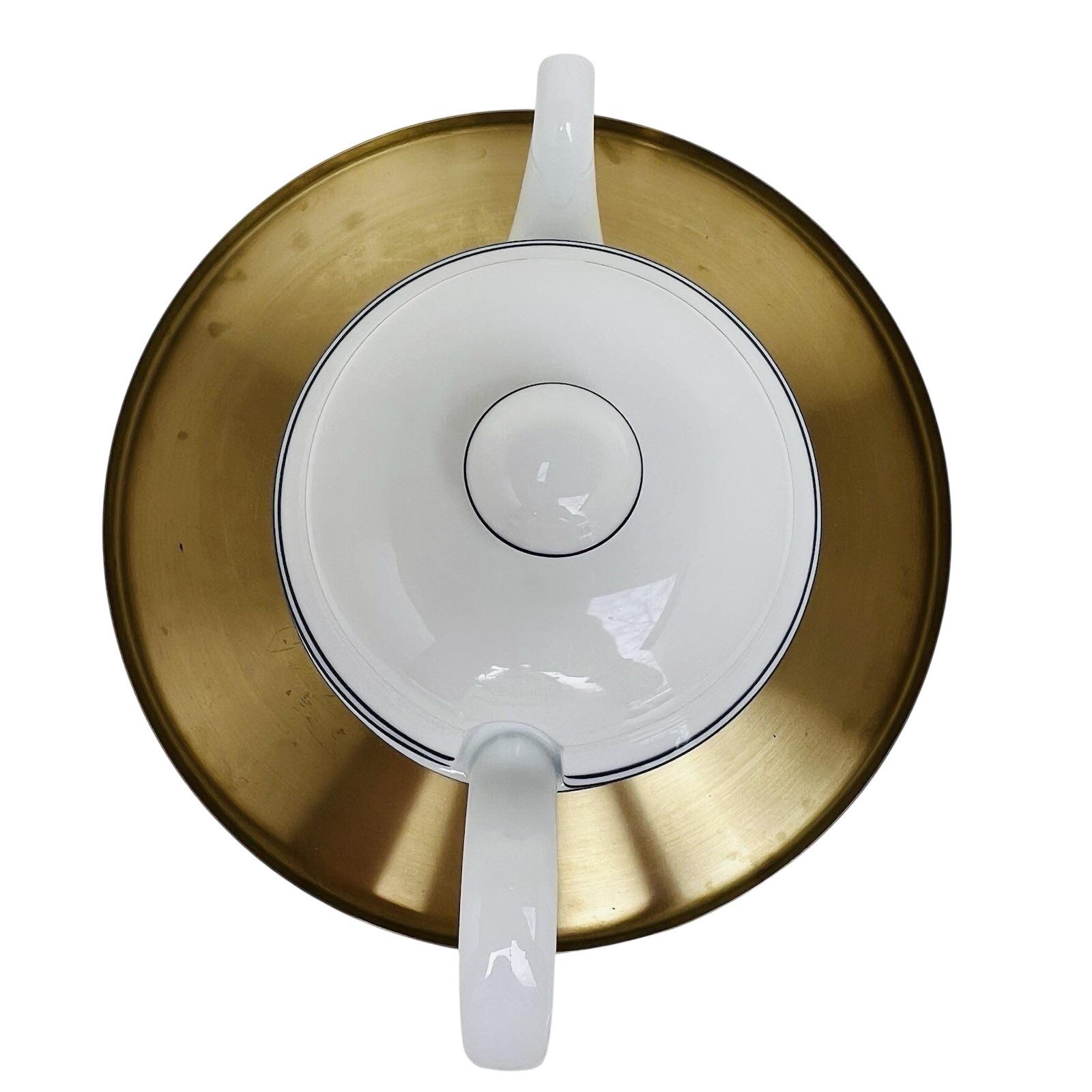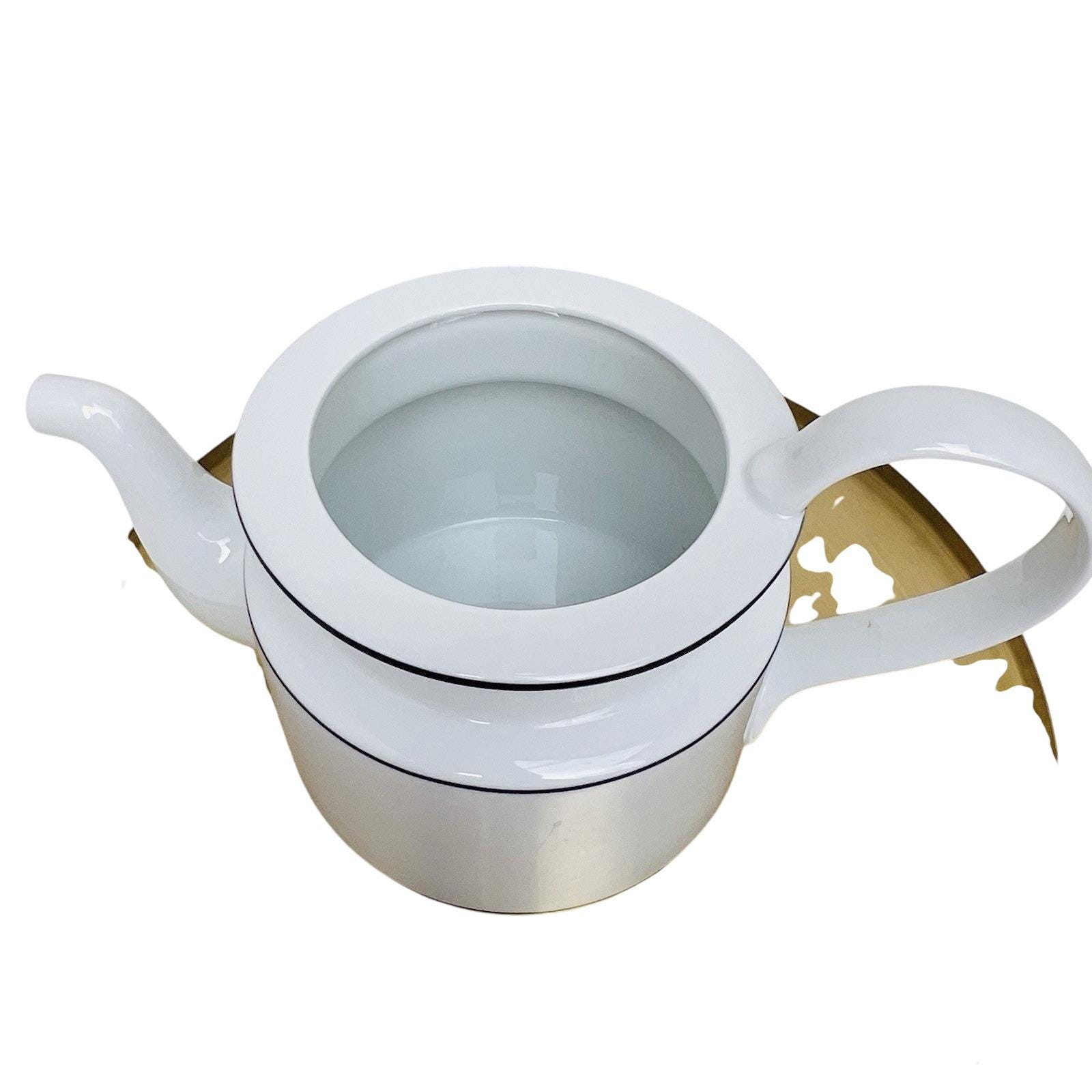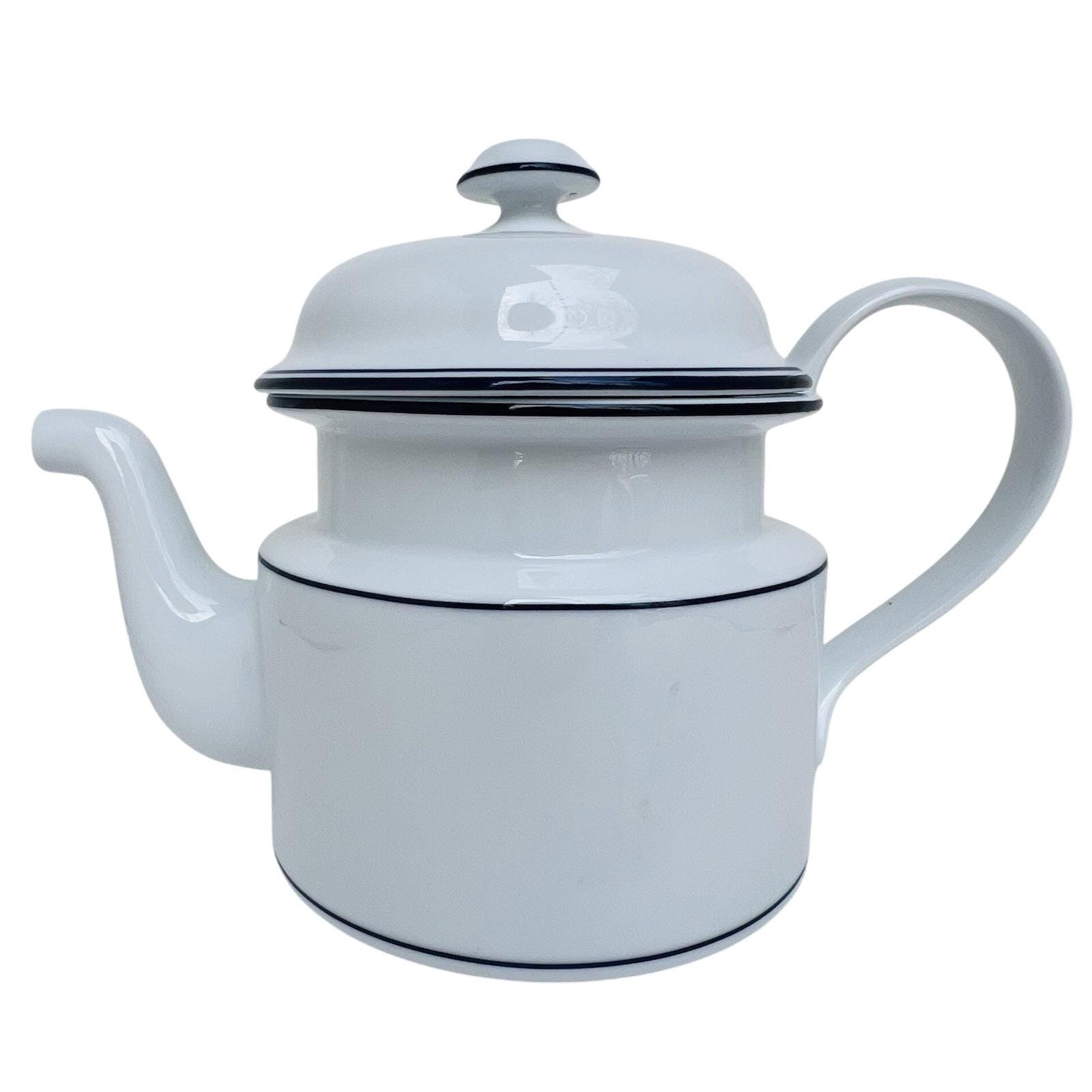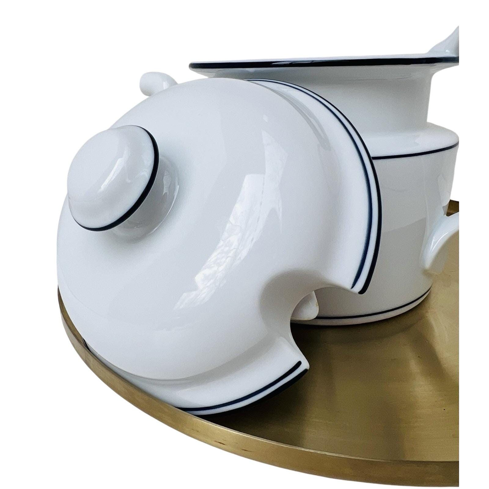 Vintage Dansk Bistro coffee pot in classic white with blue trim, made in Portugal.