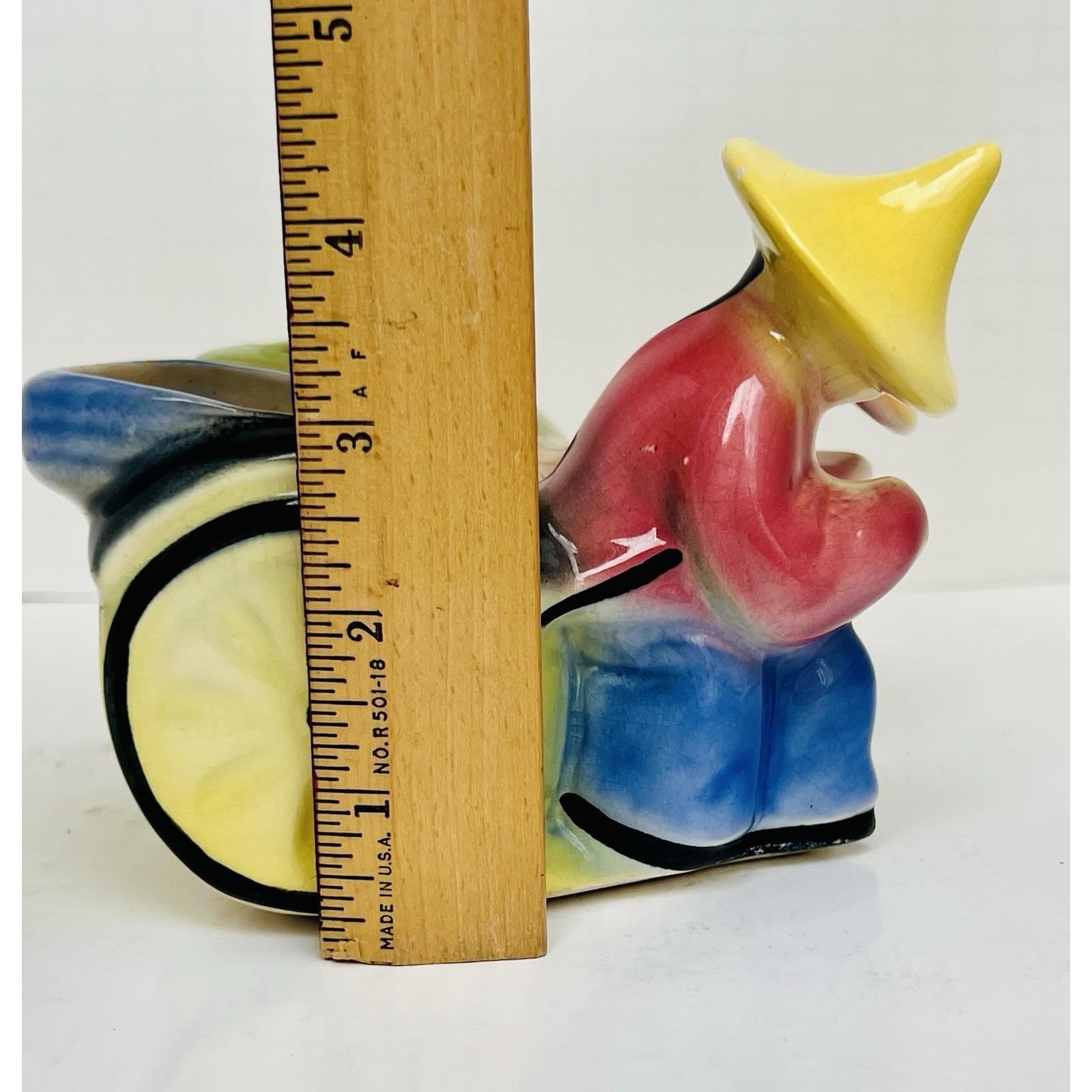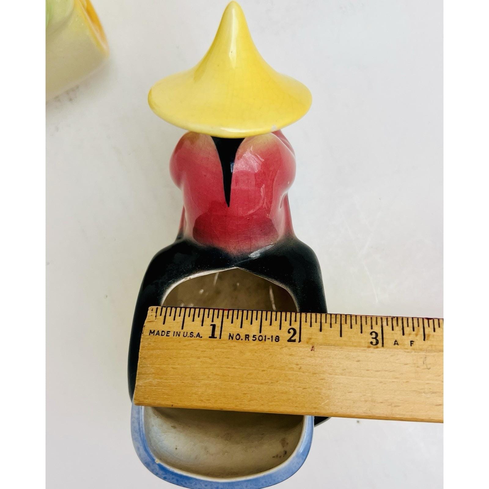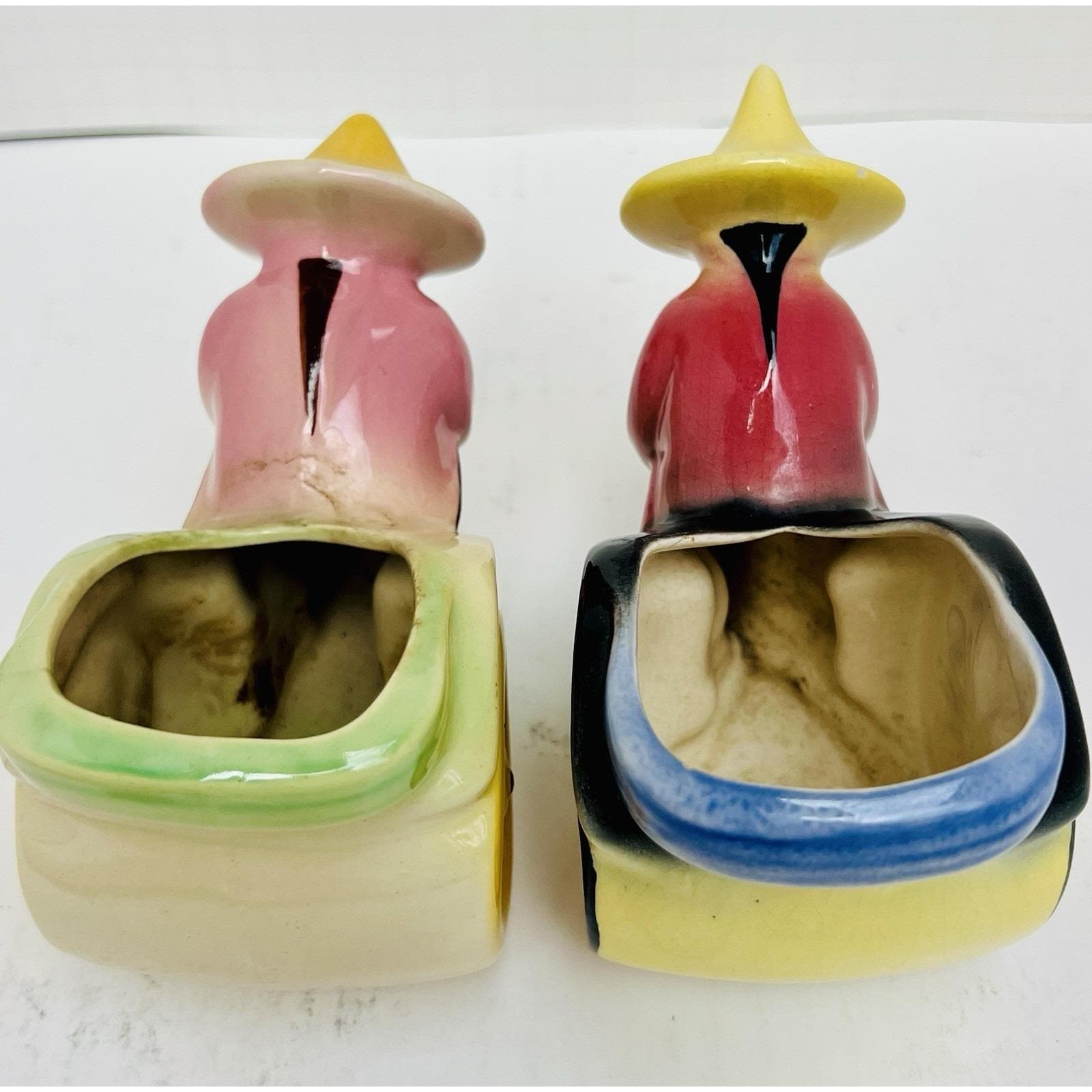 Charming set of 2 vintage ceramic figural planters featuring rickshaw drivers in a classic Asian motif. These mid-century pieces are beautifully hand-painted with soft blended colors and glossy glaze, making them great decorative accents or small plant holders.