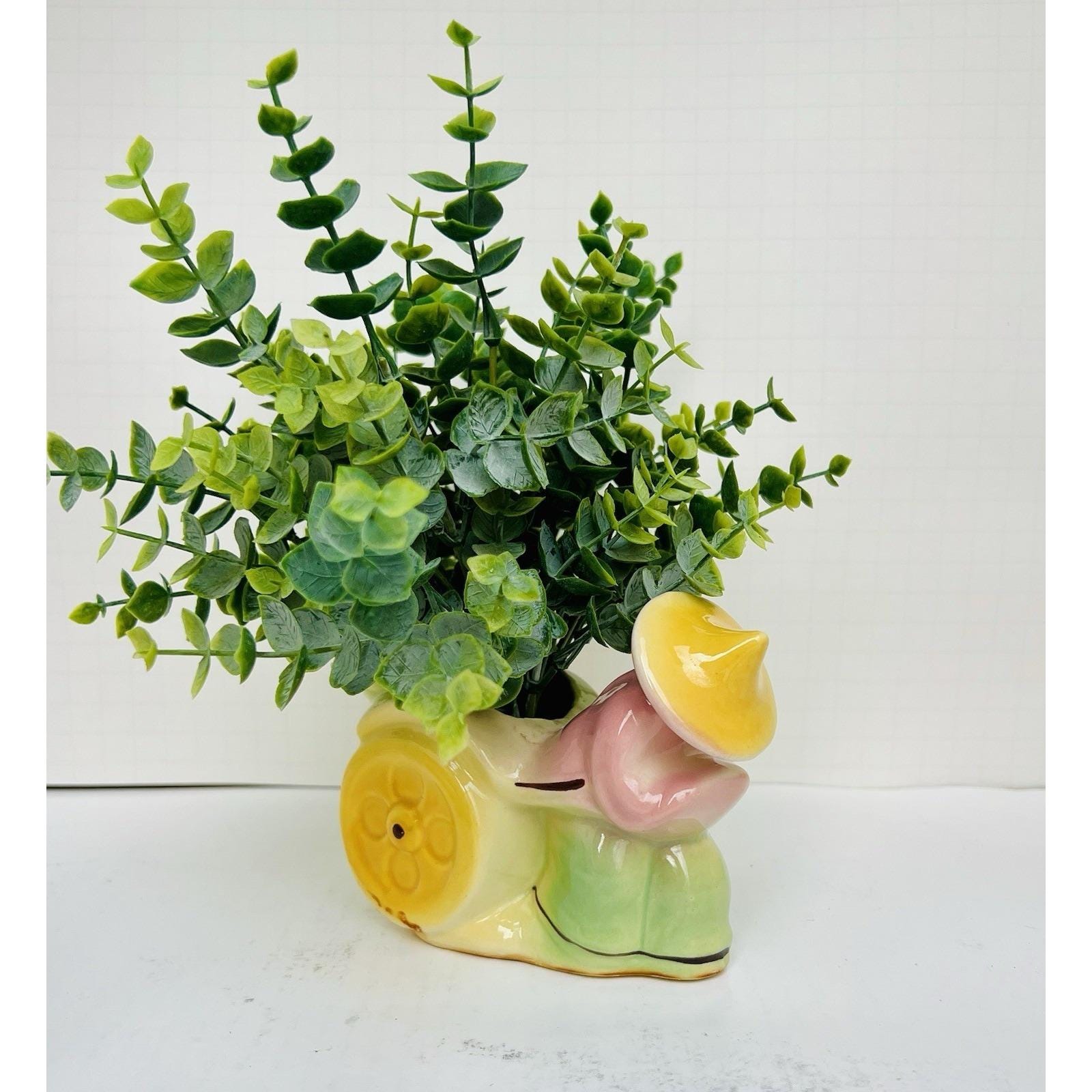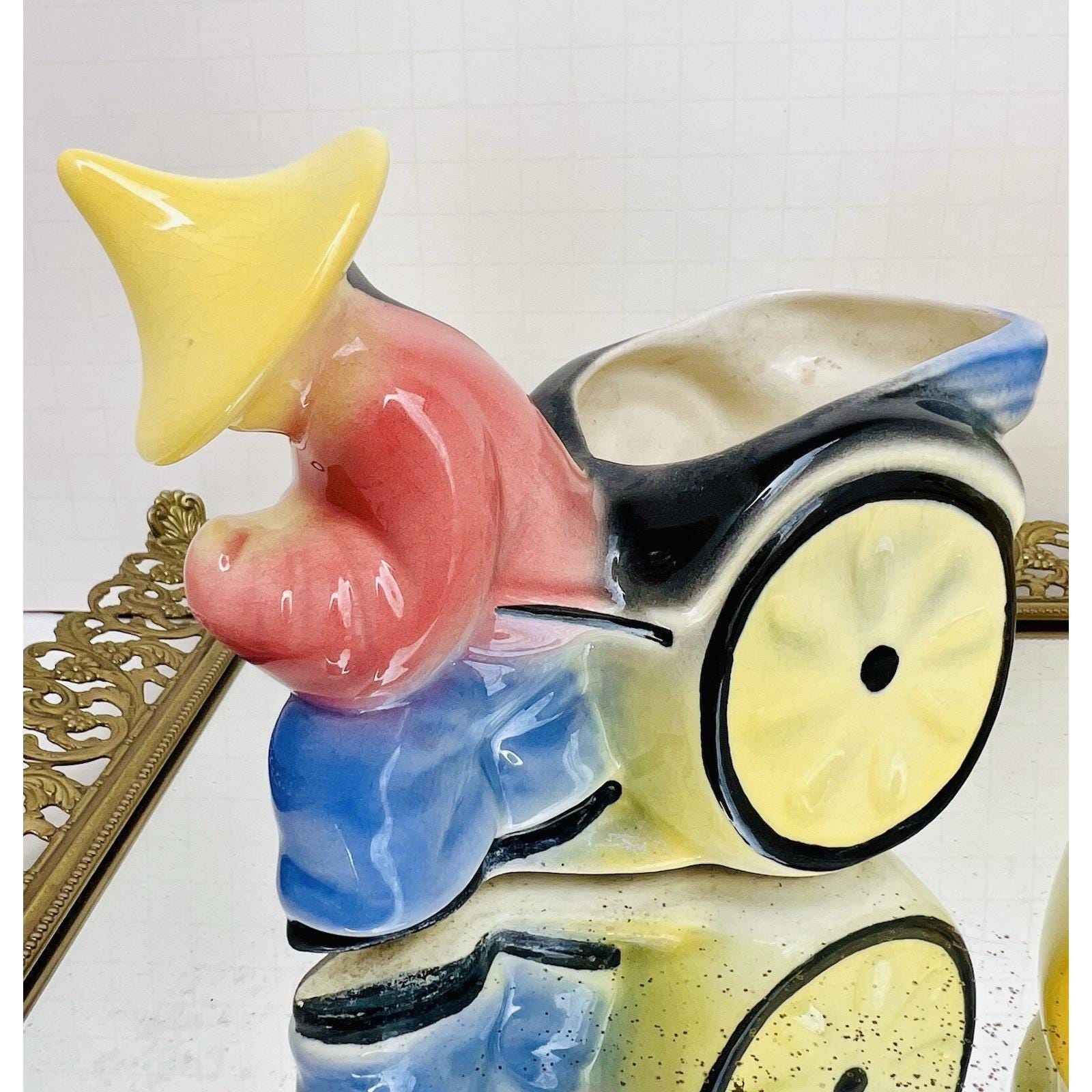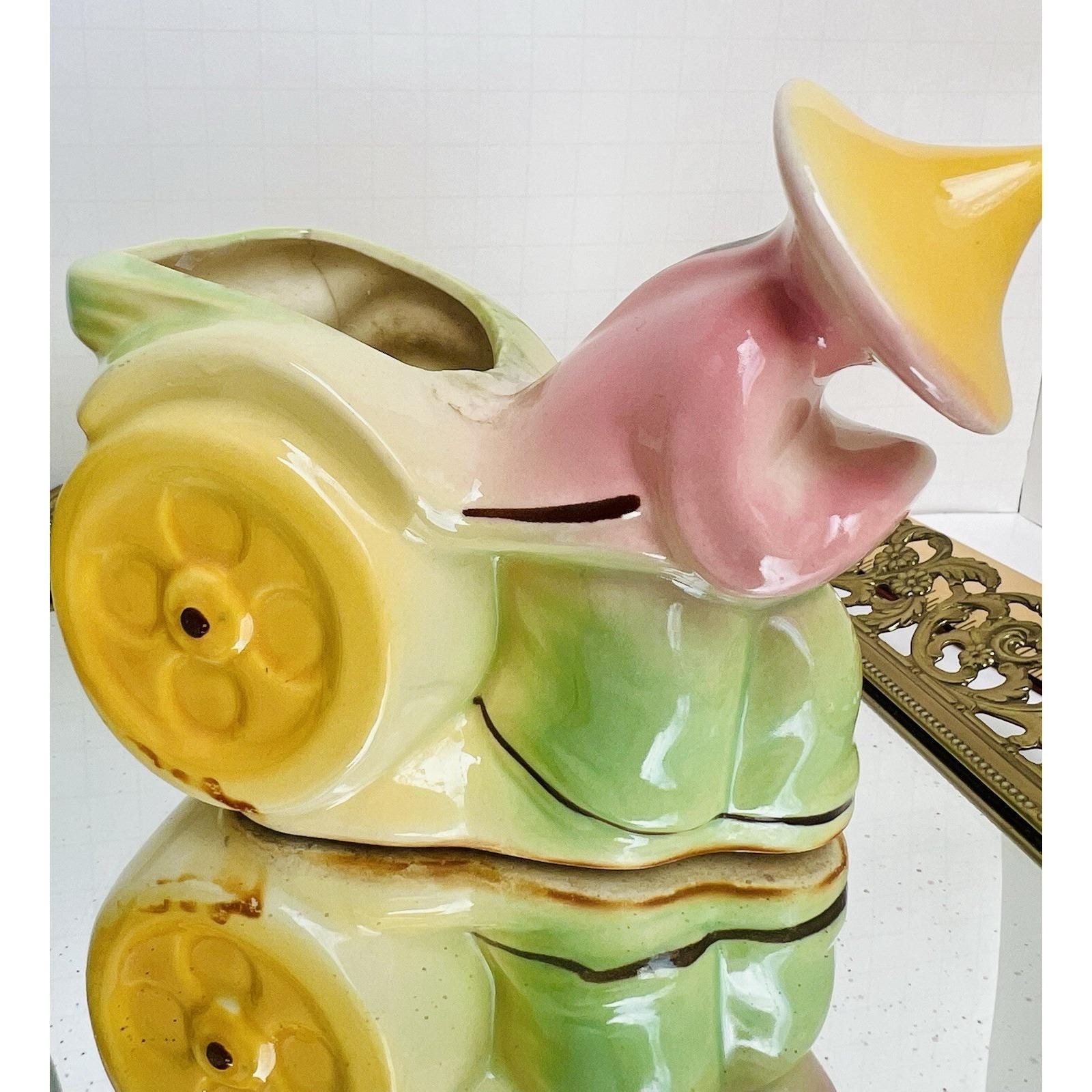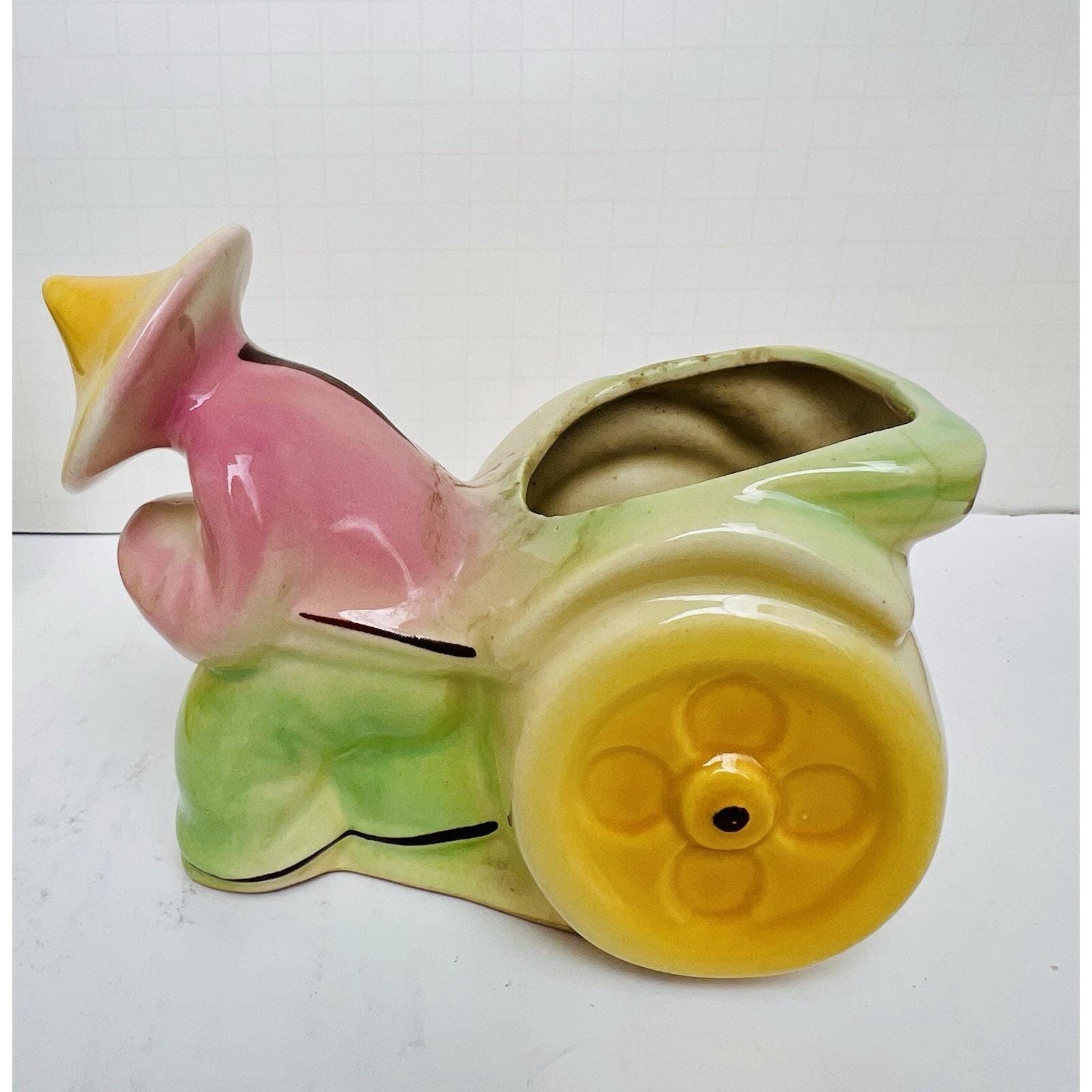 Charming set of 2 vintage ceramic figural planters featuring rickshaw drivers in a classic Asian motif. These mid-century pieces are beautifully hand-painted with soft blended colors and glossy glaze, making them great decorative accents or small plant holders.