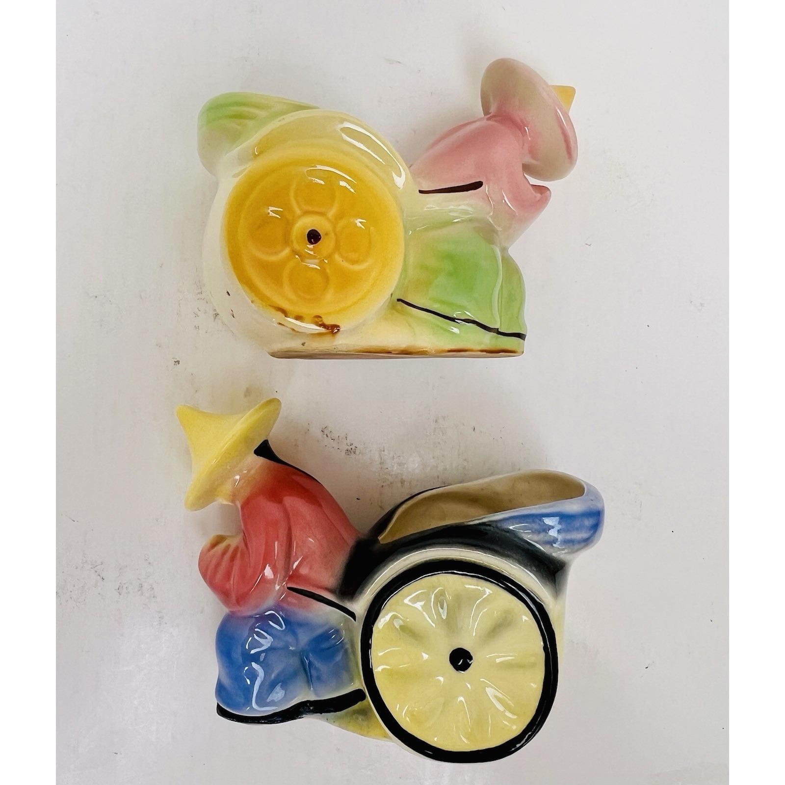 Each planter features a seated figure pulling a rickshaw-style cart with an open planter cavity. Likely made in Japan, a common origin for this style of collectible mid-century ceramic décor.