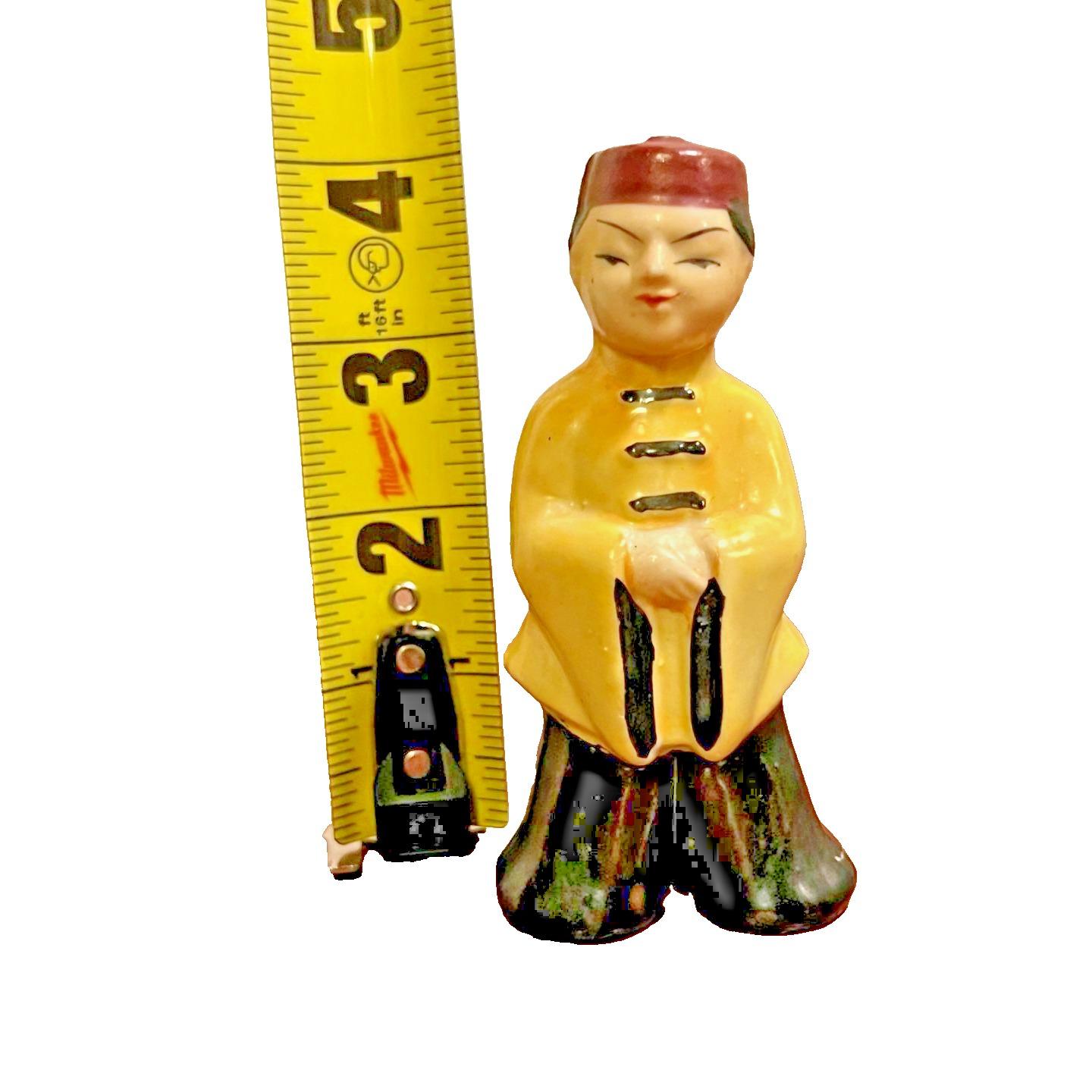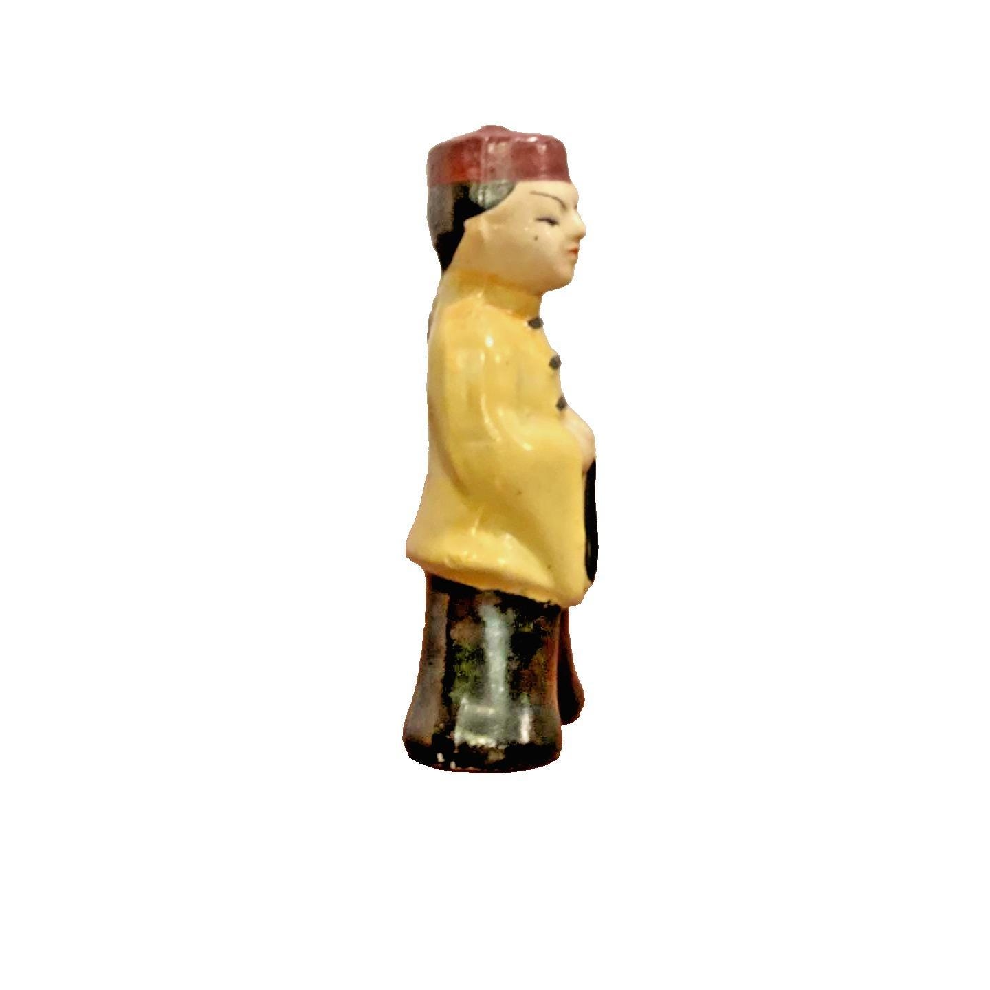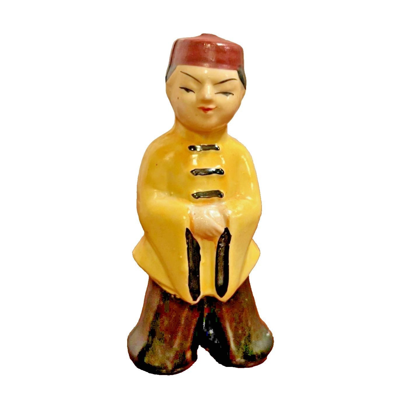 This Vintage Japan Asian Boy Figurine from the 1950s is a unique and charming decorative collectible. Hand painted with a glazed finish, this ceramic figurine showcases intricate Asian details and colors. Standing at 3.75 inches tall, this one-of-a-kind piece is perfect for any room and any occasion. Made in Japan during the mid-20th century, this figurine is a timeless addition to any collection of Asian-themed decor.