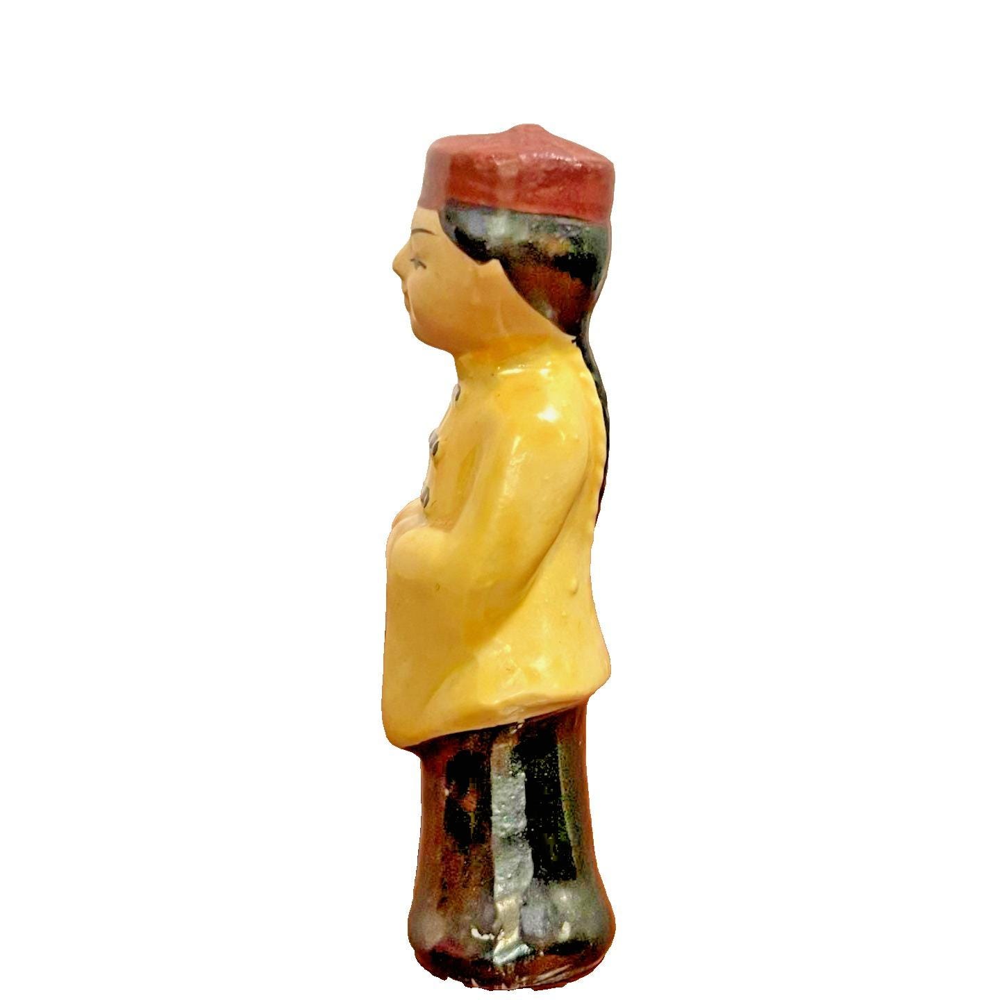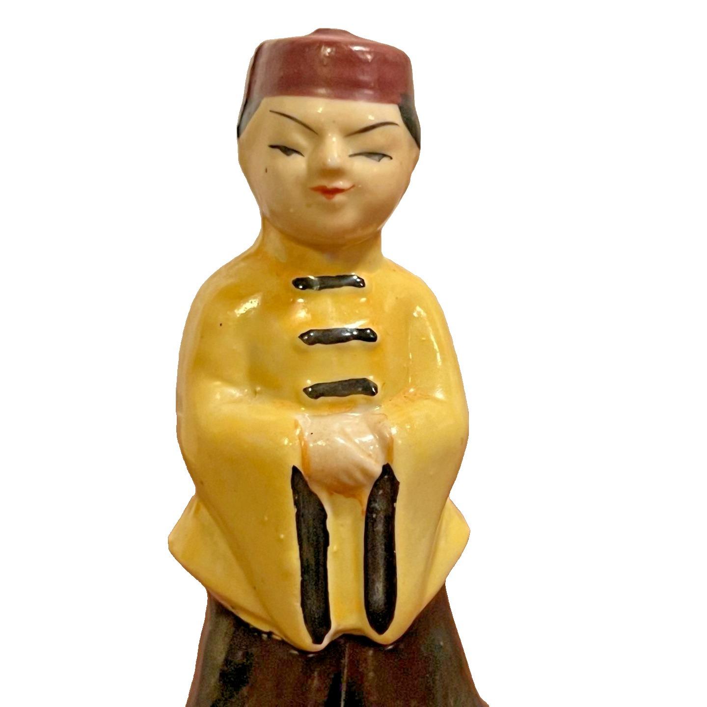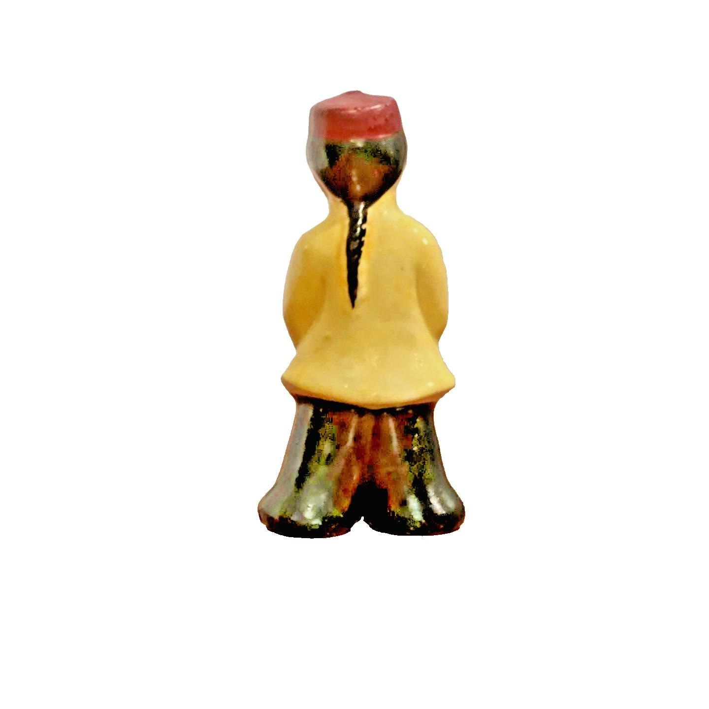 This Vintage Japan Asian Boy Figurine from the 1950s is a unique and charming decorative collectible. Hand painted with a glazed finish, this ceramic figurine showcases intricate Asian details and colors. Standing at 3.75 inches tall, this one-of-a-kind piece is perfect for any room and any occasion. Made in Japan during the mid-20th century, this figurine is a timeless addition to any collection of Asian-themed decor.