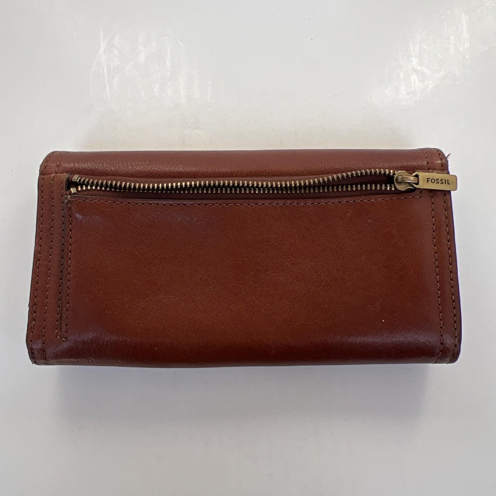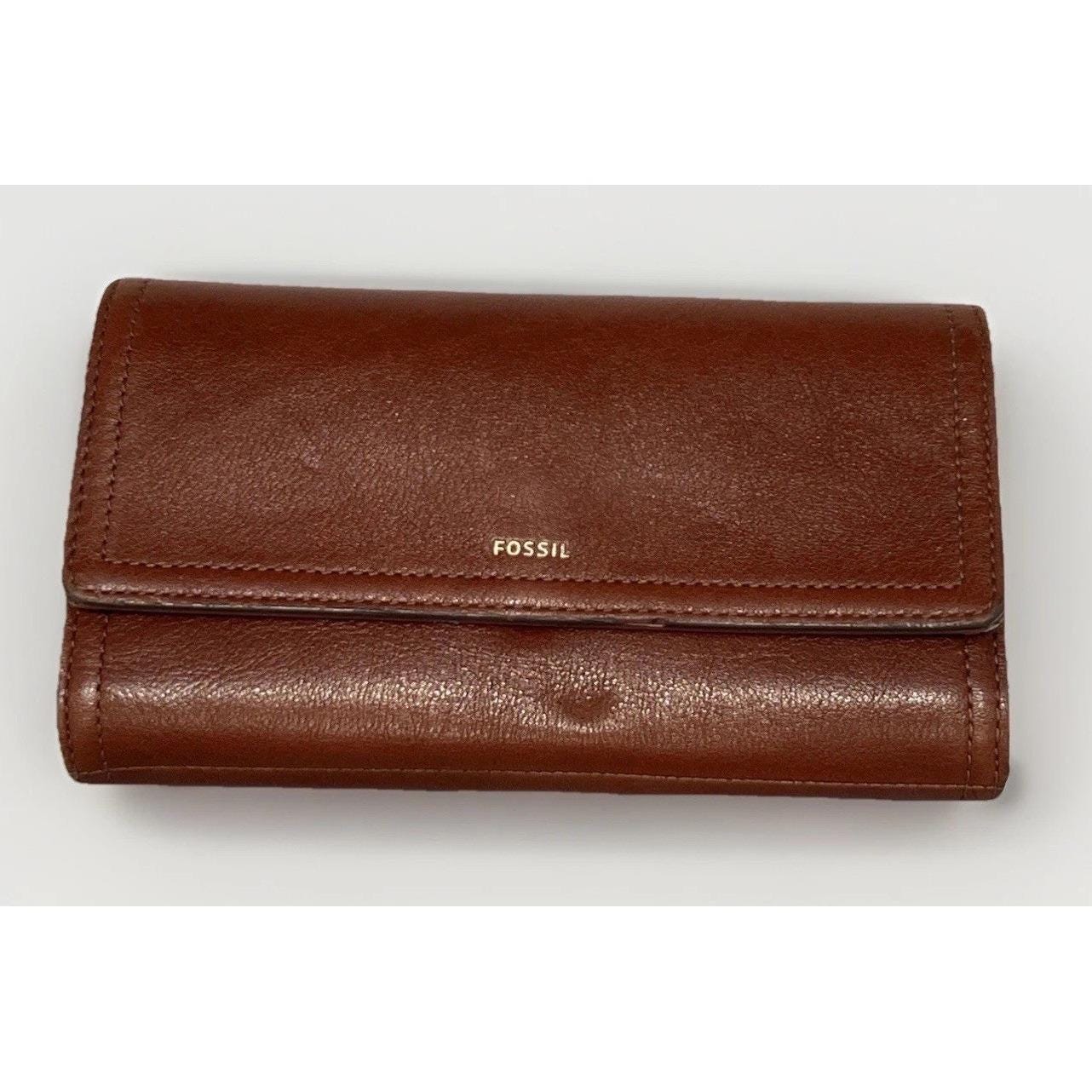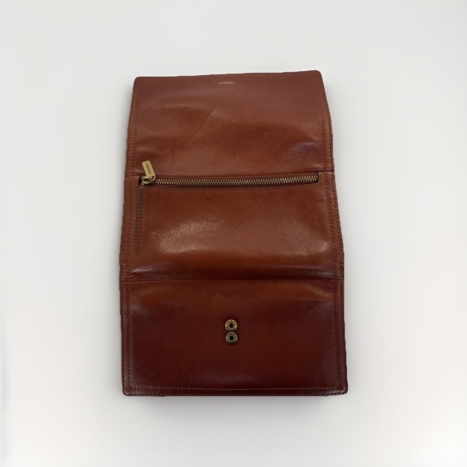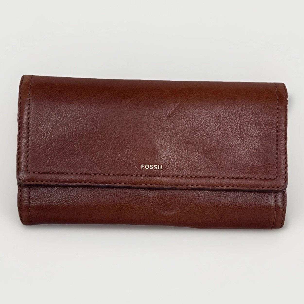 Classic and functional Fossil brown leather trifold wallet featuring a secure snap closure and multiple compartments for everyday organization. Includes slots for cards, cash, and checkbook-style storage.