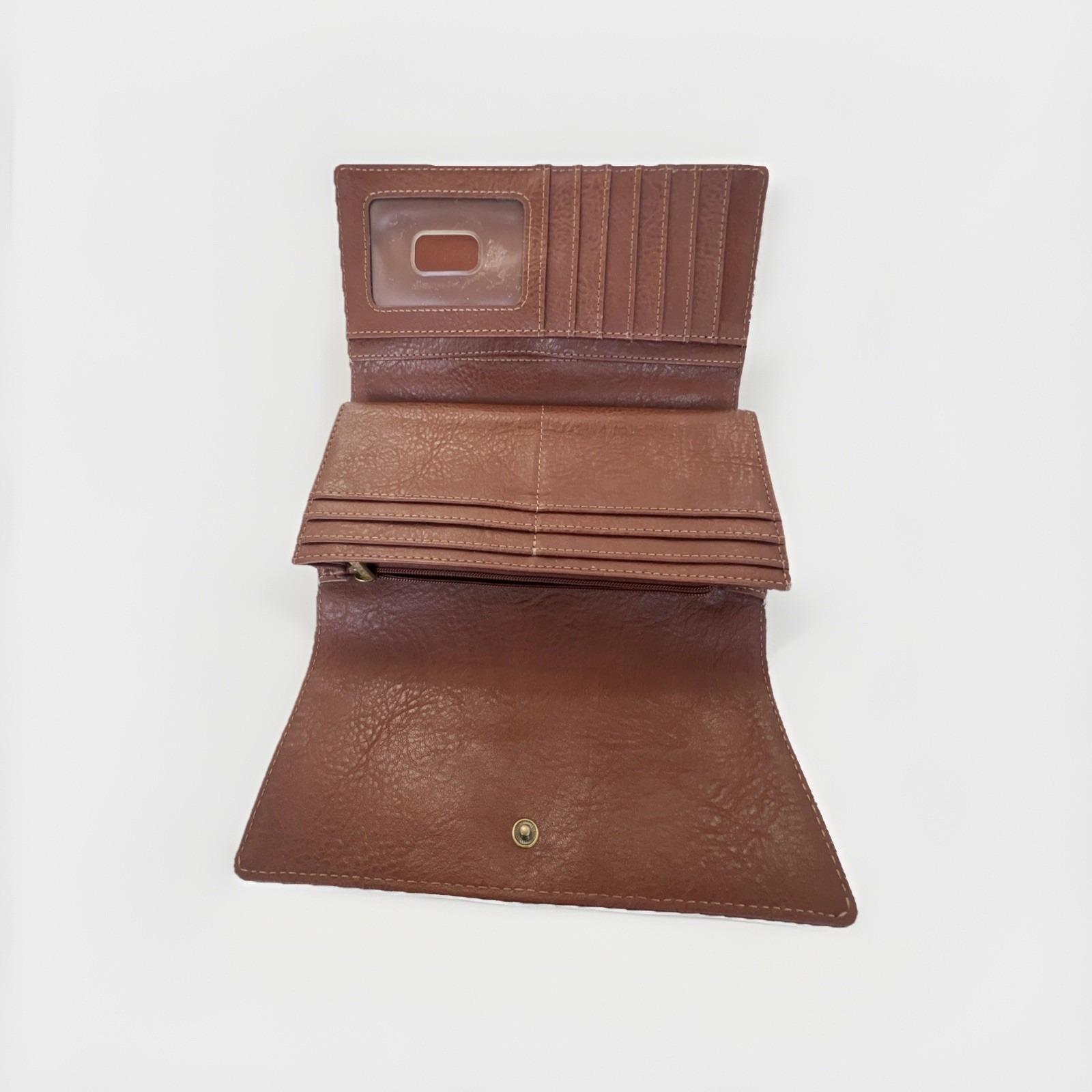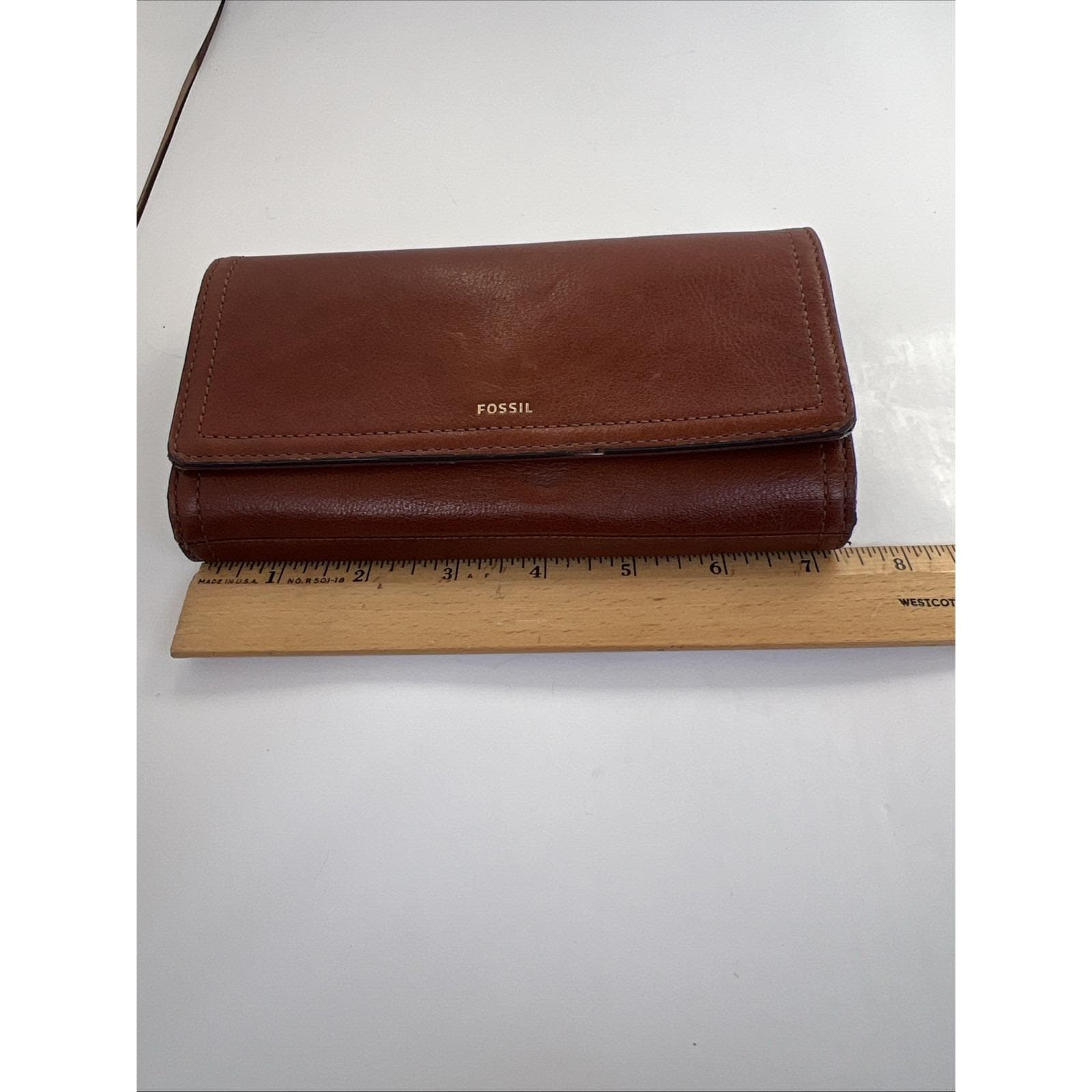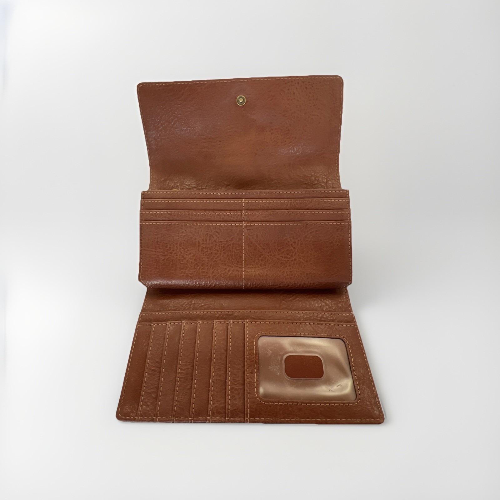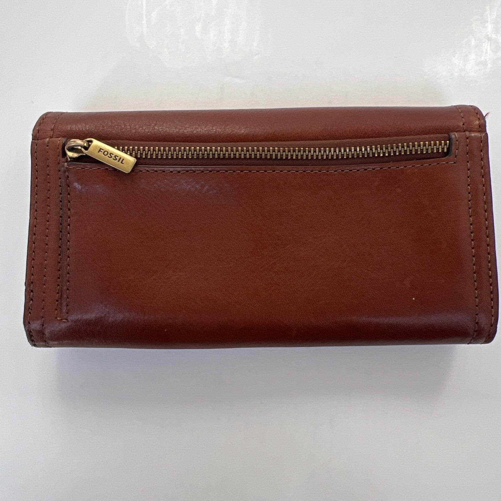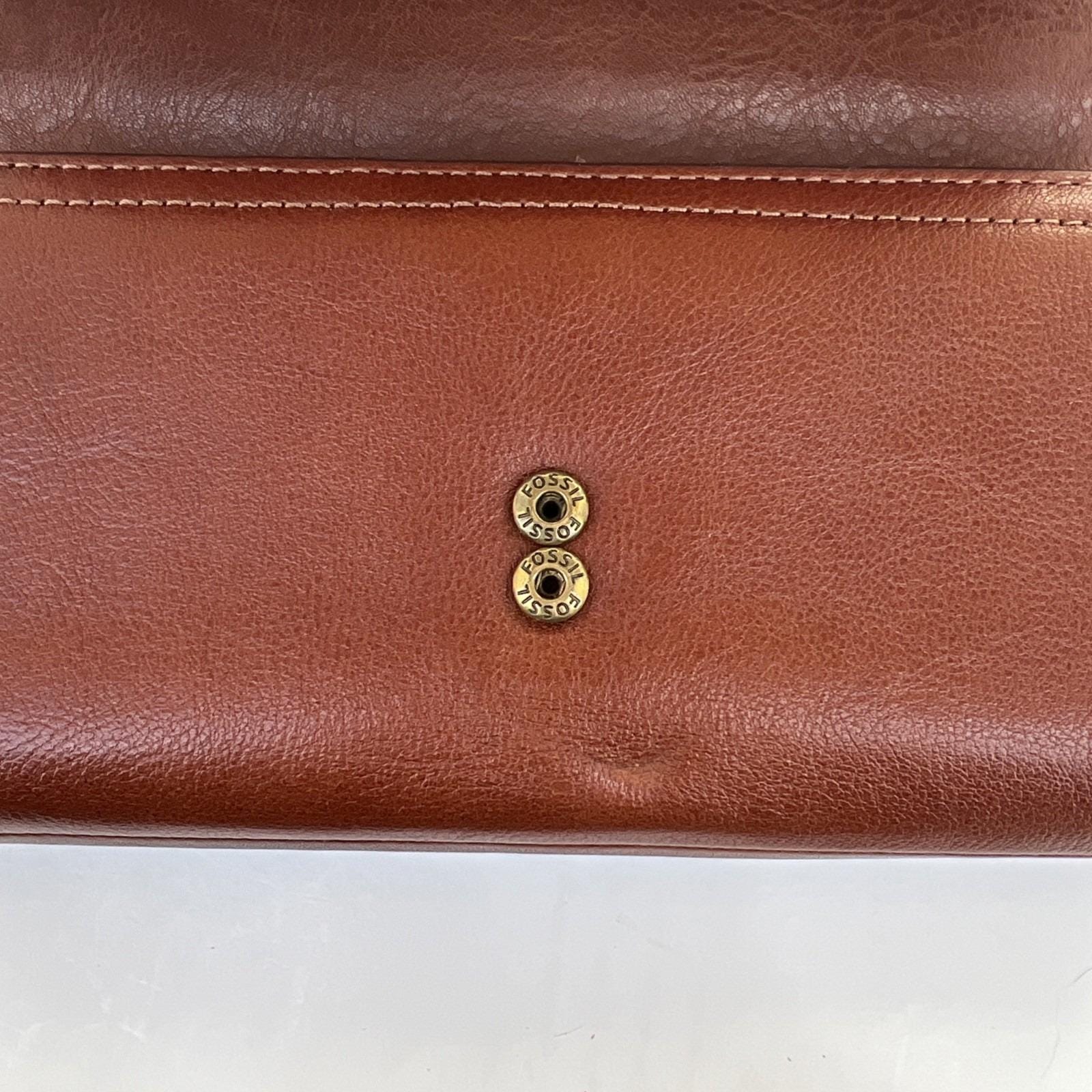Classic and functional Fossil brown leather trifold wallet featuring a secure snap closure and multiple compartments for everyday organization. Includes slots for cards, cash, and checkbook-style storage.