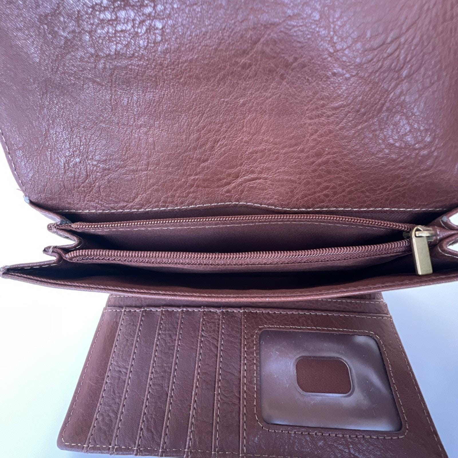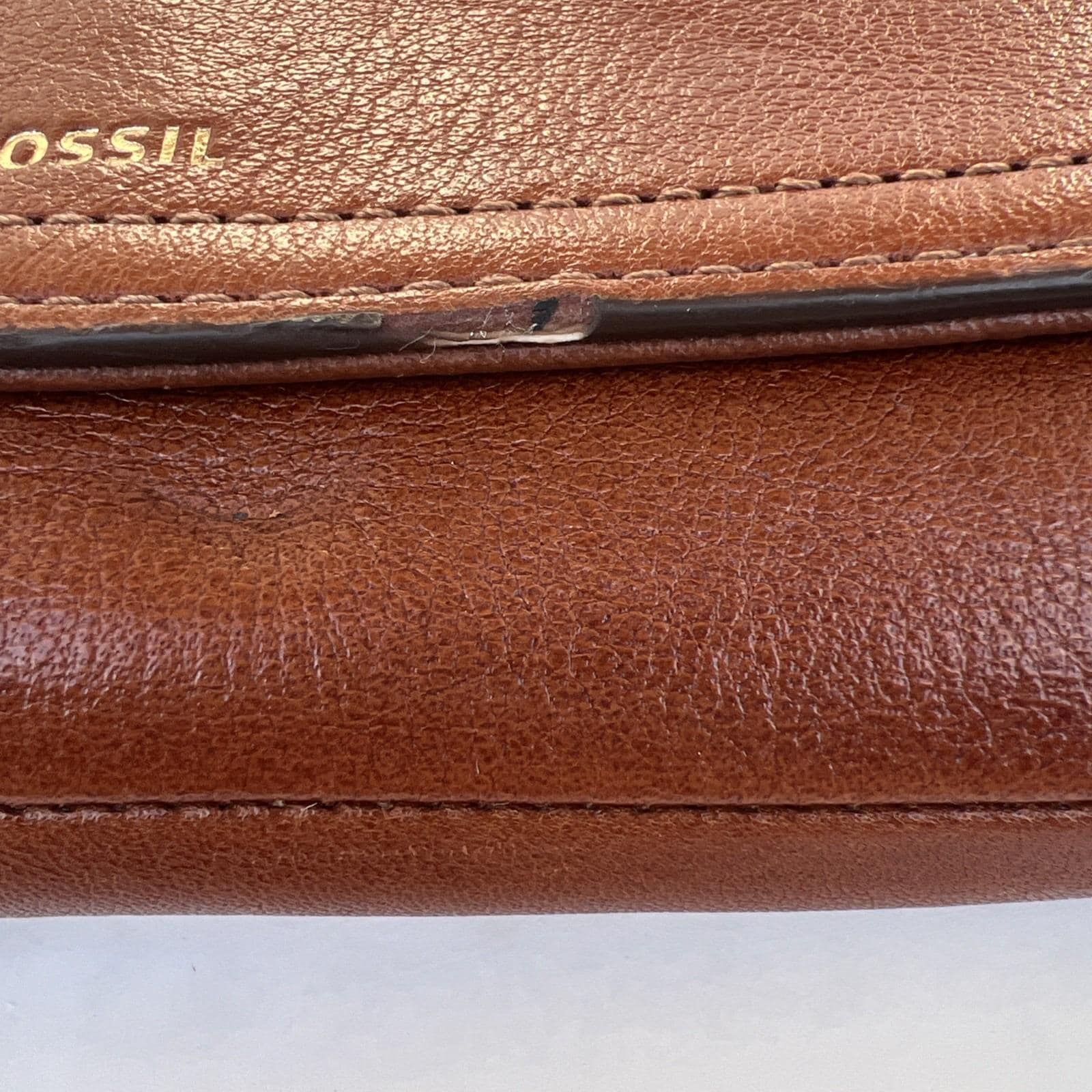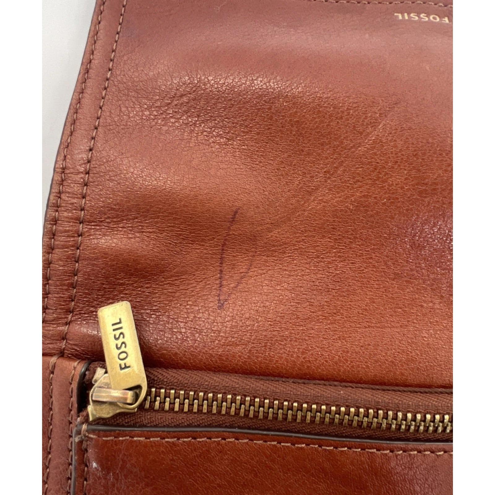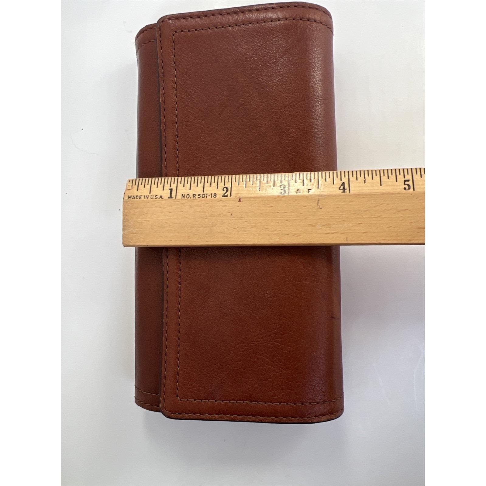 Classic and functional Fossil brown leather trifold wallet featuring a secure snap closure and multiple compartments for everyday organization. Includes slots for cards, cash, and checkbook-style storage.