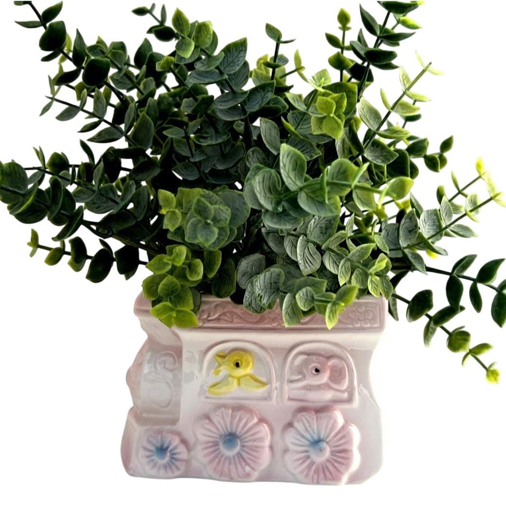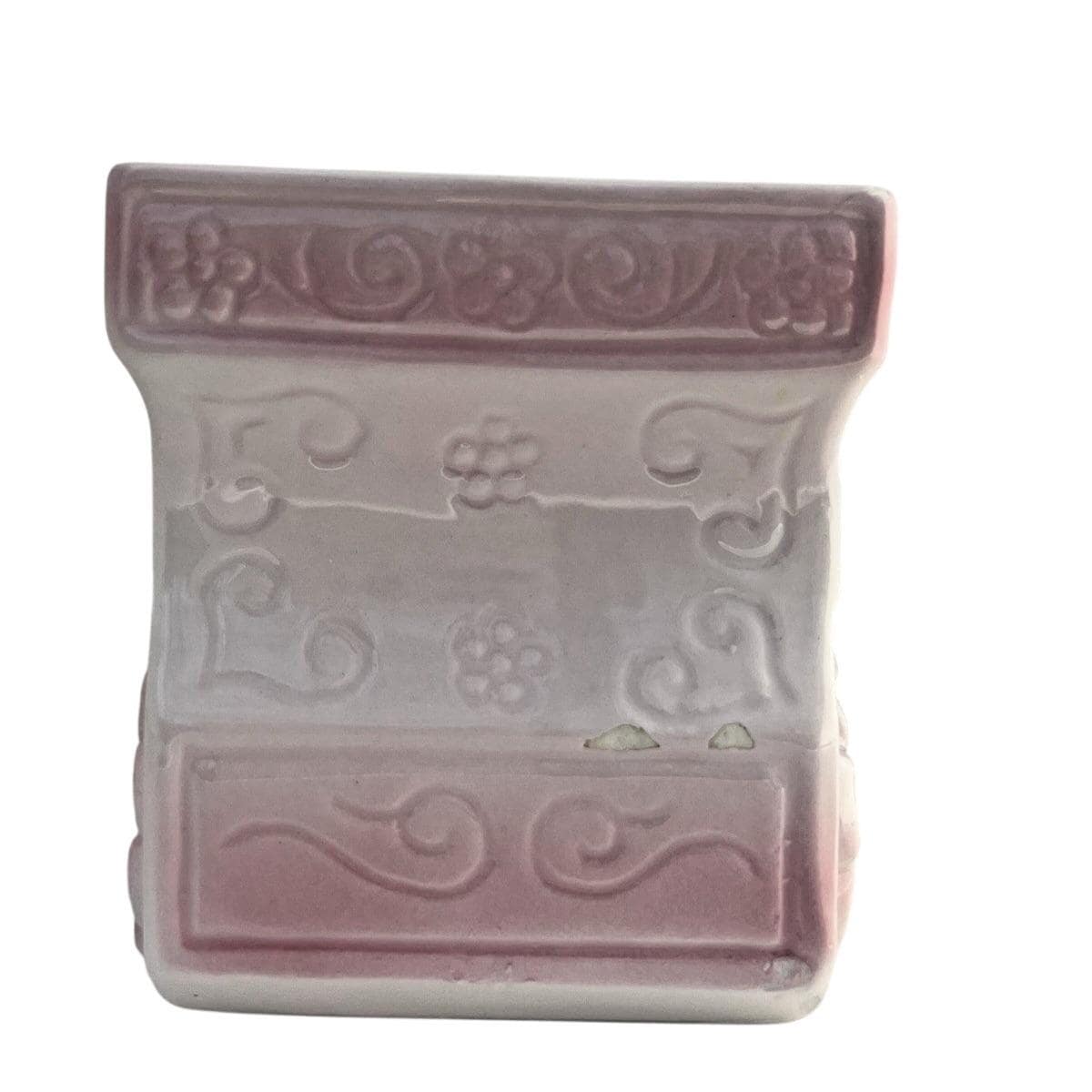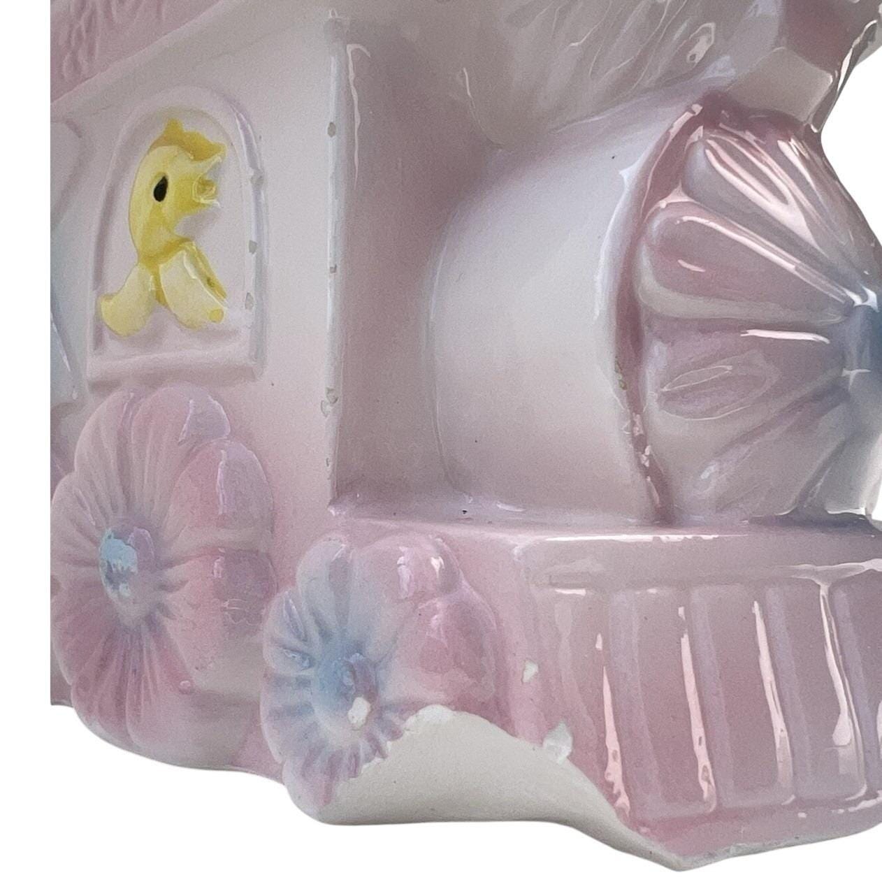 Sweet vintage ceramic planter in the shape of a baby buggy, featuring soft blue and pink tones with charming, raised details.
