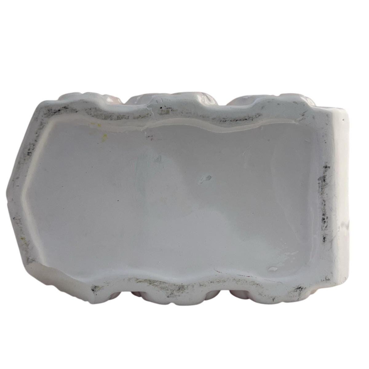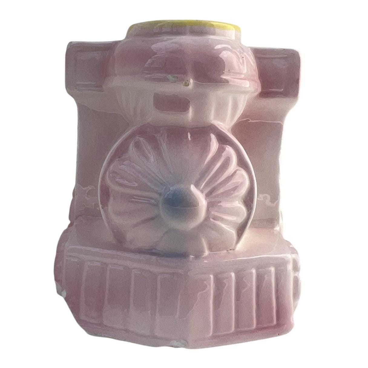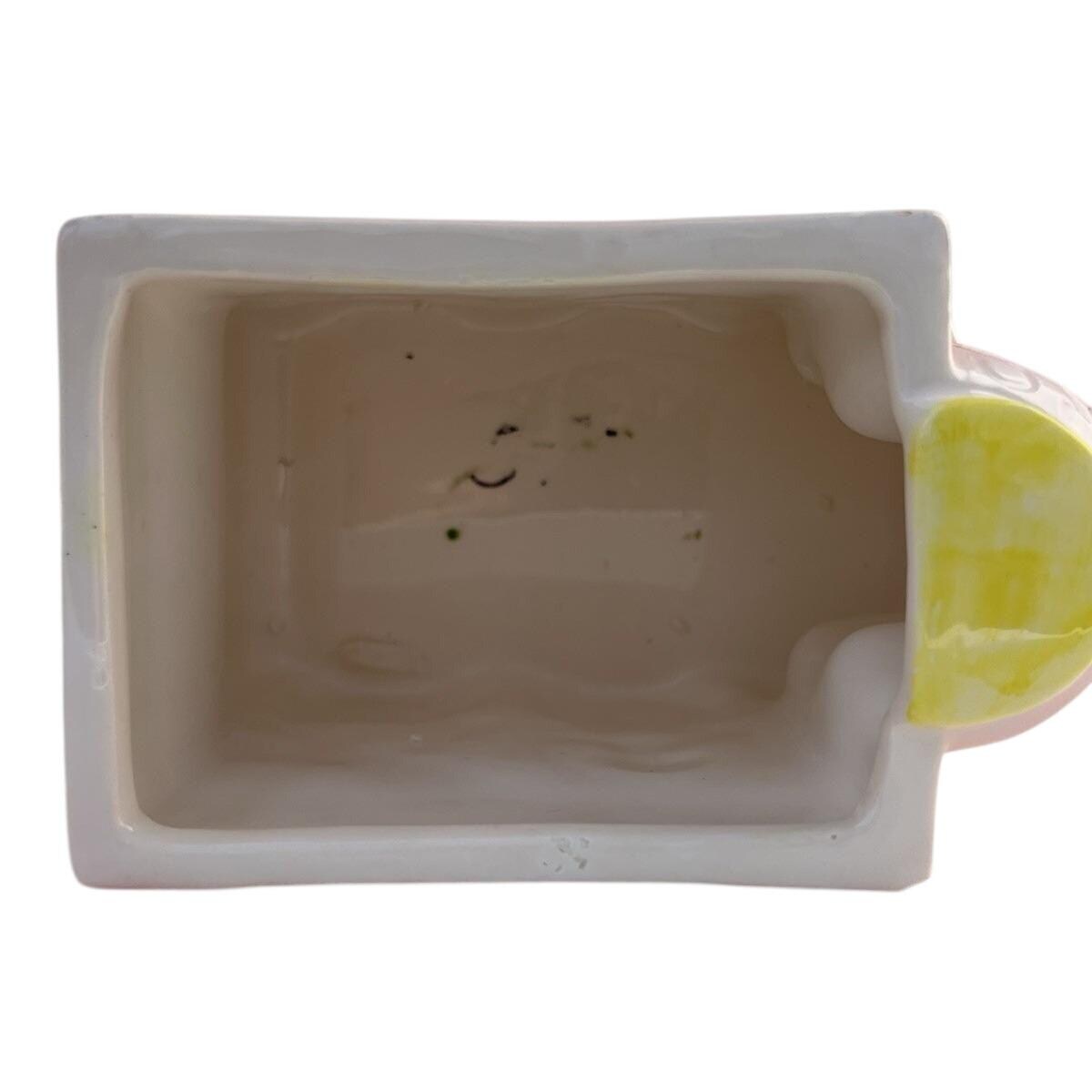 Sweet vintage ceramic planter in the shape of a baby buggy, featuring soft blue and pink tones with charming, raised details.