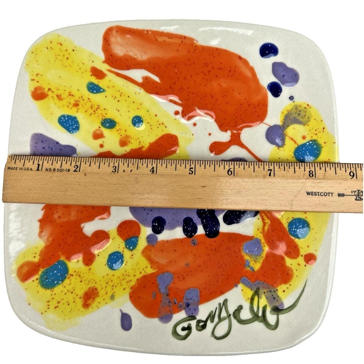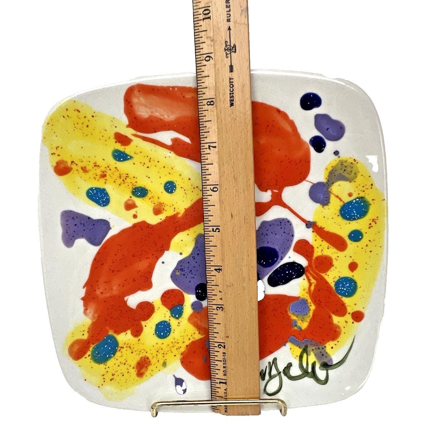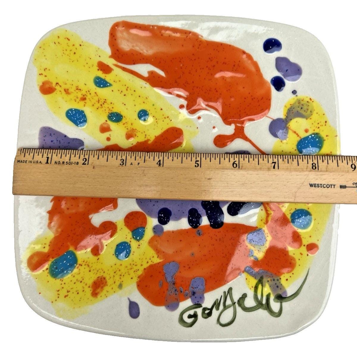 Colorful hand-painted decorative art pottery plate featuring bold abstract splatter design in orange, yellow, purple, and blue tones. Signed on the front (see photos).