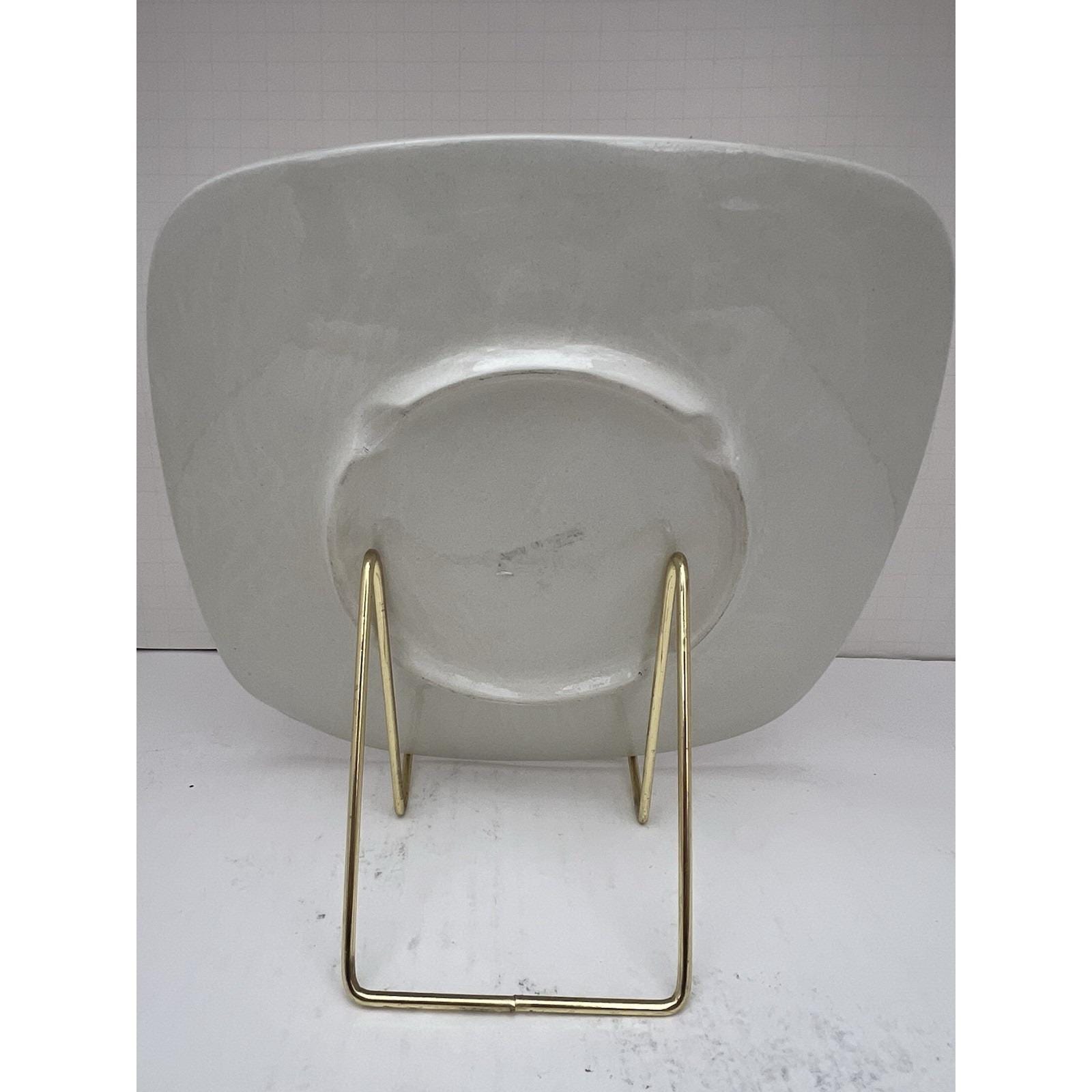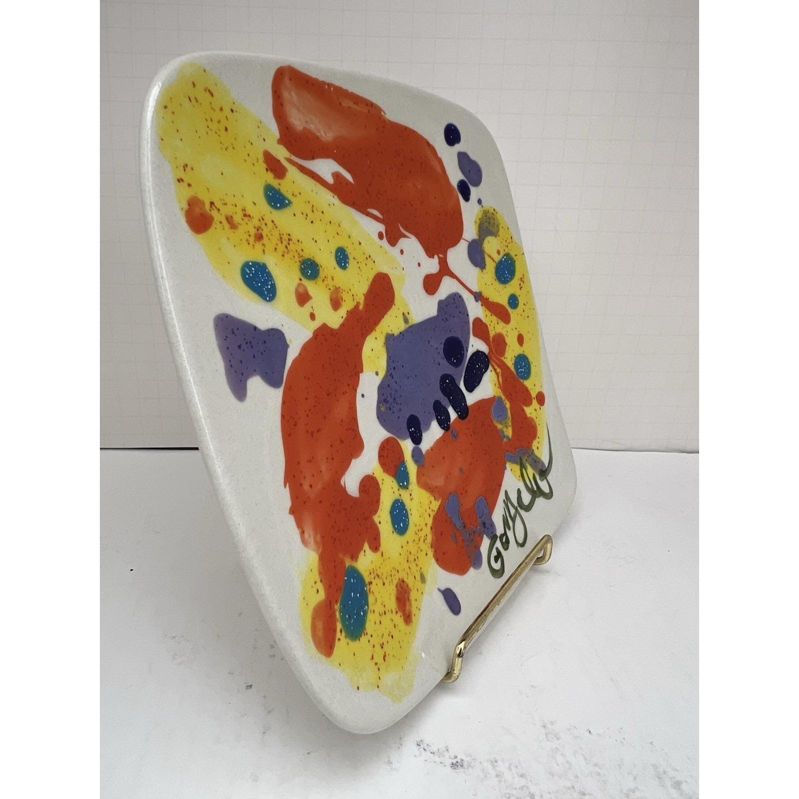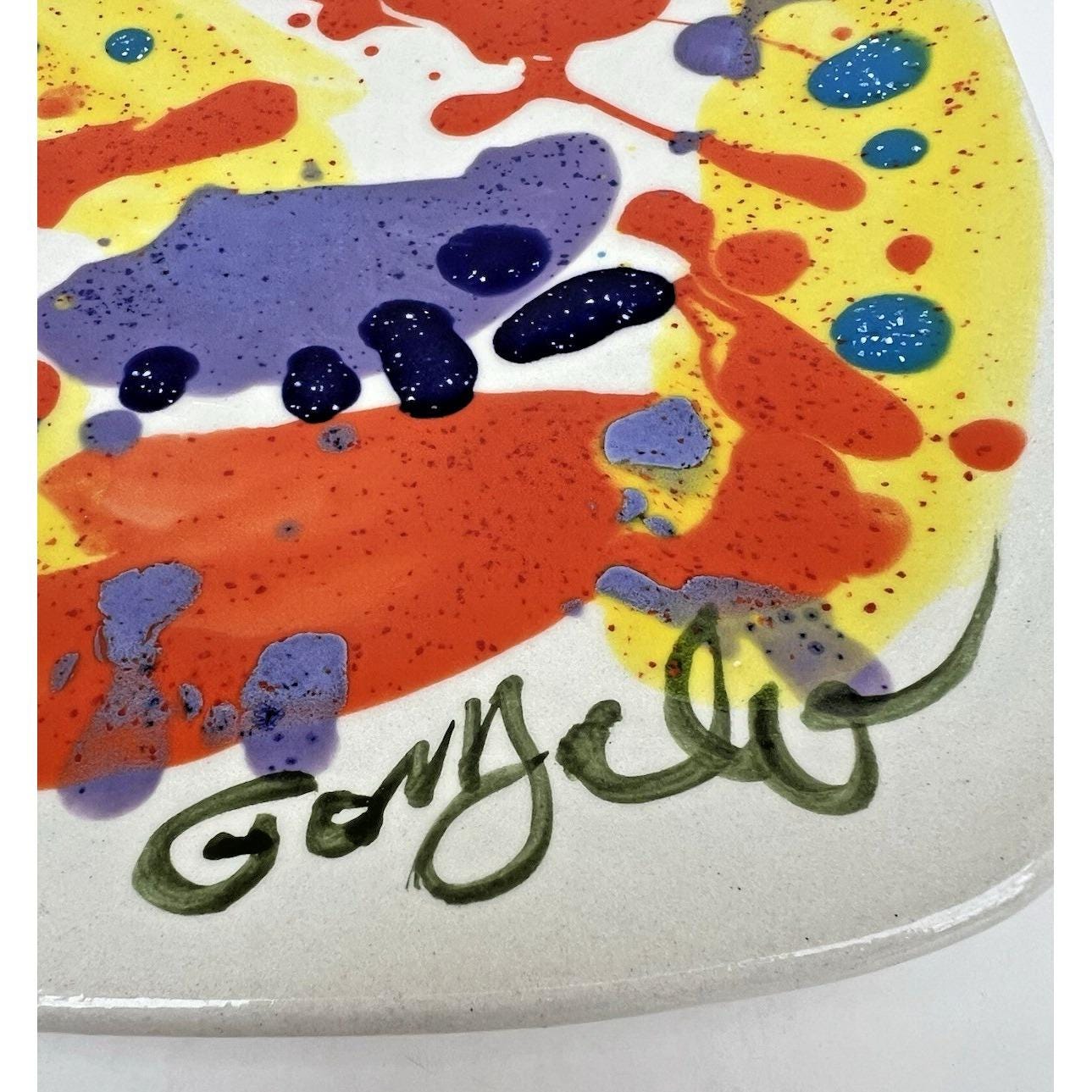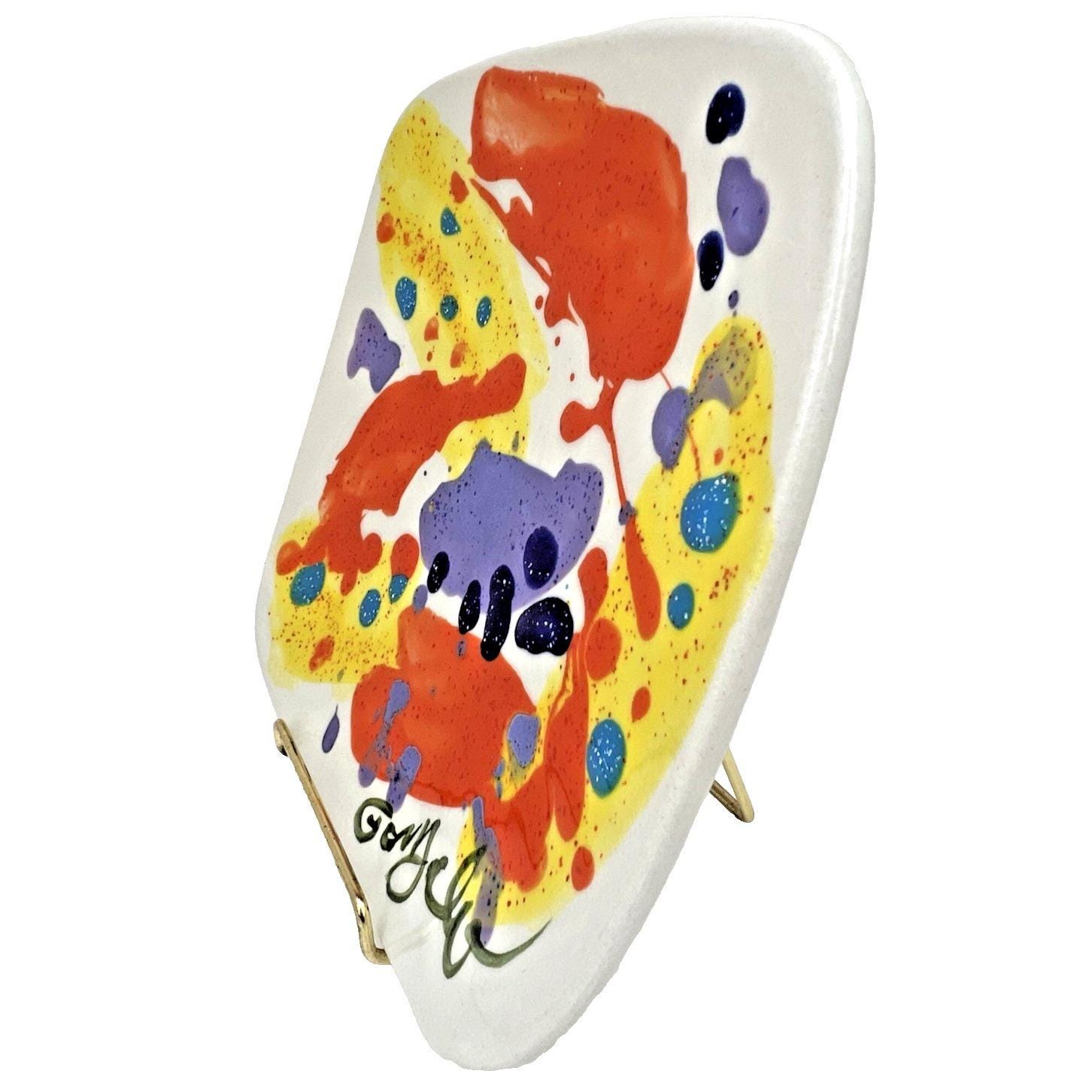 Colorful hand-painted decorative art pottery plate featuring bold abstract splatter design in orange, yellow, purple, and blue tones. Signed on the front (see photos).