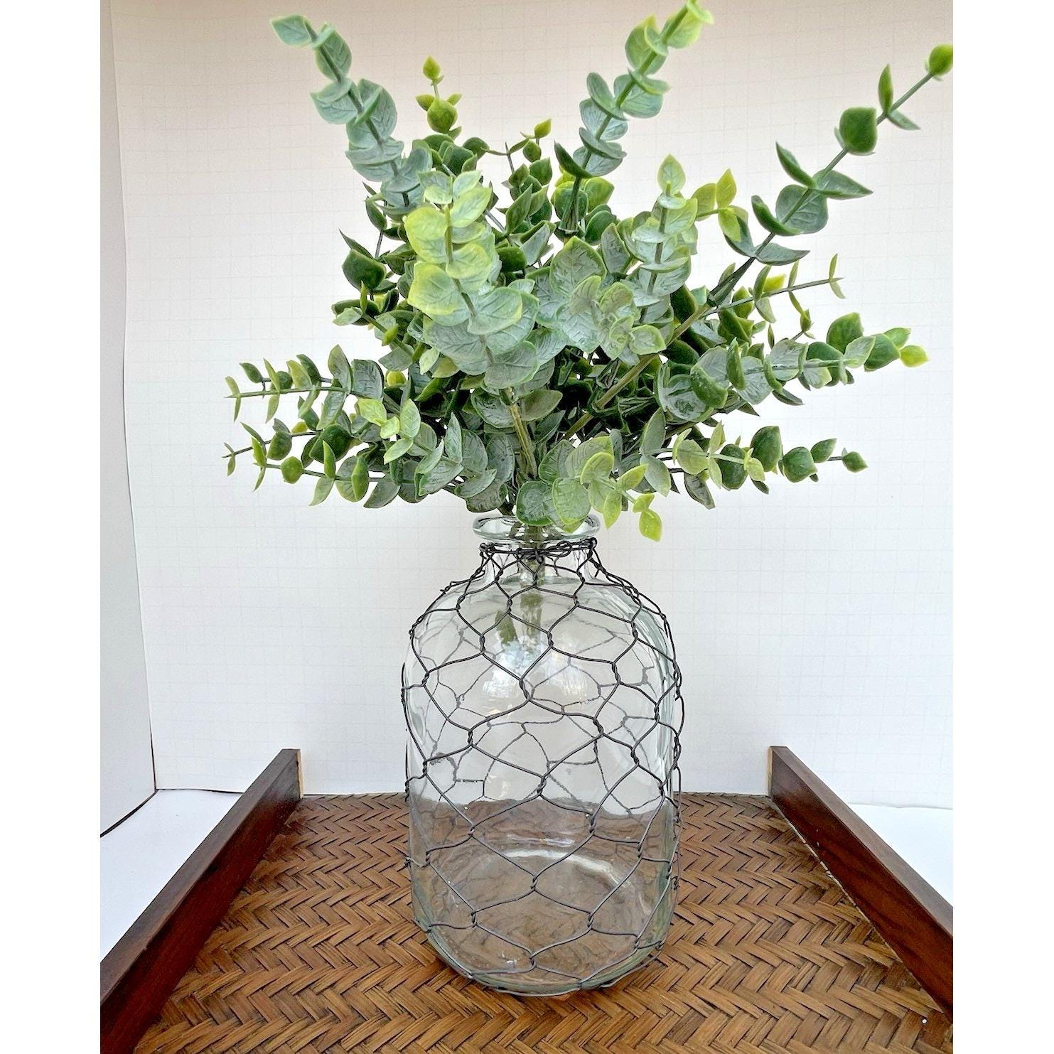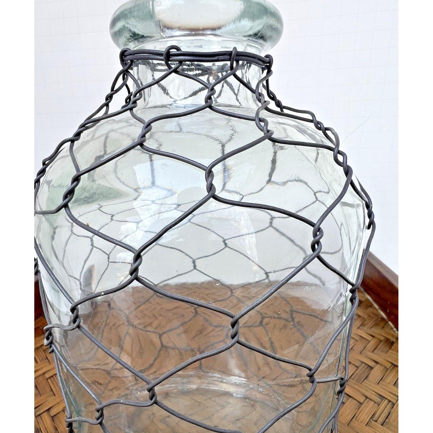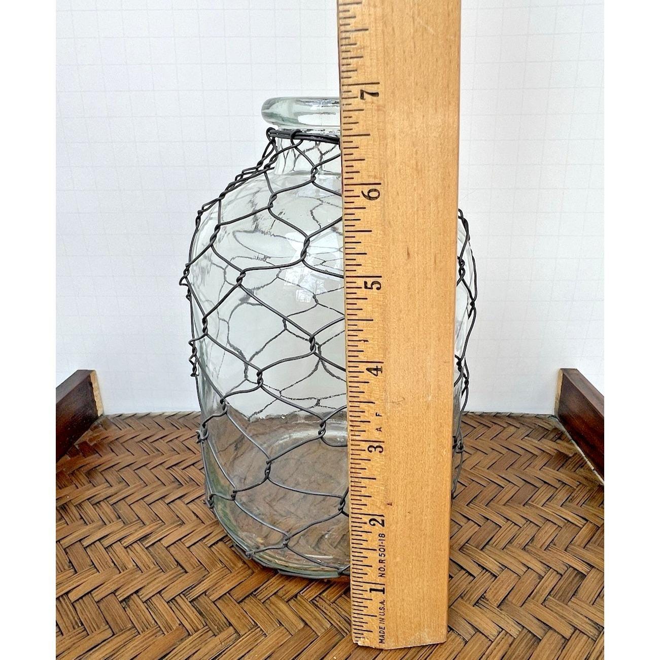Clear glass jug wrapped in chicken wire, giving it that farmhouse/apothecary feel without trying too hard. Looks great styled with greenery (like shown), dried florals, or even on its own as a statement piece.