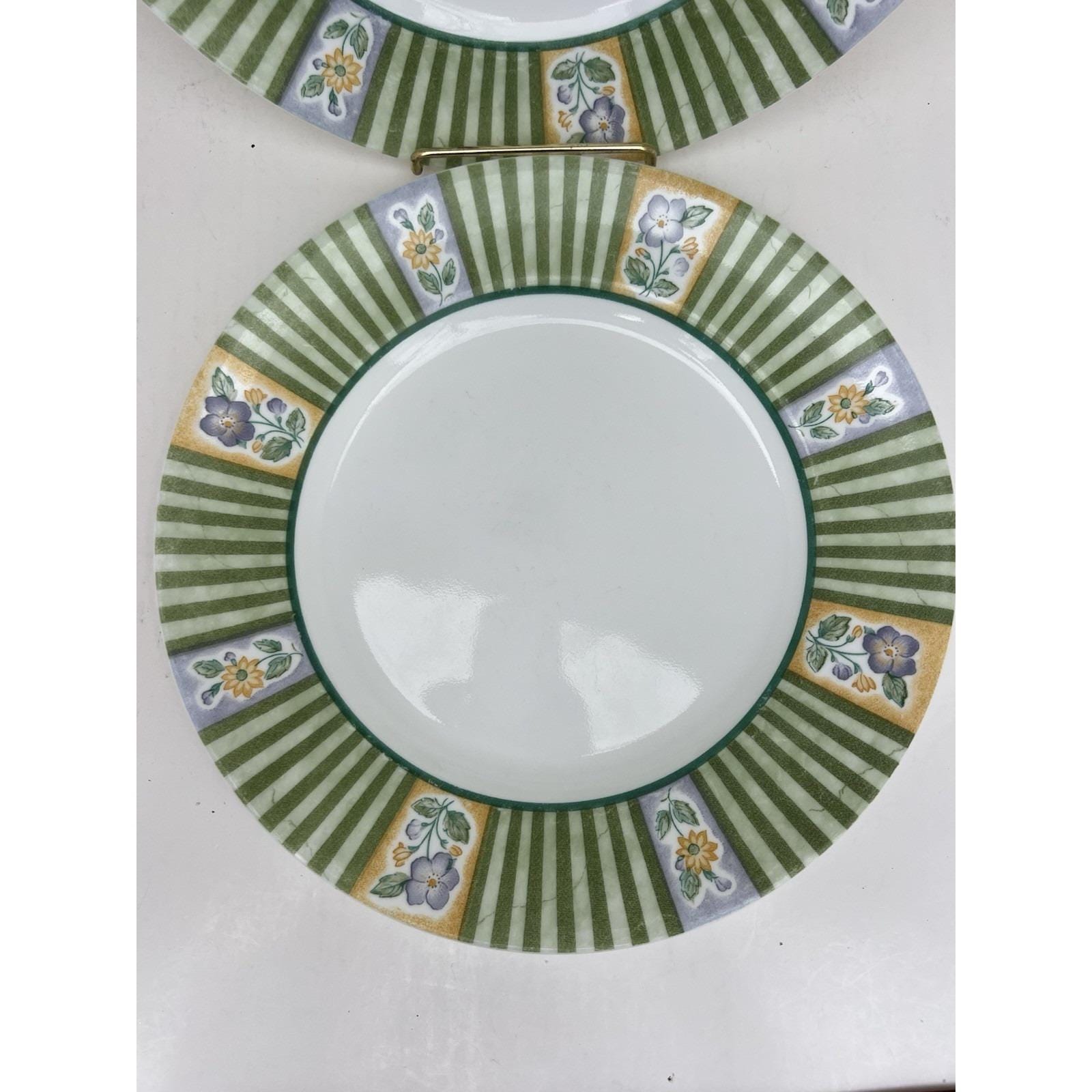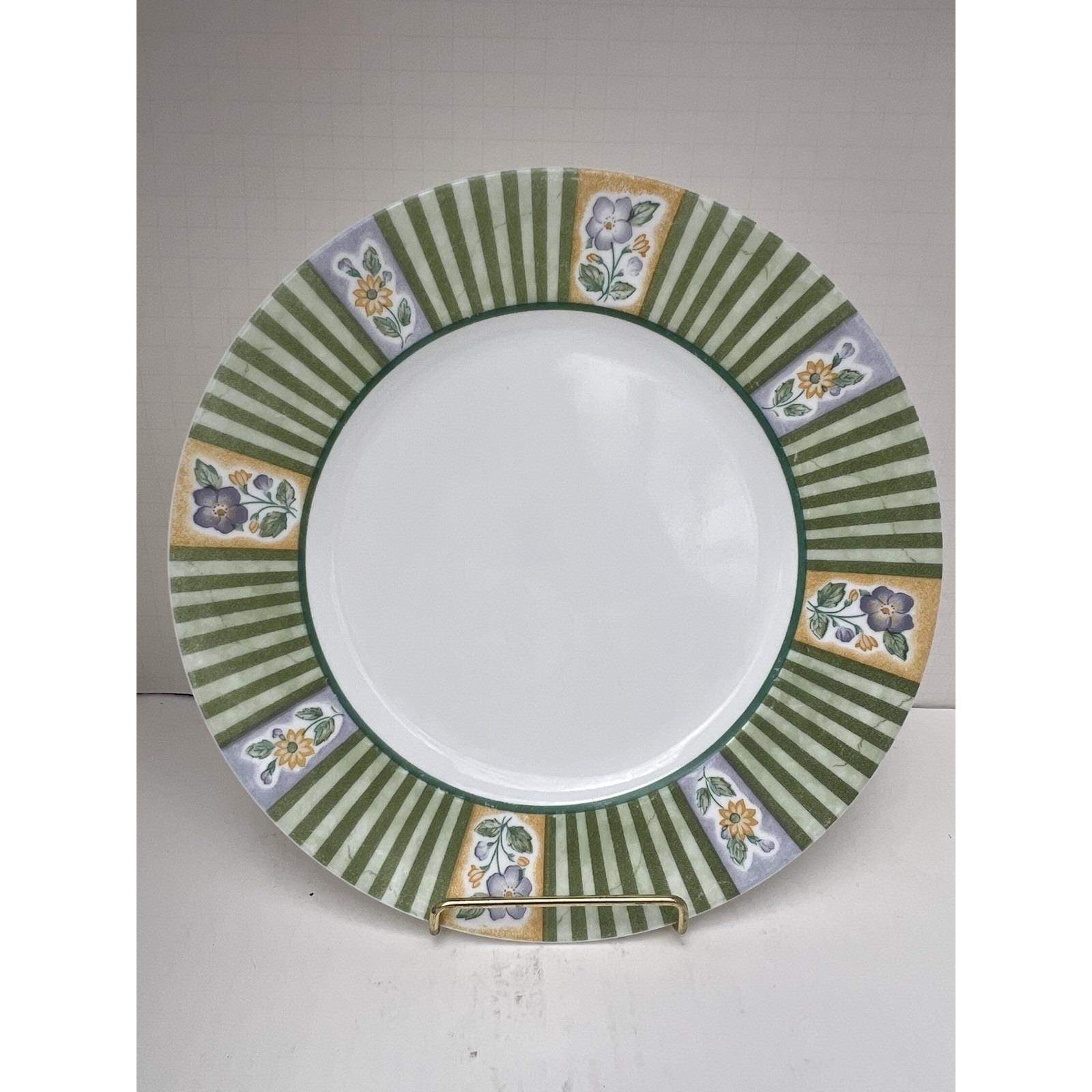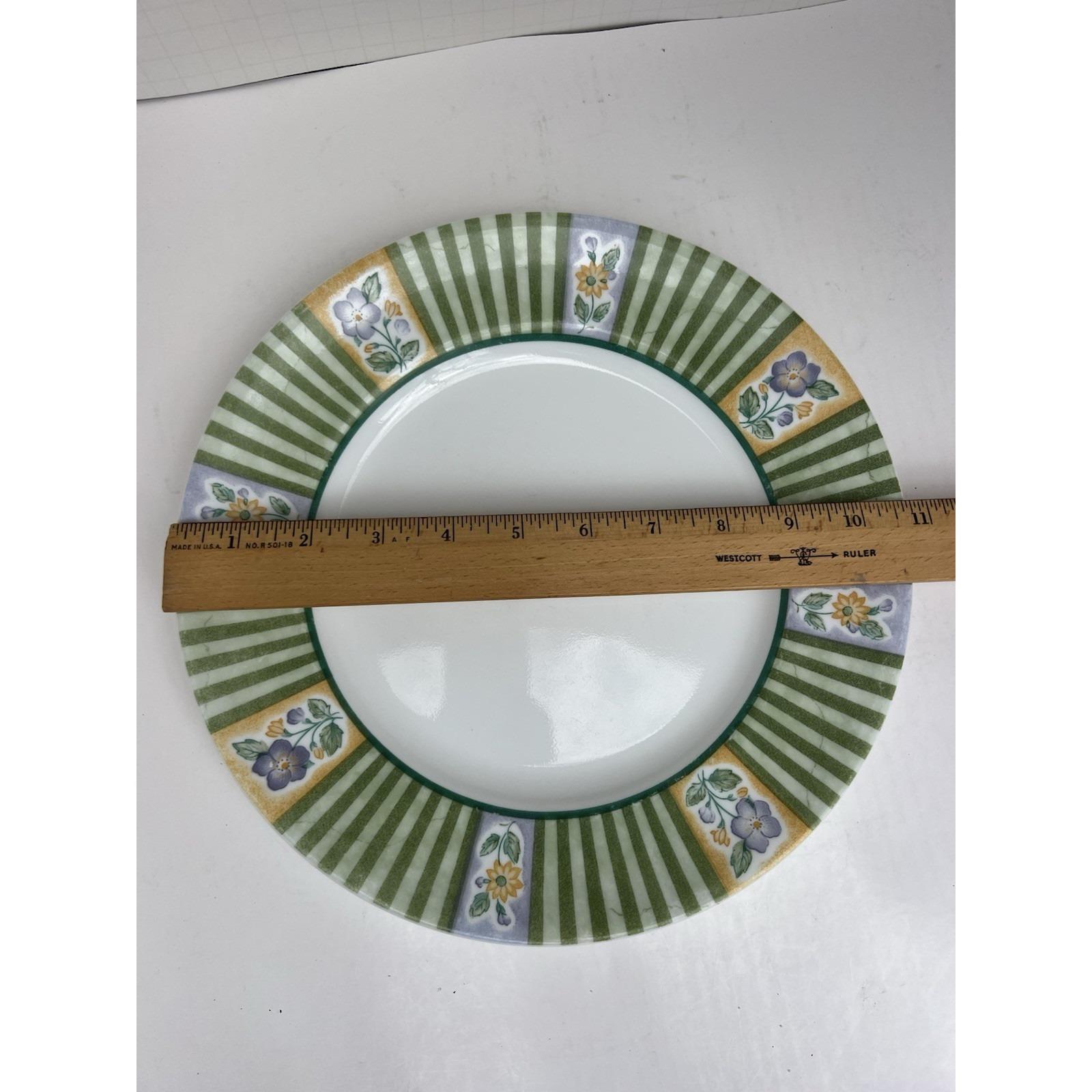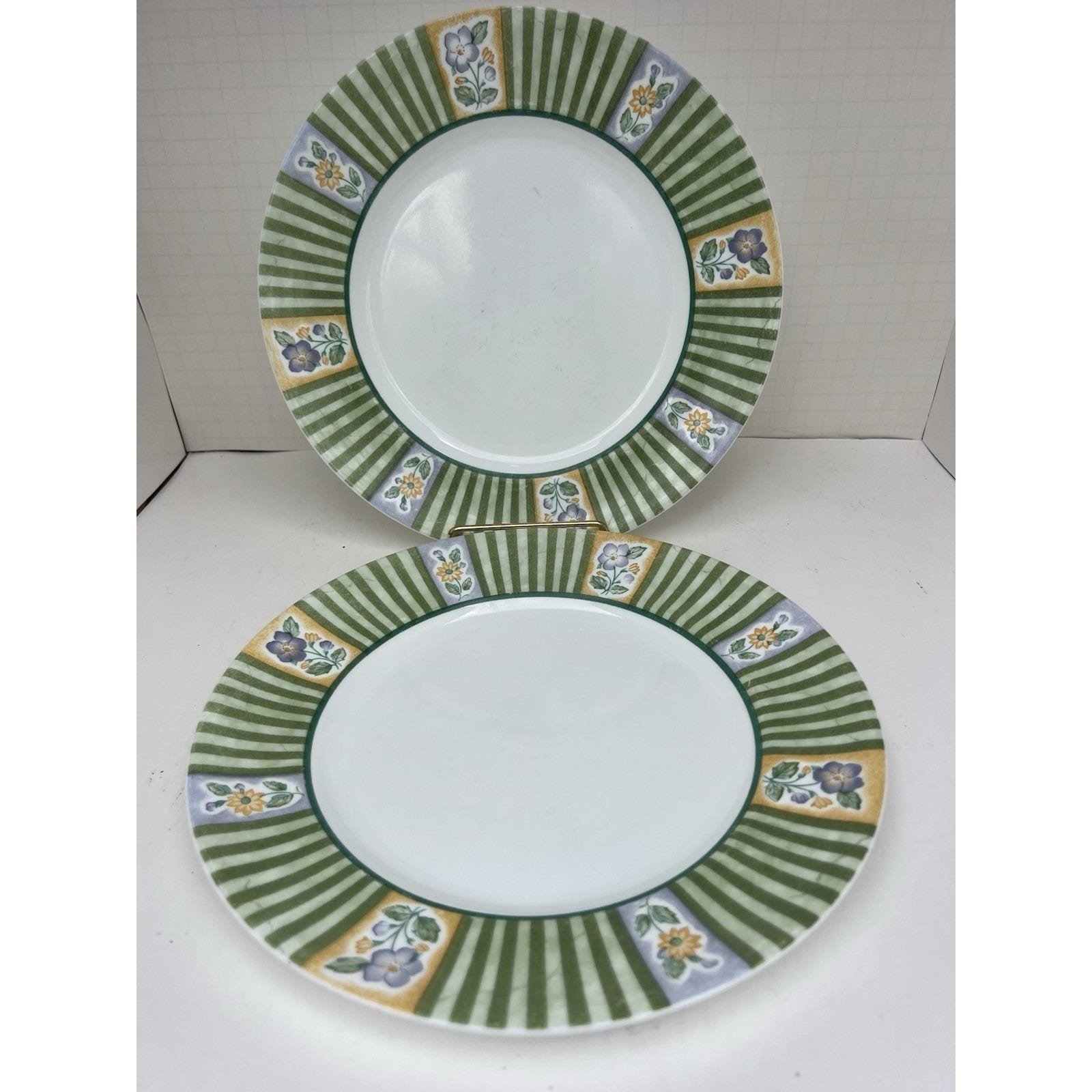 Set of two vintage Corelle dinner plates in the Classical Garden pattern featuring green striped border with floral accents.