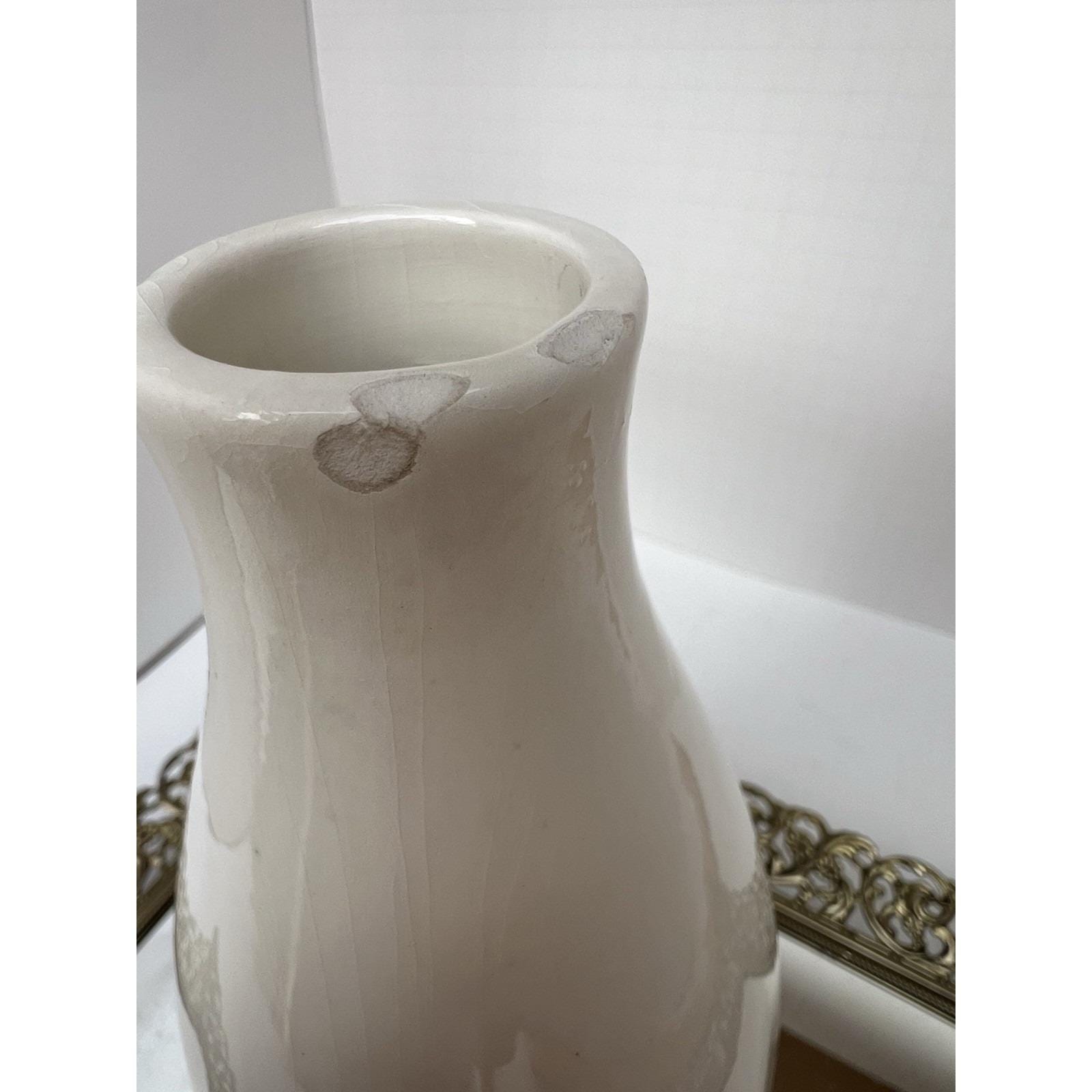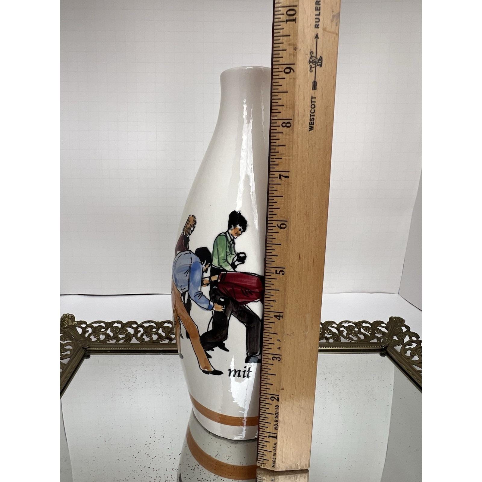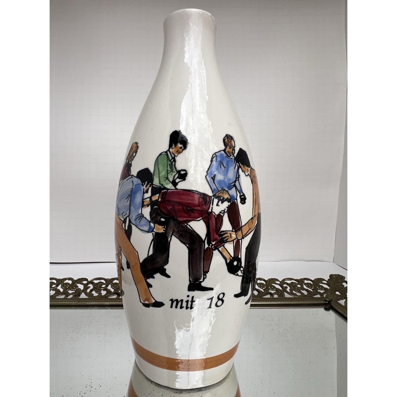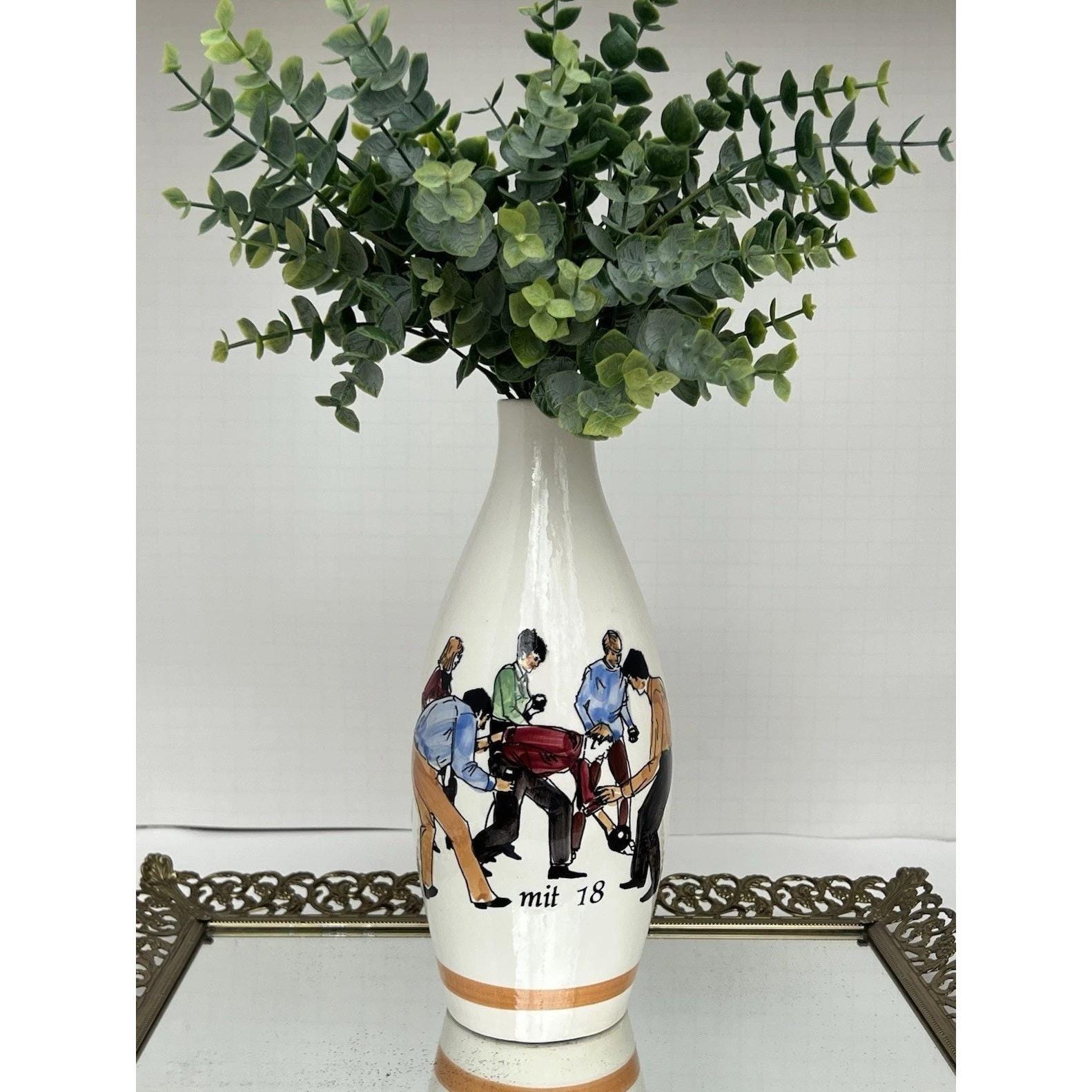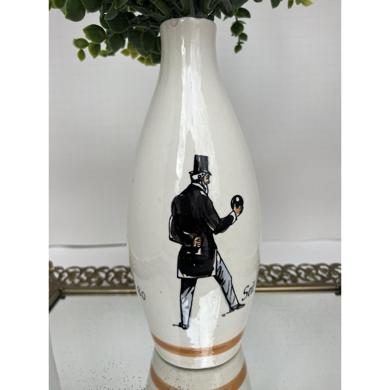 Vintage German ceramic carafe (missing stopper) repurposed as a decorative vase, featuring a detailed hand-painted bowling scene.