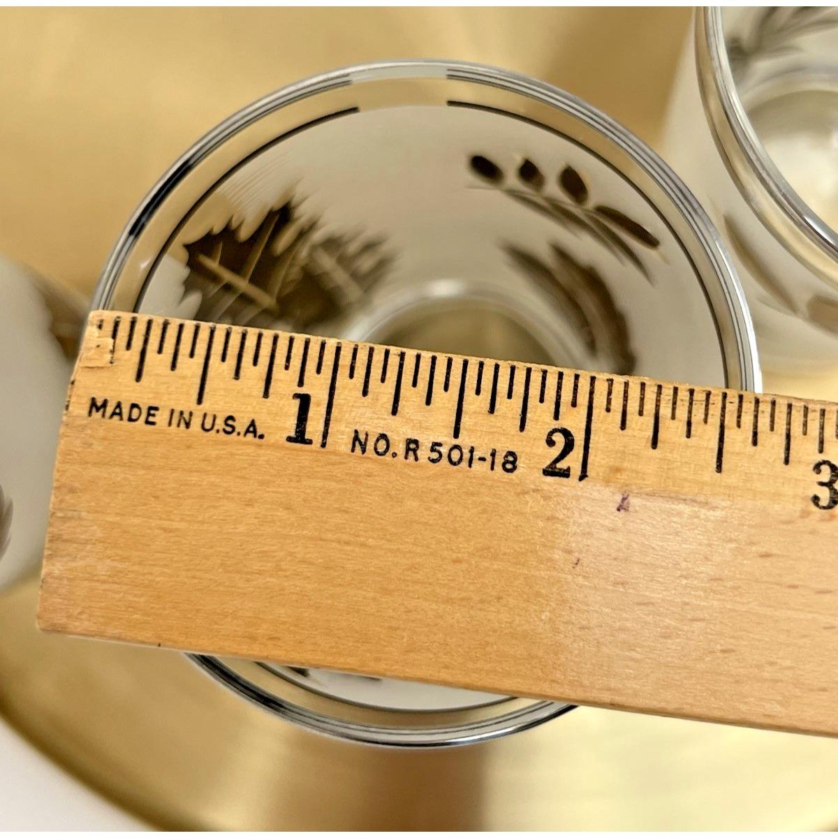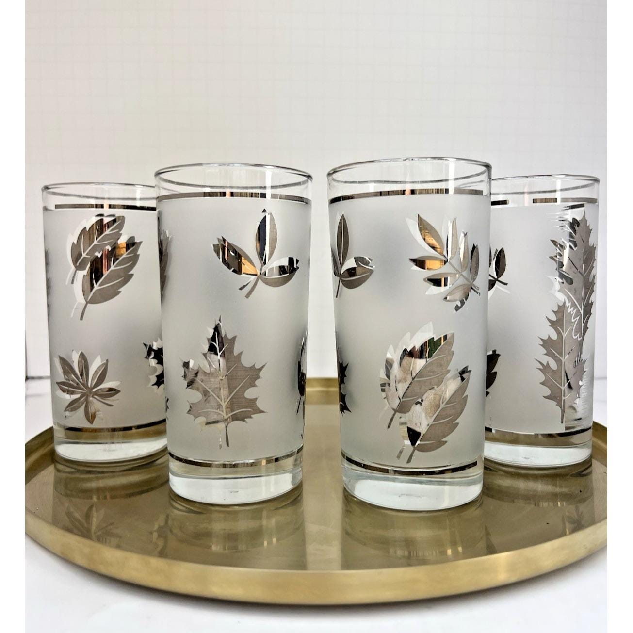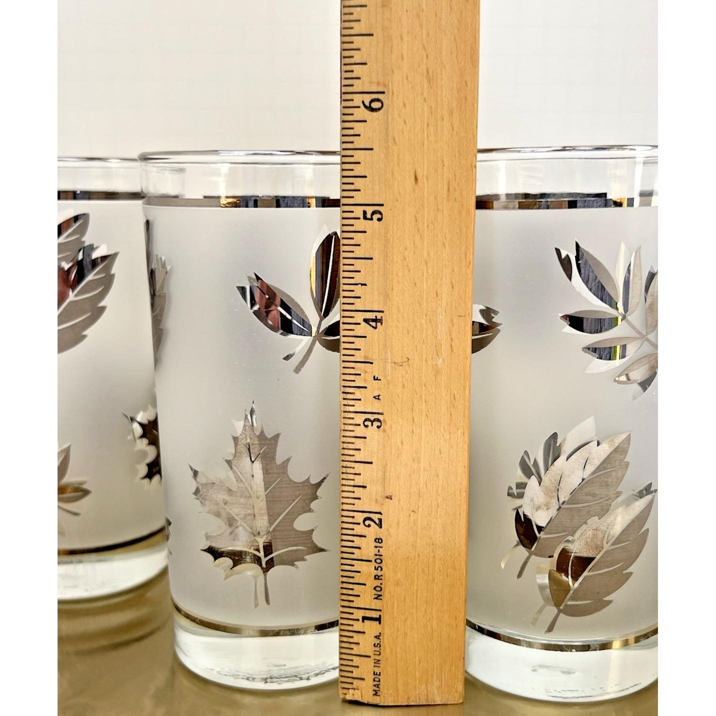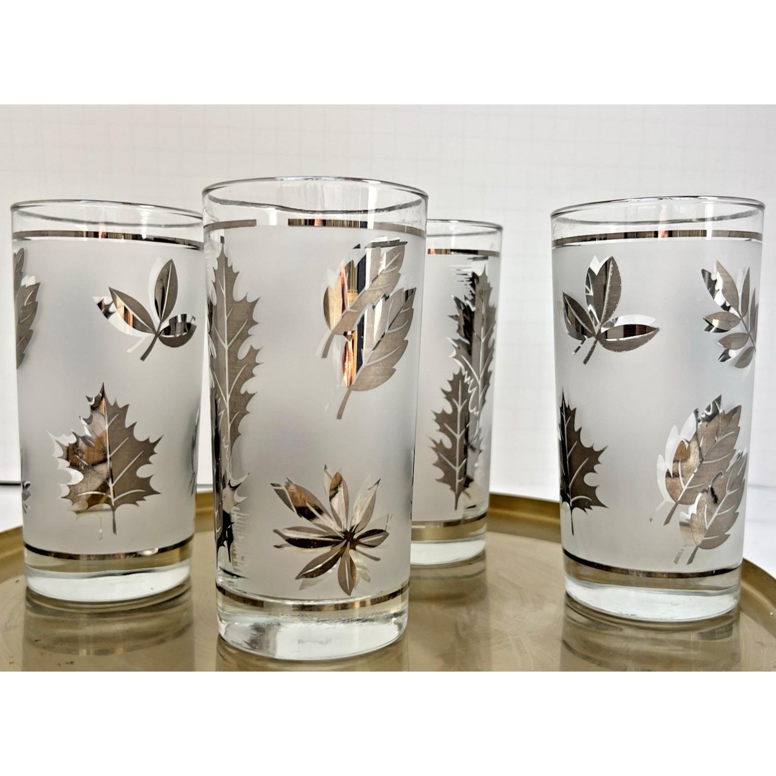 Set of 4 vintage Libby frosted tumblers featuring a beautiful silver leaf pattern. Classic mid-century style with a soft frosted finish and metallic leaf detailing that really catches the light.