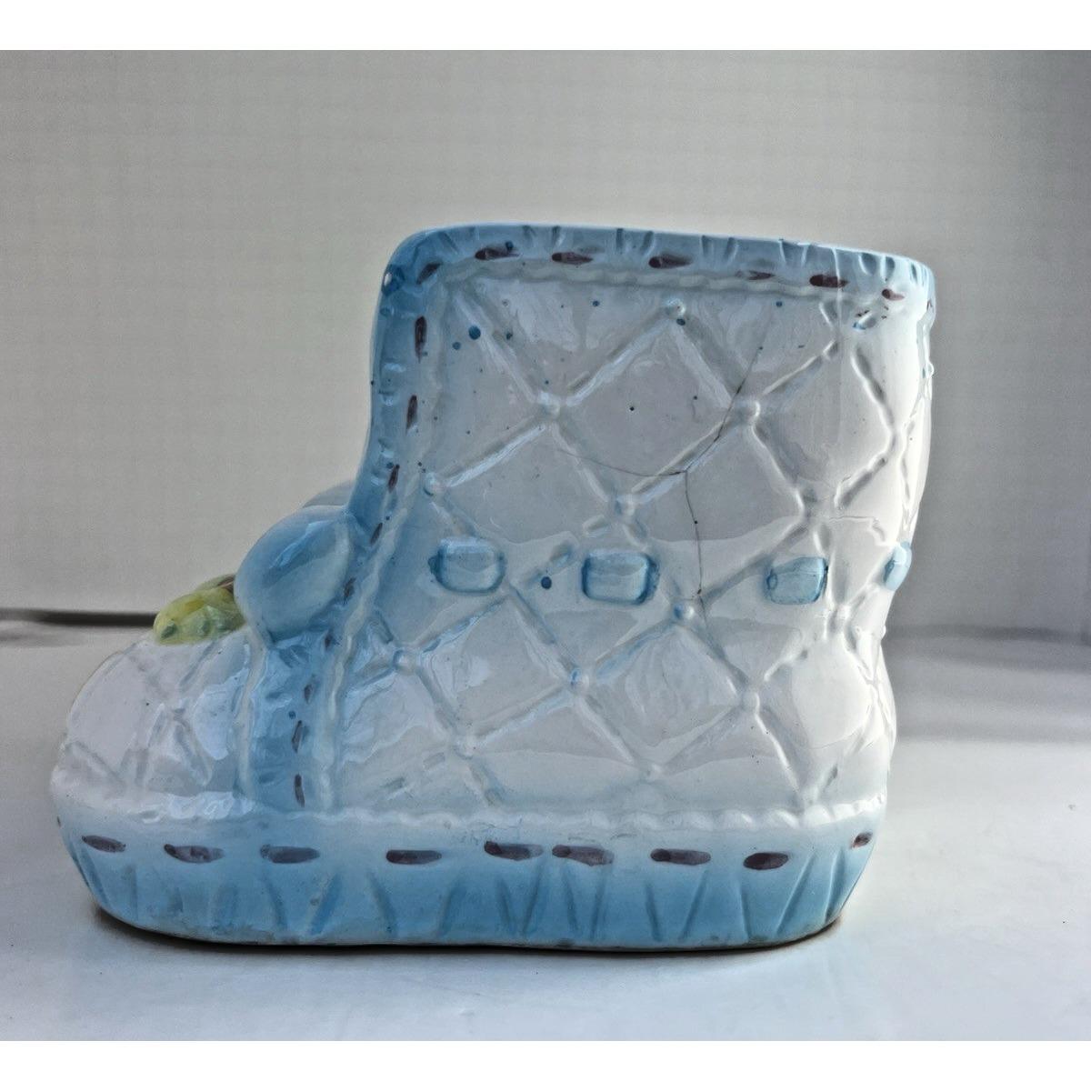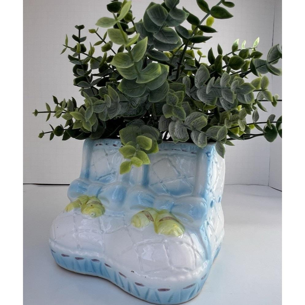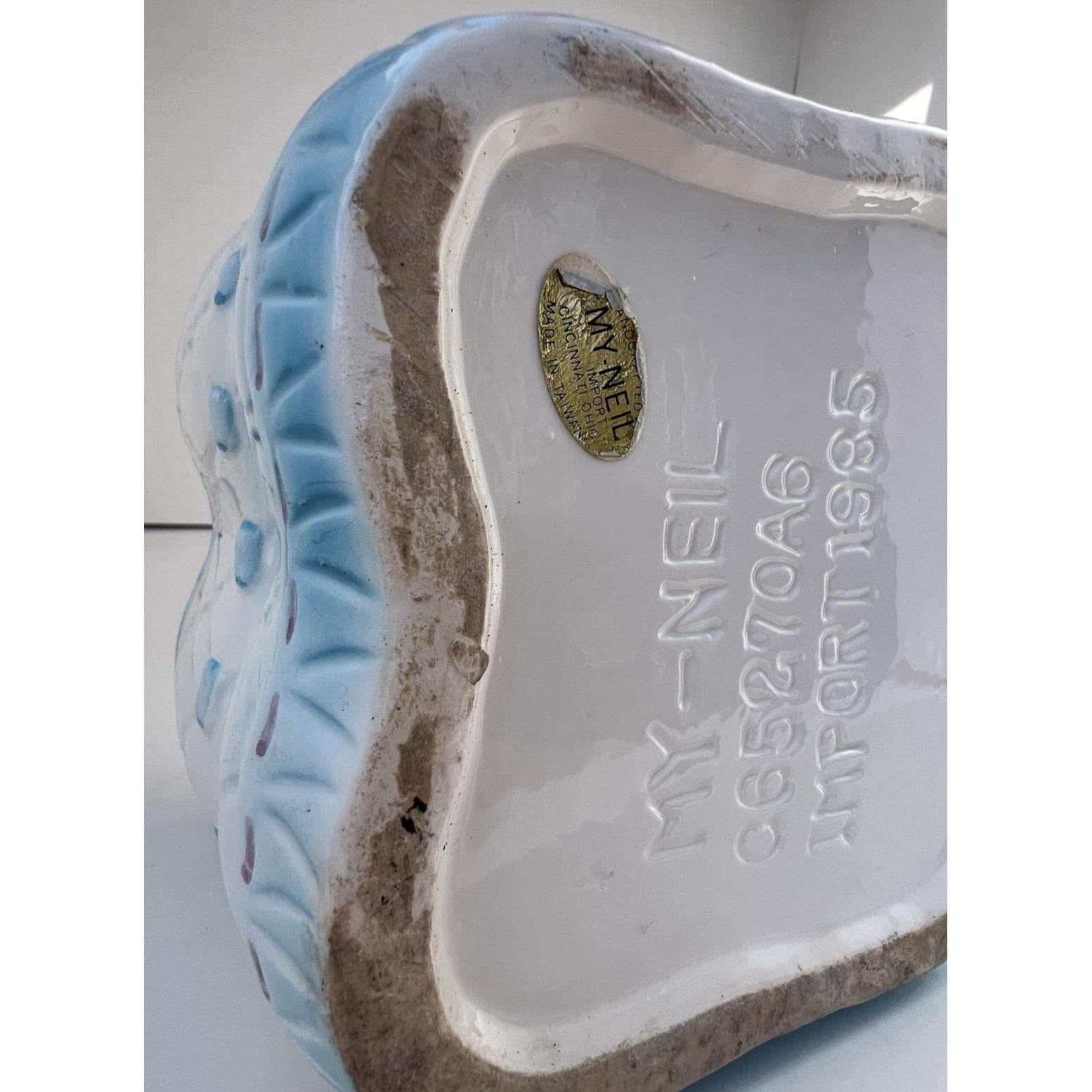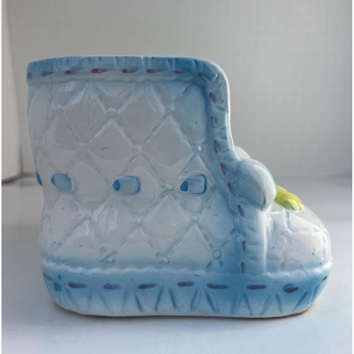Charming vintage 1985 MY-NEIL ceramic boot planter in soft blue tones with raised detailing and a classic nursery feel.