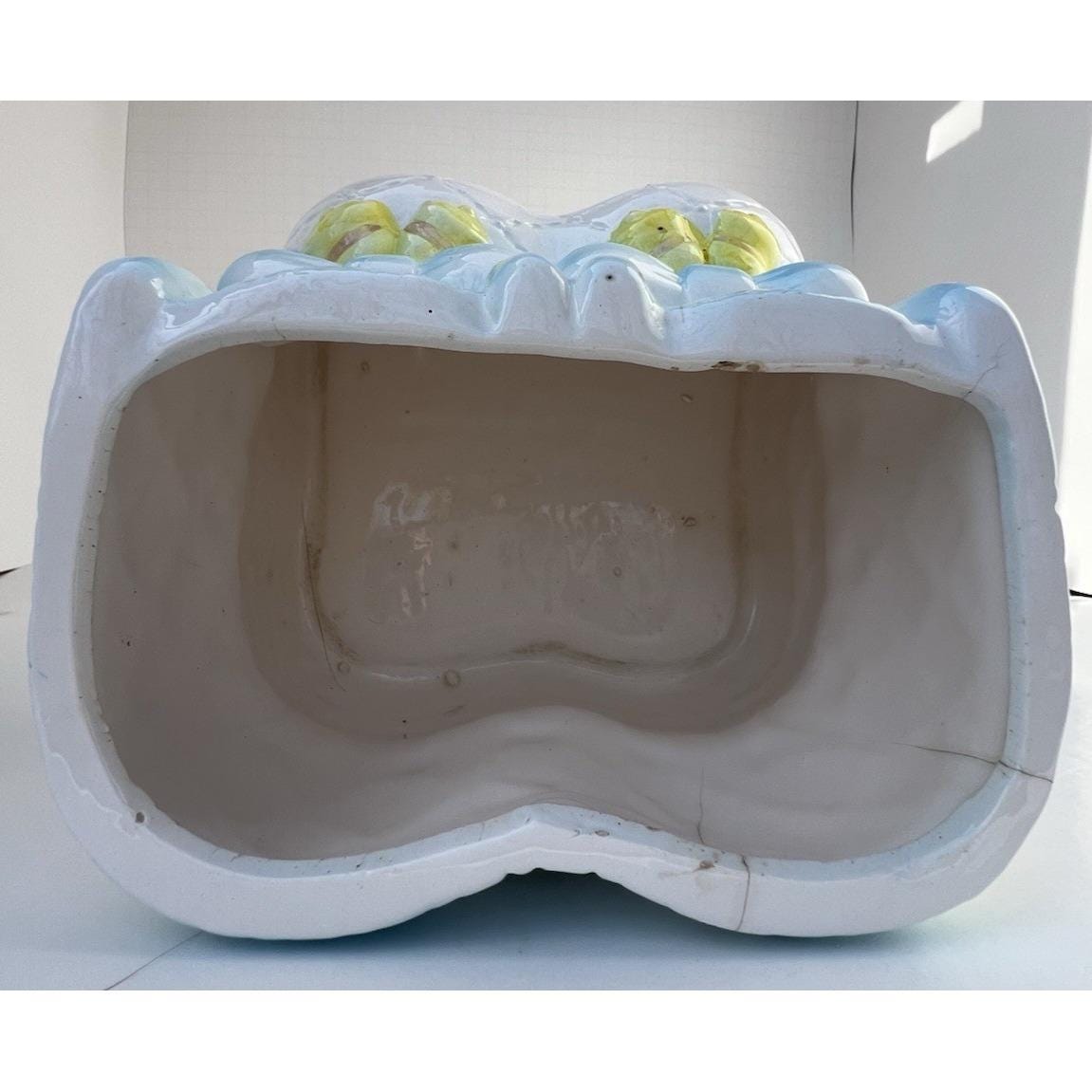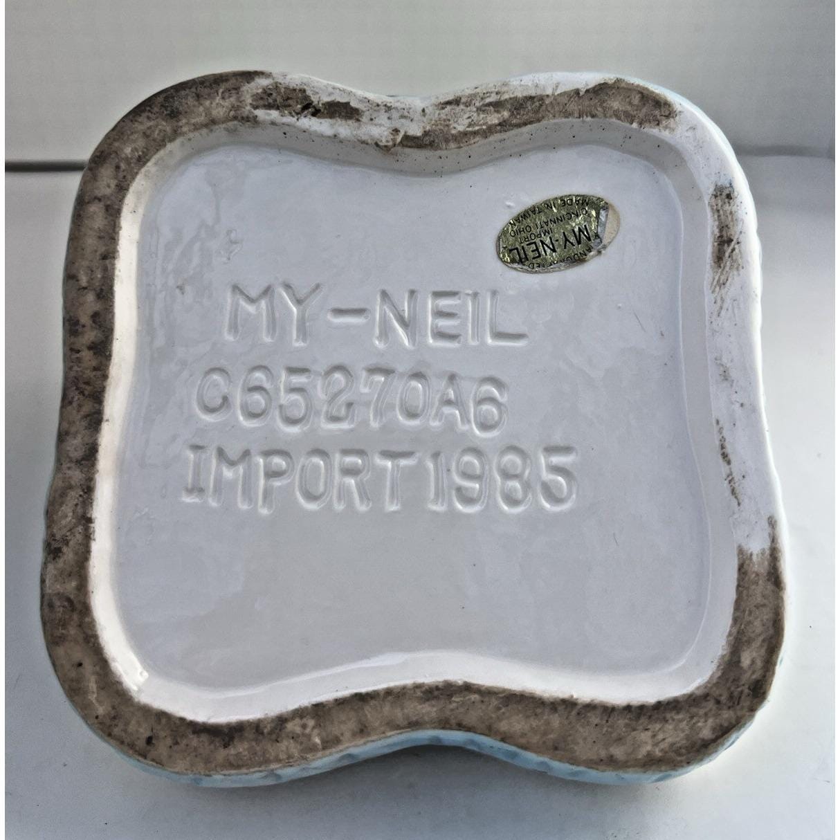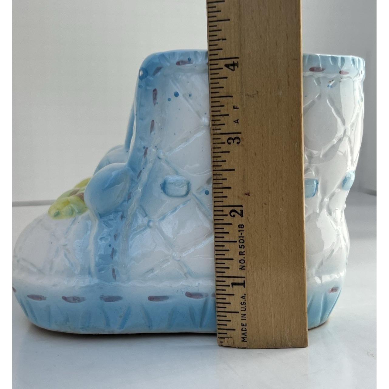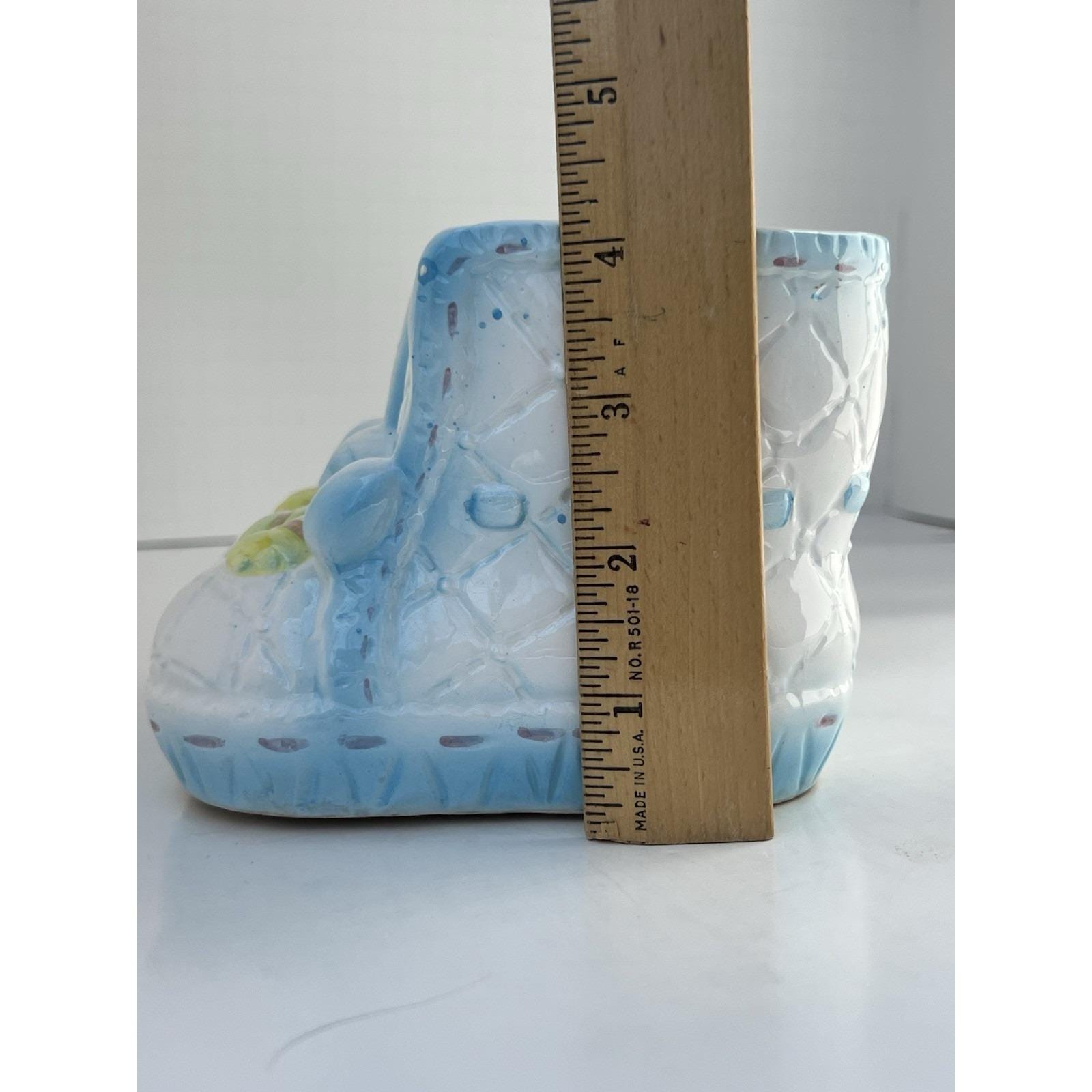 Charming vintage 1985 MY-NEIL ceramic boot planter in soft blue tones with raised detailing and a classic nursery feel.