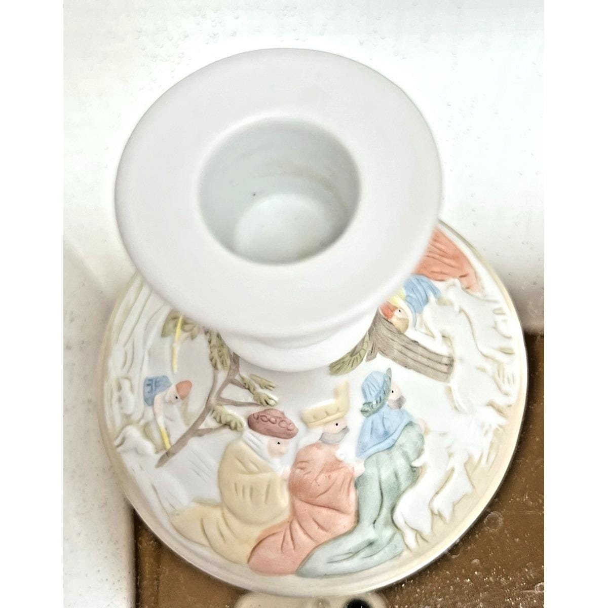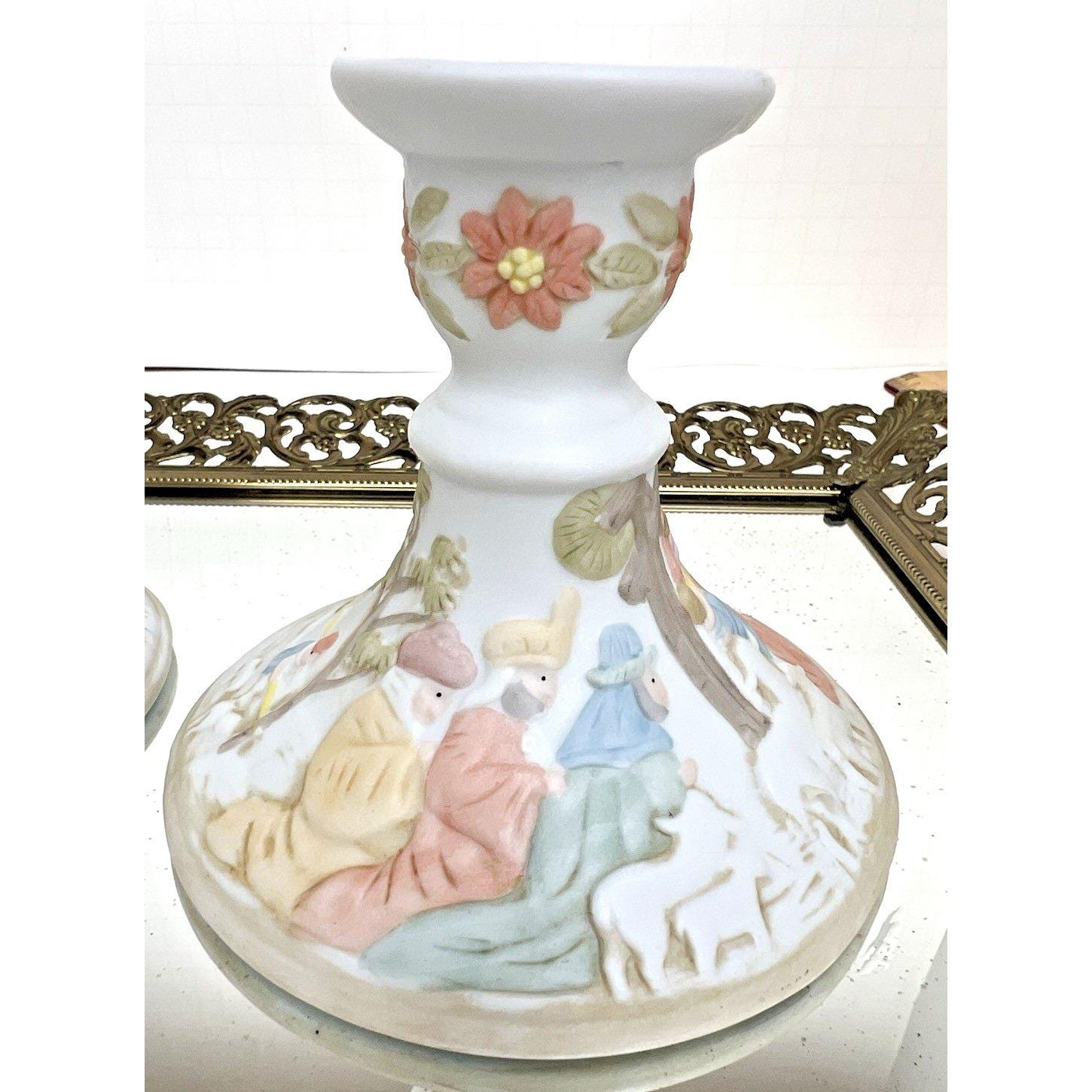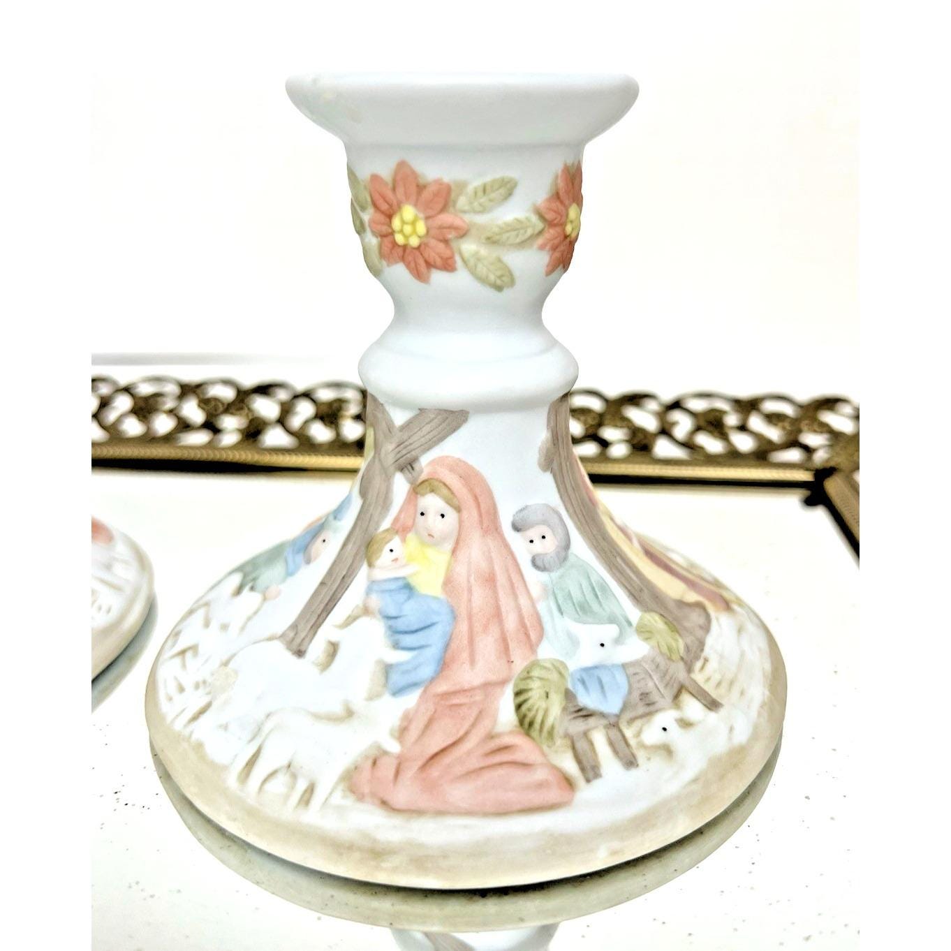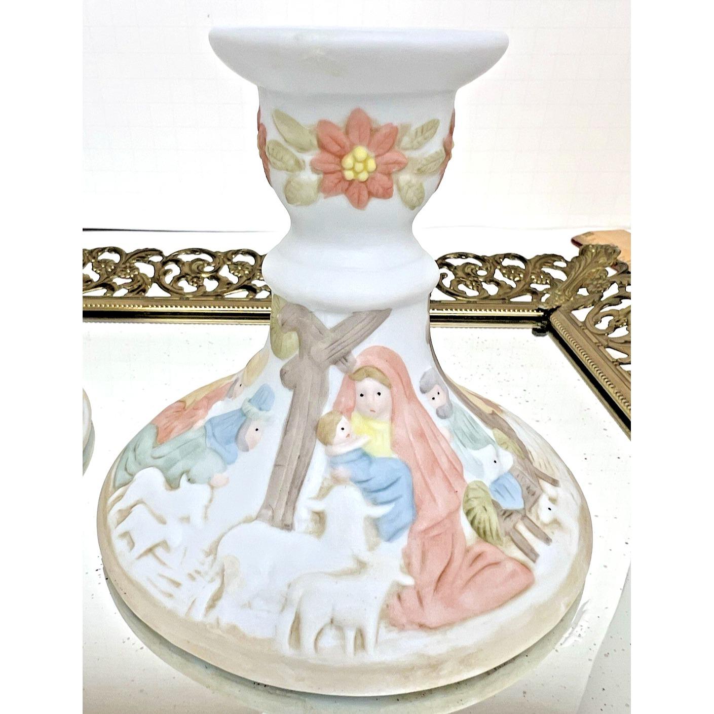 Beautiful vintage pair of Lefton Christopher Collection nativity candlestick holders from 1982.