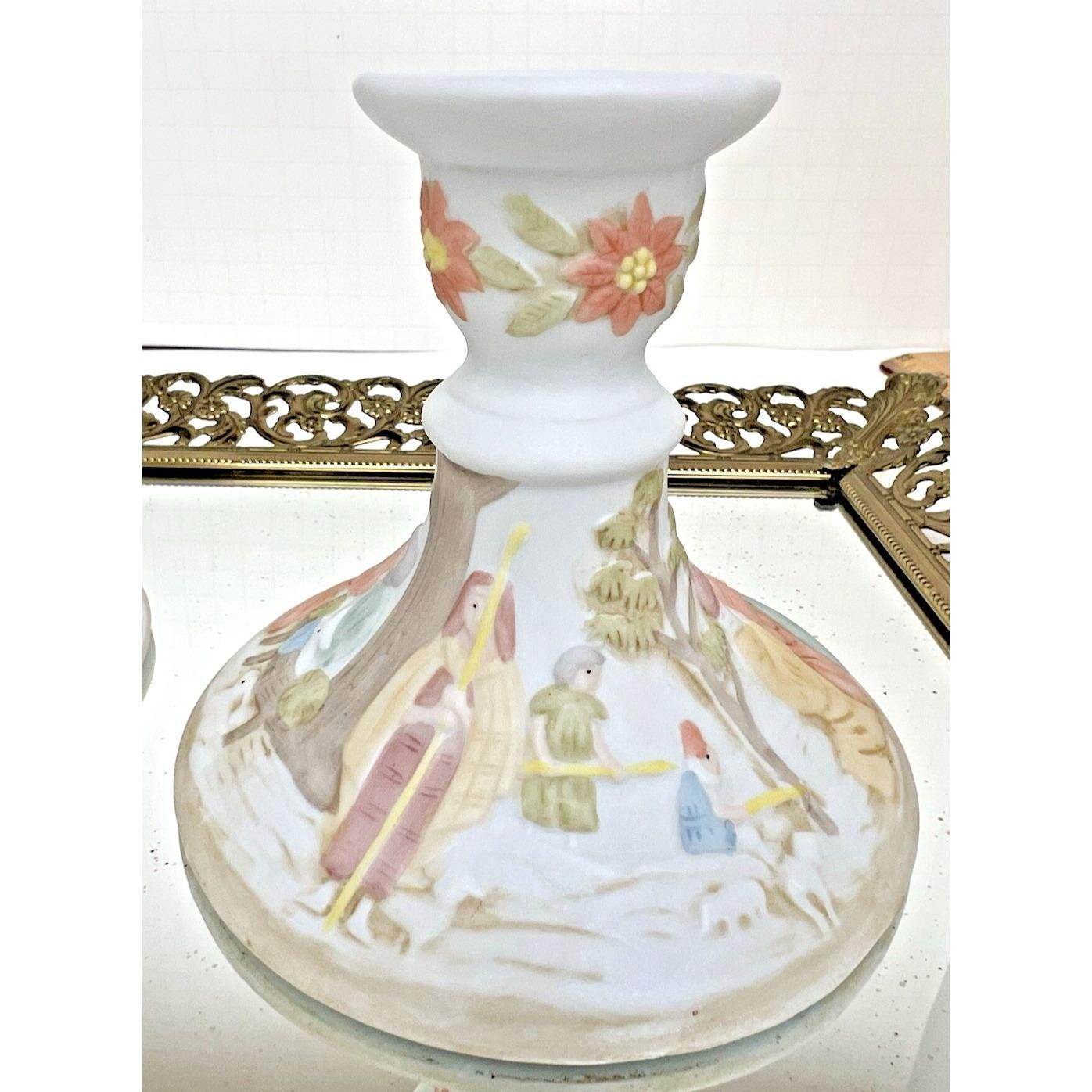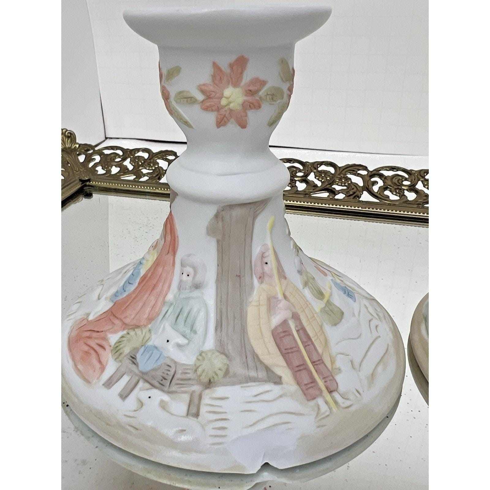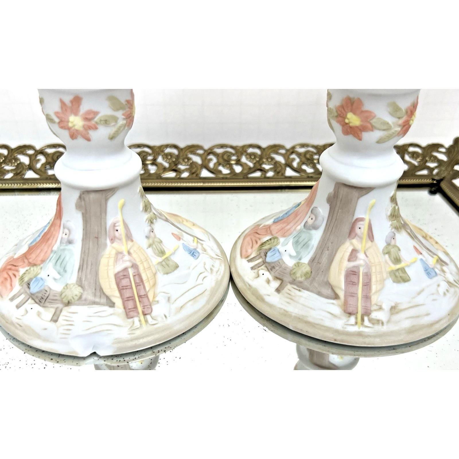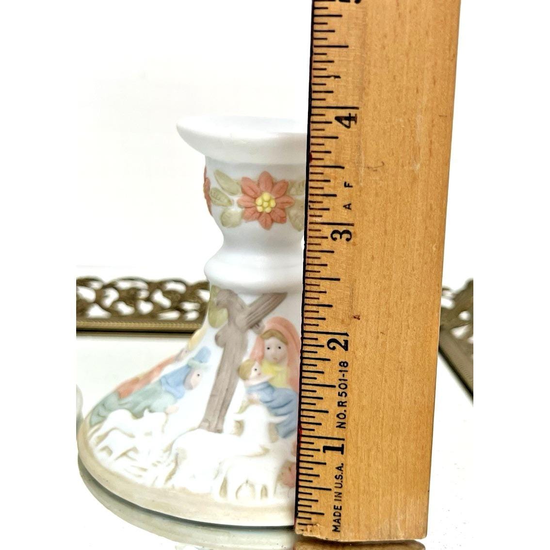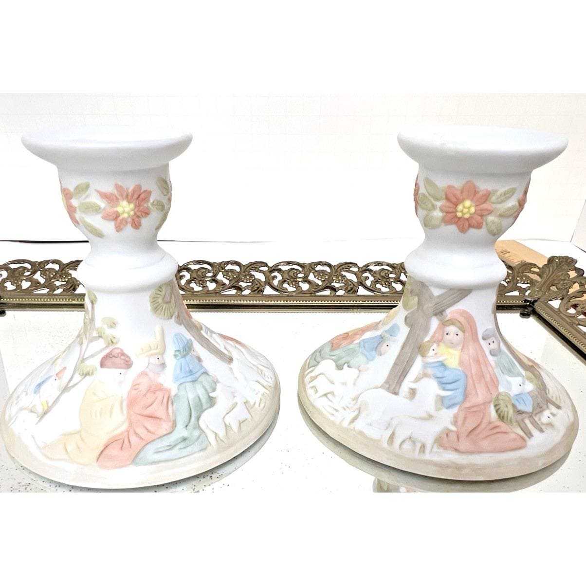 Beautiful vintage pair of Lefton Christopher Collection nativity candlestick holders from 1982.