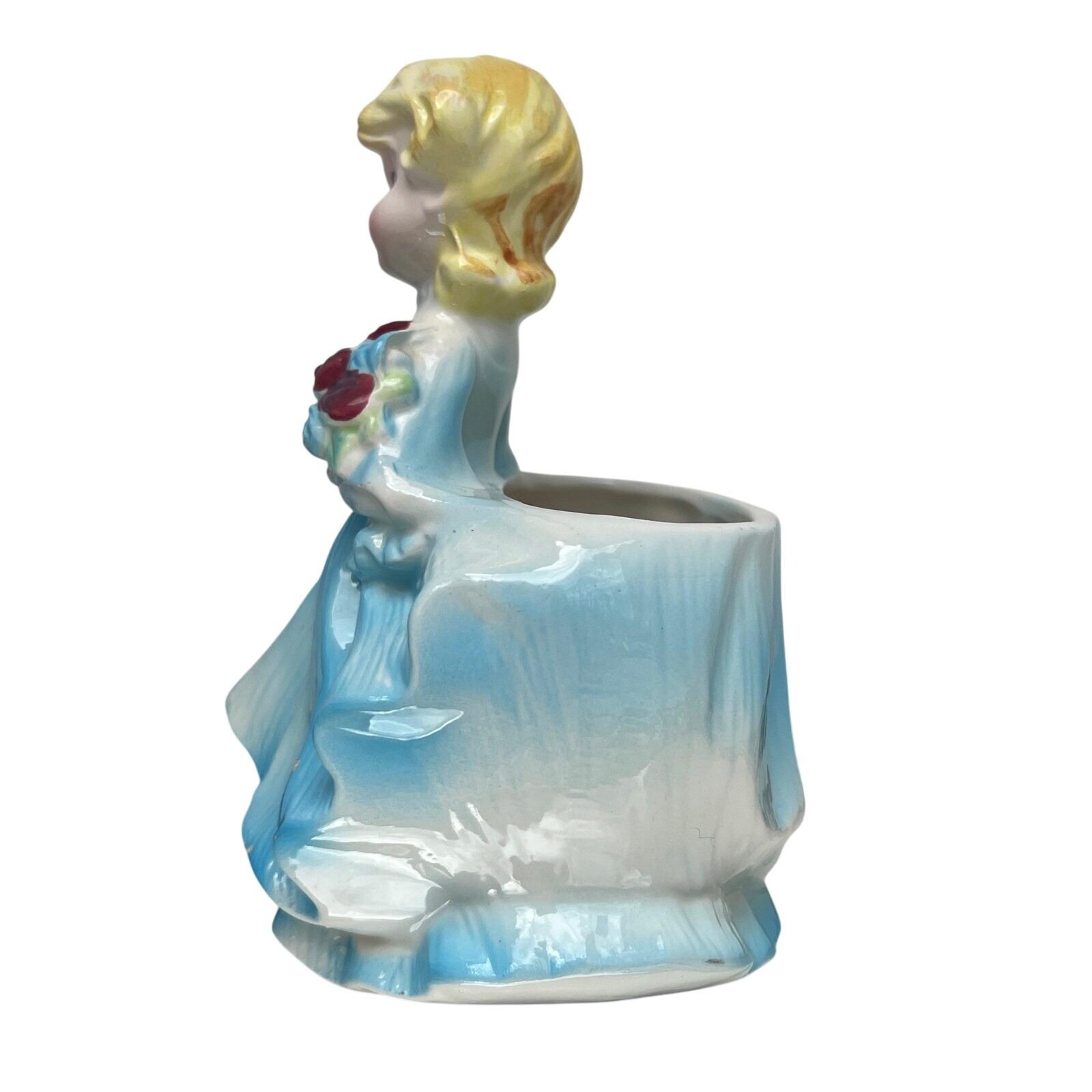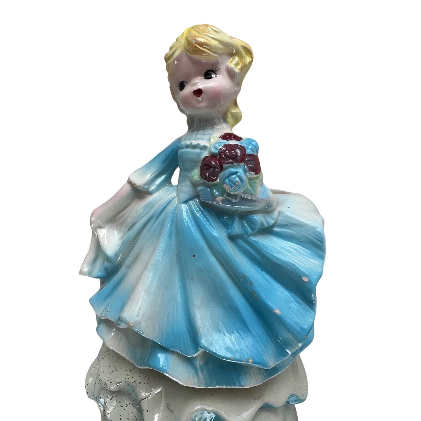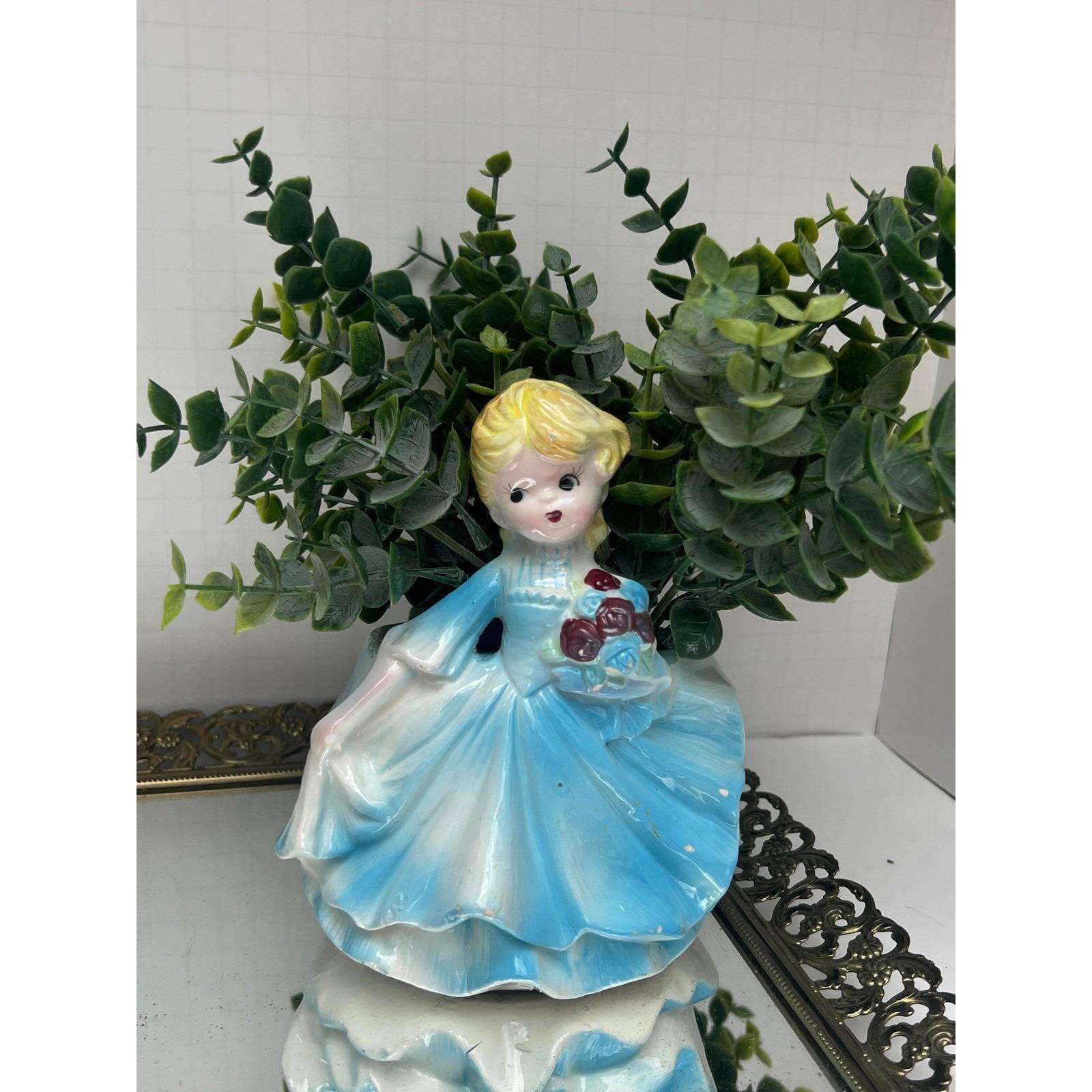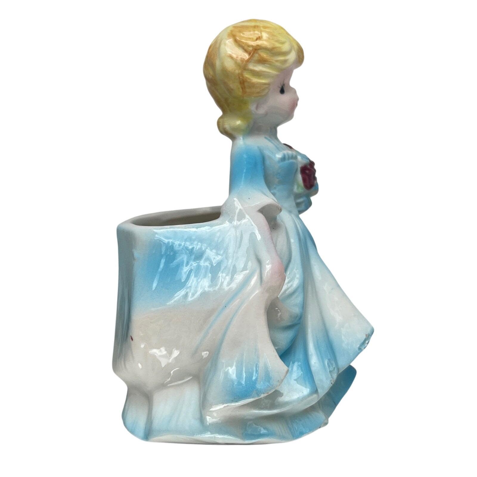 Bring a touch of mid-century charm to your home with this lovely ceramic lady planter. This sweet figurine features a blonde girl in a flowing blue gown, holding a bouquet of deep red roses. The glossy glaze and delicate hand-painted details capture a nostalgic, whimsical feel that is perfect for a vanity, windowsill, or as part of a vintage collection. Whether used to hold a small succulent or simply displayed as a decorative accent, she adds a gentle, curated aesthetic to any space.