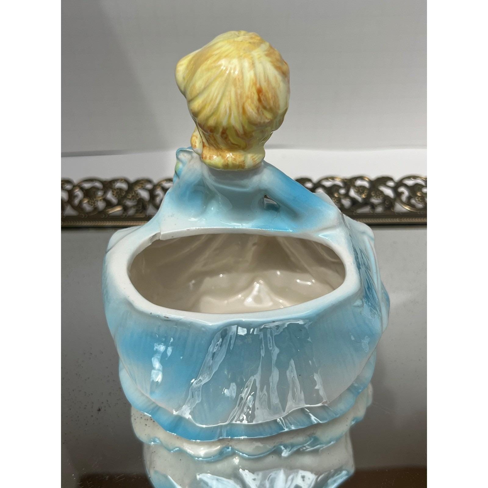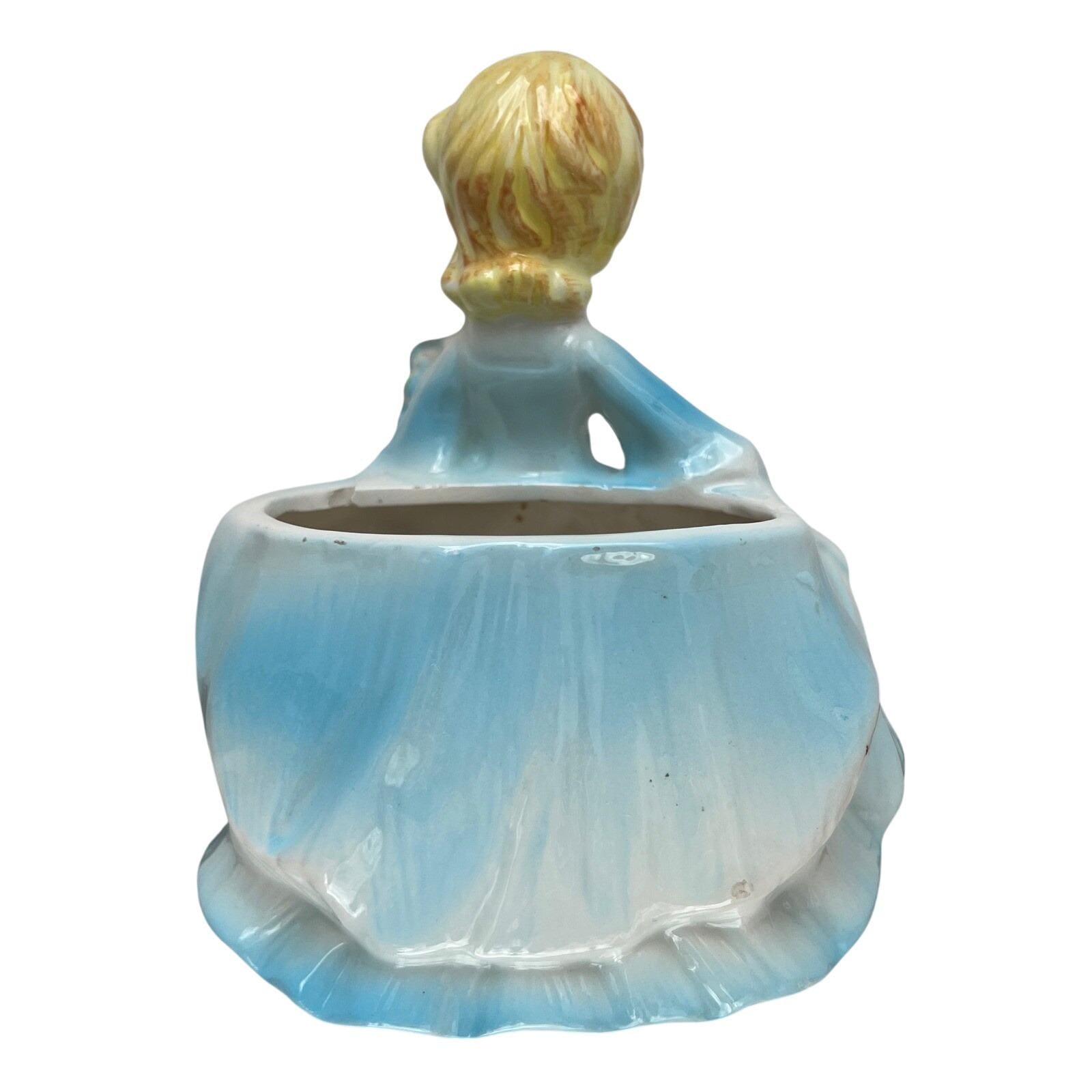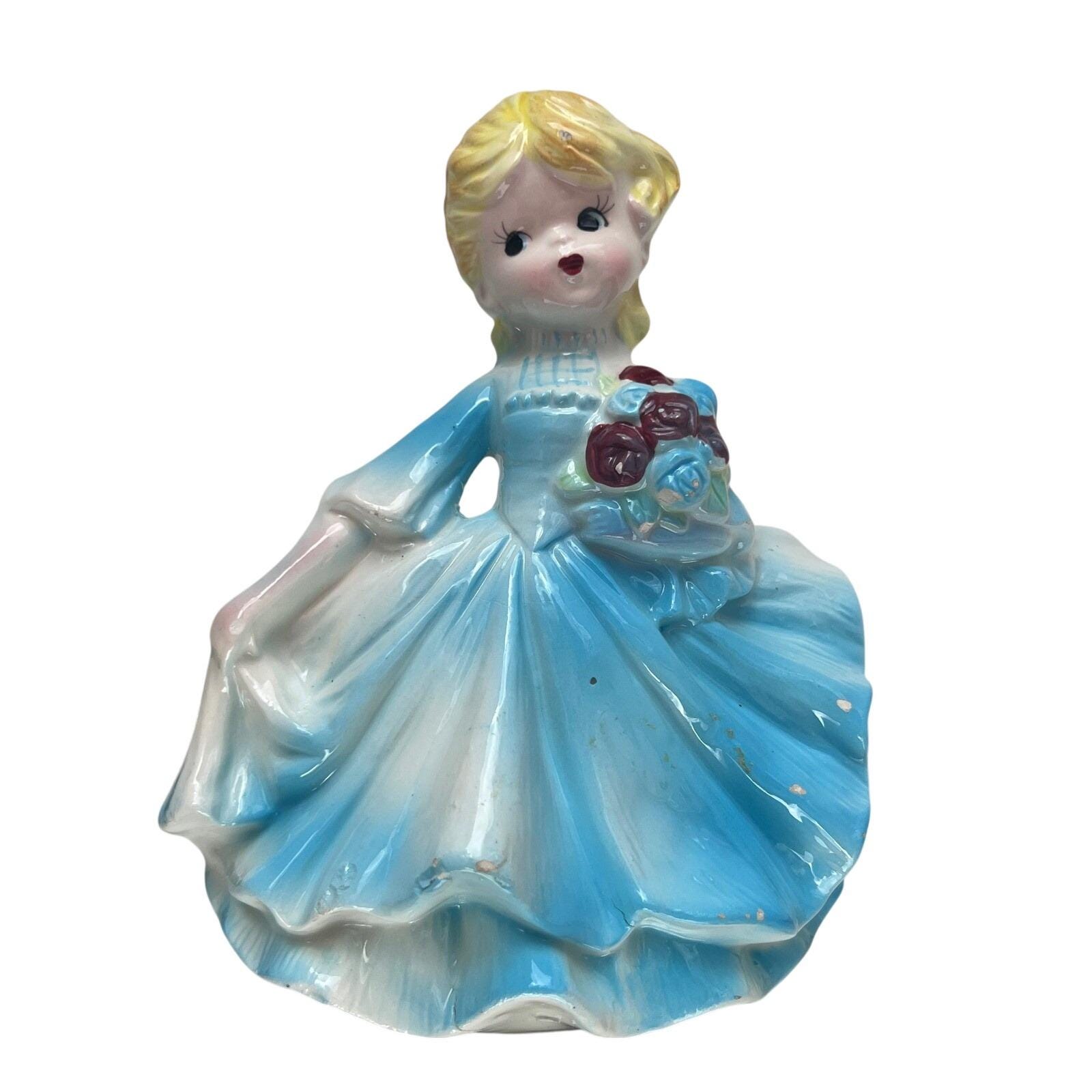 Bring a touch of mid-century charm to your home with this lovely ceramic lady planter. This sweet figurine features a blonde girl in a flowing blue gown, holding a bouquet of deep red roses. The glossy glaze and delicate hand-painted details capture a nostalgic, whimsical feel that is perfect for a vanity, windowsill, or as part of a vintage collection. Whether used to hold a small succulent or simply displayed as a decorative accent, she adds a gentle, curated aesthetic to any space.