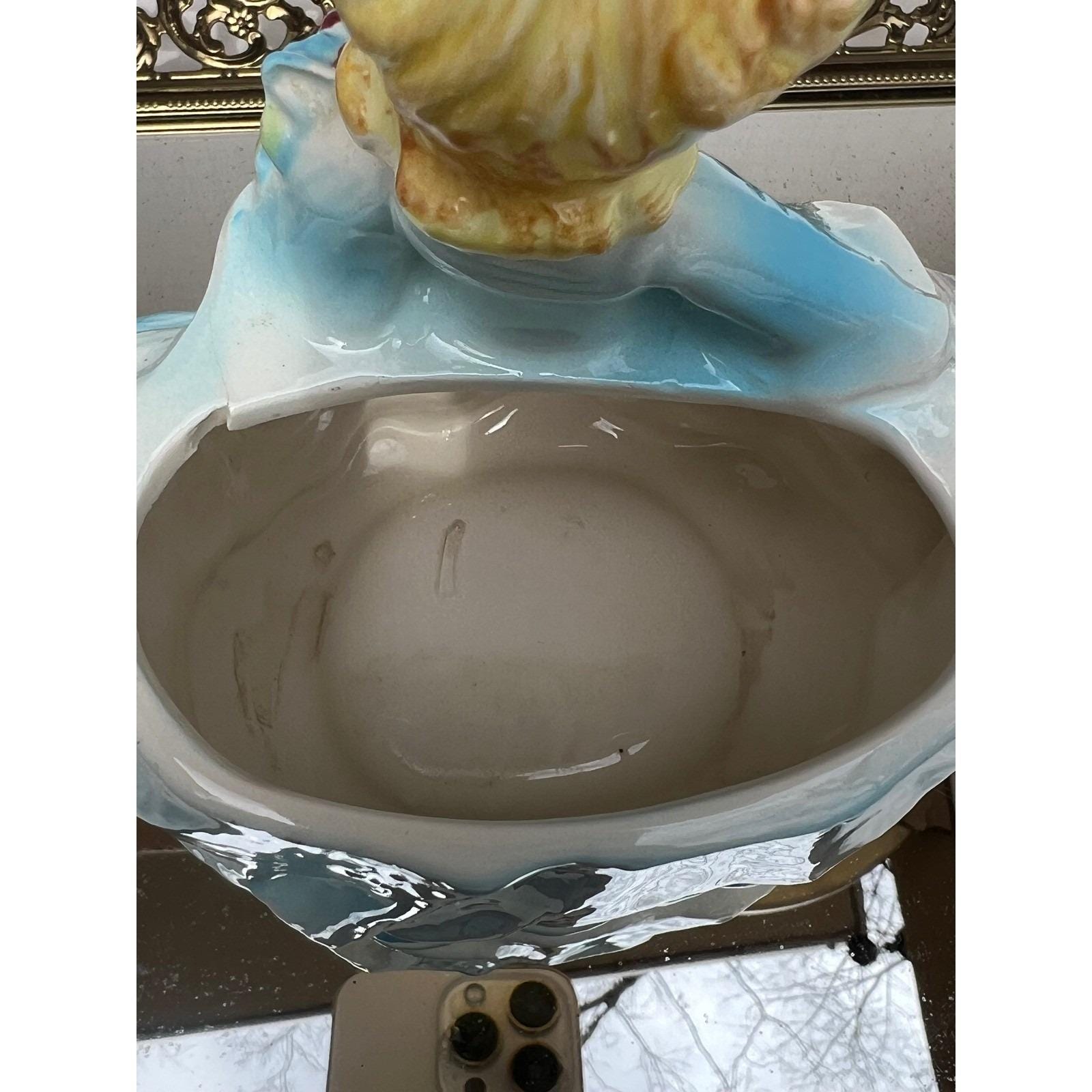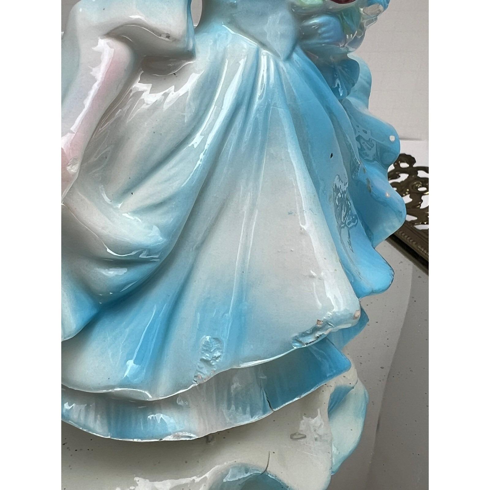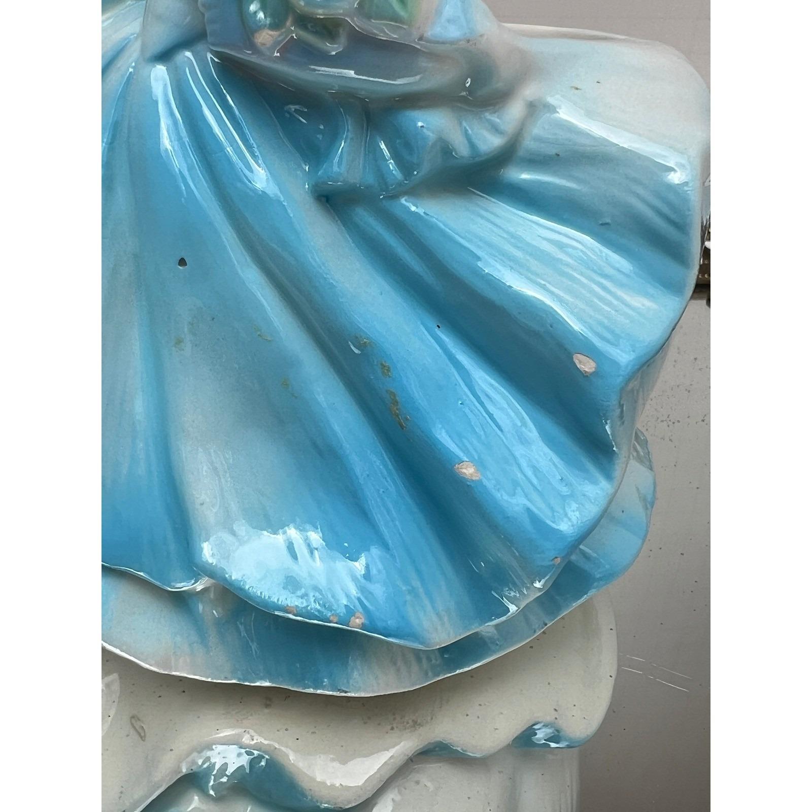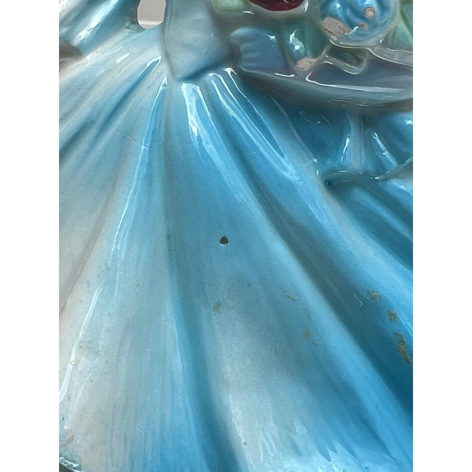 Bring a touch of mid-century charm to your home with this lovely ceramic lady planter. This sweet figurine features a blonde girl in a flowing blue gown, holding a bouquet of deep red roses. The glossy glaze and delicate hand-painted details capture a nostalgic, whimsical feel that is perfect for a vanity, windowsill, or as part of a vintage collection. Whether used to hold a small succulent or simply displayed as a decorative accent, she adds a gentle, curated aesthetic to any space.