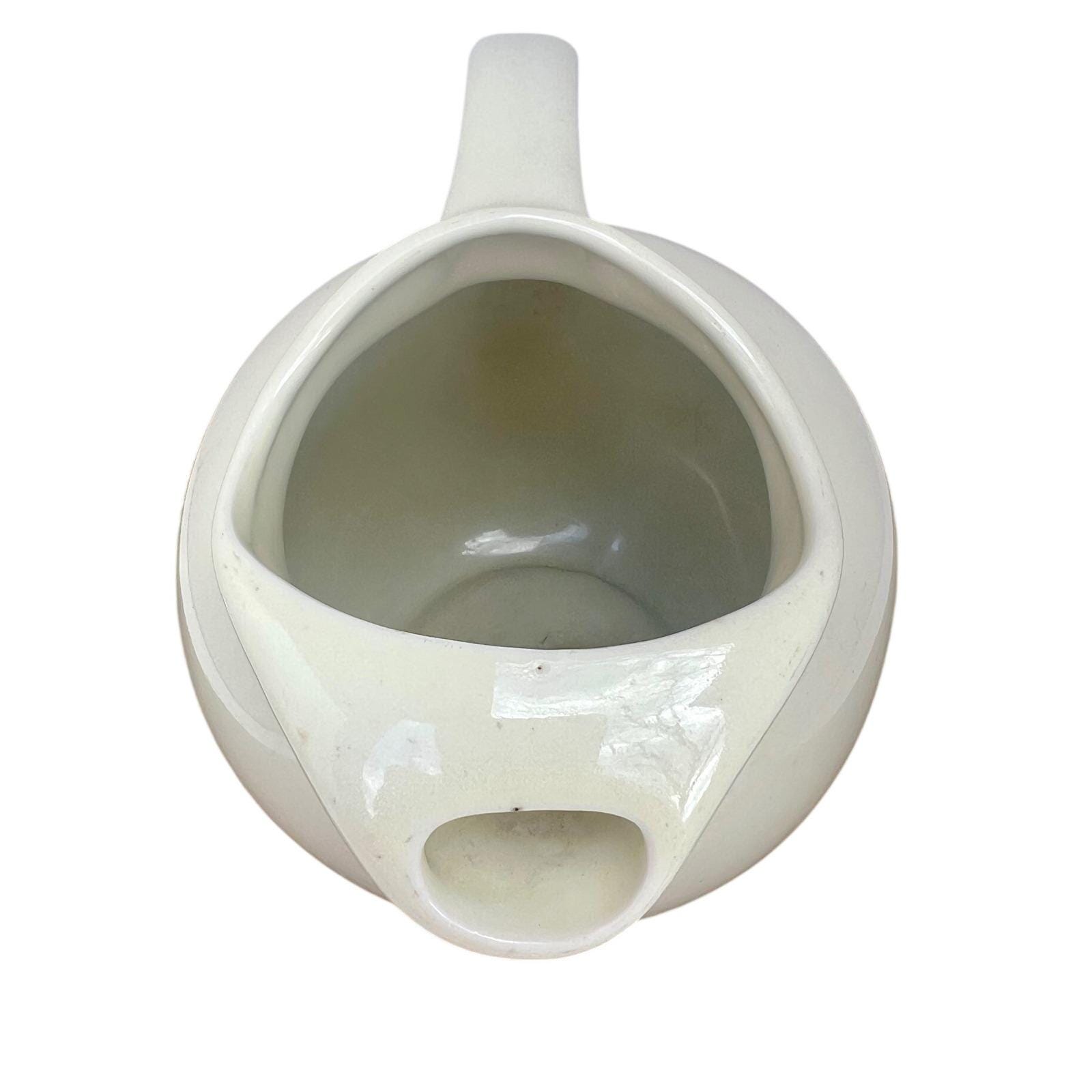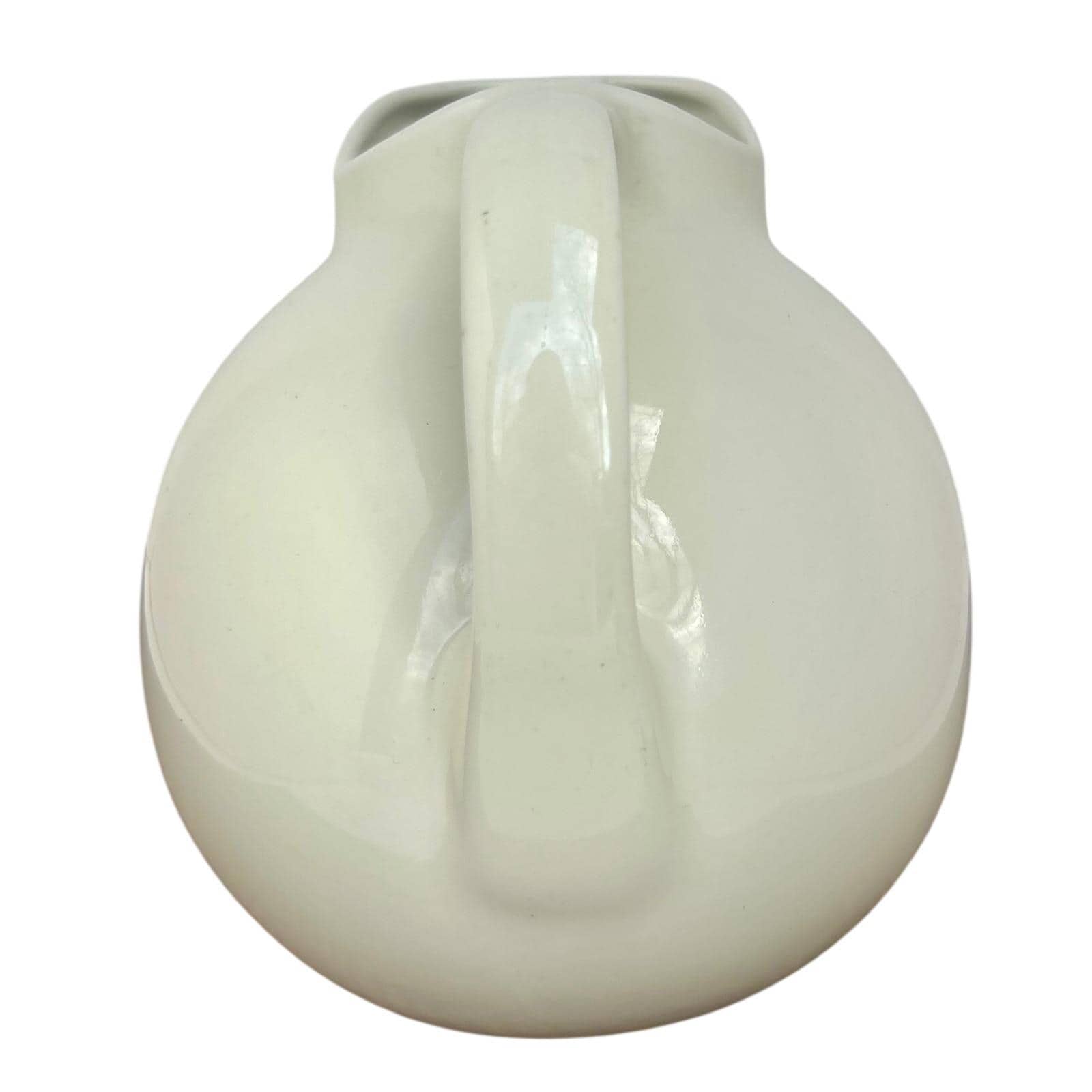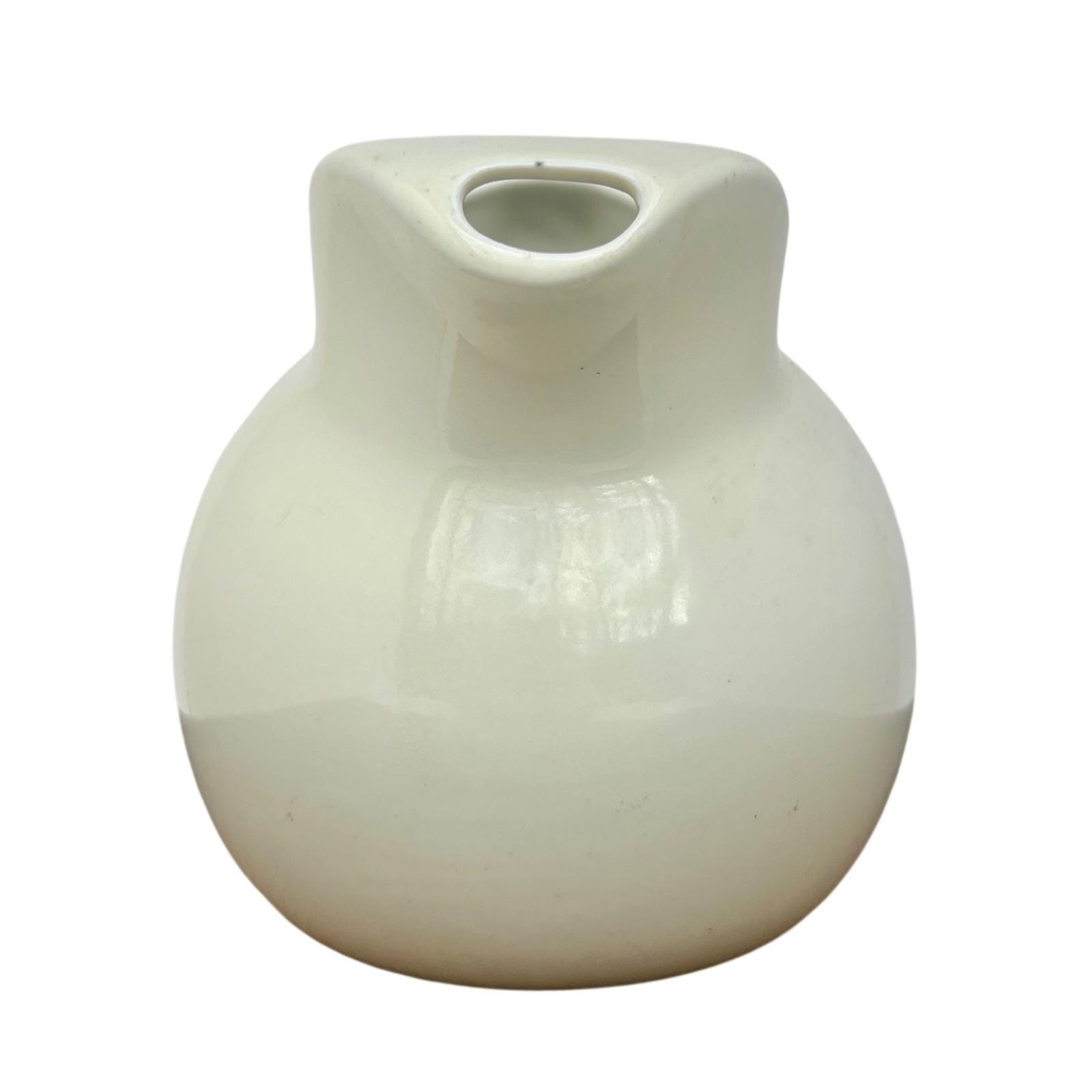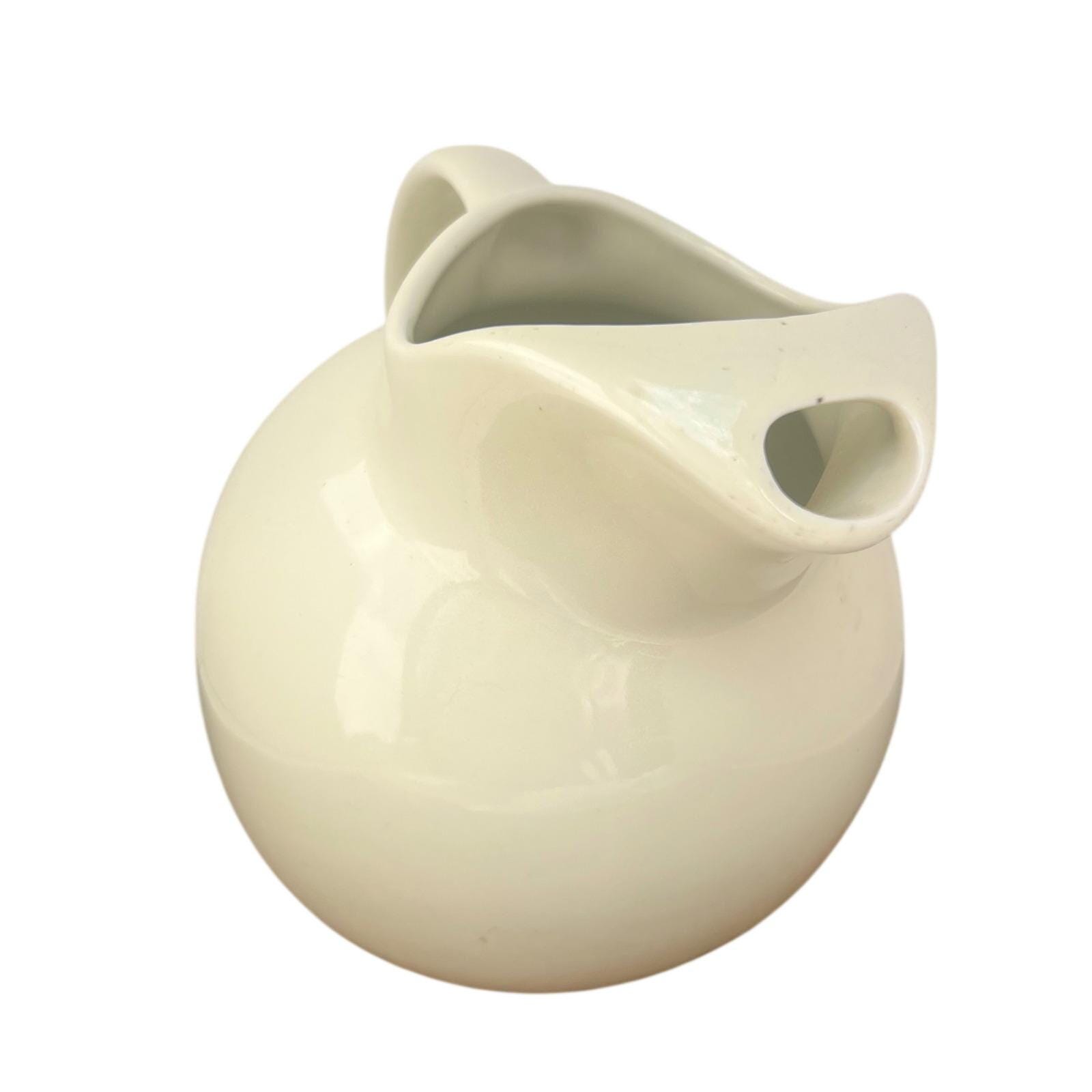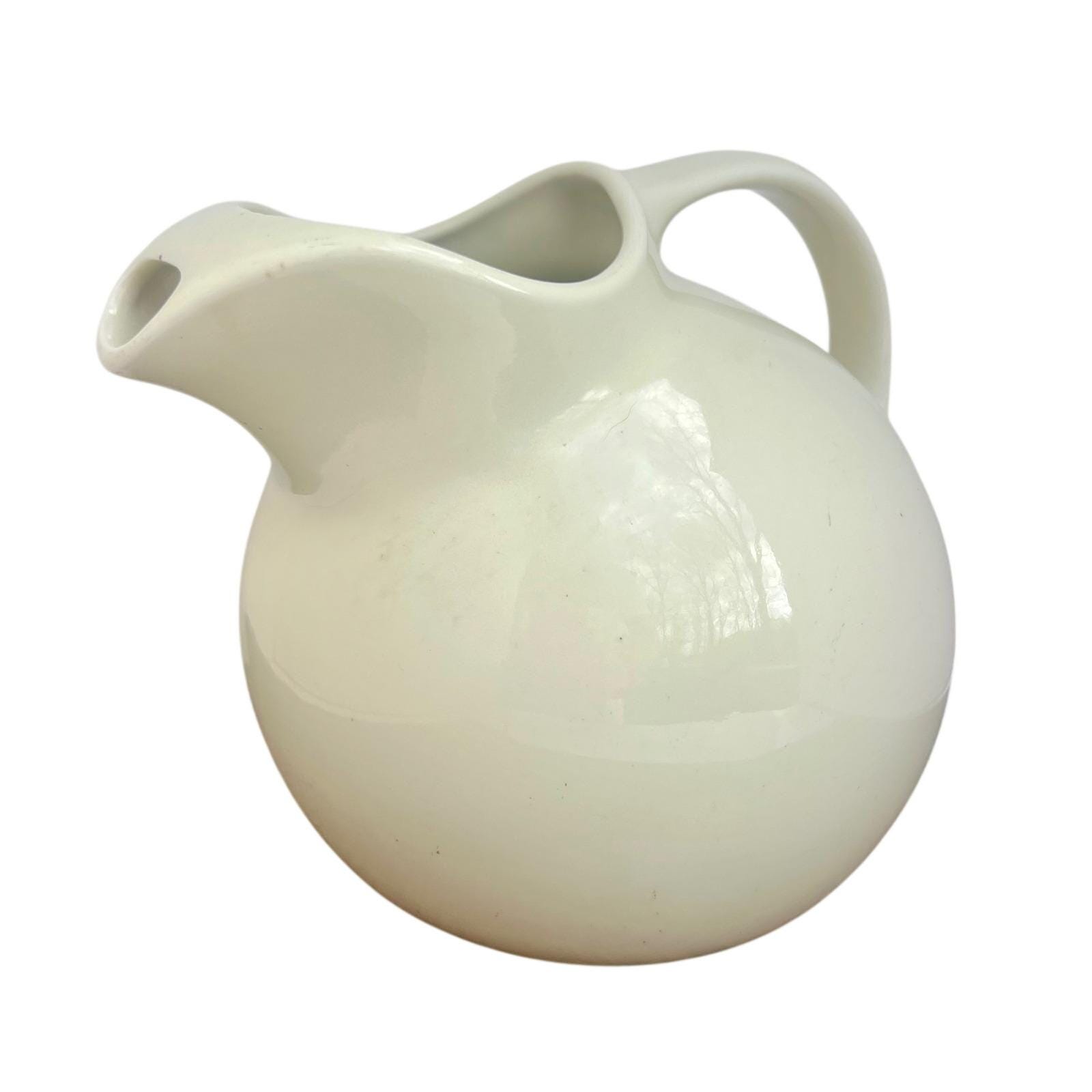 Bring a touch of mid-century charm to your home with this beautifully rounded Hall China pitcher. Its creamy ivory glaze and distinctive spherical shape offer a clean, sculptural aesthetic that feels both substantial and elegant in hand. Whether you're serving refreshments at a garden brunch or using it as a unique vessel for a fresh floral arrangement, this versatile piece adds a soft, timeless warmth to any setting.