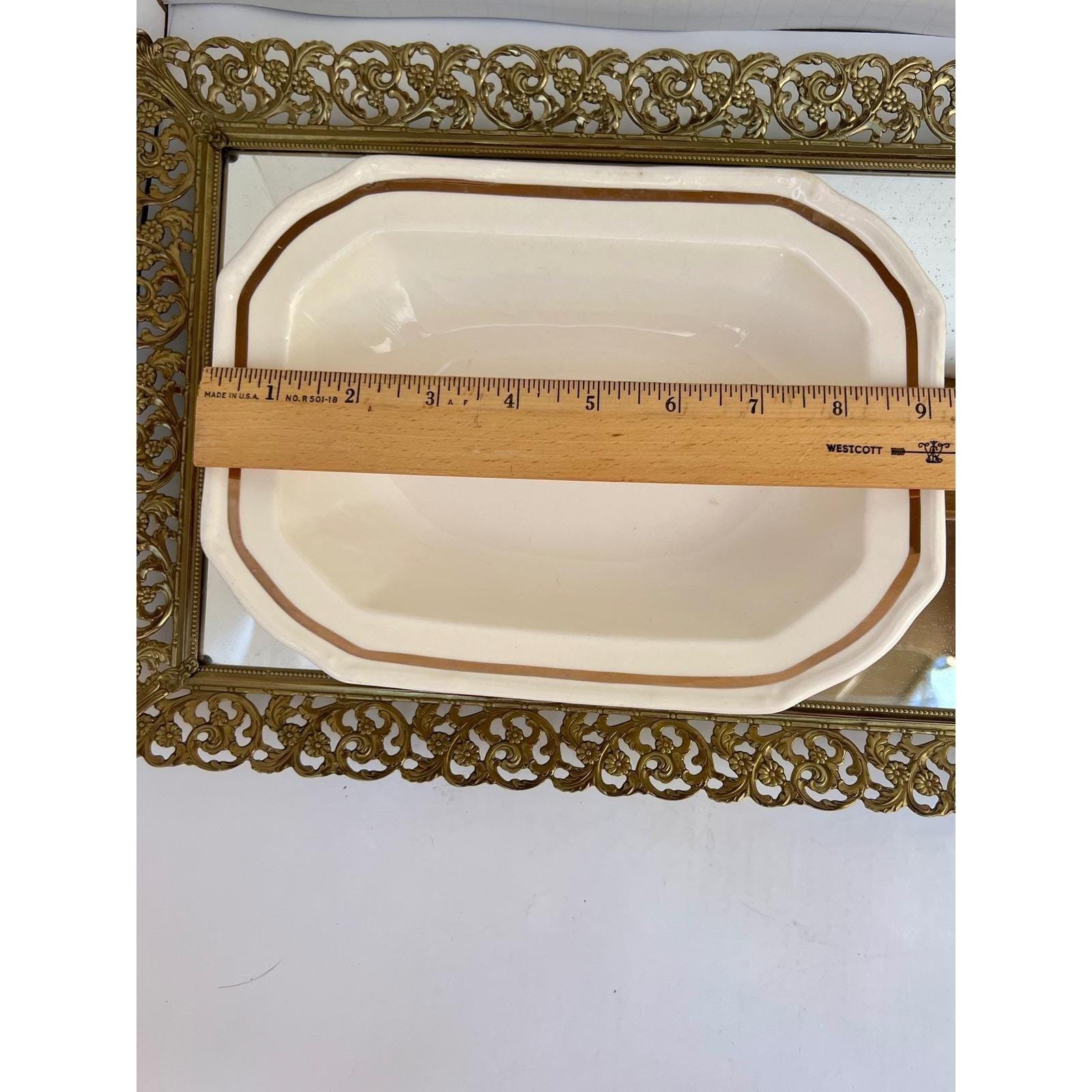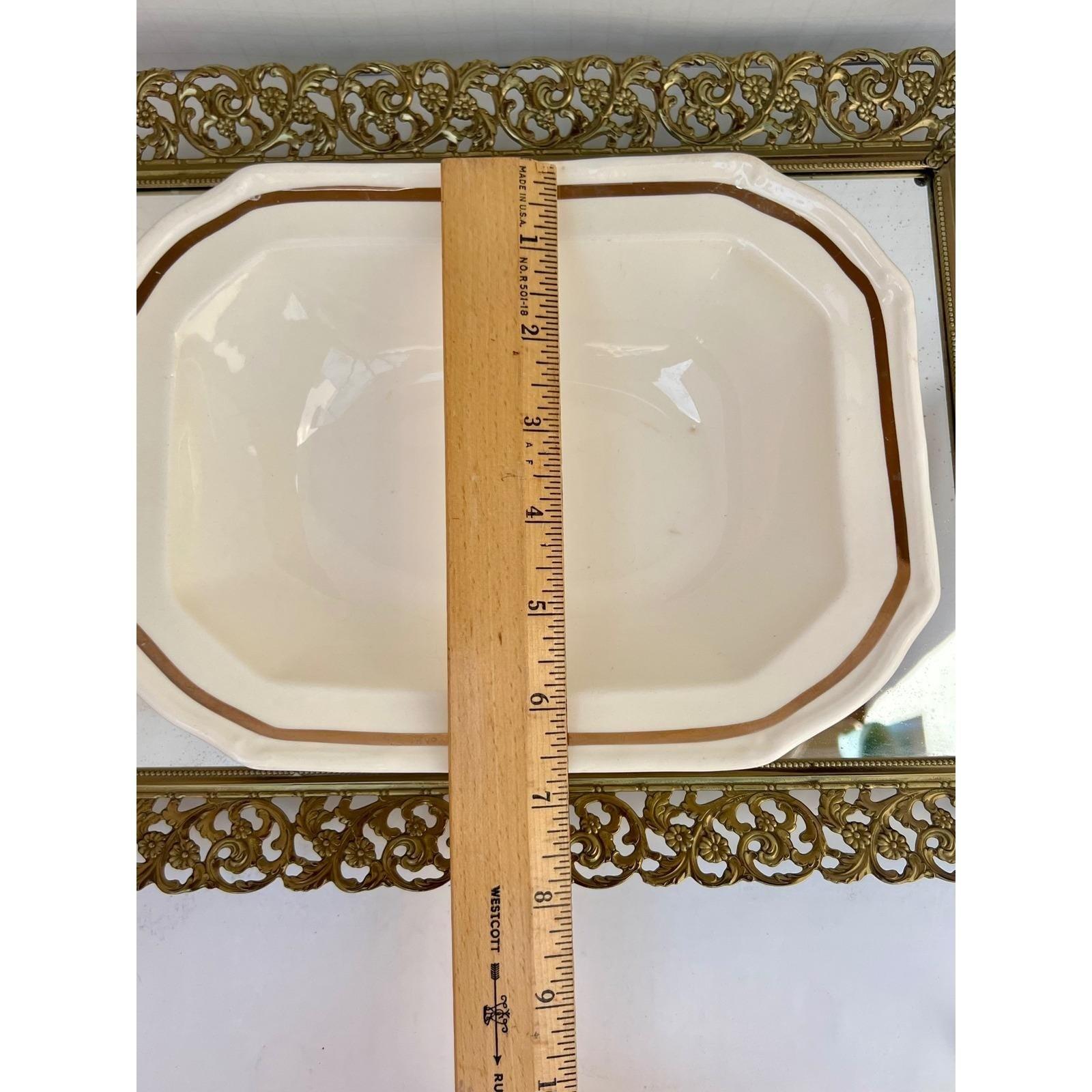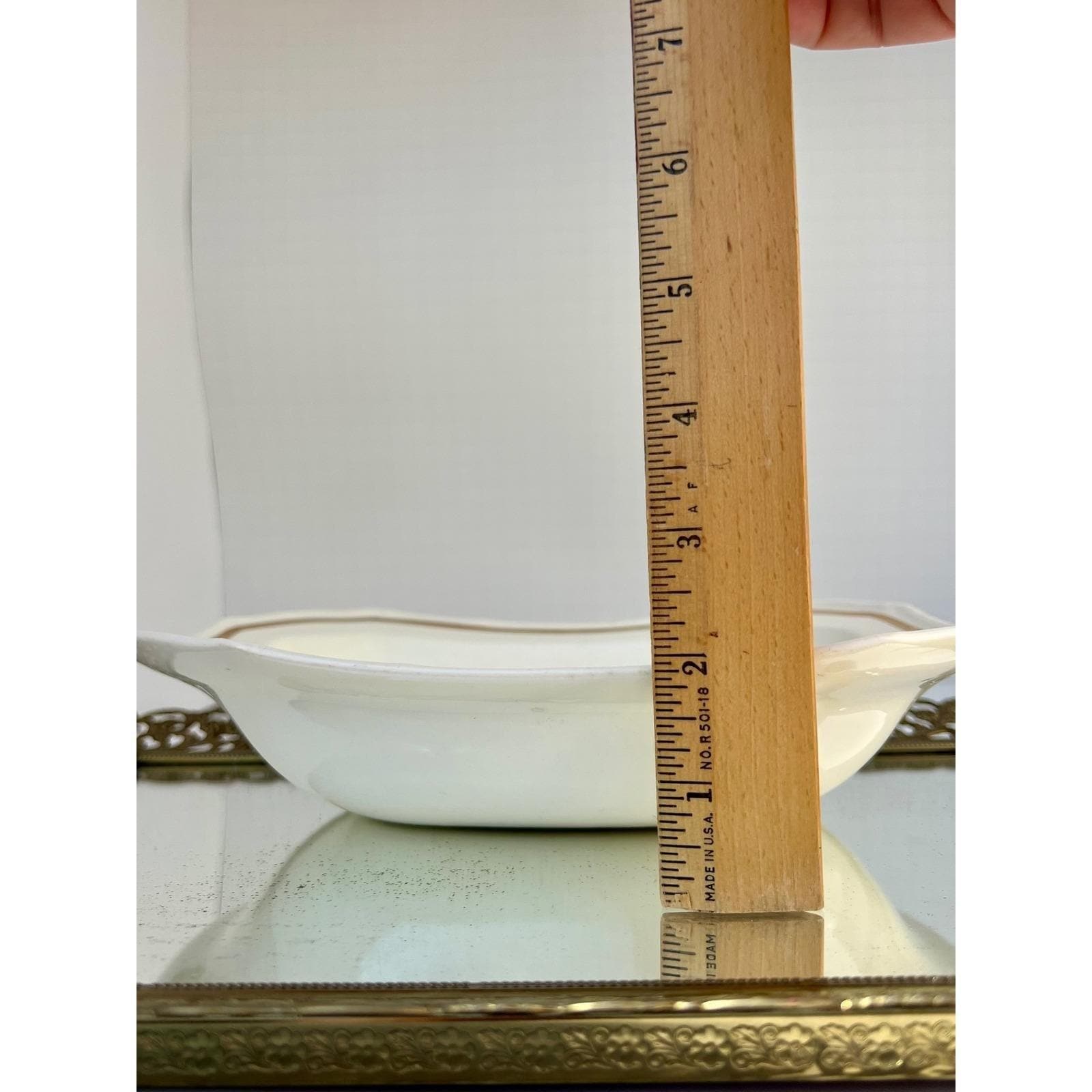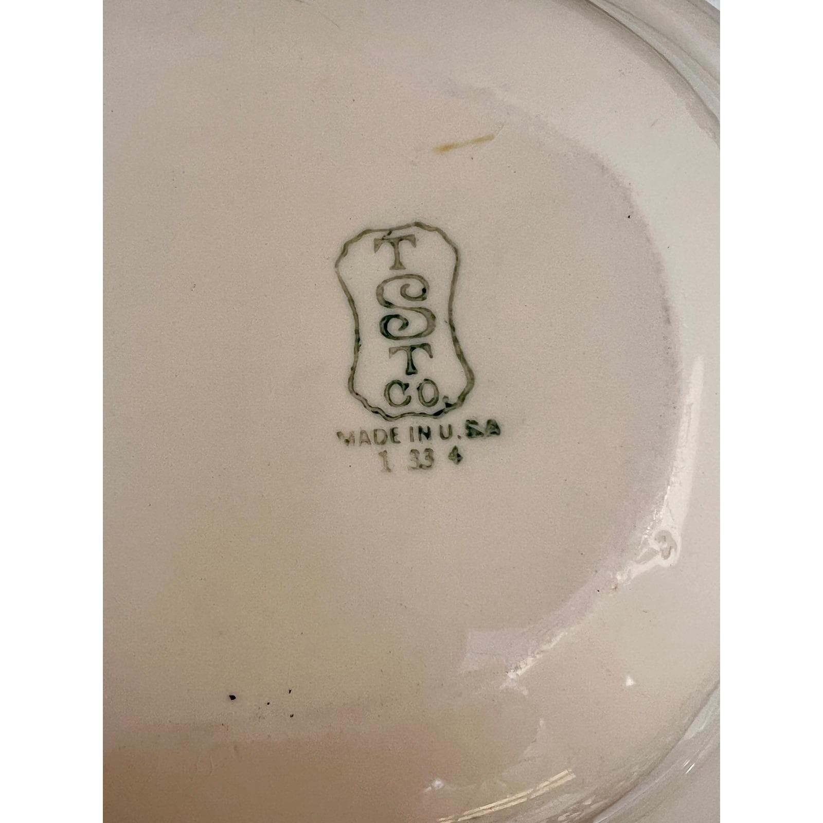 This stunning 9-inch vegetable serving bowl is a classic example of American-made ironstone from the esteemed Taylor, Smith & Taylor Company. Featuring a sophisticated gold trim…often 22K gold filigree…on a crisp white or cream background, this bowl is both a functional serving piece and a beautiful collector's item.