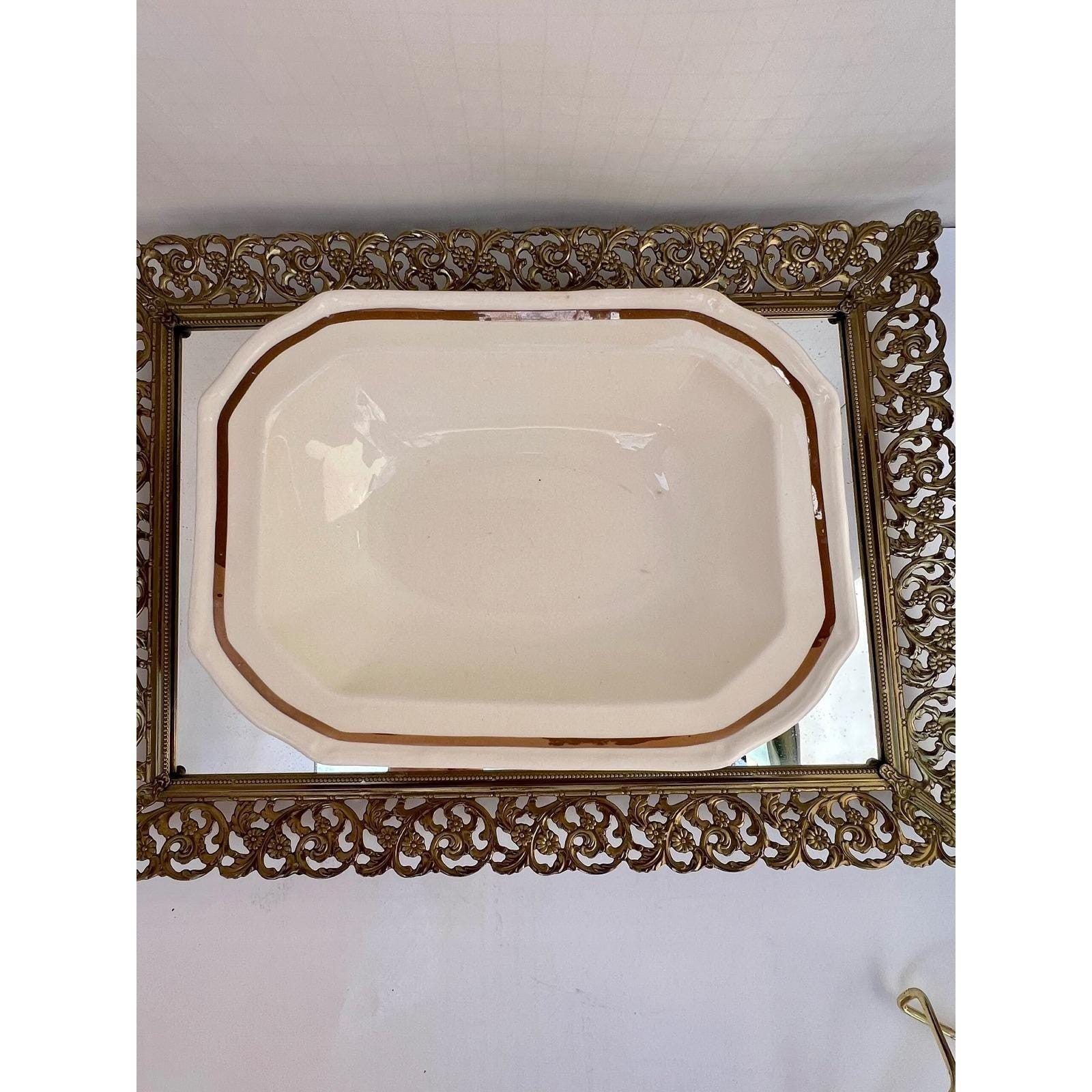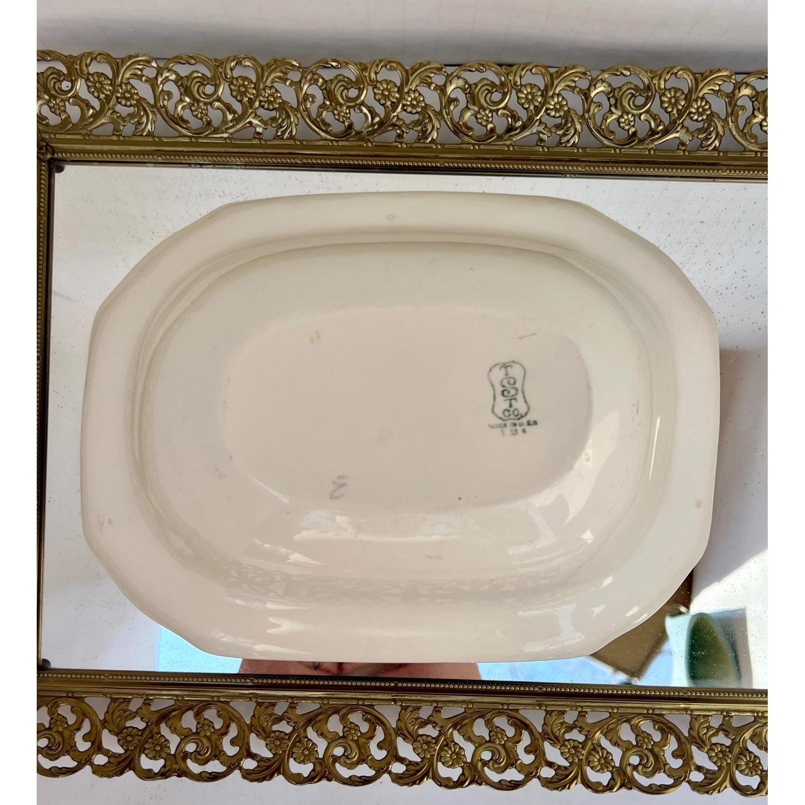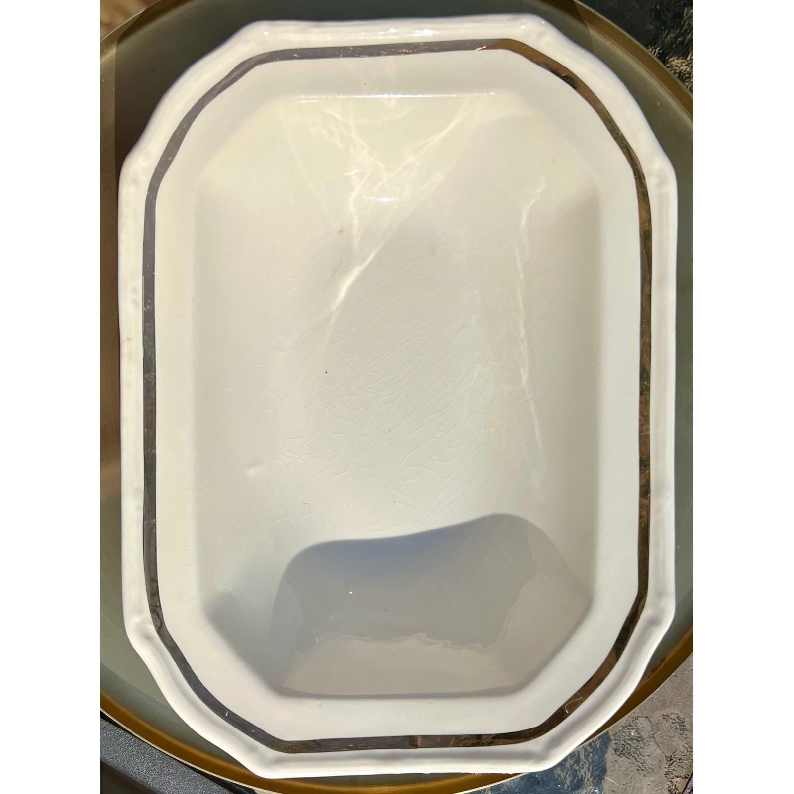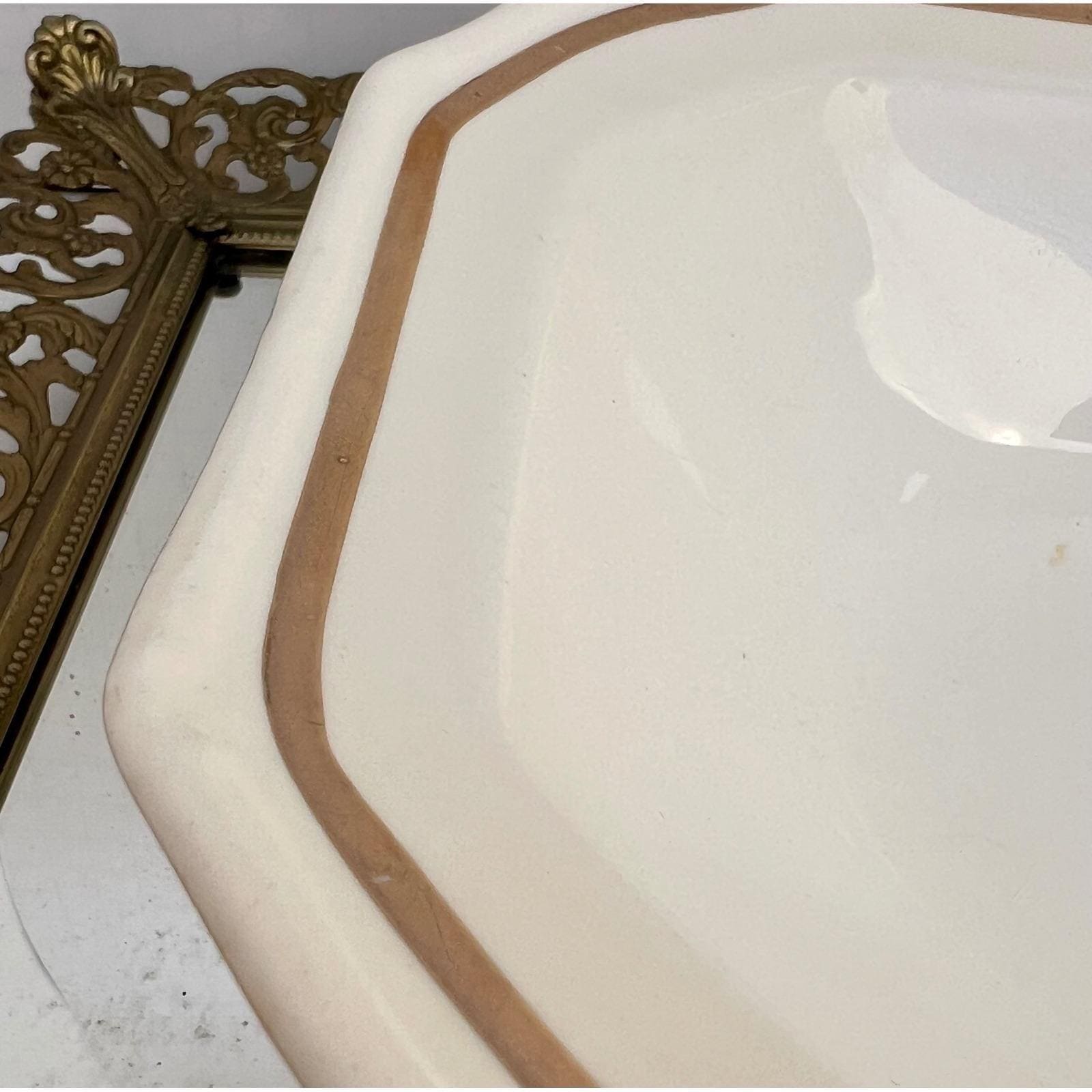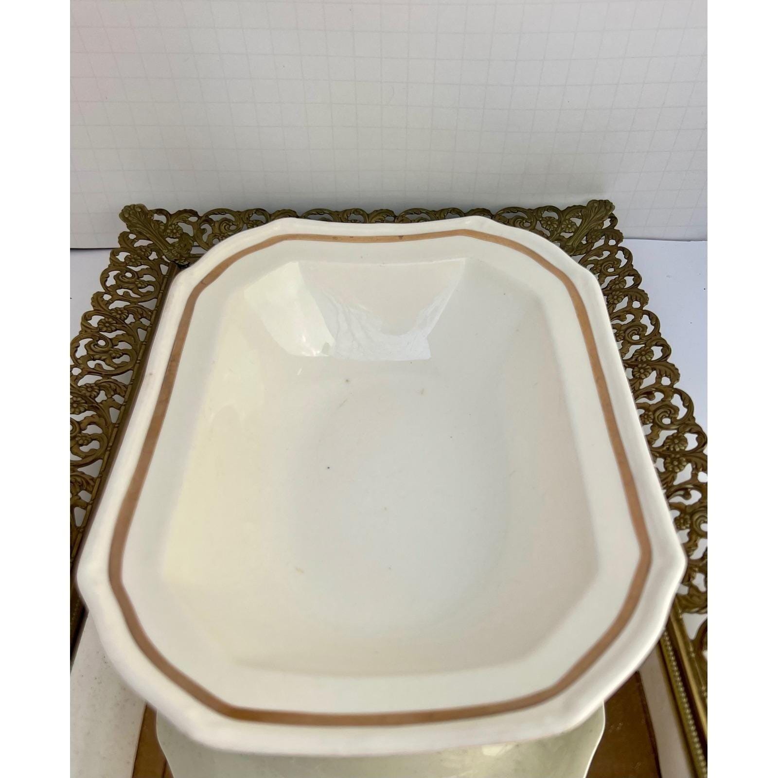 This stunning 9-inch vegetable serving bowl is a classic example of American-made ironstone from the esteemed Taylor, Smith & Taylor Company. Featuring a sophisticated gold trim…often 22K gold filigree…on a crisp white or cream background, this bowl is both a functional serving piece and a beautiful collector's item.