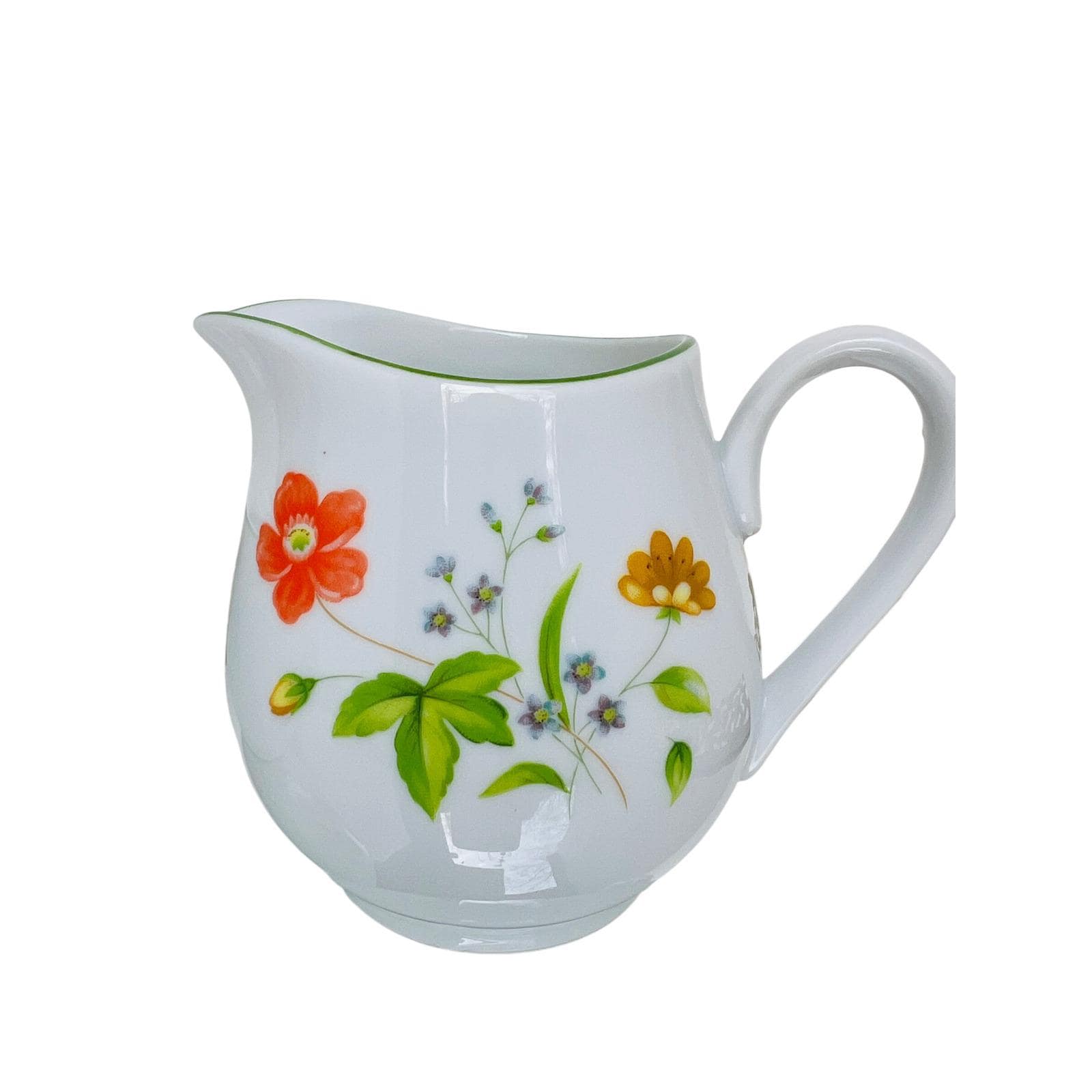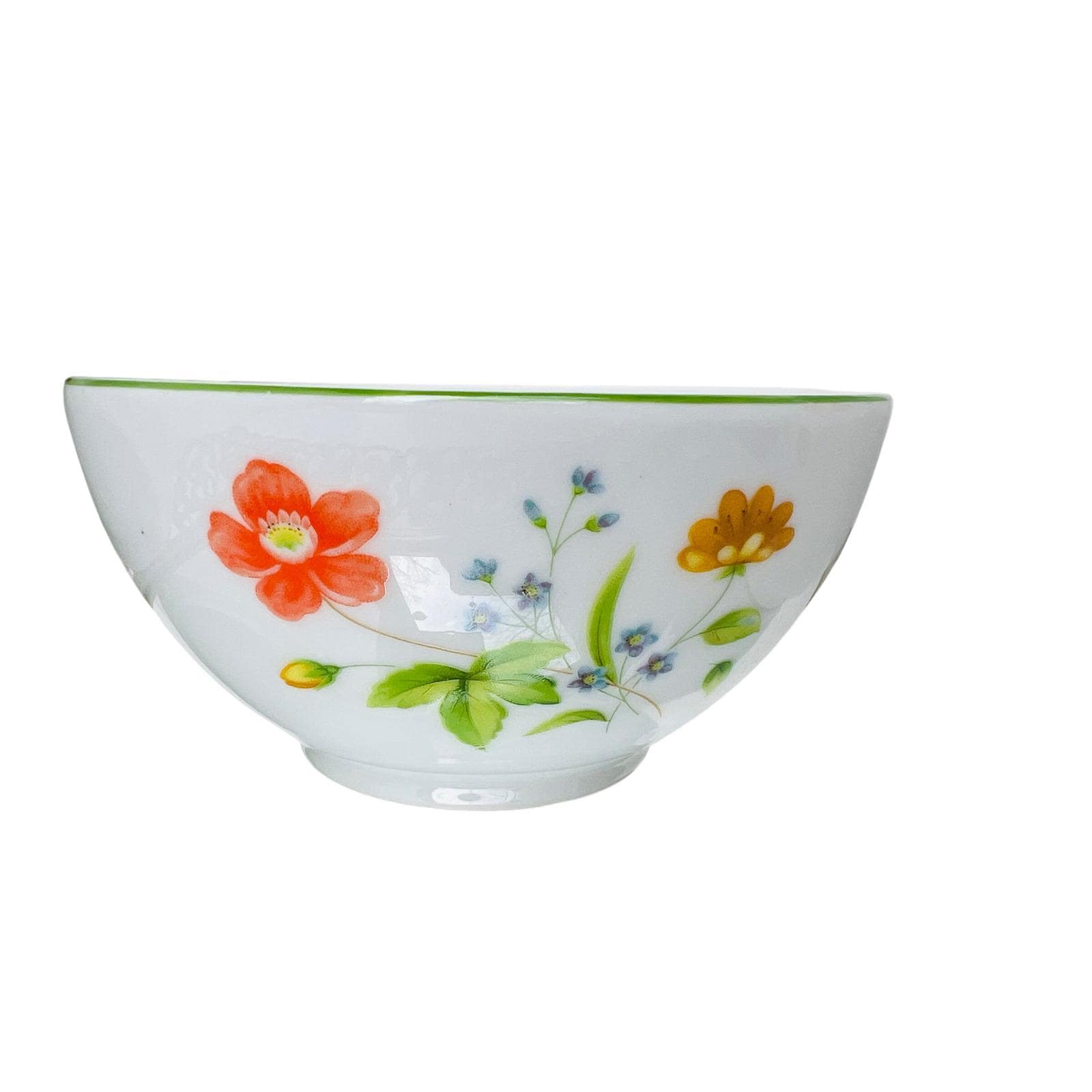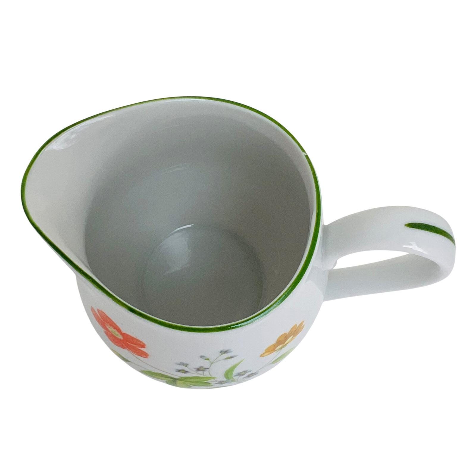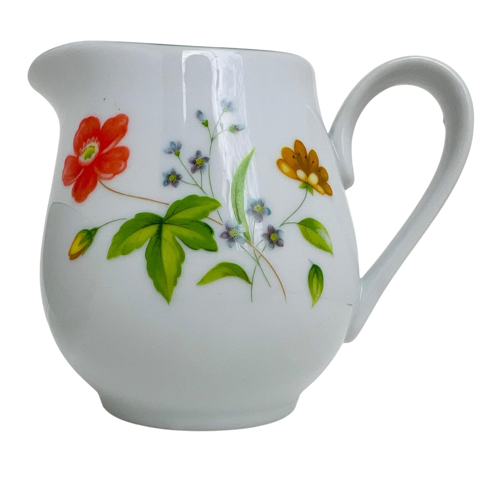This high-quality porcelain set features a cheerful floral motif of orange, yellow, and blue flowers accented by a delicate green rim. The "April Flowers" pattern is a retired favorite, making this a great find for collectors or those looking to complete their dinnerware service.