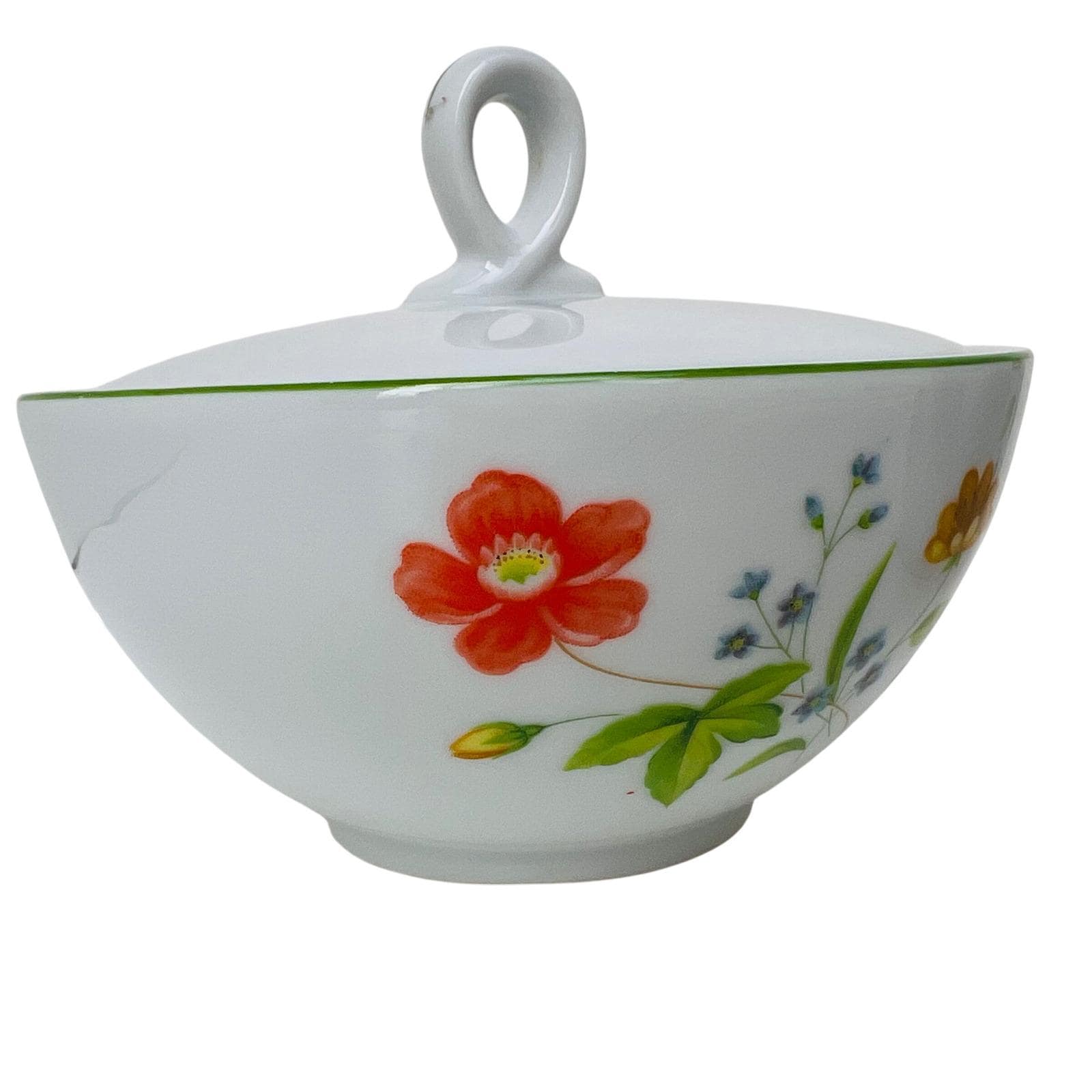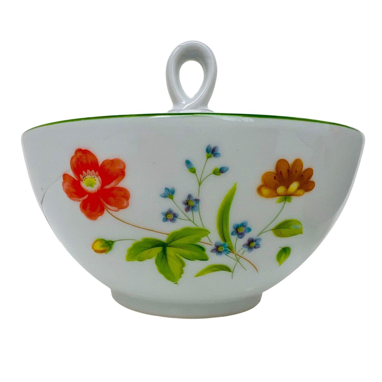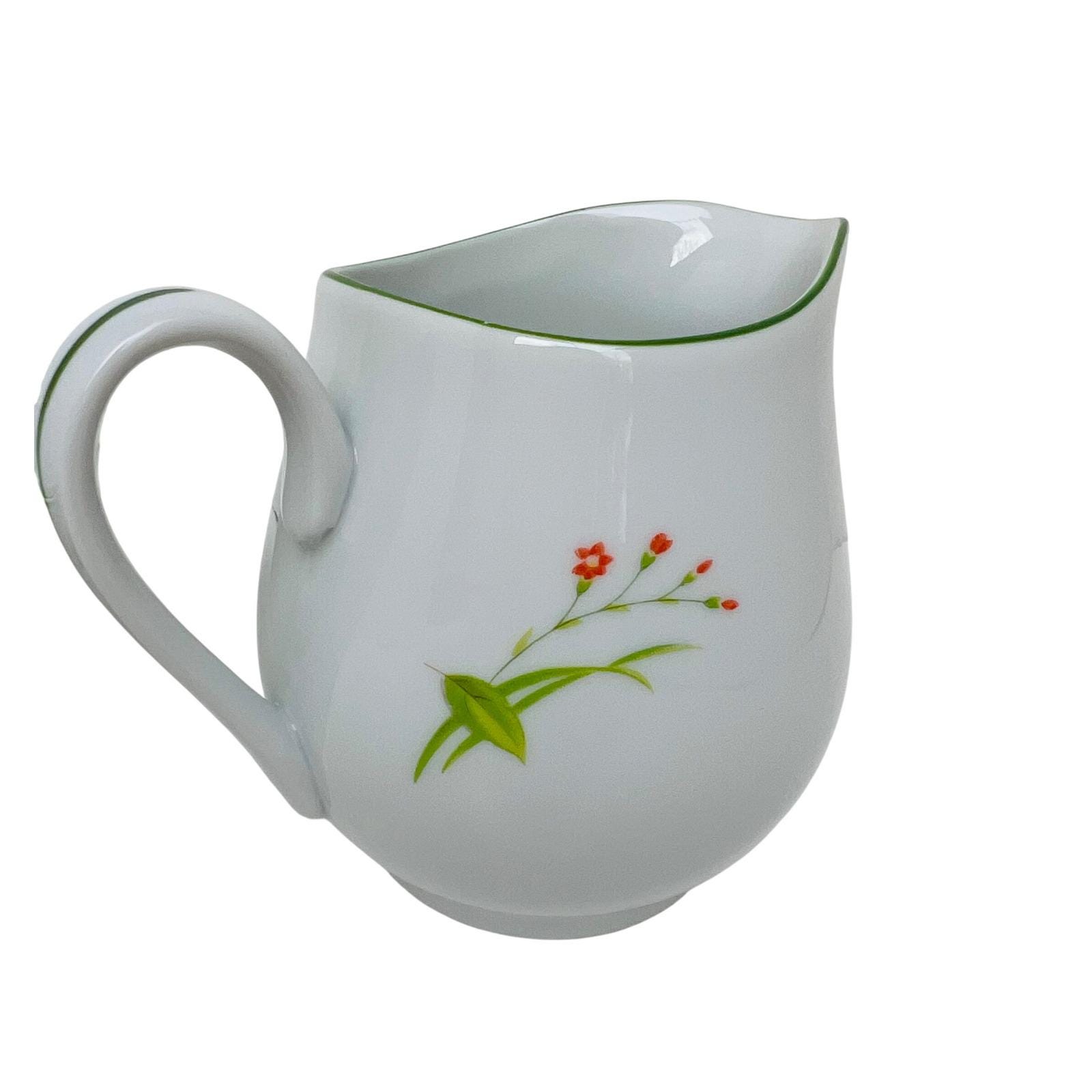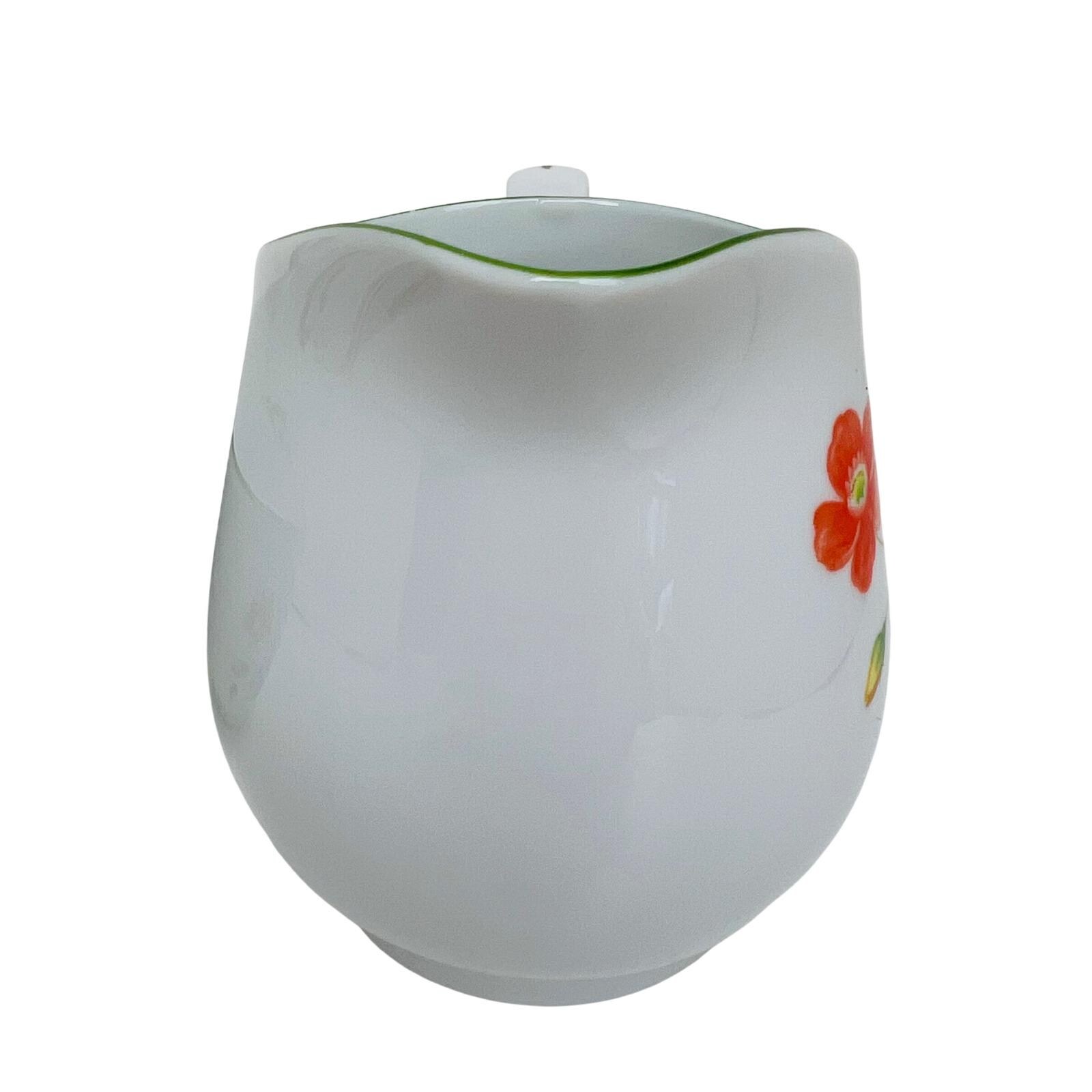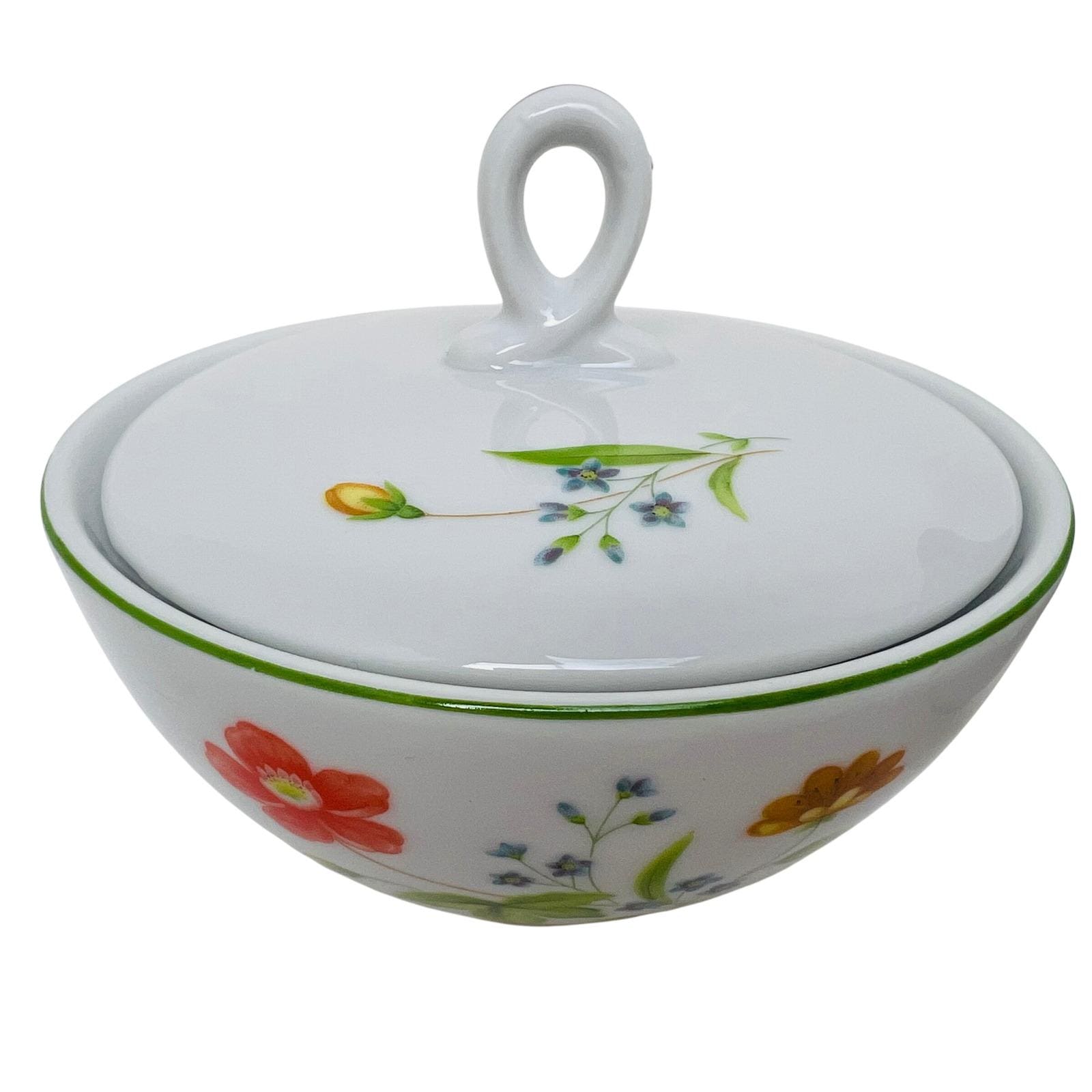 This high-quality porcelain set features a cheerful floral motif of orange, yellow, and blue flowers accented by a delicate green rim. The "April Flowers" pattern is a retired favorite, making this a great find for collectors or those looking to complete their dinnerware service.