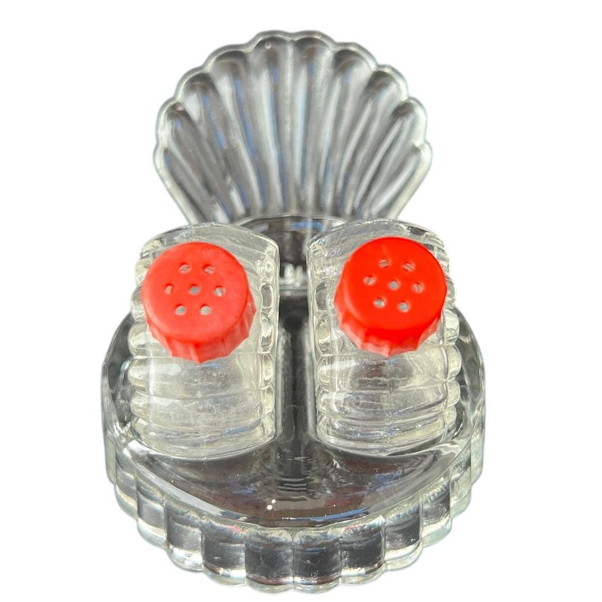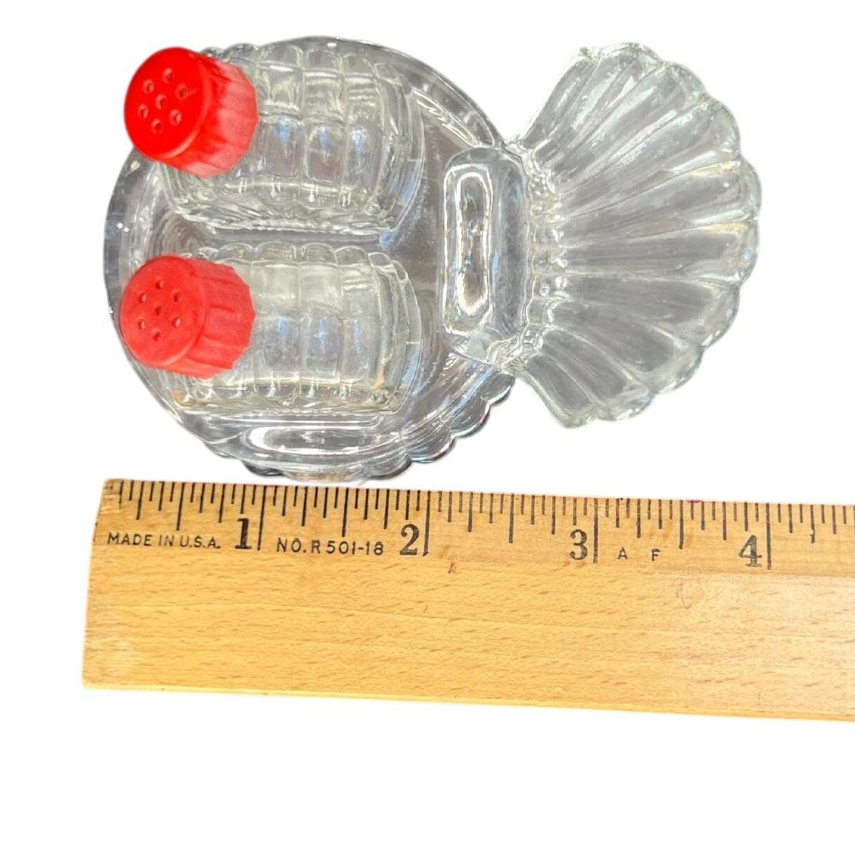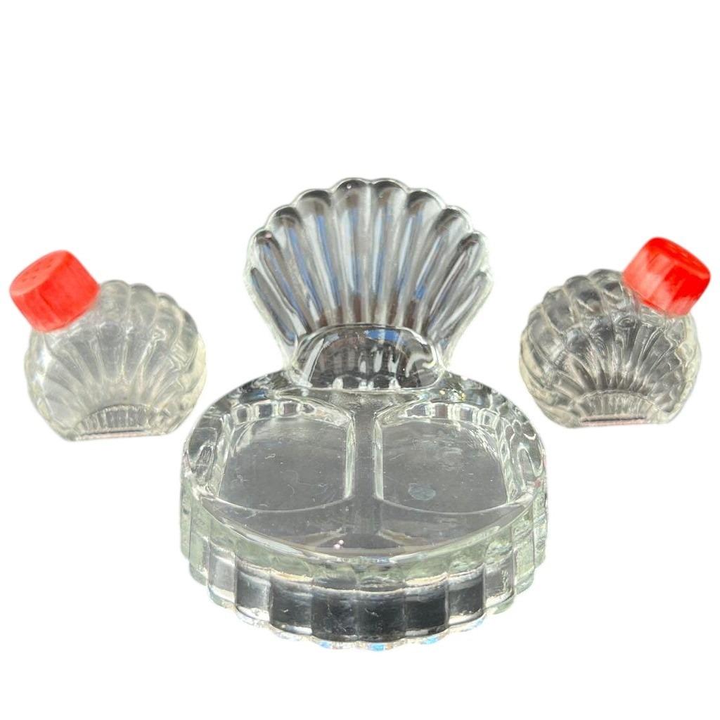 Bring a touch of coastal charm to your dining table with this delightful three-piece condiment set. The clear pressed glass features a classic shell motif, with two small shakers nestled perfectly into a matching scalloped base. The vibrant red caps provide a cheerful pop of color, making this set a functional and nostalgic addition to any kitchen or seaside-themed decor.