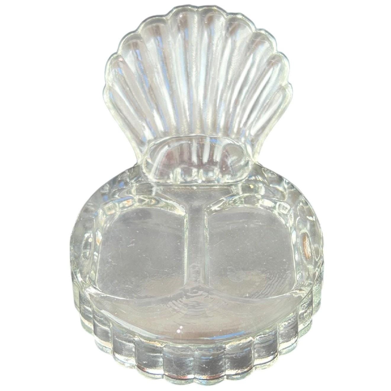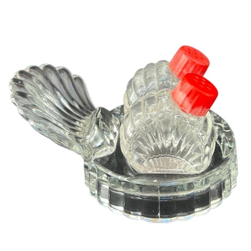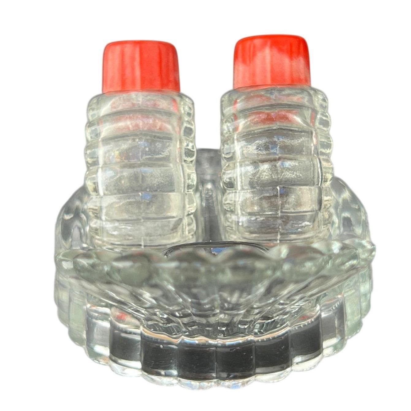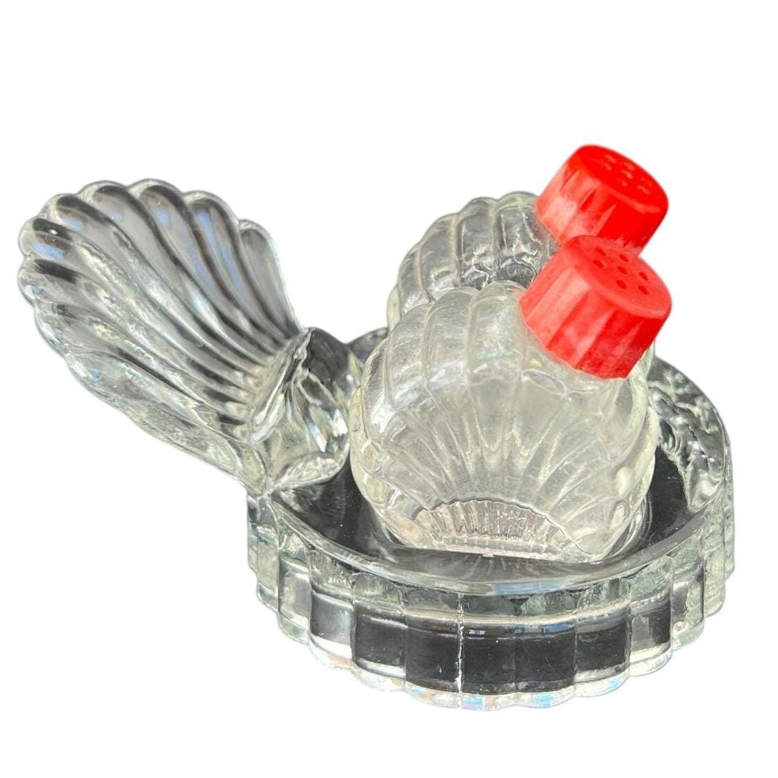 Bring a touch of coastal charm to your dining table with this delightful three-piece condiment set. The clear pressed glass features a classic shell motif, with two small shakers nestled perfectly into a matching scalloped base. The vibrant red caps provide a cheerful pop of color, making this set a functional and nostalgic addition to any kitchen or seaside-themed decor.