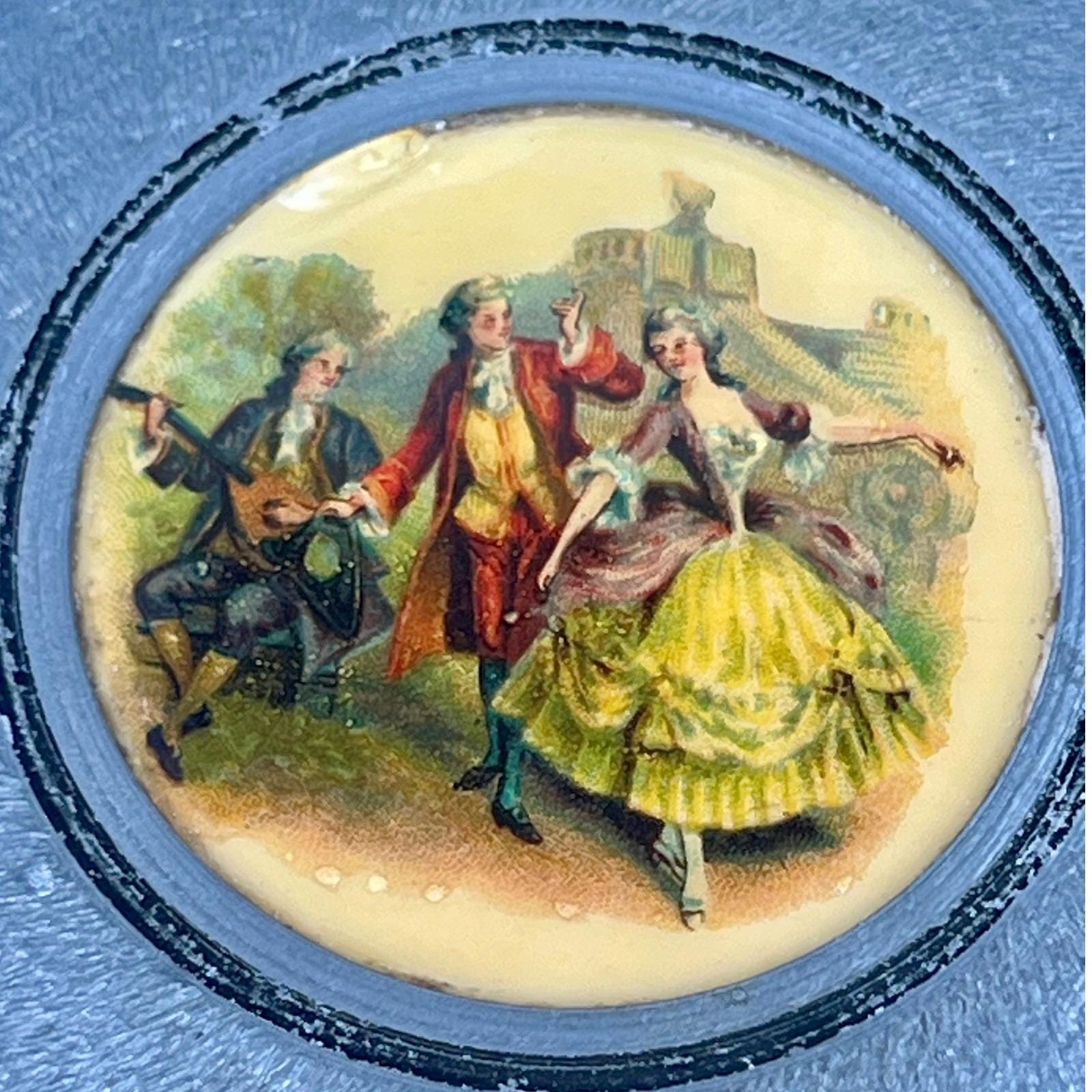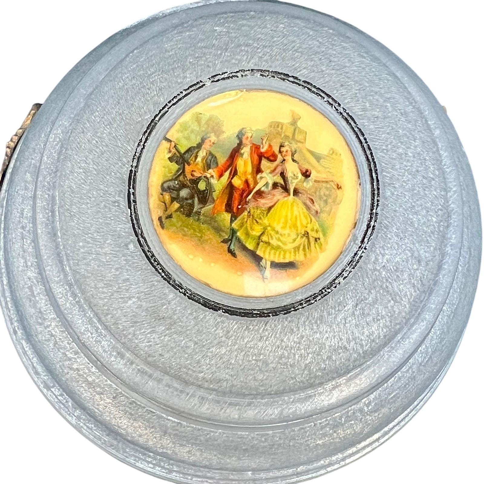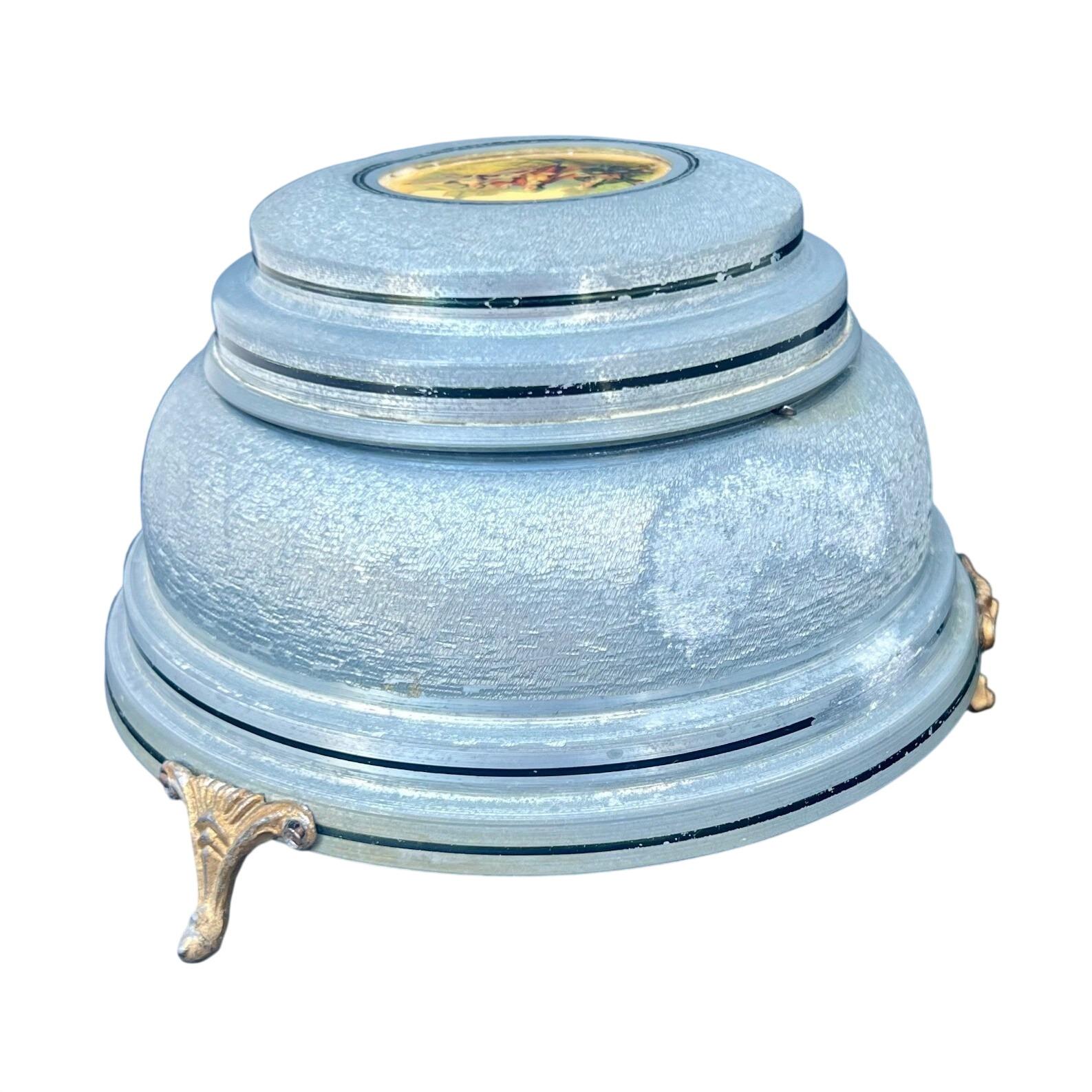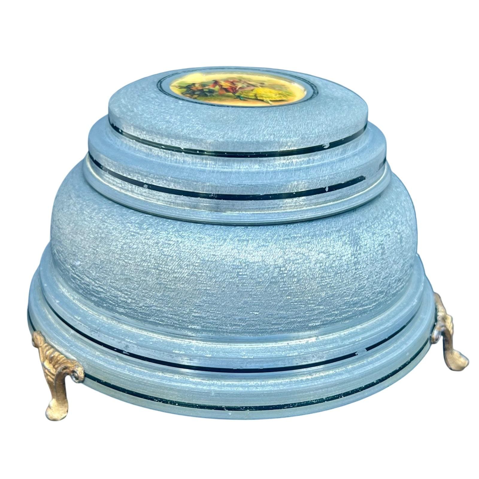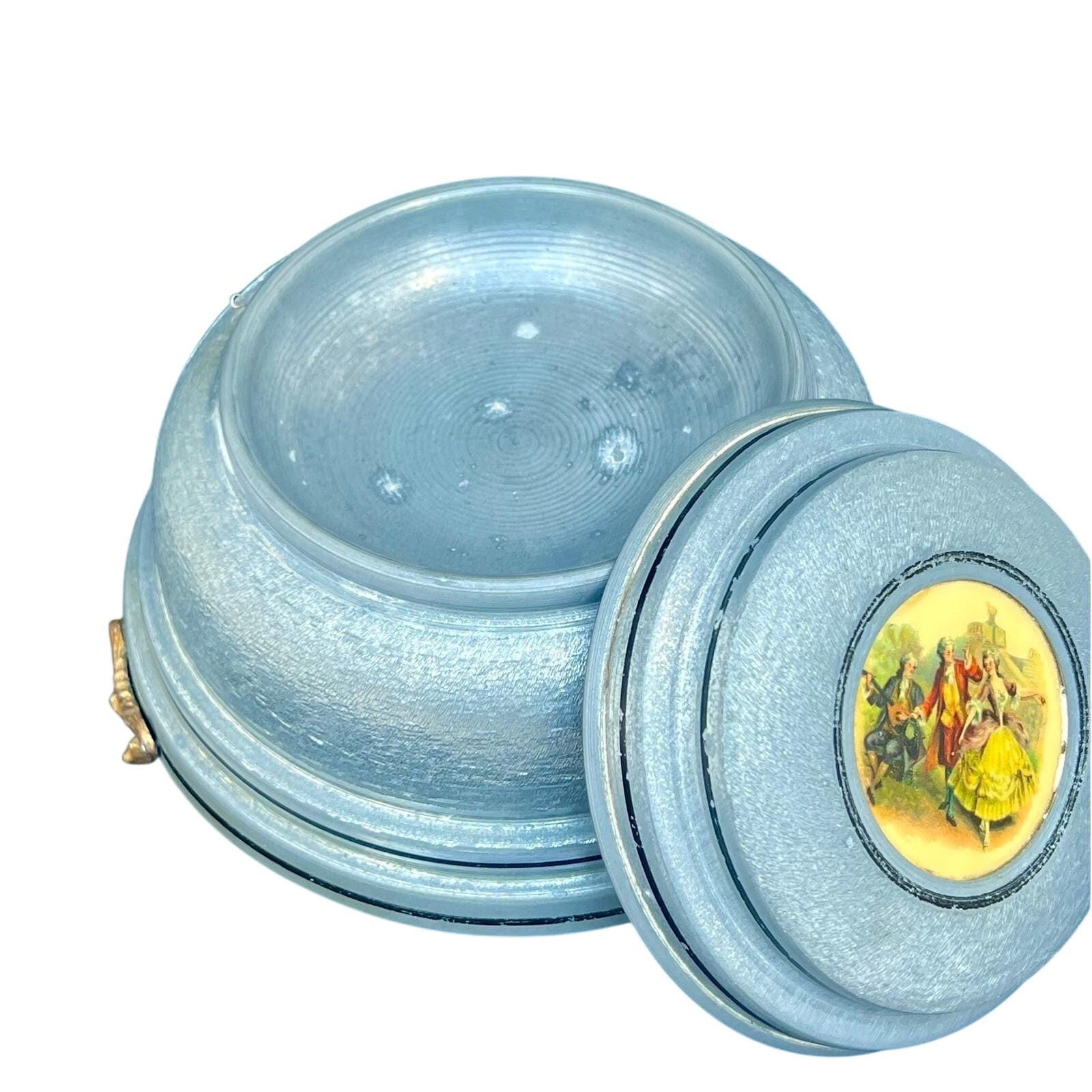 Add a touch of mid-century romance to your vanity with this authentic 1950s musical powder box. Crafted from durable textured aluminum in a soft metallic blue, the lid features a charming Fragonard-style courting couple scene set within an ornate medallion. This footed piece is both a functional cosmetic holder and a nostalgic musical treasure.