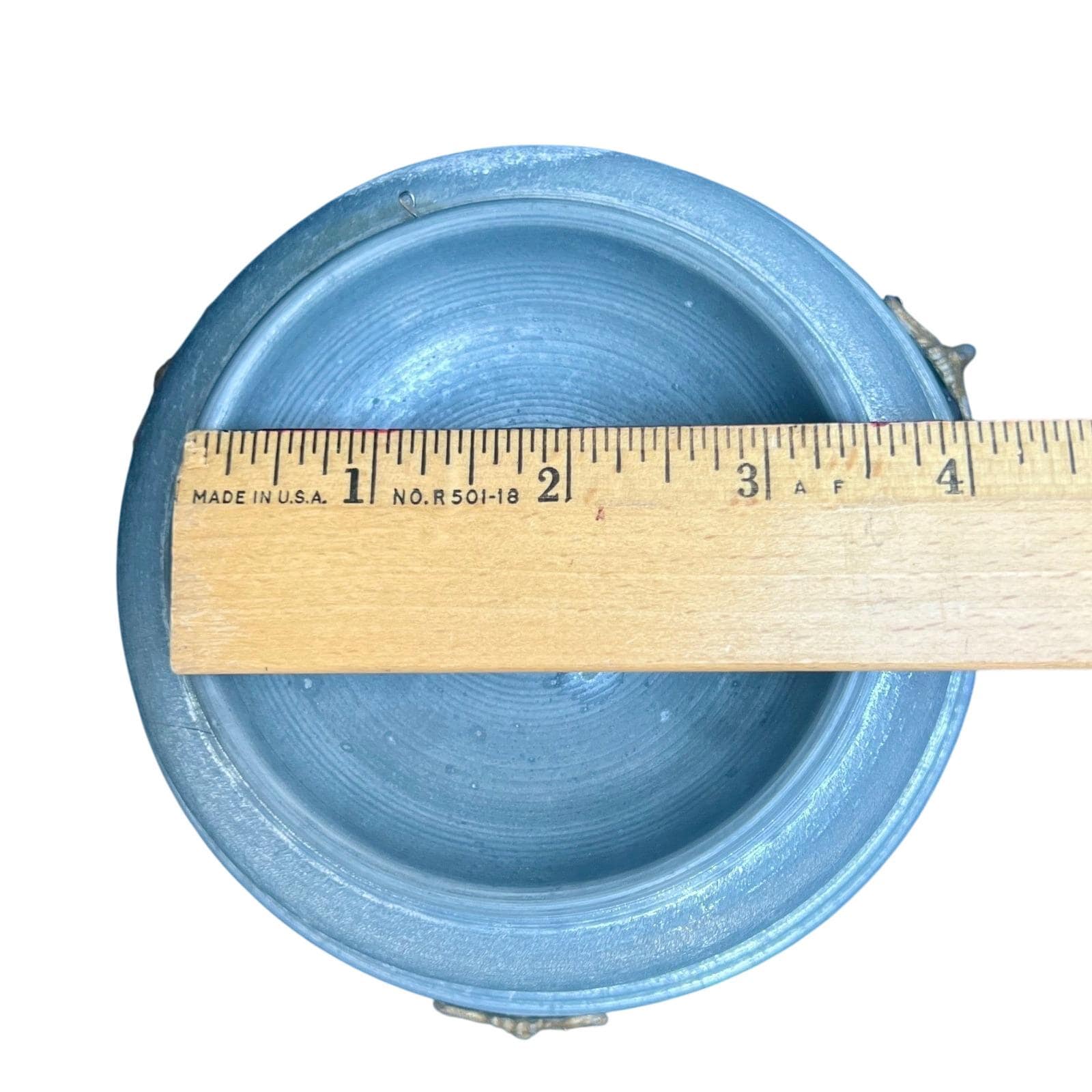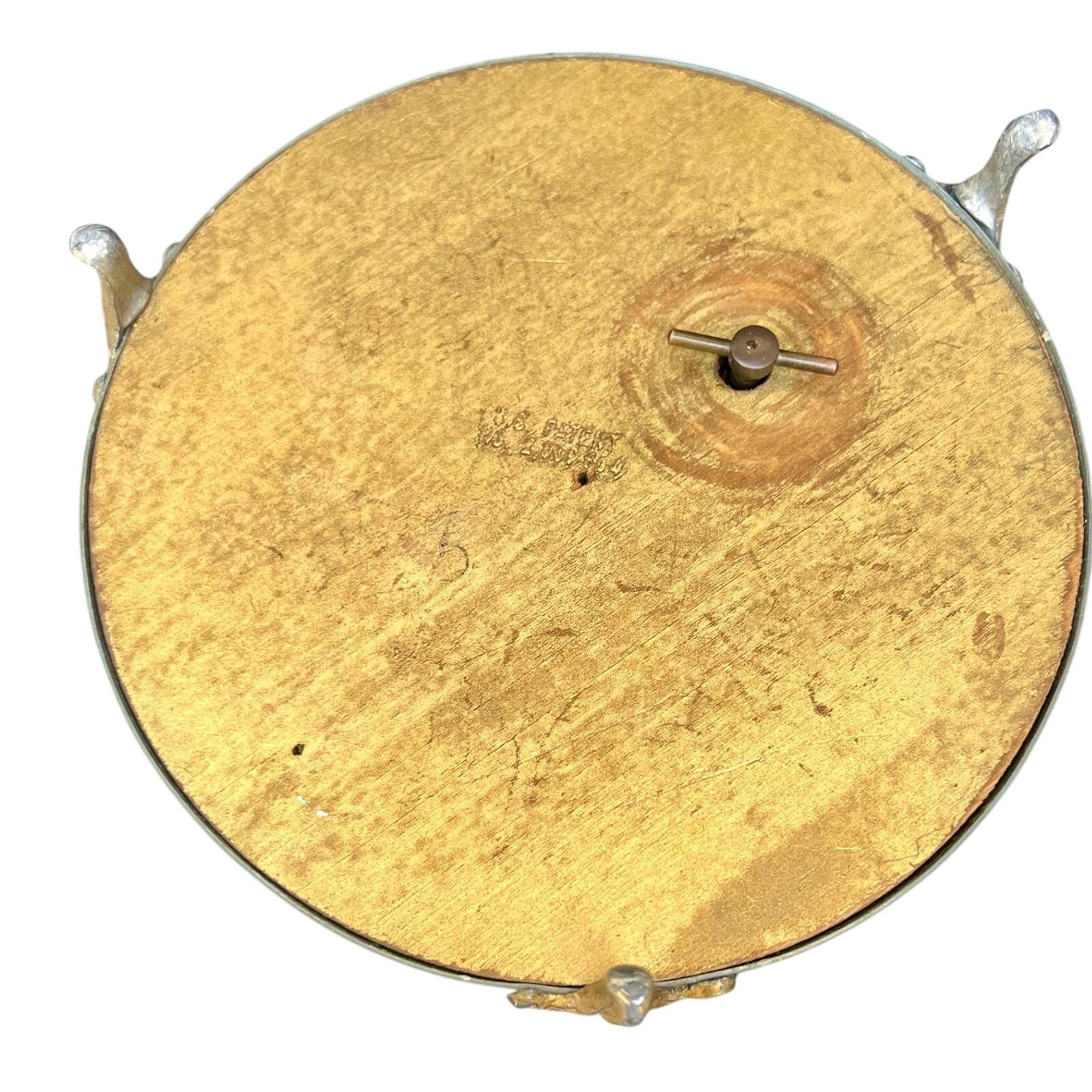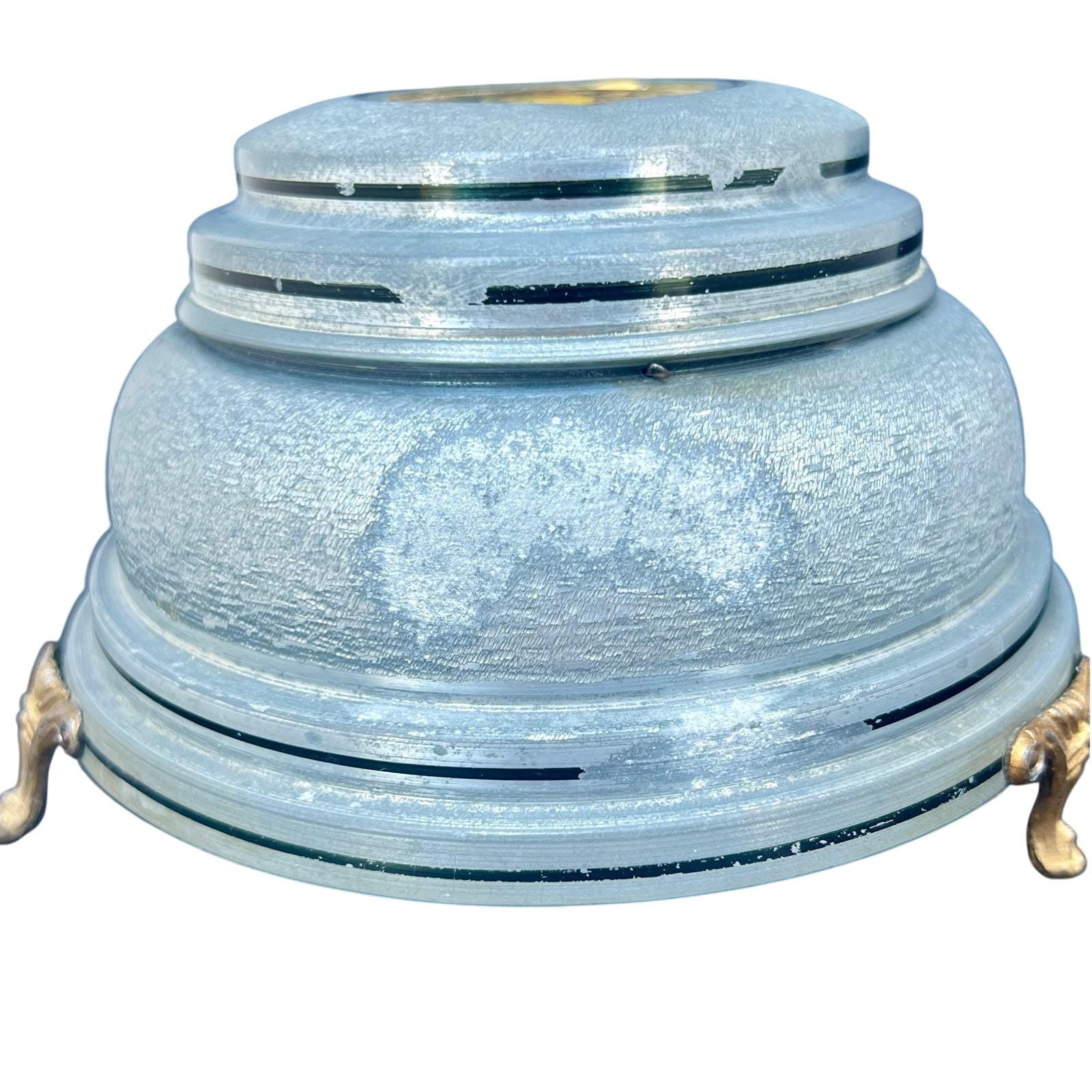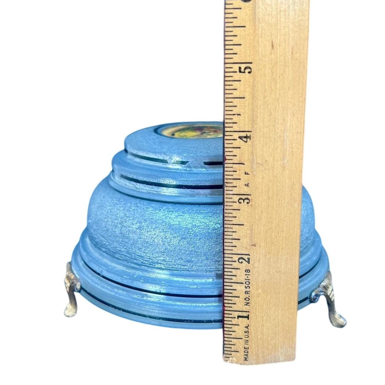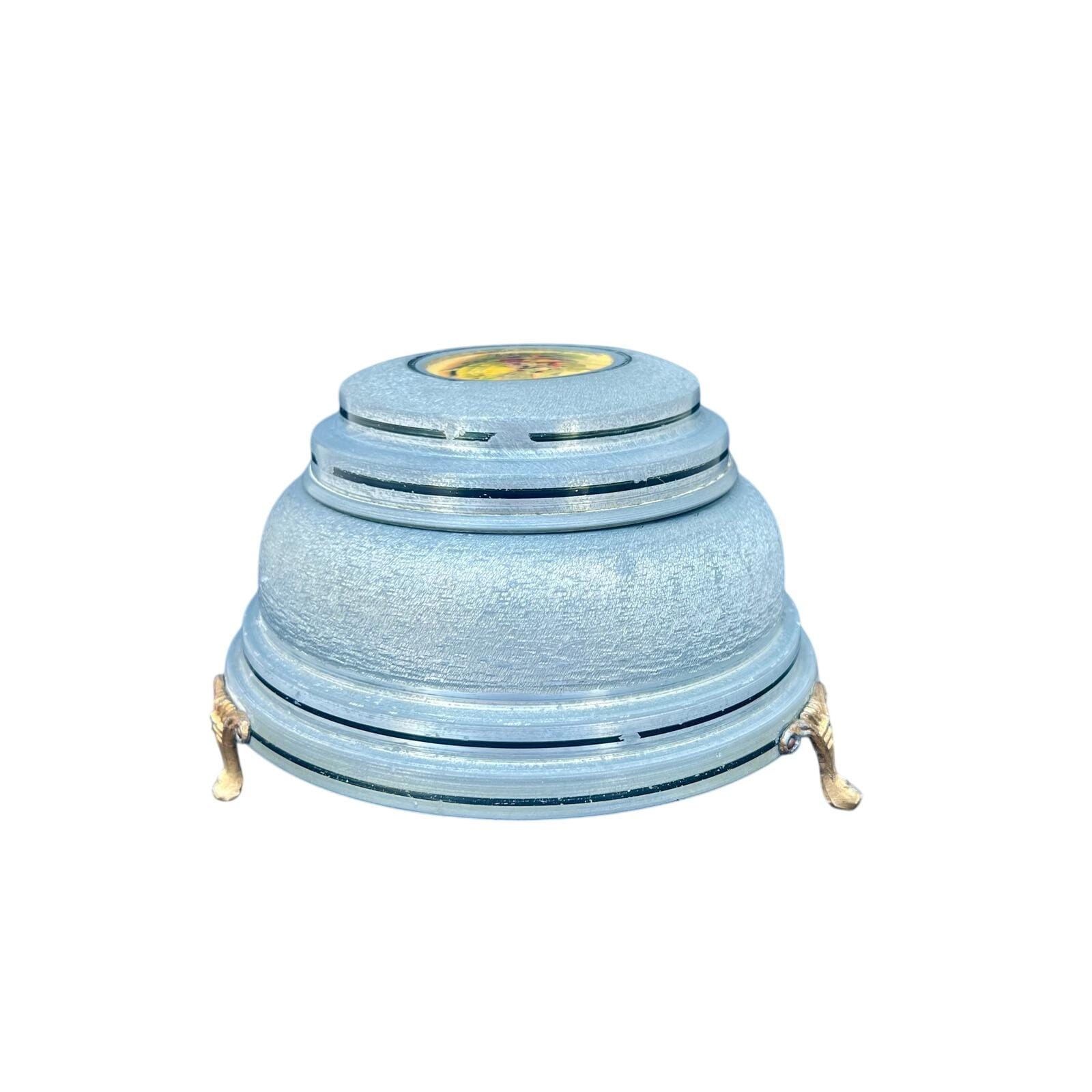 Add a touch of mid-century romance to your vanity with this authentic 1950s musical powder box. Crafted from durable textured aluminum in a soft metallic blue, the lid features a charming Fragonard-style courting couple scene set within an ornate medallion. This footed piece is both a functional cosmetic holder and a nostalgic musical treasure.