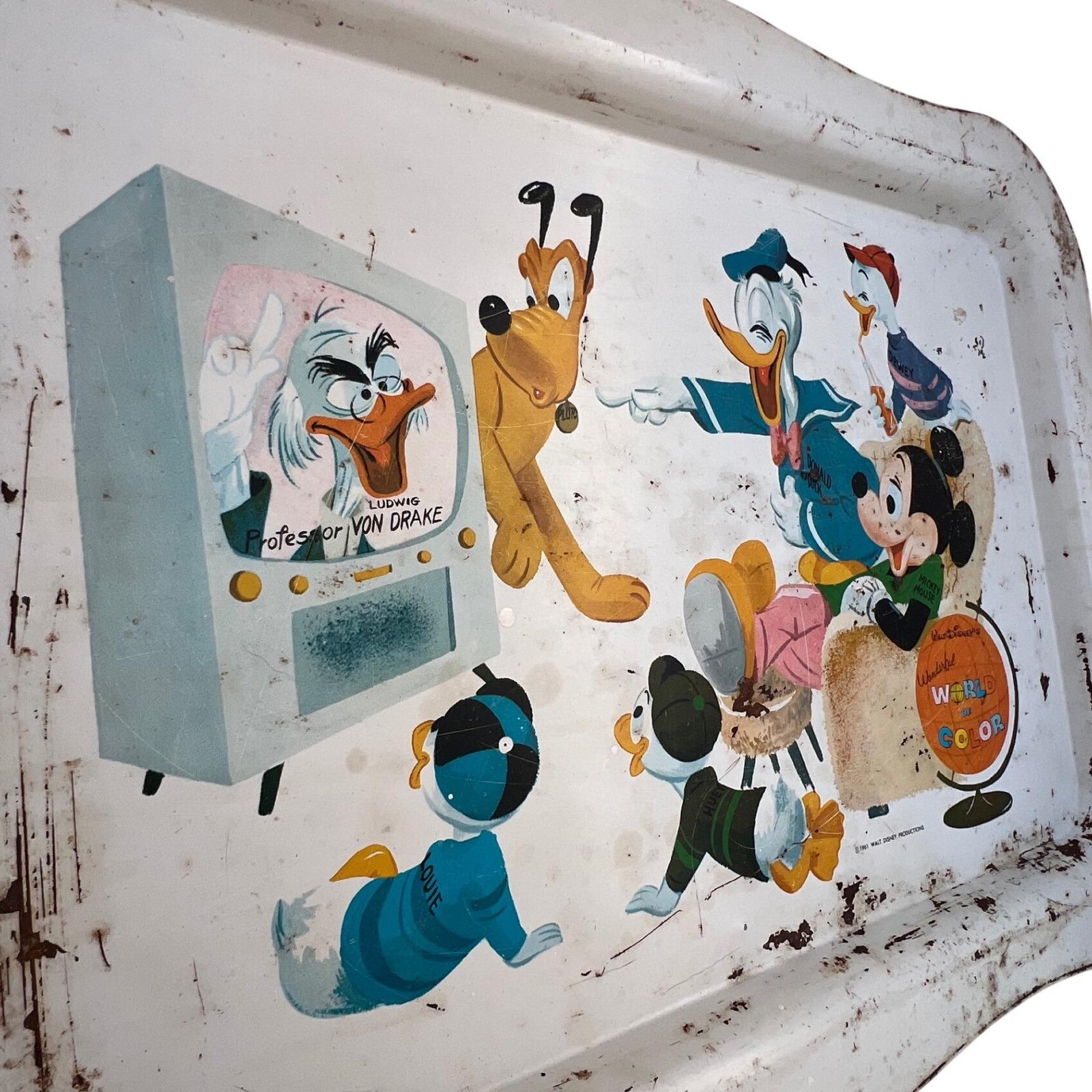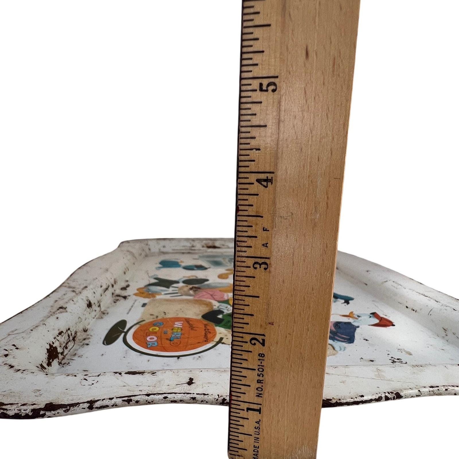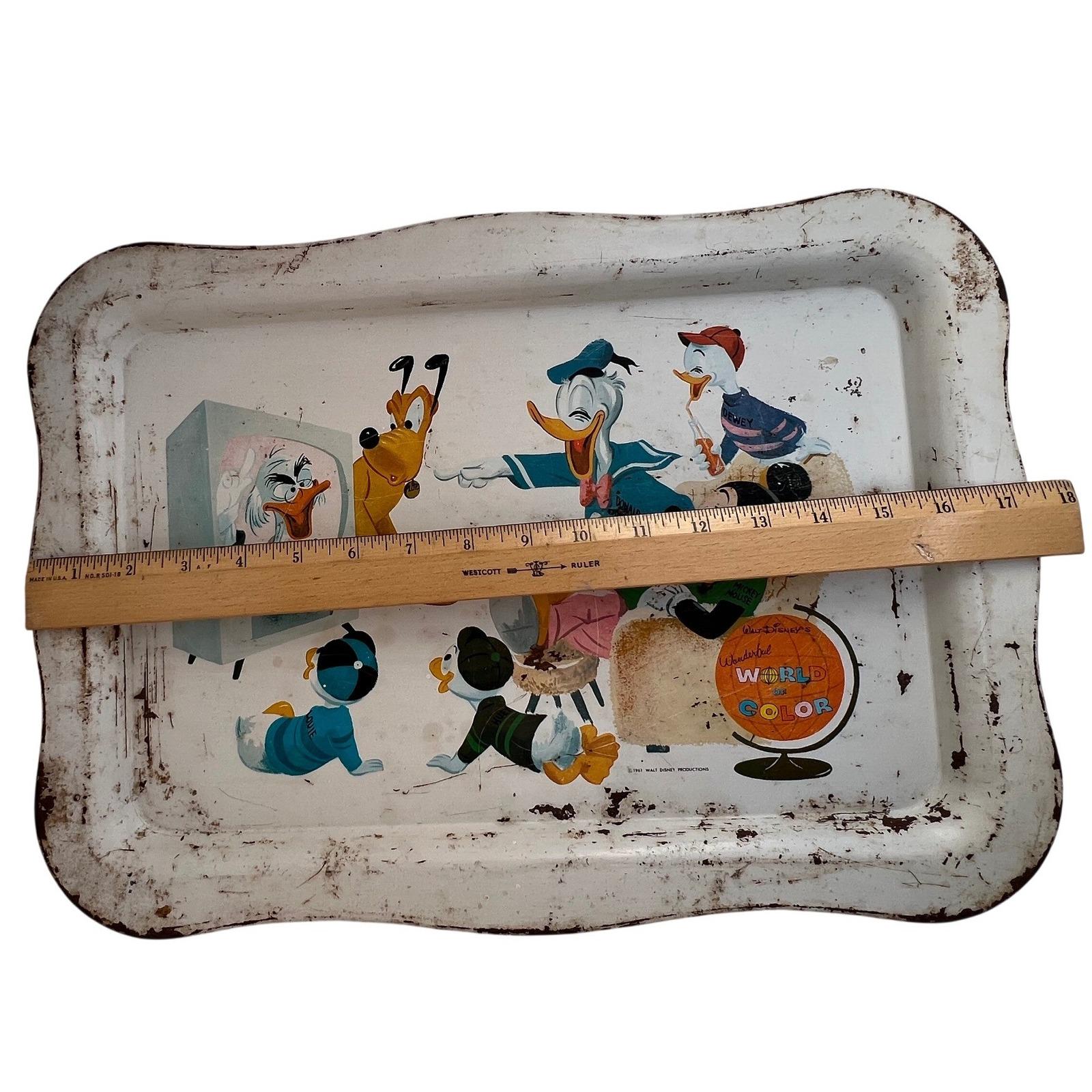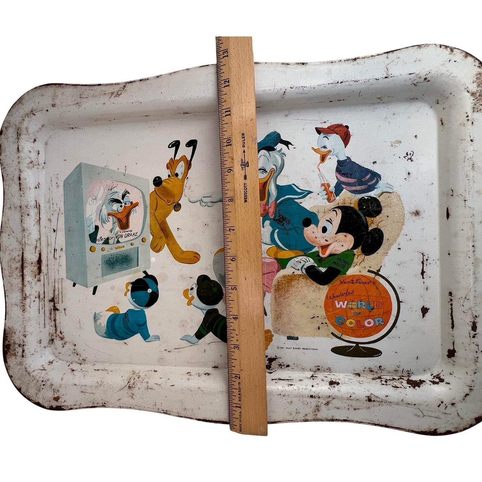Bring a touch of mid-century nostalgia to your home with this charming vintage Disney tin tray. Dated 1961, this authentic Walt Disney Productions piece features beloved characters Mickey Mouse, Donald Duck, and Pluto in a vibrant, classic illustration.
