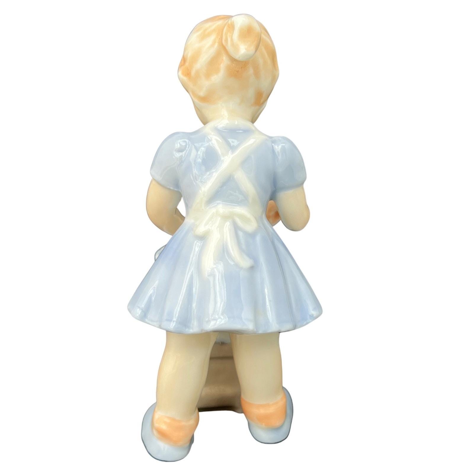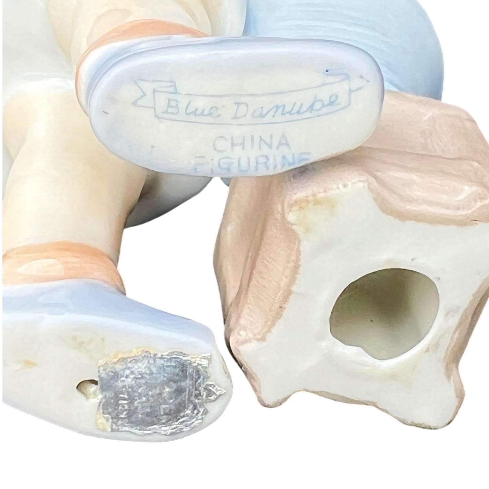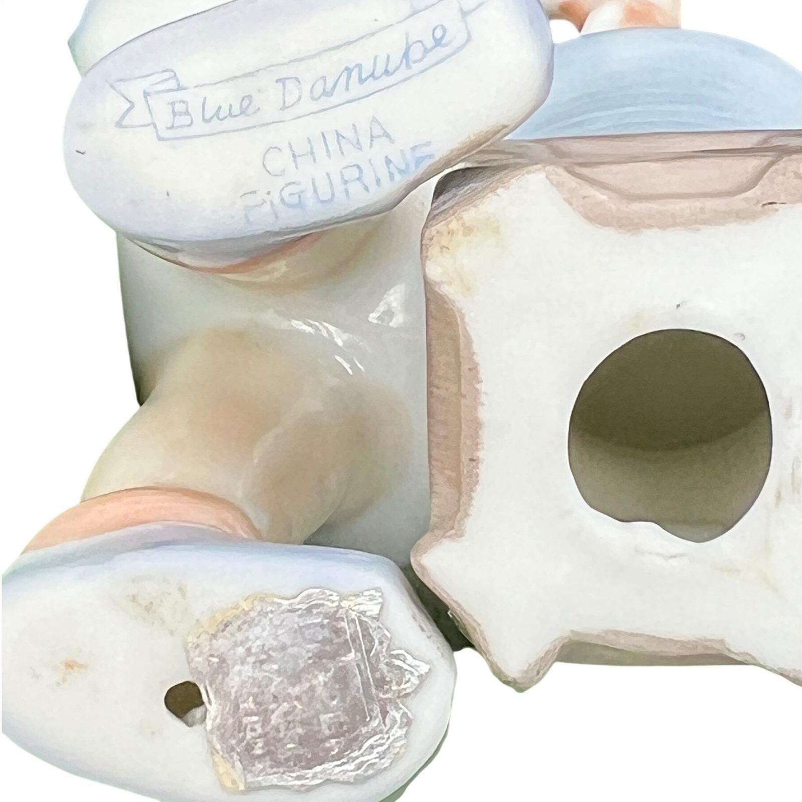 A collector's dream! This vintage Blue Danube figurine features a young girl at a butter churn, rendered in the iconic blue and white glaze. Unlike many pieces on the market, this one retains its original silver foil manufacturer's sticker on the base alongside the classic Blue Danube banner stamp.