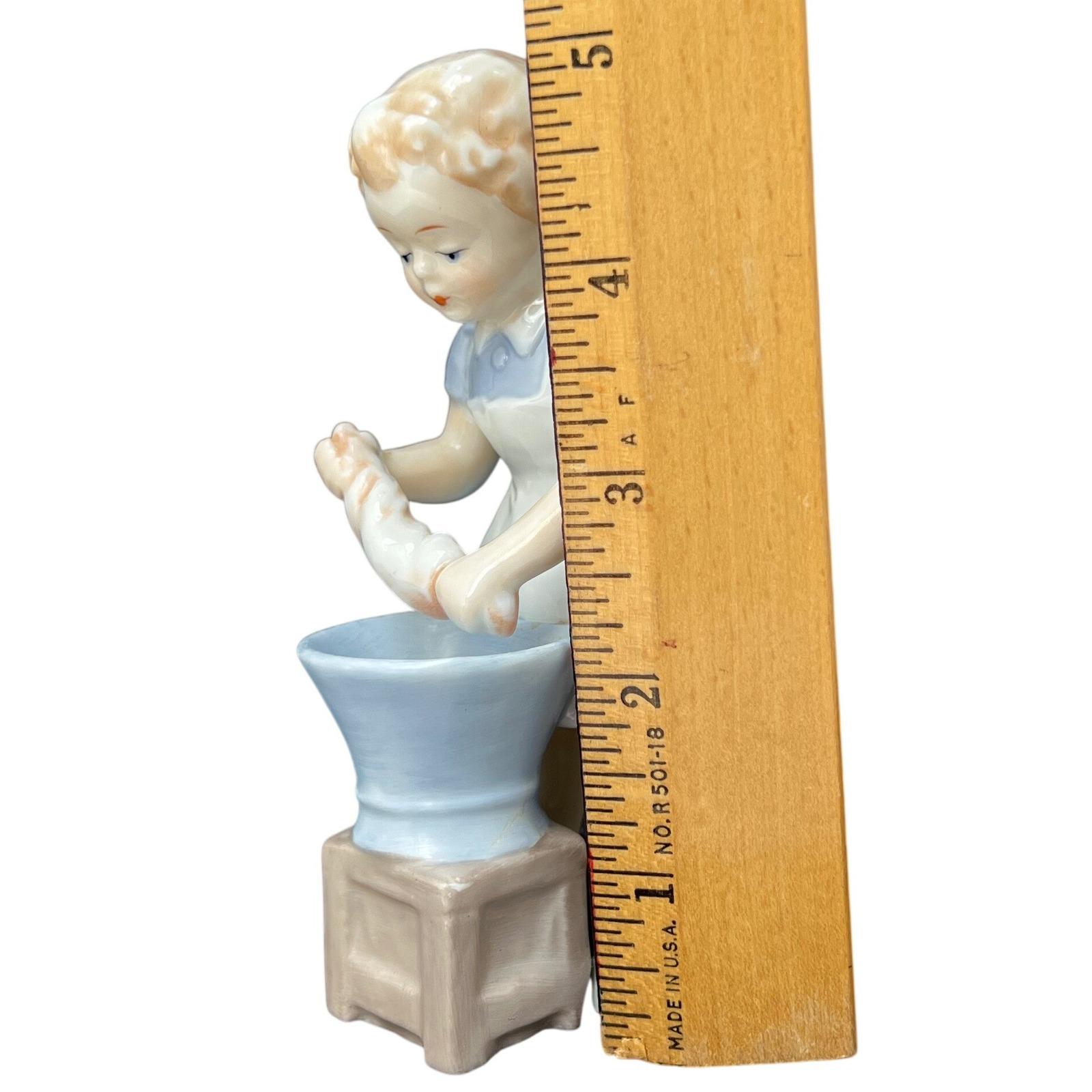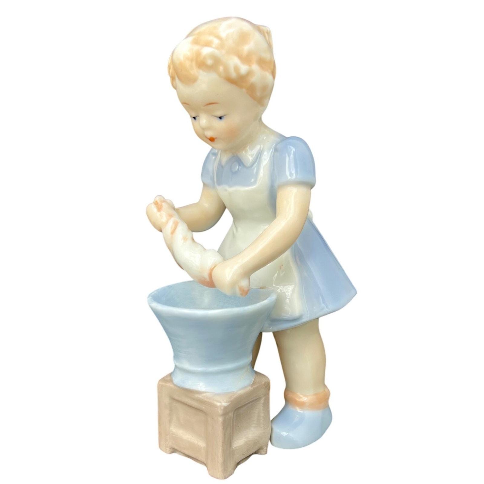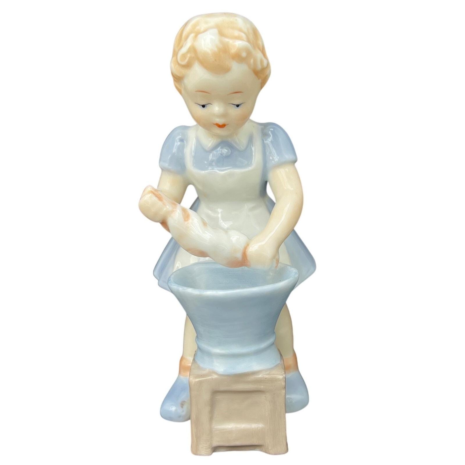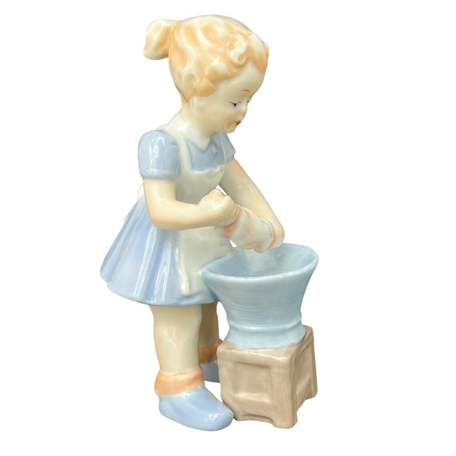 A collector's dream! This vintage Blue Danube figurine features a young girl at a butter churn, rendered in the iconic blue and white glaze. Unlike many pieces on the market, this one retains its original silver foil manufacturer's sticker on the base alongside the classic Blue Danube banner stamp.