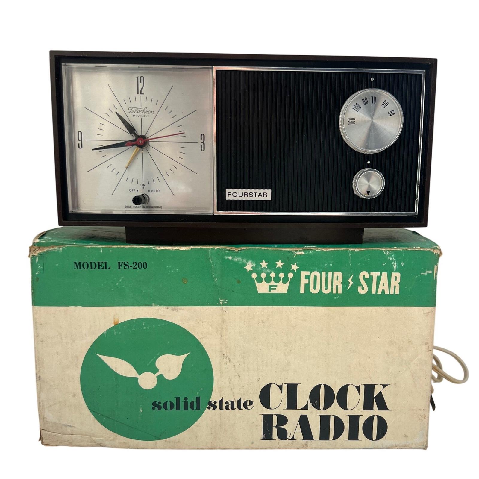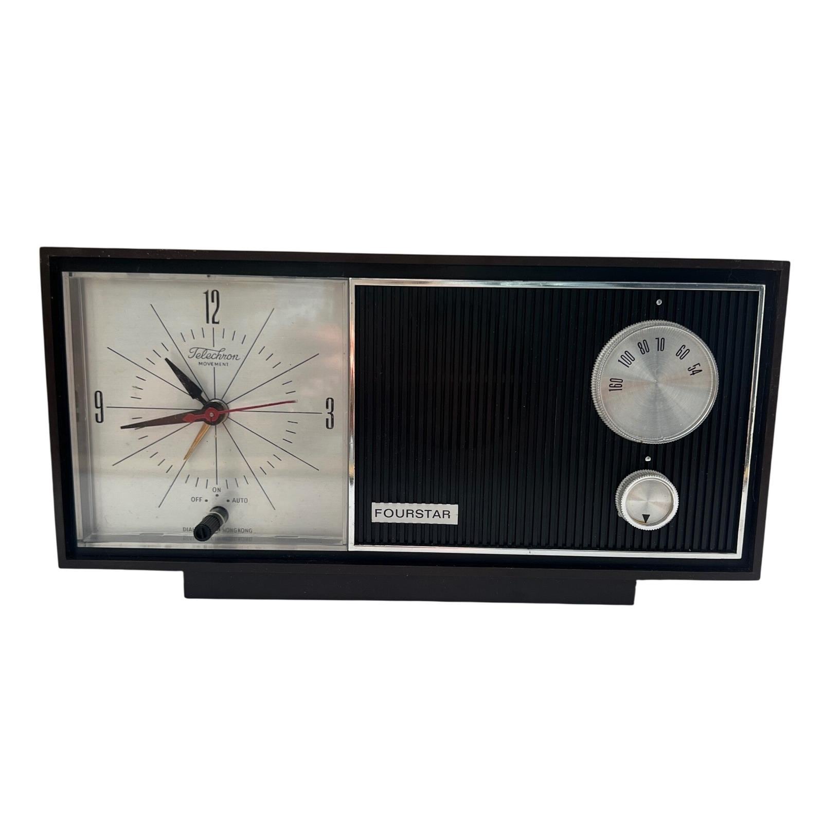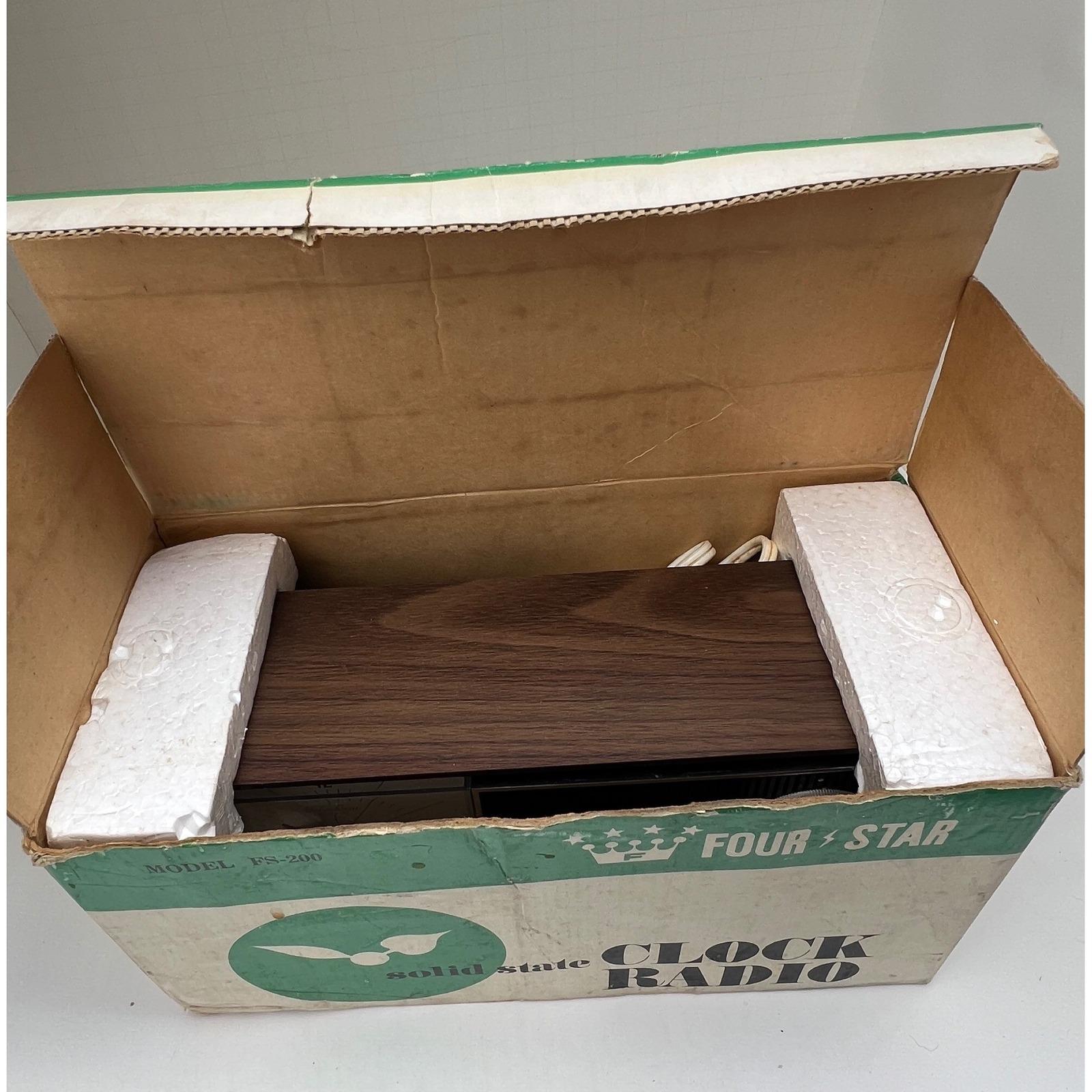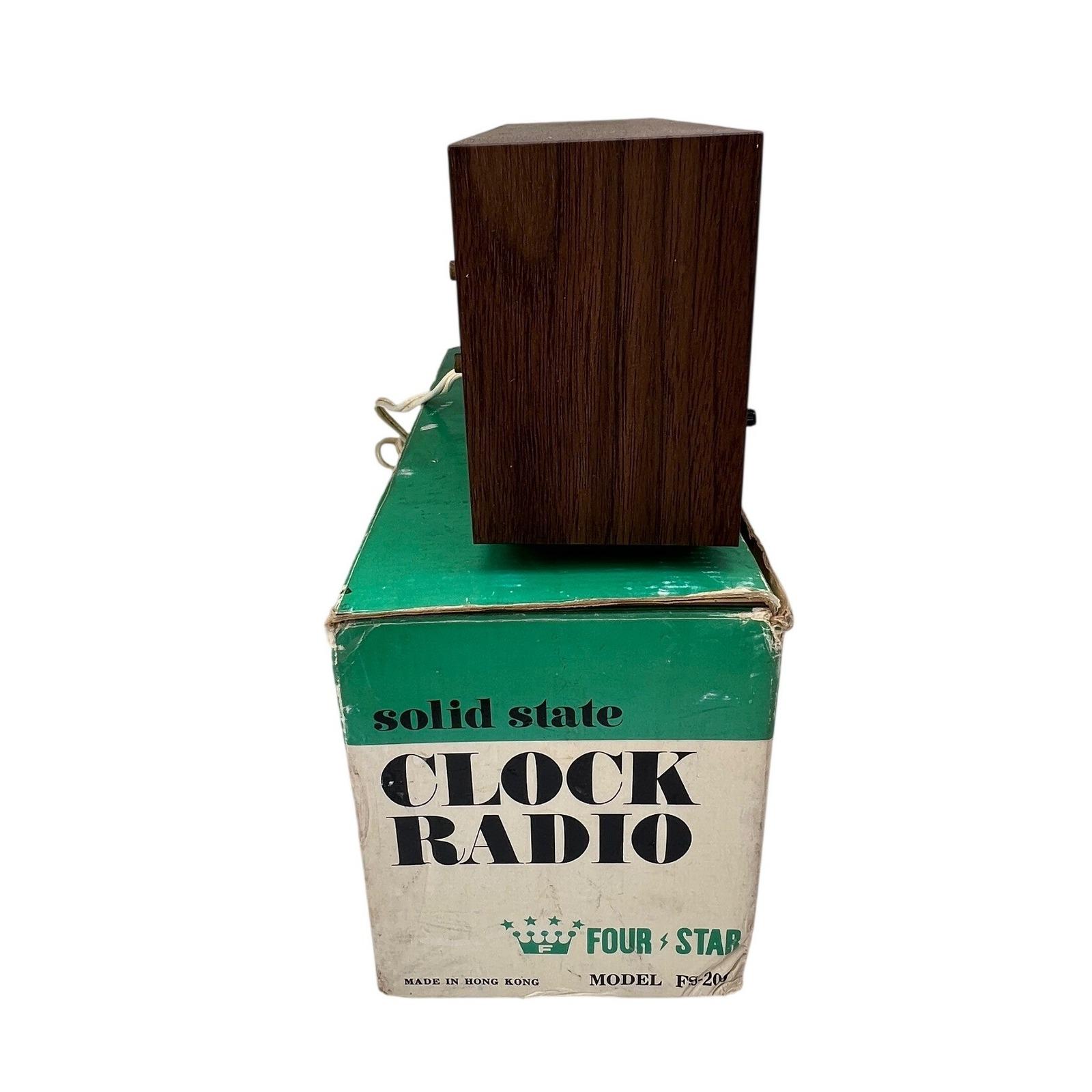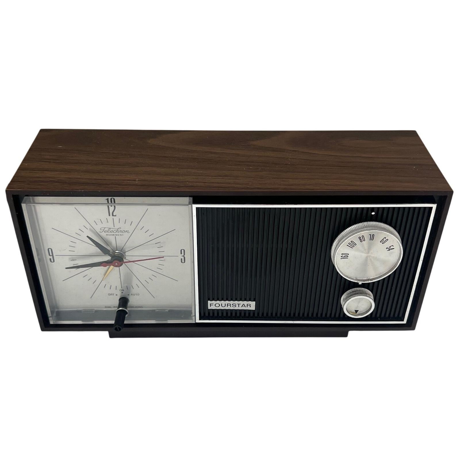 A vintage Four-Star solid-state clock radio with that unmistakable mid-century feel...warm faux woodgrain, a clean silver-tone clock face, and a textured black speaker that grounds the whole design. It's simple, functional, and quietly nostalgic in the best way.