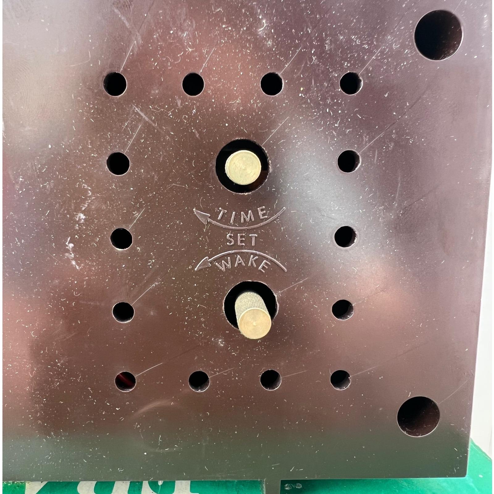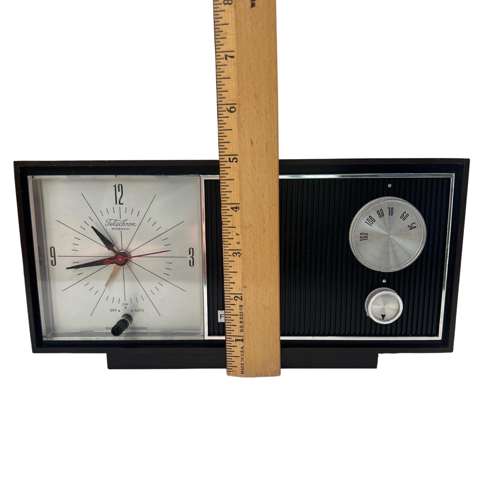 Design: Classic Mid-Century Modern aesthetic featuring a textured black speaker grille and an iconic analog clock face.