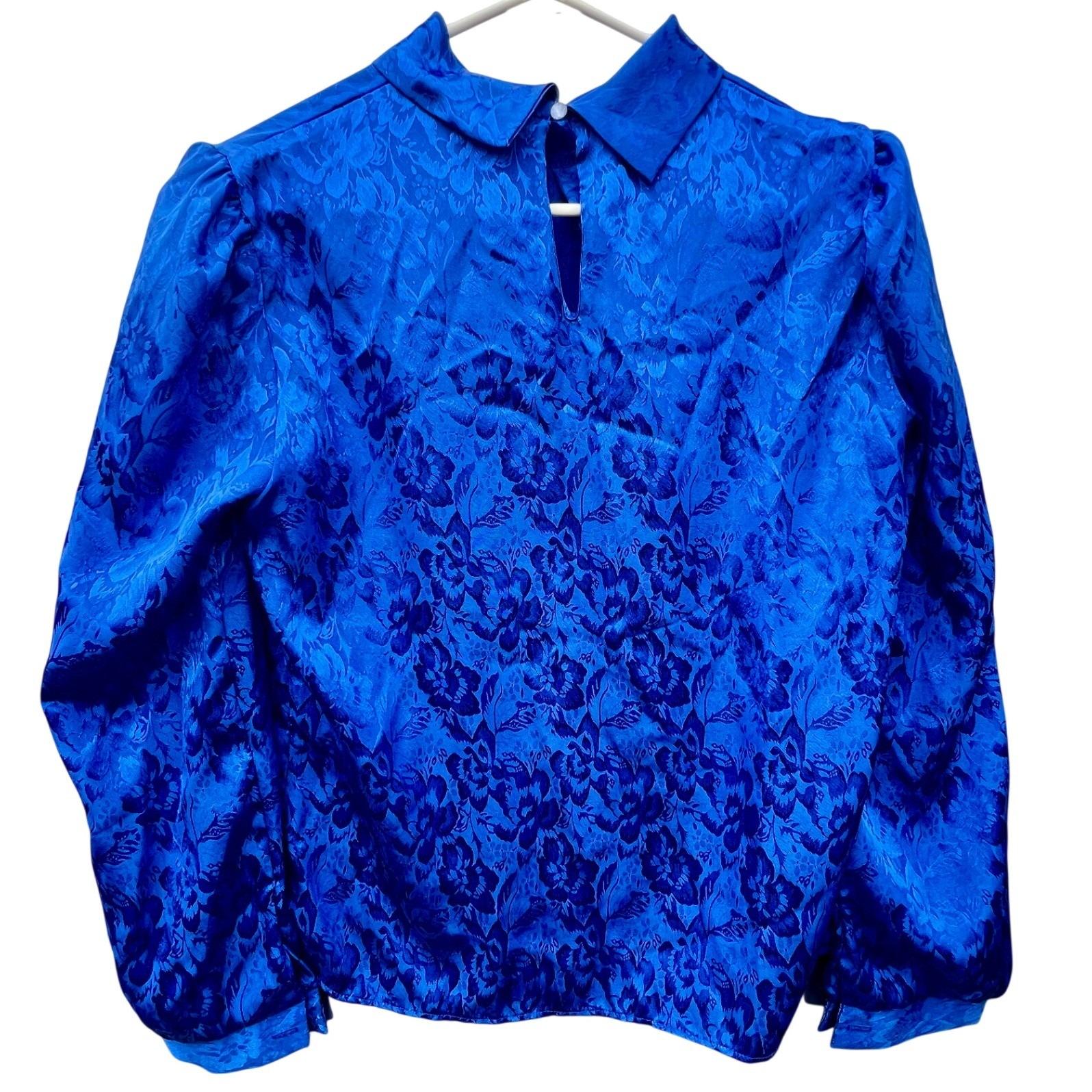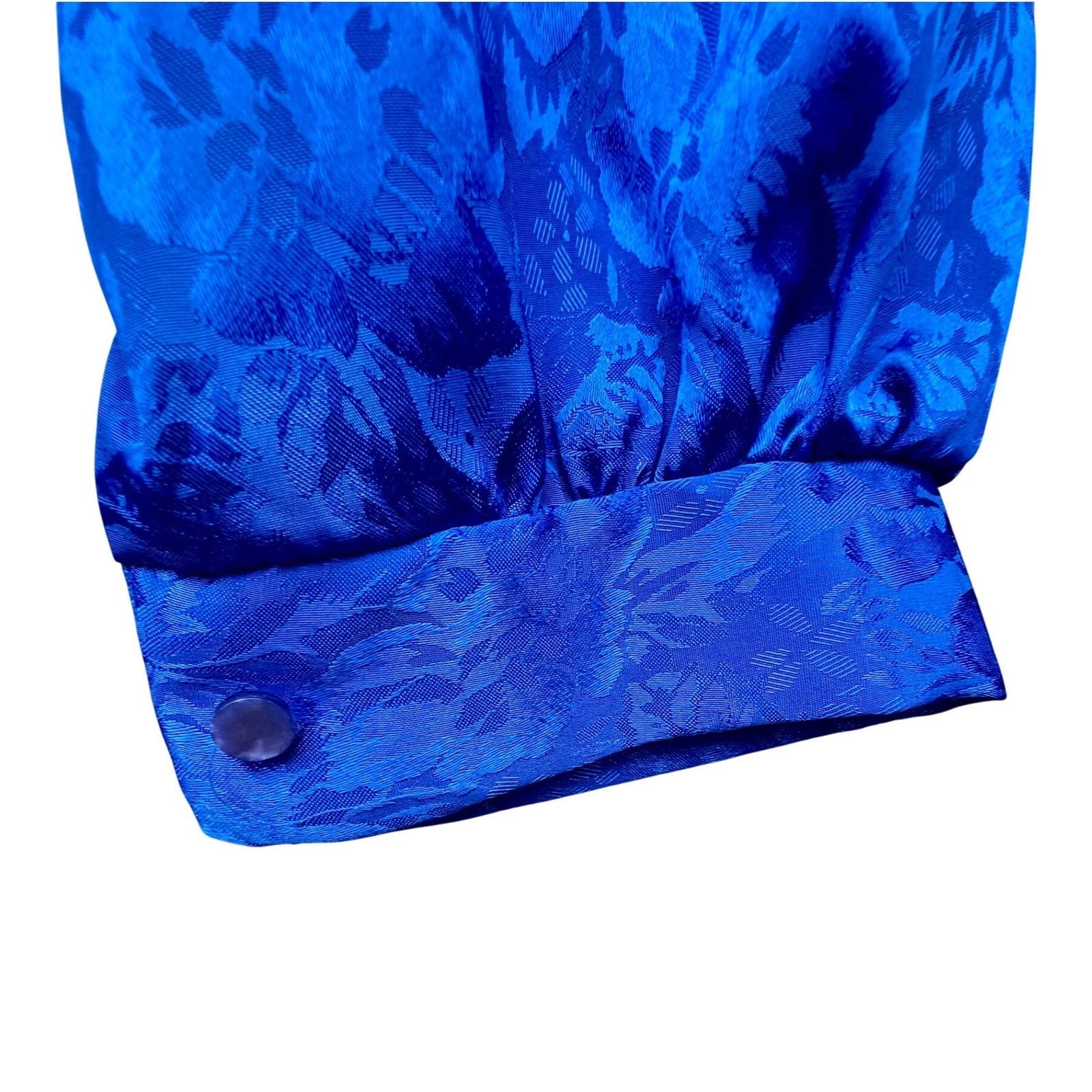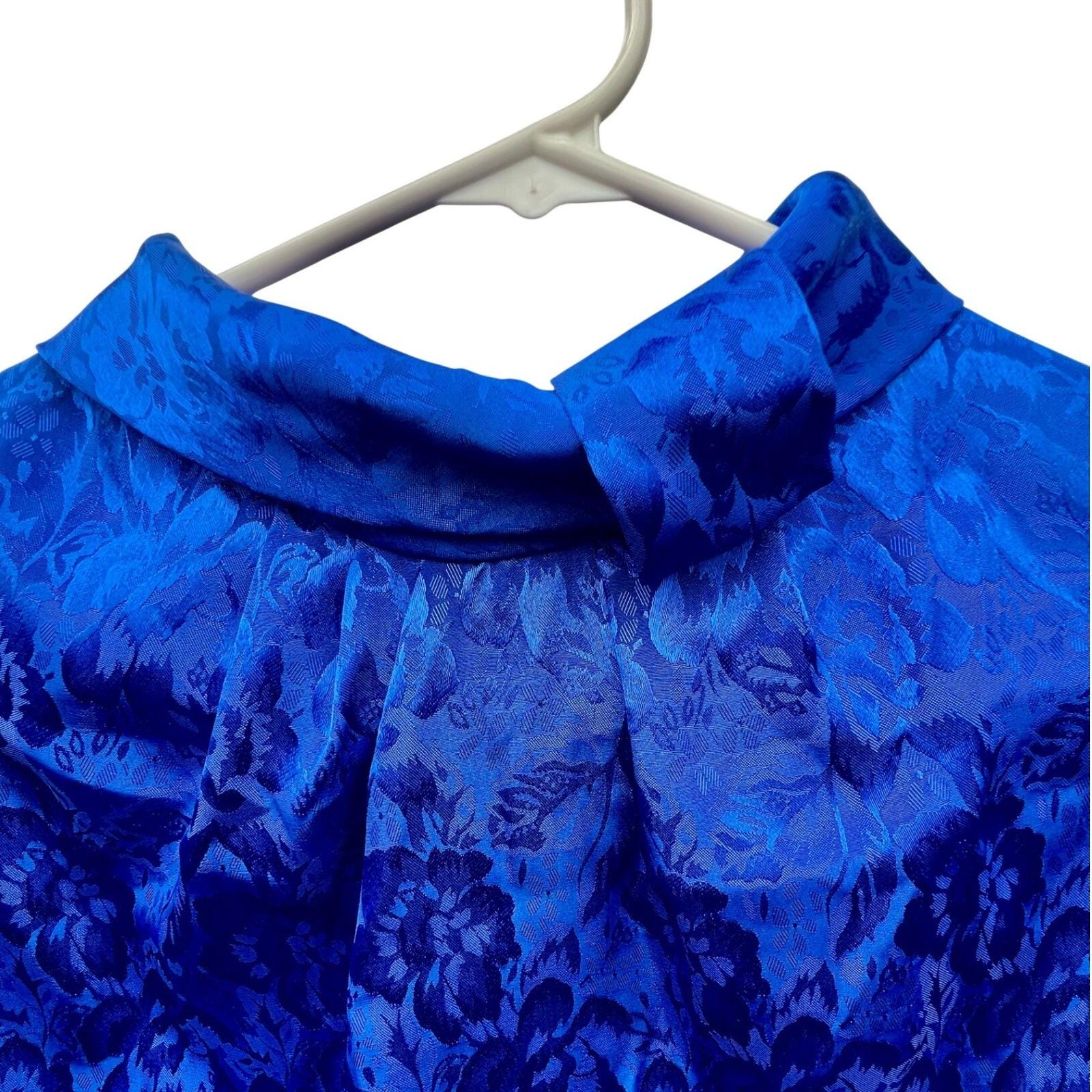 A vintage Ellen-D Kollection blouse in a rich royal blue with a subtle floral jacquard weave that catches the light just enough to stand out without feeling overdone. It has that structured, slightly dramatic silhouette, pleated front, soft puffed shoulders, and a high neckline finished with a delicate side-tie.