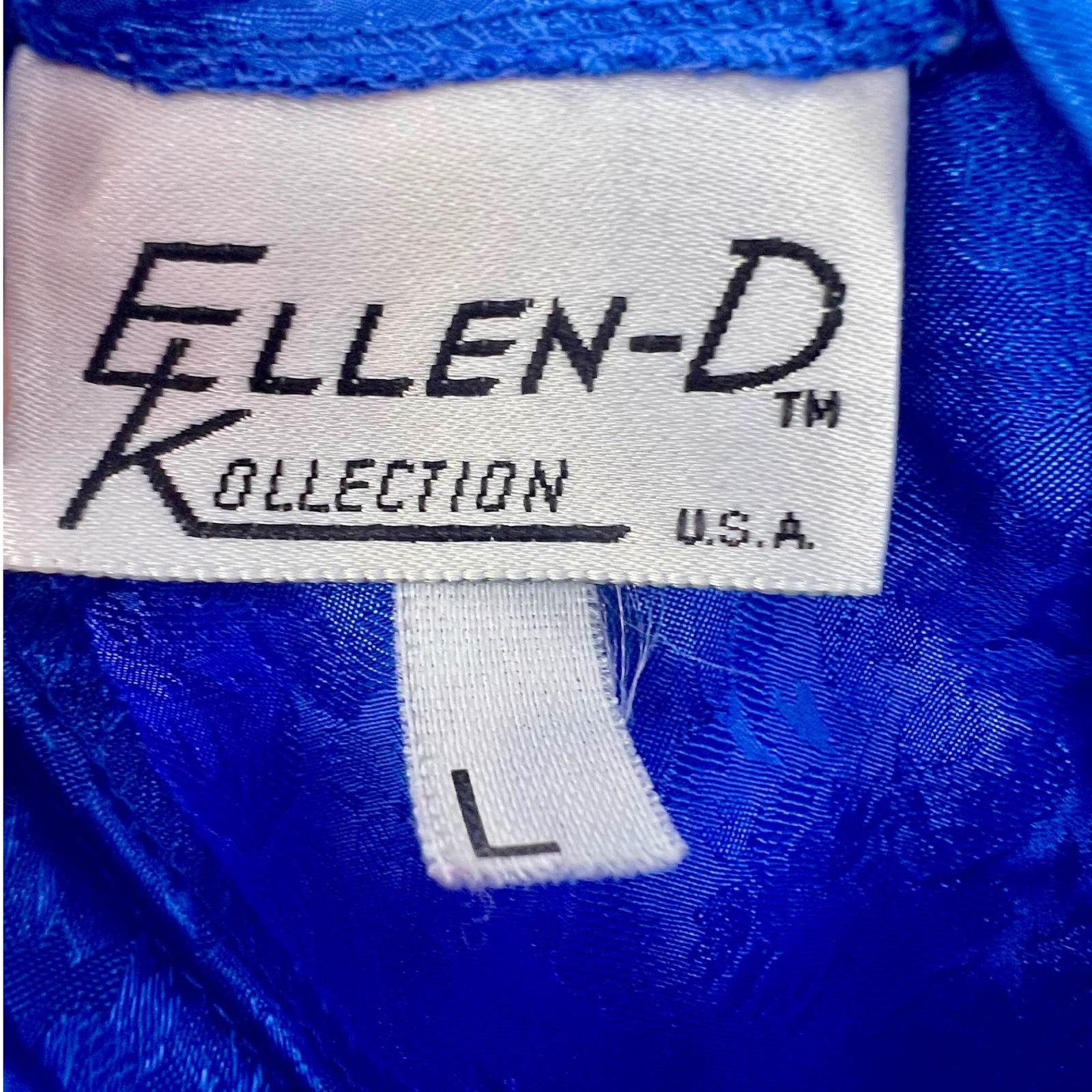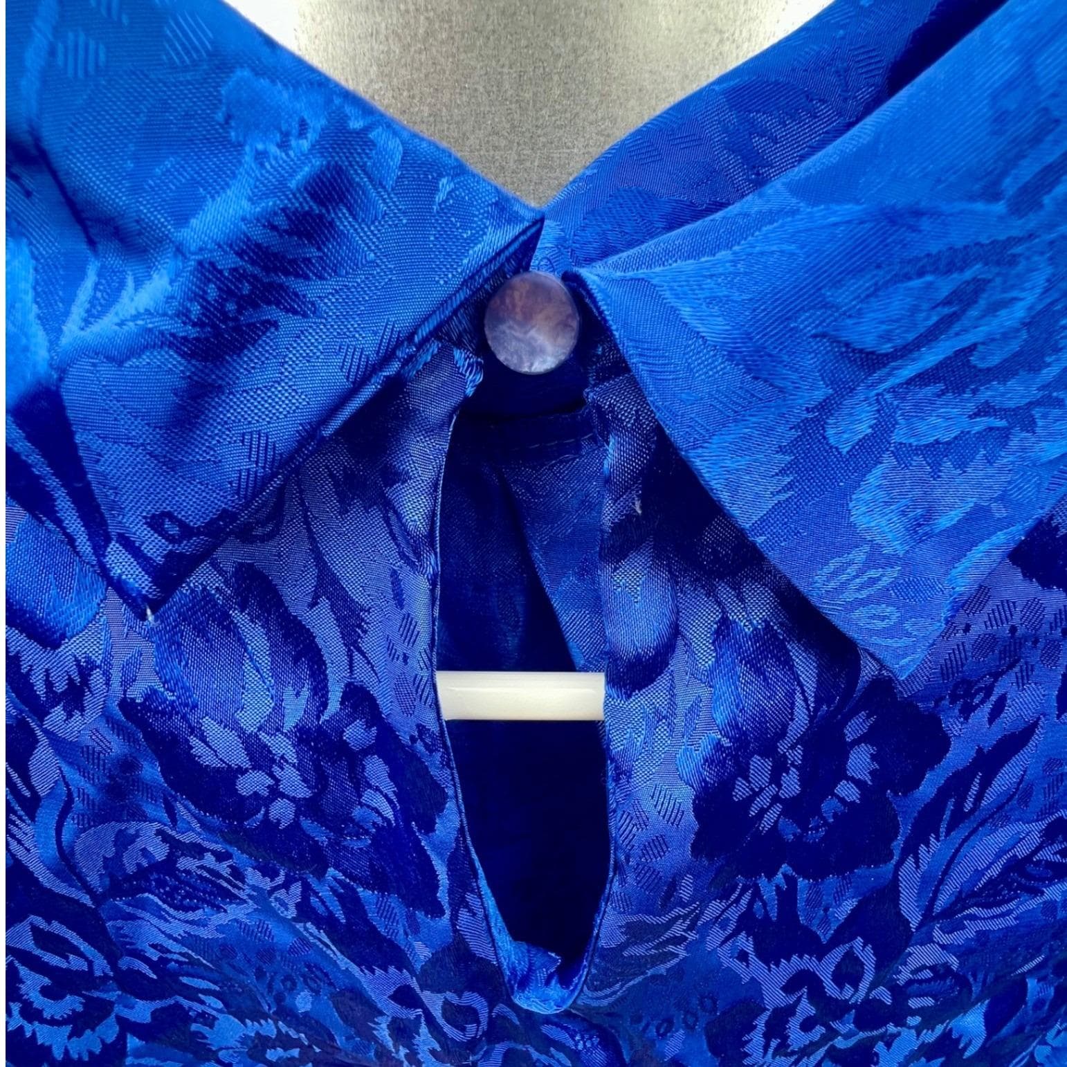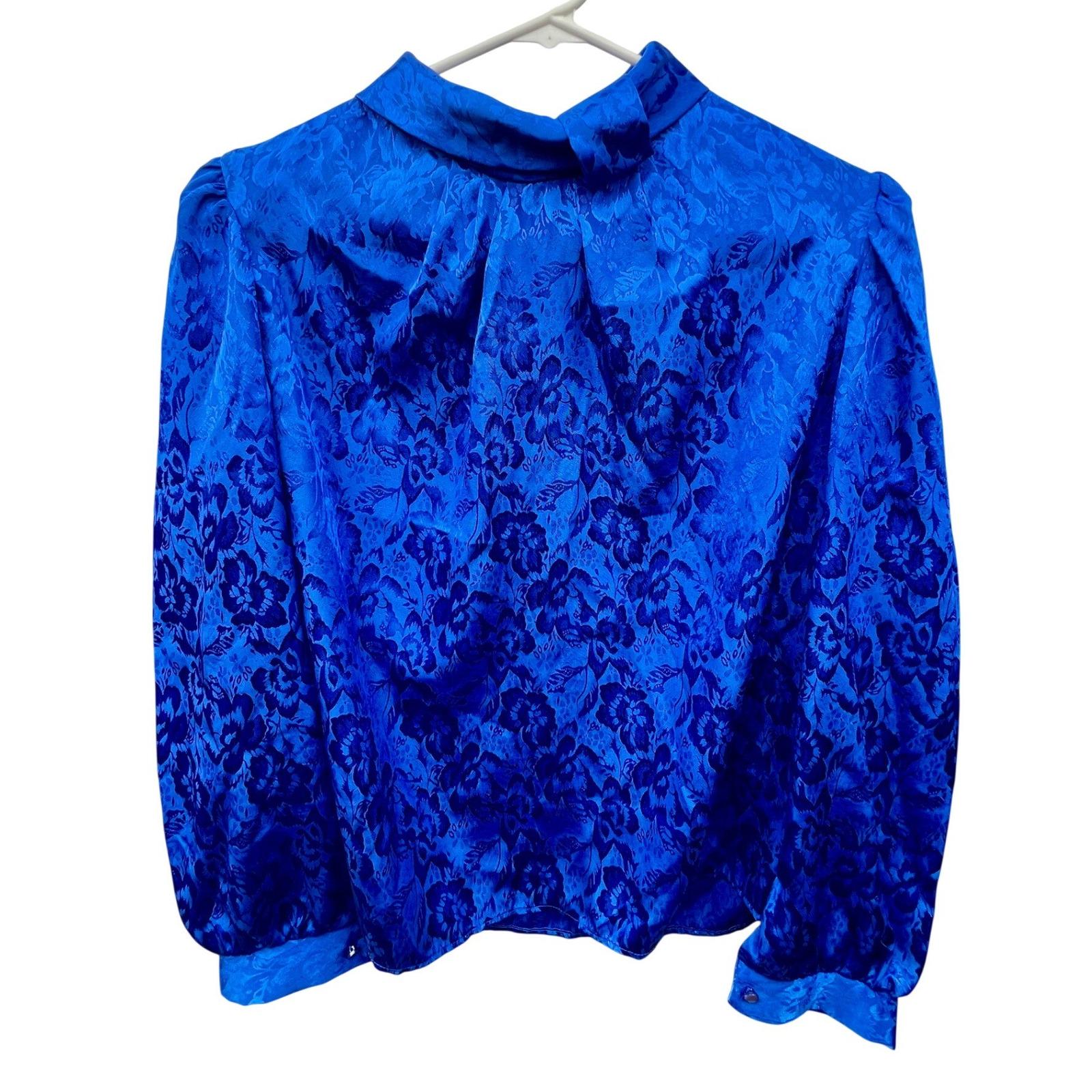 A vintage Ellen-D Kollection blouse in a rich royal blue with a subtle floral jacquard weave that catches the light just enough to stand out without feeling overdone. It has that structured, slightly dramatic silhouette, pleated front, soft puffed shoulders, and a high neckline finished with a delicate side-tie.