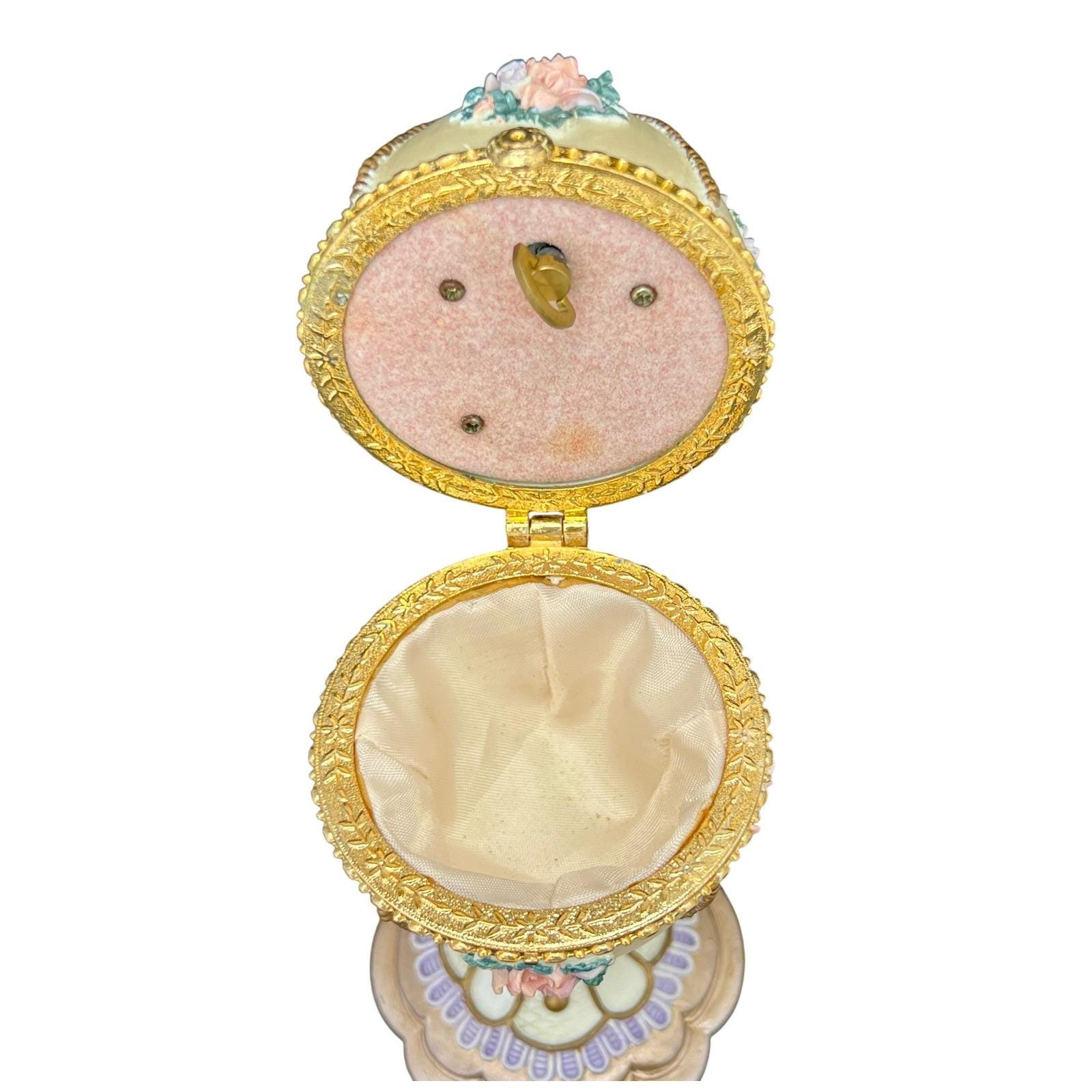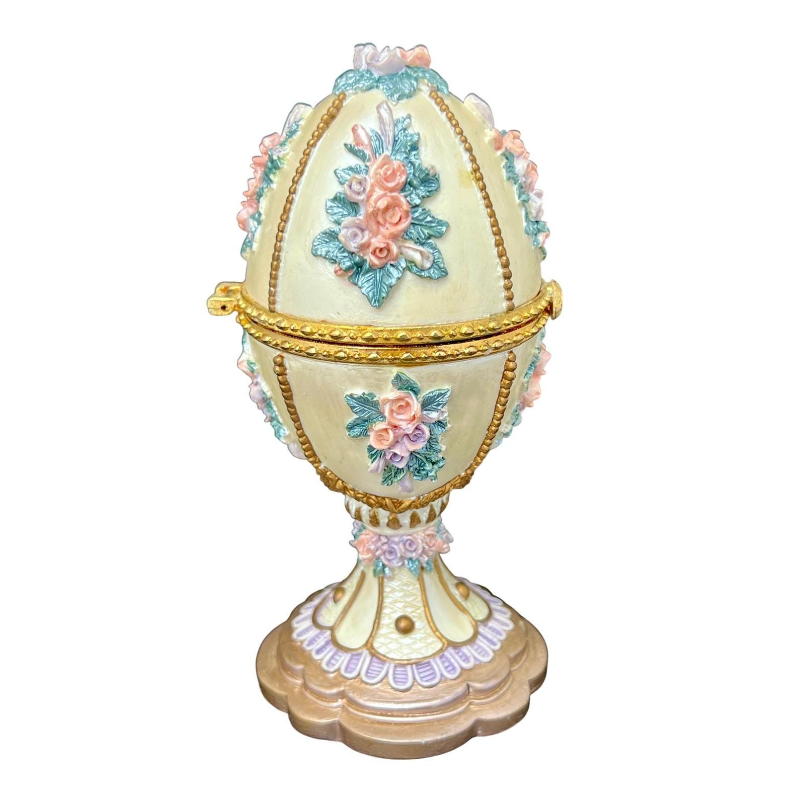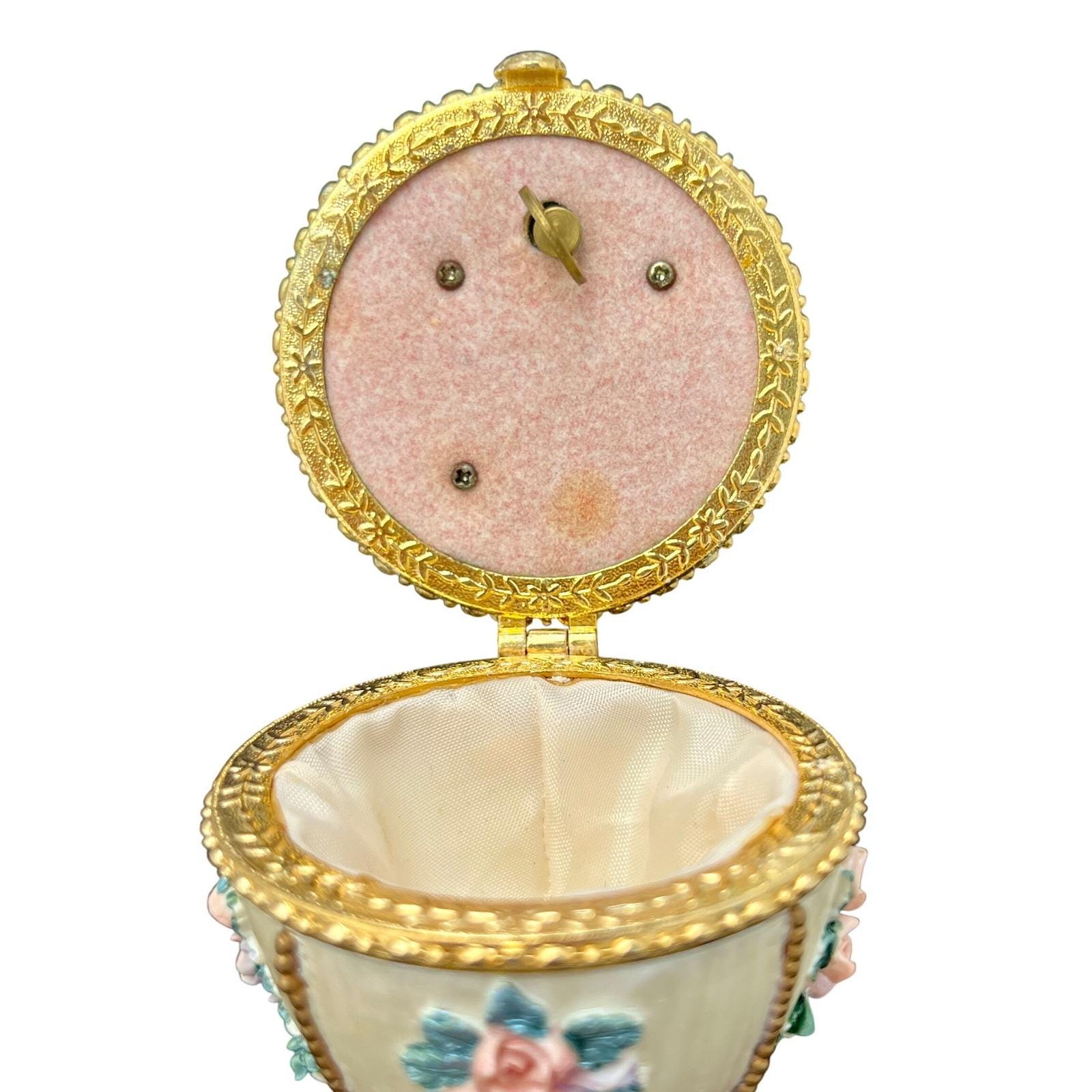 A vintage Fabergé-style musical egg with a soft ivory finish, detailed with raised floral bouquets in pink and lavender tones and finished with delicate gold accents. It has that classic, romantic feel.... ornate without being overwhelming.