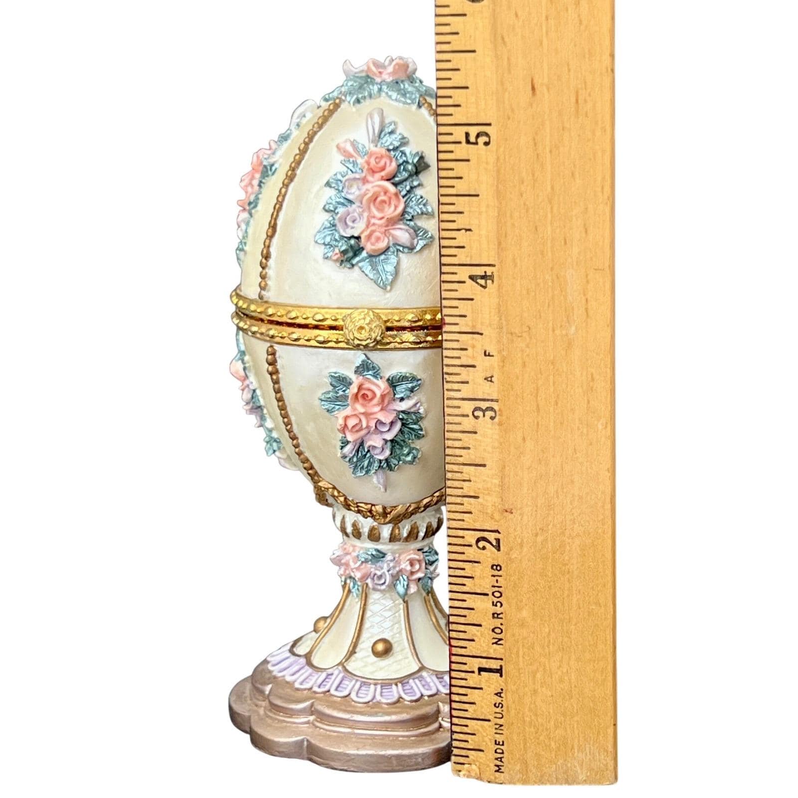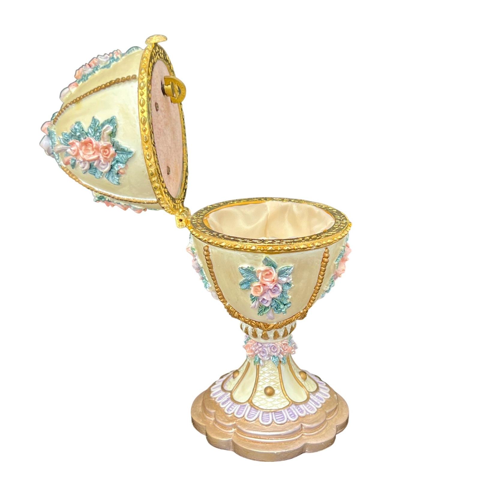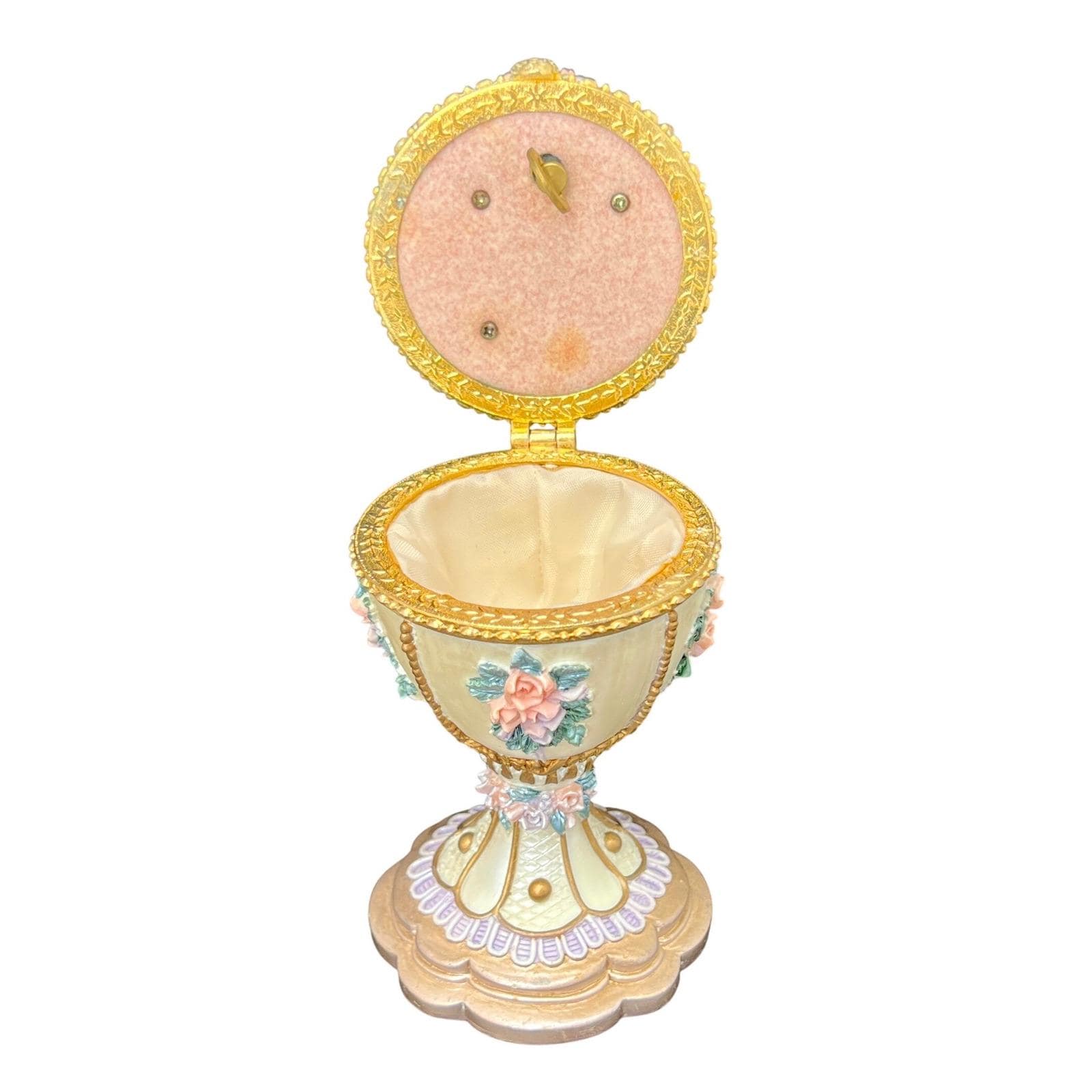 A vintage Fabergé-style musical egg with a soft ivory finish, detailed with raised floral bouquets in pink and lavender tones and finished with delicate gold accents. It has that classic, romantic feel.... ornate without being overwhelming.